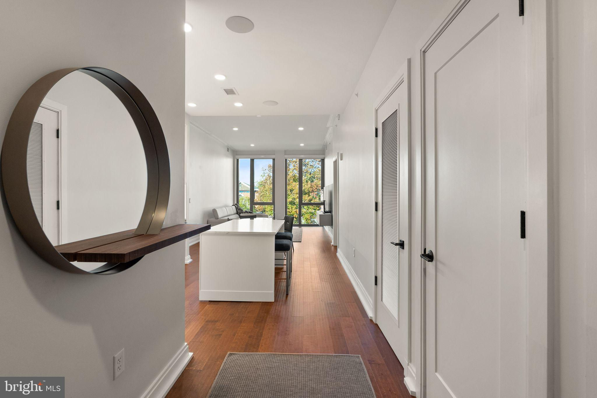 Live at the intersection of legacy and luxury. Perched above one of Capitol Hill’s grandest corridors, this residence is defined by unobstructed views through expansive, floor-to-ceiling windows—an uncommon vantage in DC—over a leafy streetscape and pocket green across Pennsylvania Avenue. Inside, brand-new engineered hardwoods set an elegant tone. The chef’s kitchen is anchored by high-end cabinetry, a Bosch appliance suite and Quartz countertops, offering understated refinement for everyday living or effortless entertaining. A well-placed powder room serves guests, while a separate den provides a flexible retreat for work, reading, or guest quarters. The primary suite is a sanctuary: dual vanities, a deep soaking tub, and walk-in shower clad in timeless Carrara marble, all finished with Waterworks fixtures; an expanse of built-in wardrobe closets completes the suite with bespoke practicality. The second bedroom also offers the comfort of a private ensuite bath and a generously sized walk-in closet, making it ideal for guests or extended stays. Lovingly maintained as a pied-a-terre, the home has seen only light use and remains in impeccable condition. Beyond the door, this pet-friendly boutique building blends mid-century elegance with modern ease—concierge service, secure entry, underground garage parking, and a beautifully appointed terrace lounge complete with comfortable seating and a grill for alfresco dining or sunset gatherings with Capitol Dome views. Step outside and discover why Capitol Hill is one of Washington’s most sought-after addresses. The neighborhood pairs rich history with refined urban living. You’re moments from Eastern Market, Barracks Row, and Michelin-starred destinations like Rose’s Luxury, Pineapple & Pearls, and Albi. For history buffs and policy insiders, beloved institutions like The Monocle, a decades-old favorite of congressional leaders, and Old Ebbitt Grill, Washington’s oldest saloon, offer a taste of the city’s storied past. World-class art and culture are at your doorstep, with the National Gallery of Art, Hirshhorn Museum, and the Library of Congress just a short stroll away. Walkability is unmatched here: charming coffee shops, grocers, and daily conveniences are just around the corner, making city living seamless and sophisticated. Known for its quiet elegance, strong sense of community, and proximity to the heart of American power, this is a neighborhood where diplomats, senior officials, and business leaders call home. For discerning buyers seeking a polished pied-à-terre or an elegant primary residence close to policy, culture, and the arts, Unit 304 delivers abundant natural light, elevated finishes, and a coveted address—an intimate, upscale retreat in one of Washington’s most storied neighborhoods.