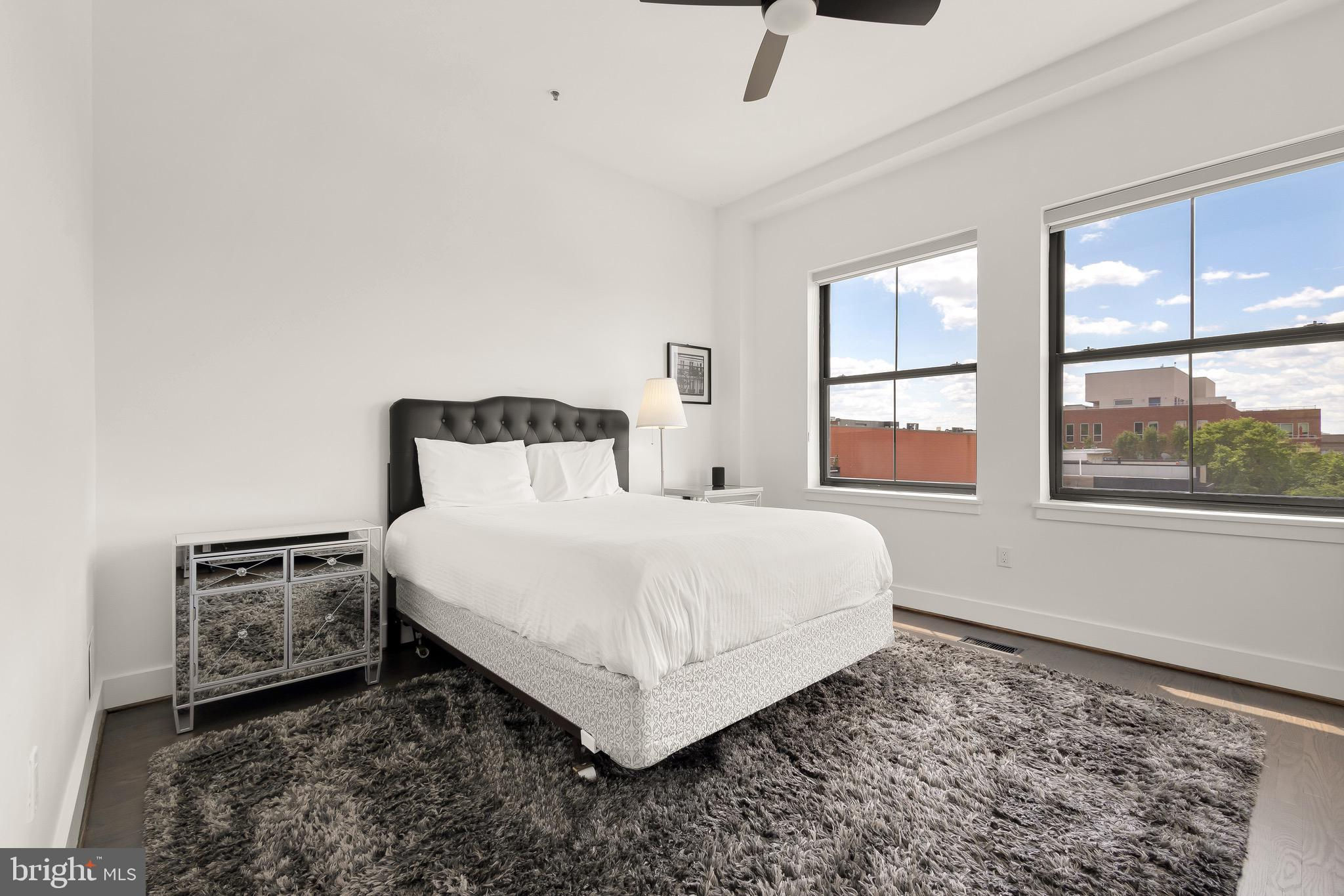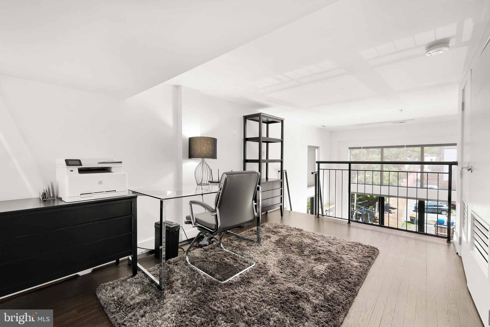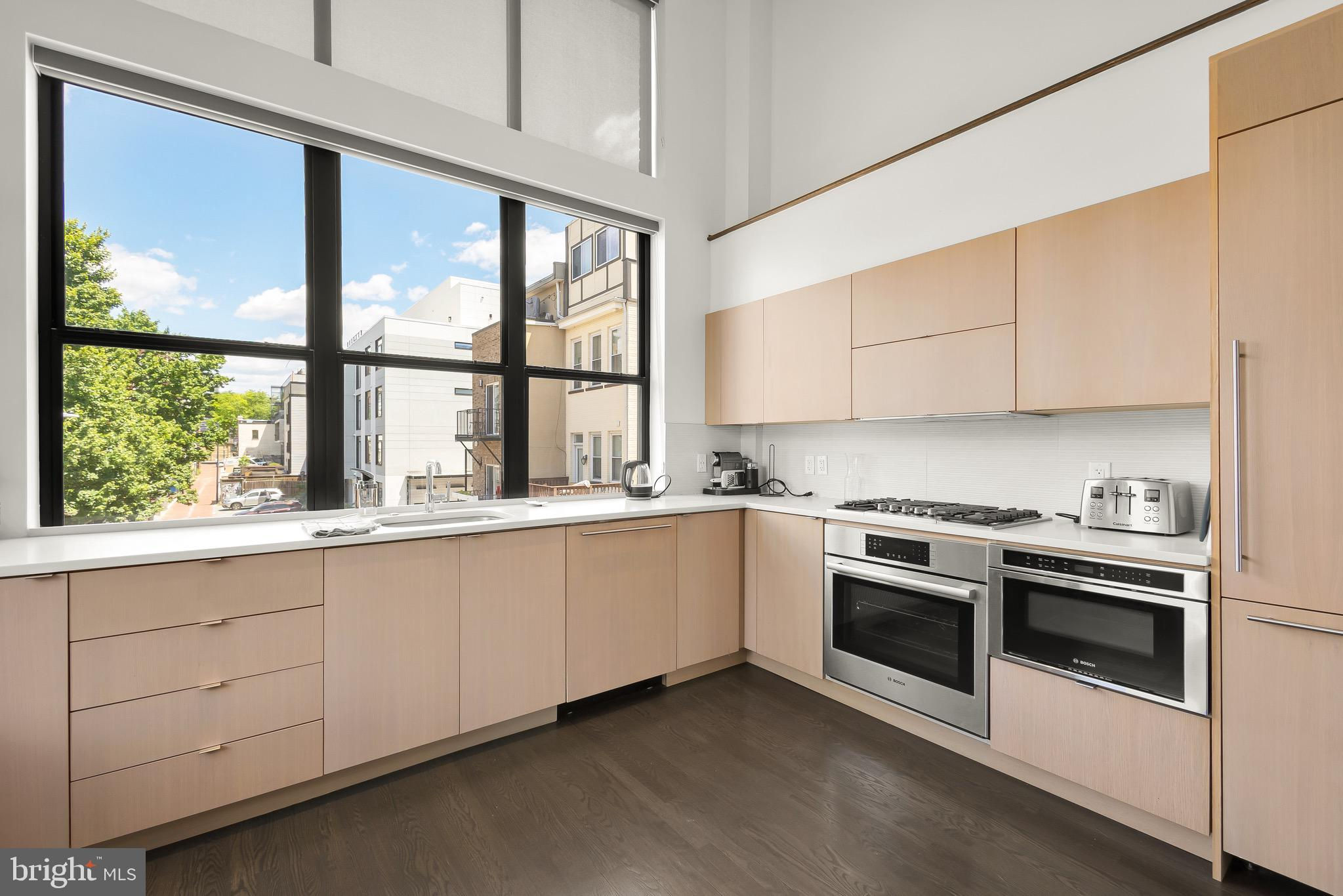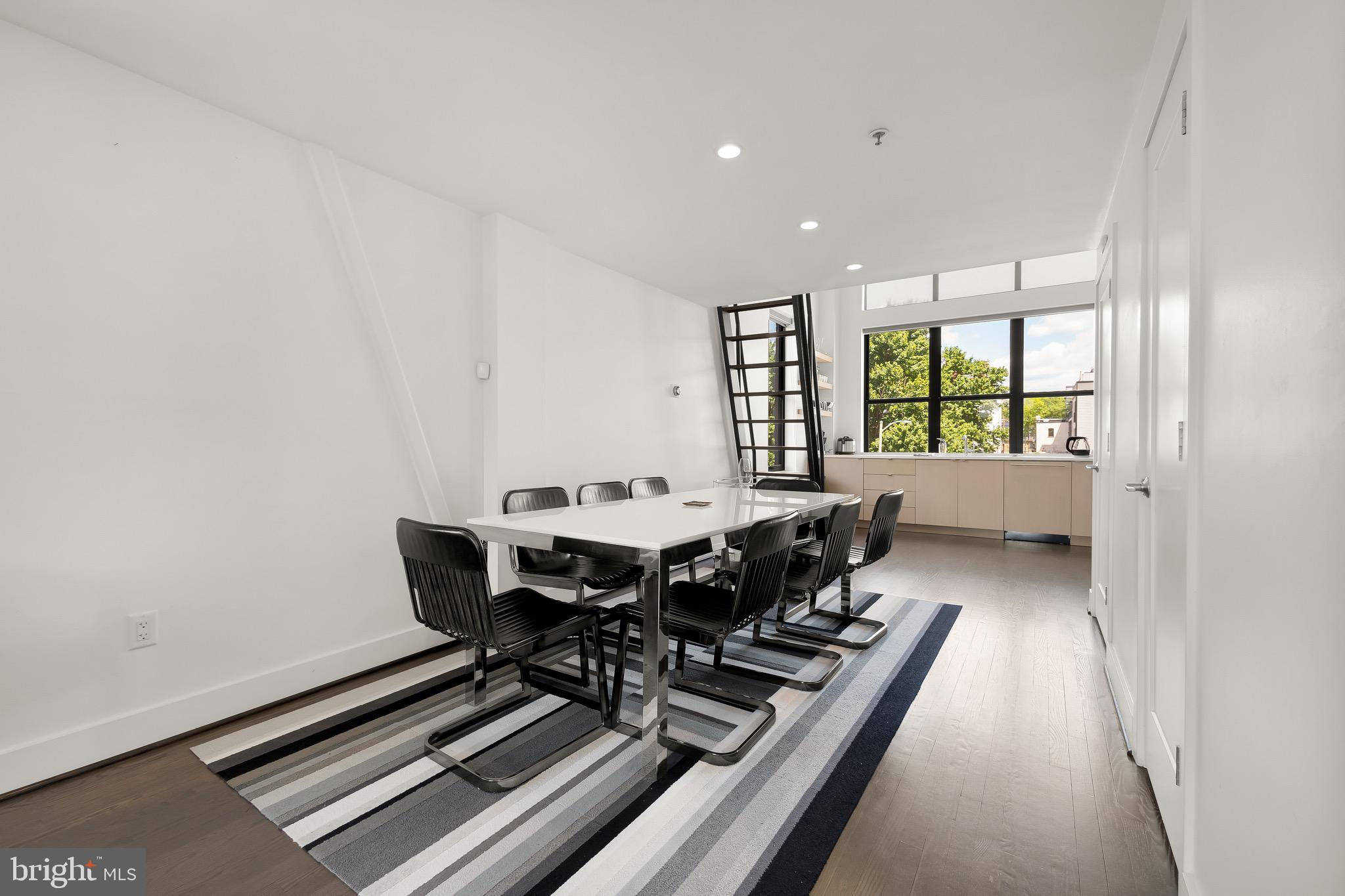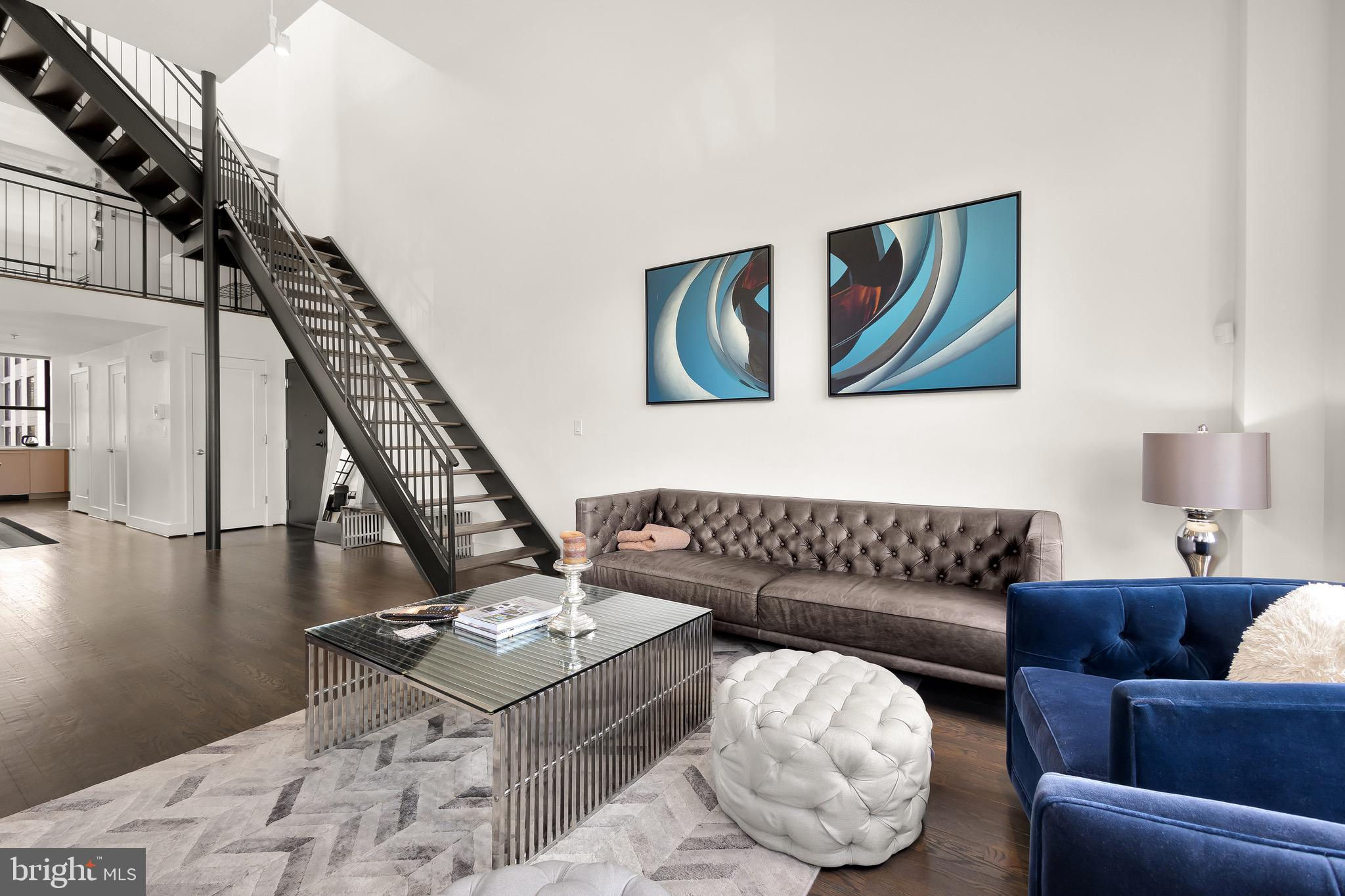 A spectacular penthouse in the lively 14th Street Corridor neighborhood of DC. 1111 W St NW #8 is an impressive loft-style, modern condominium crafted by Christopher Boutlier, epitomizing urban sophistication. This 2-bedroom, plus large den, 2.5-bathroom residence spans three levels and 1,800 square feet, featuring over 15-foot ceilings, chic designer touches, high-end fixtures, and custom-stained hardwood floors. Natural light pours through expansive windows on the Main Level, illuminating the spacious open floor plan and elegantly curated living areas. The two-story Living Room, with its floor-to-ceiling windows, fireplace, dining area, and extensive city and treetop views, is truly breathtaking. The open Gourmet Kitchen, equipped with Bosch and Fisher & Paykel appliances. A generous Loft overlooks the main living space, providing a private area ideal for an office, reading nook, or observation perch. The second floor houses two en-suite bedrooms, each with fitted walk-in closets and luxurious spa-like bathrooms. The unit includes one parking space. Residents of the esteemed City Lofts Condominium Building have access to a large outdoor lawn, community patio, and BBQ Grill. The condo fee is $570 per month, covering water, management, landscaping, snow removal, and common area cleaning.