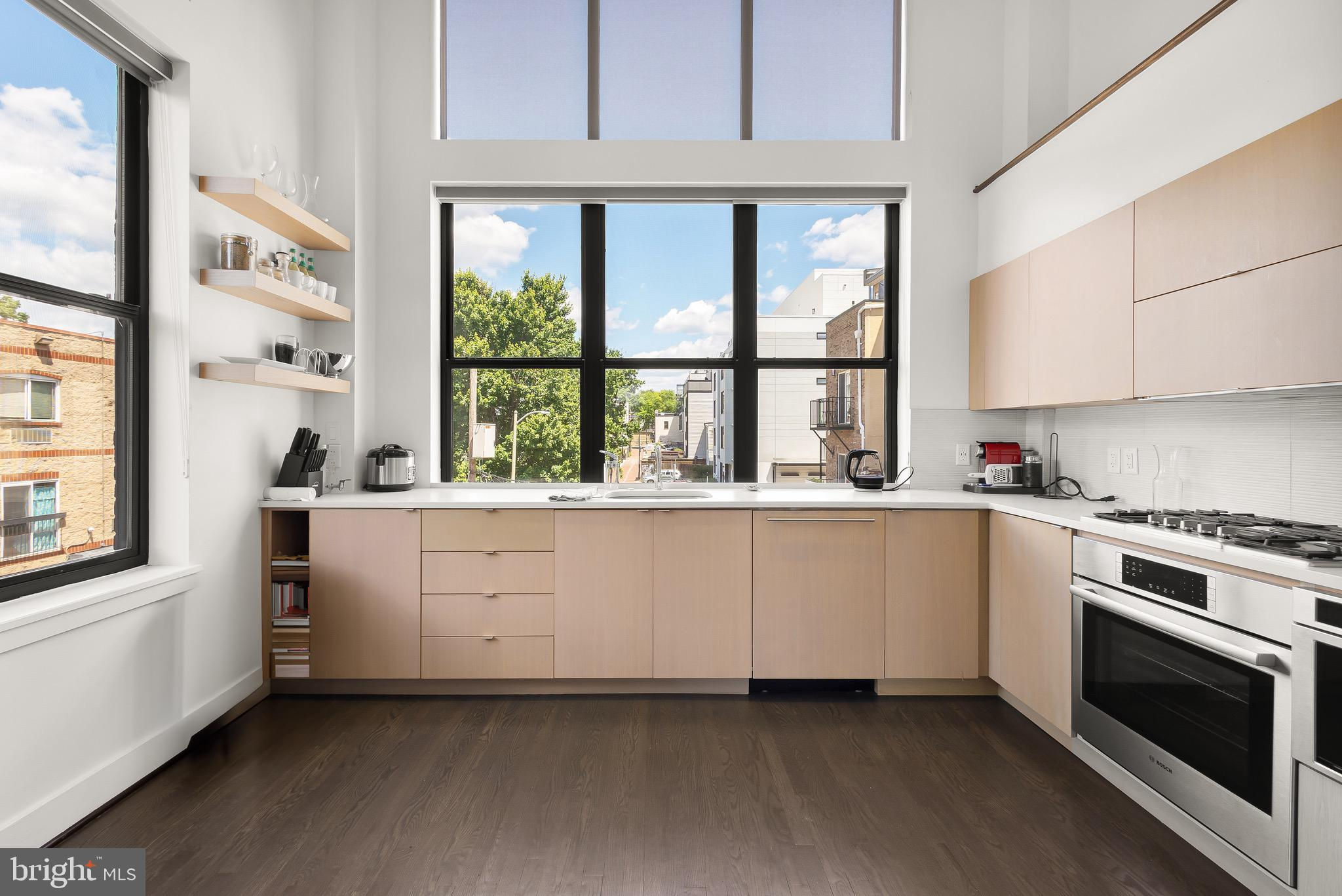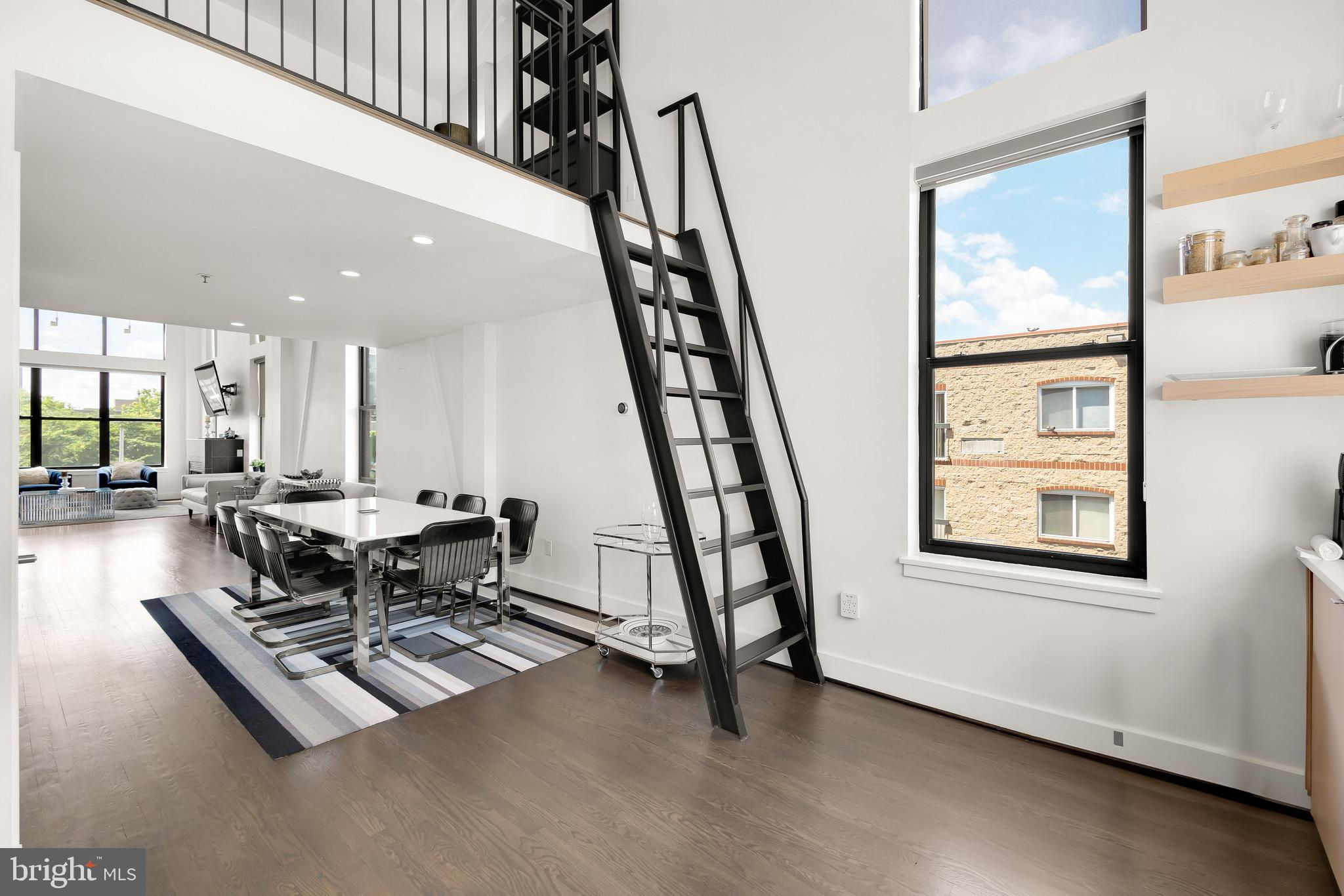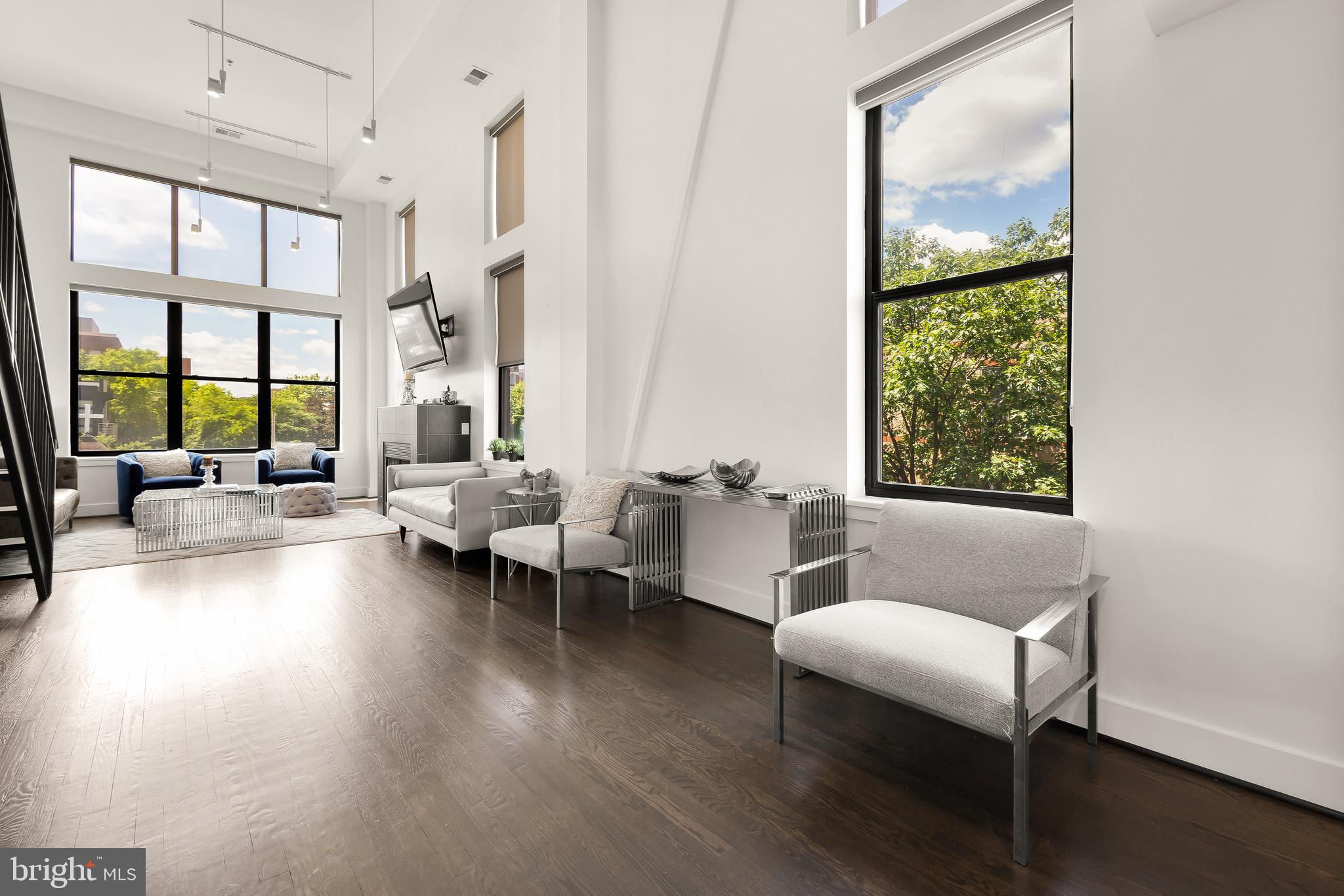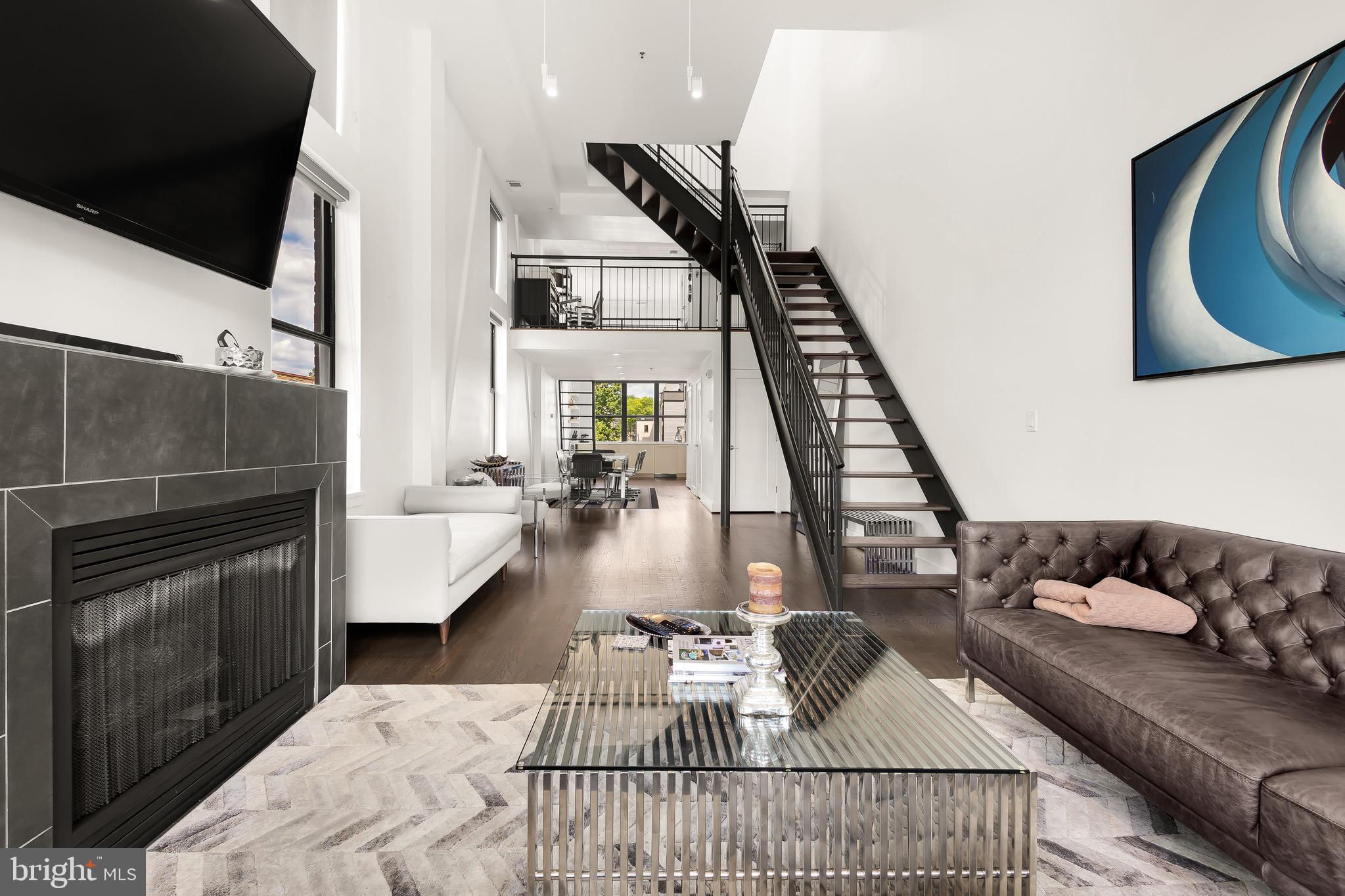 A spectacular penthouse in the lively 14th Street Corridor neighborhood of DC. 1111 W St NW #8 is an impressive loft-style, modern condominium crafted by Christopher Boutlier, epitomizing urban sophistication. This 2-bedroom, plus large den, 2.5-bathroom residence spans three levels and 1,800 square feet, featuring over 15-foot ceilings, chic designer touches, high-end fixtures, and custom-stained hardwood floors. Natural light pours through expansive windows on the Main Level, illuminating the spacious open floor plan and elegantly curated living areas. The two-story Living Room, with its floor-to-ceiling windows, fireplace, dining area, and extensive city and treetop views, is truly breathtaking. The open Gourmet Kitchen, equipped with Bosch and Fisher & Paykel appliances. A generous Loft overlooks the main living space, providing a private area ideal for an office, reading nook, or observation perch. The second floor houses two en-suite bedrooms, each with fitted walk-in closets and luxurious spa-like bathrooms. The unit includes one parking space. Residents of the esteemed City Lofts Condominium Building have access to a large outdoor lawn, community patio, and BBQ Grill. The condo fee is $570 per month, covering water, management, landscaping, snow removal, and common area cleaning.
