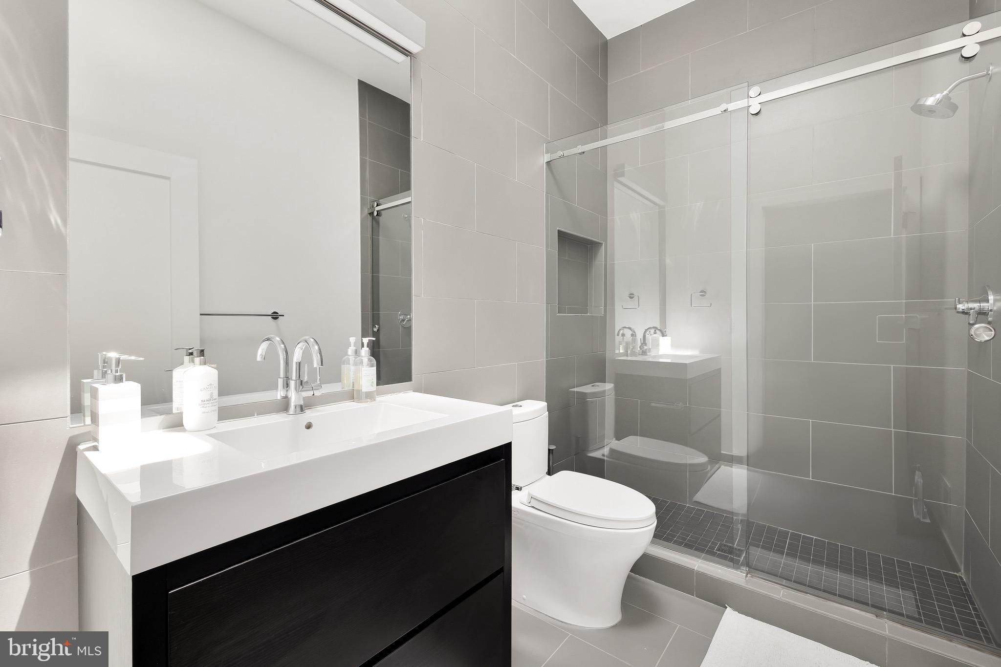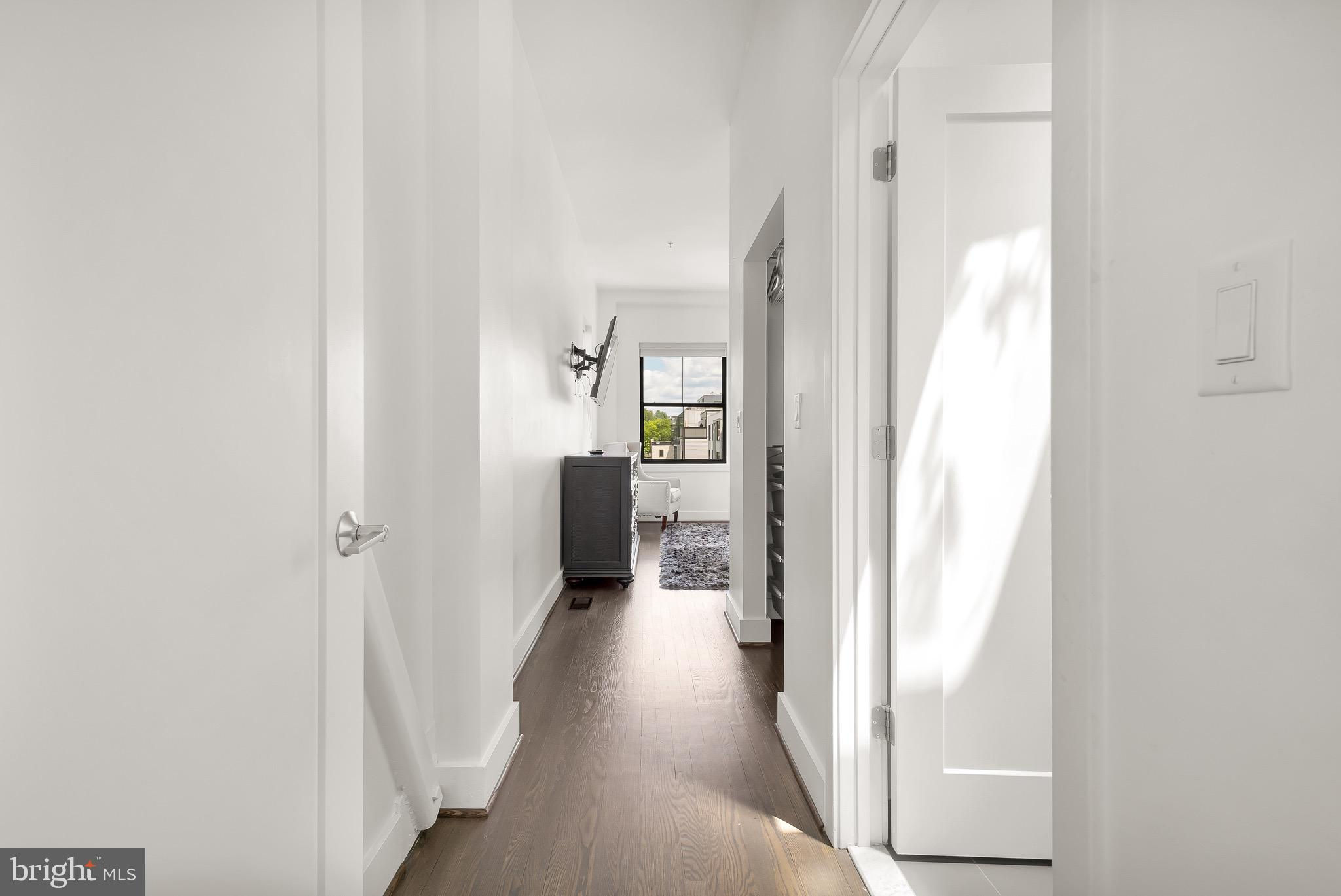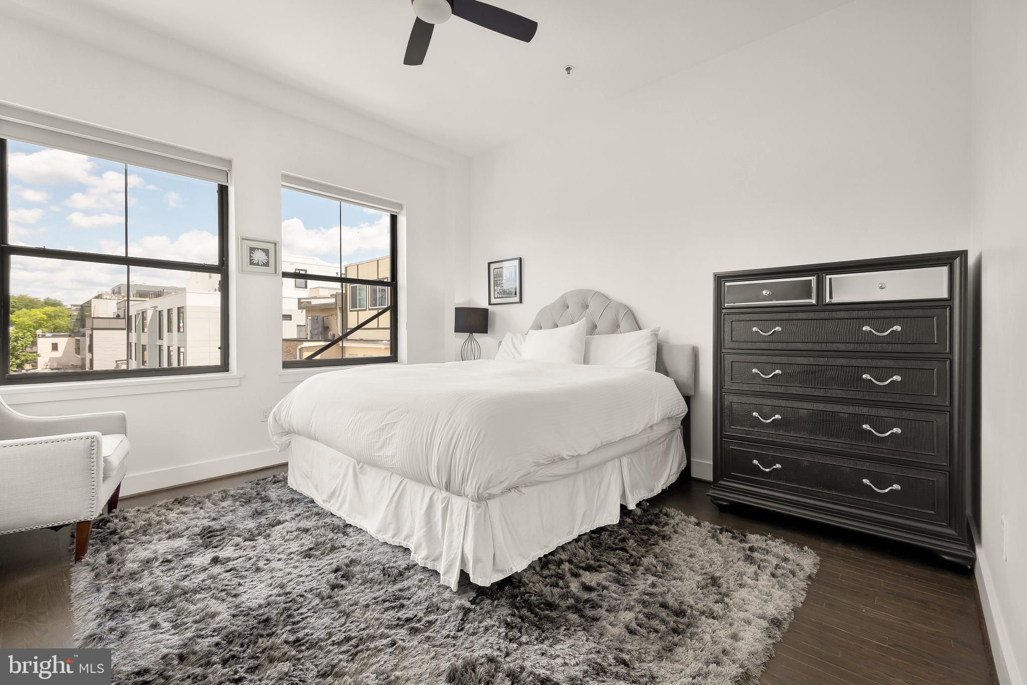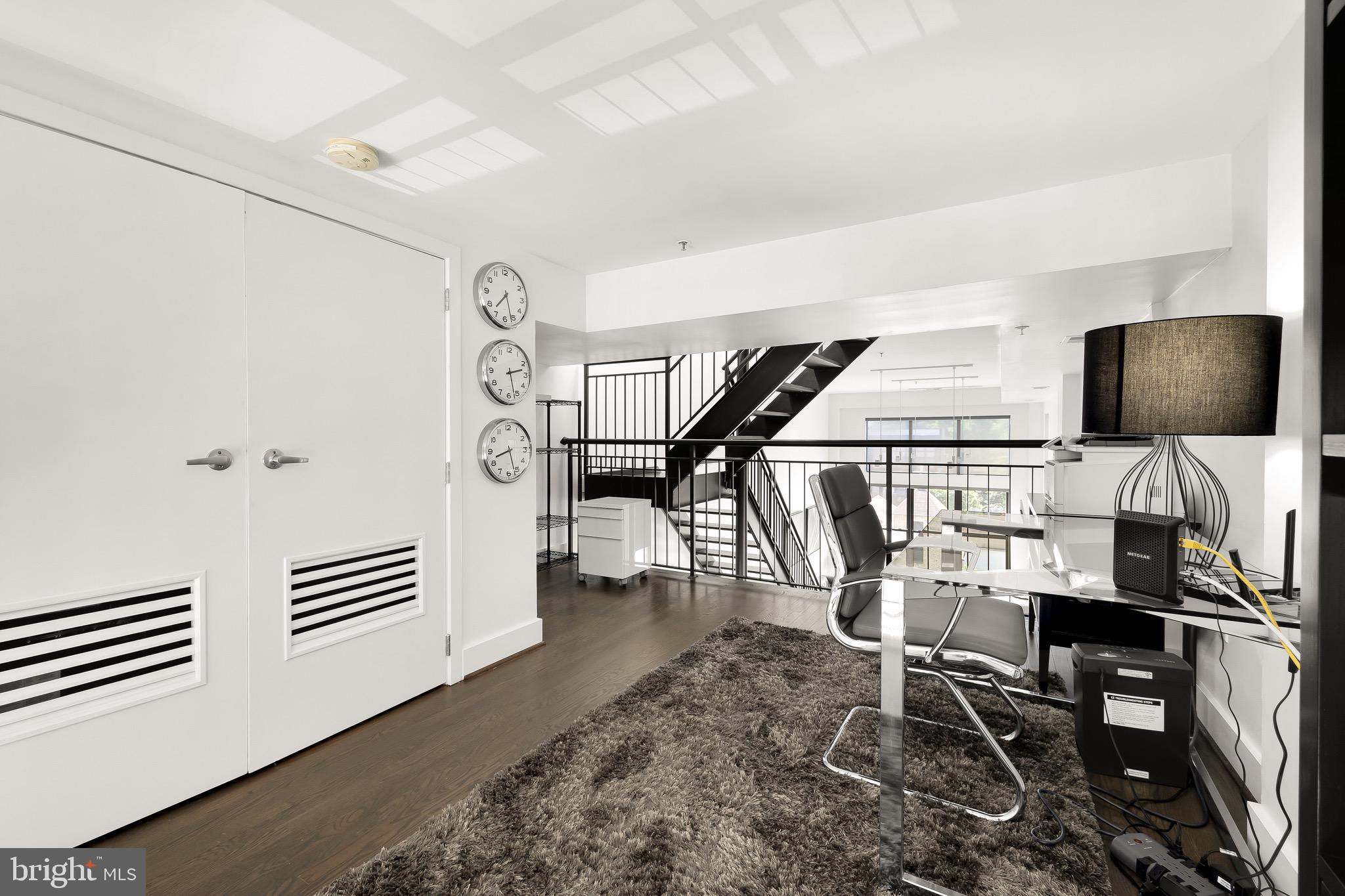 A spectacular penthouse in the lively 14th Street Corridor neighborhood of DC. 1111 W St NW #8 is an impressive loft-style, modern condominium crafted by Christopher Boutlier, epitomizing urban sophistication. This 2-bedroom, plus large den, 2.5-bathroom residence spans three levels and 1,800 square feet, featuring over 15-foot ceilings, chic designer touches, high-end fixtures, and custom-stained hardwood floors. Natural light pours through expansive windows on the Main Level, illuminating the spacious open floor plan and elegantly curated living areas. The two-story Living Room, with its floor-to-ceiling windows, fireplace, dining area, and extensive city and treetop views, is truly breathtaking. The open Gourmet Kitchen, equipped with Bosch and Fisher & Paykel appliances. A generous Loft overlooks the main living space, providing a private area ideal for an office, reading nook, or observation perch. The second floor houses two en-suite bedrooms, each with fitted walk-in closets and luxurious spa-like bathrooms. The unit includes one parking space. Residents of the esteemed City Lofts Condominium Building have access to a large outdoor lawn, community patio, and BBQ Grill. The condo fee is $570 per month, covering water, management, landscaping, snow removal, and common area cleaning.