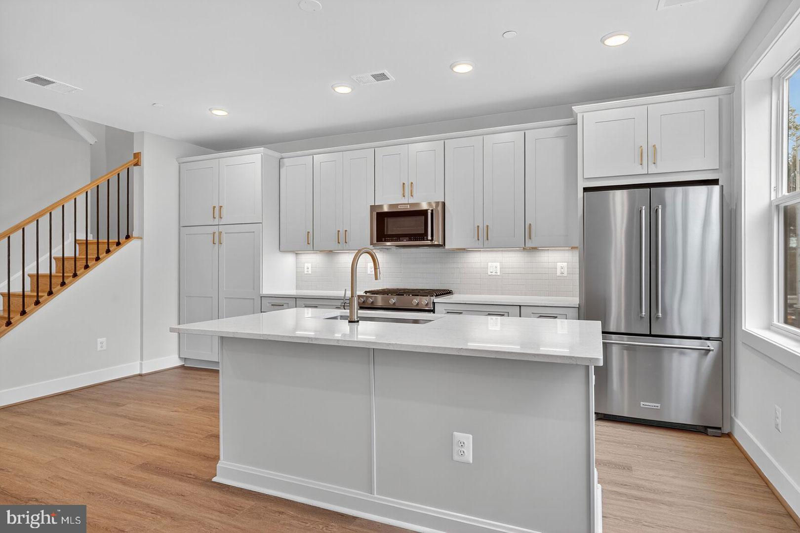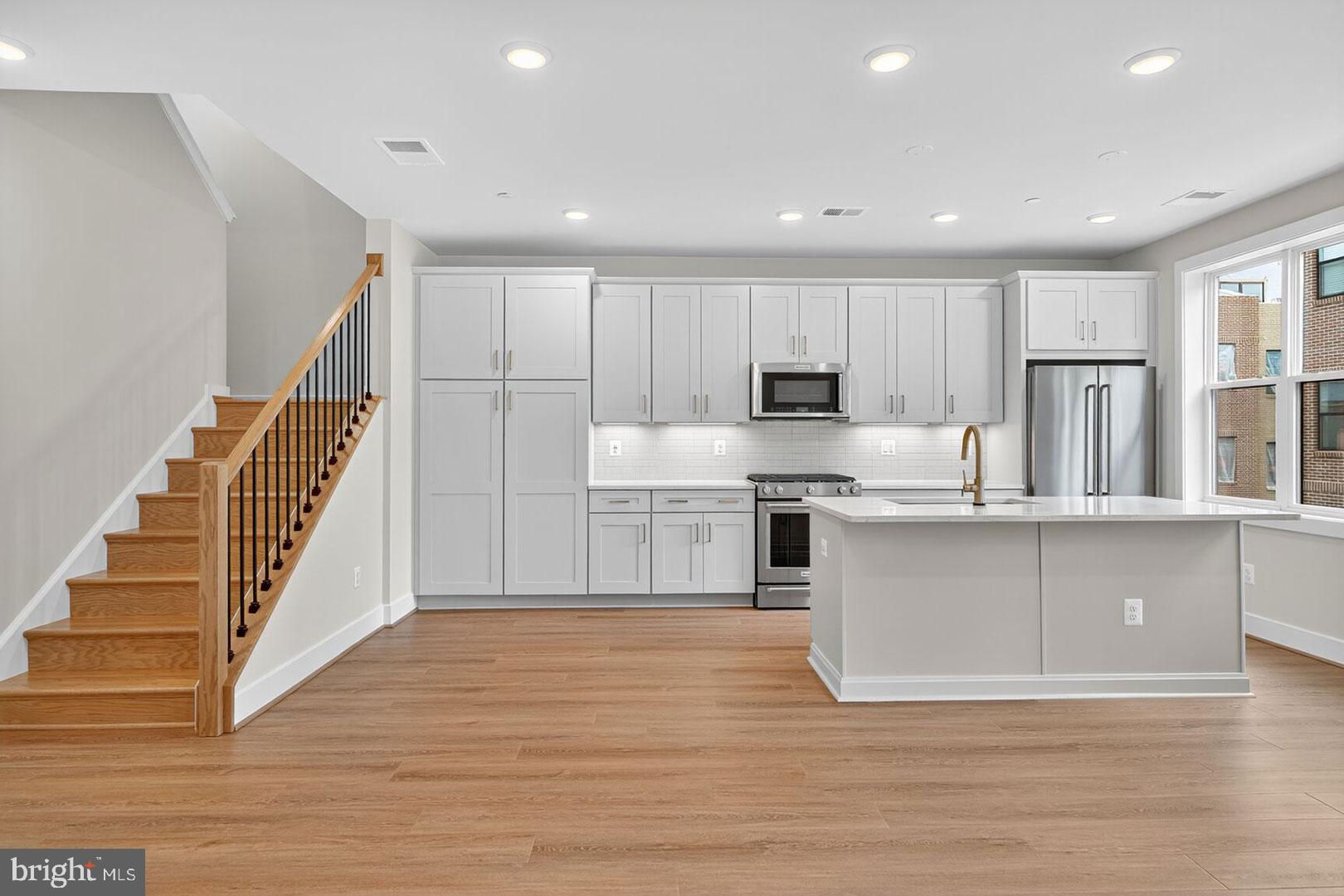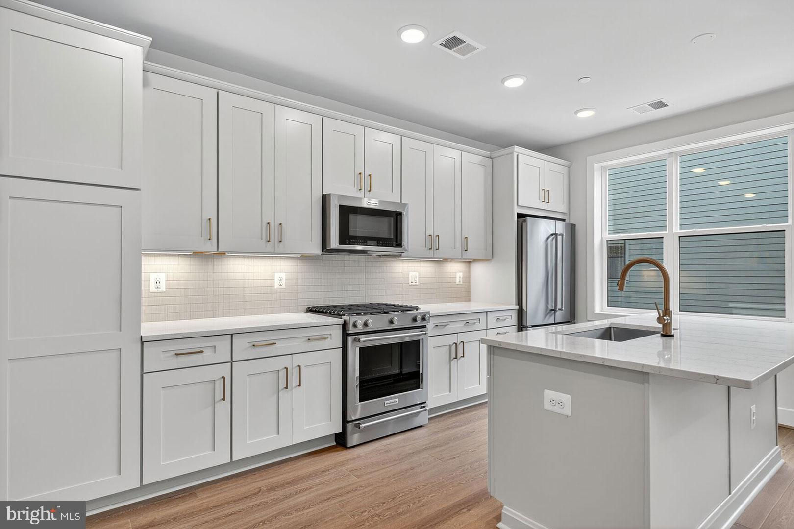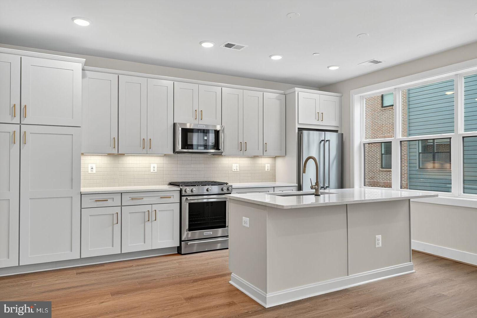 Designed for everyday living and entertaining, the main level seamlessly blends the kitchen, dining, and great room into a stylish, functional space. The kitchen is complete with Pearl Jasmine countertops, Agreeable Gray cabinets, gold hardware, and KitchenAid stainless steel appliances. Step up to the second floor, which features two roomy secondary bedrooms, a hall bath, and a laundry room. The third level is surely all about you. An entire floor becomes a dedicated primary suite with a dual vanity, and even your very own private outdoor terrace access.