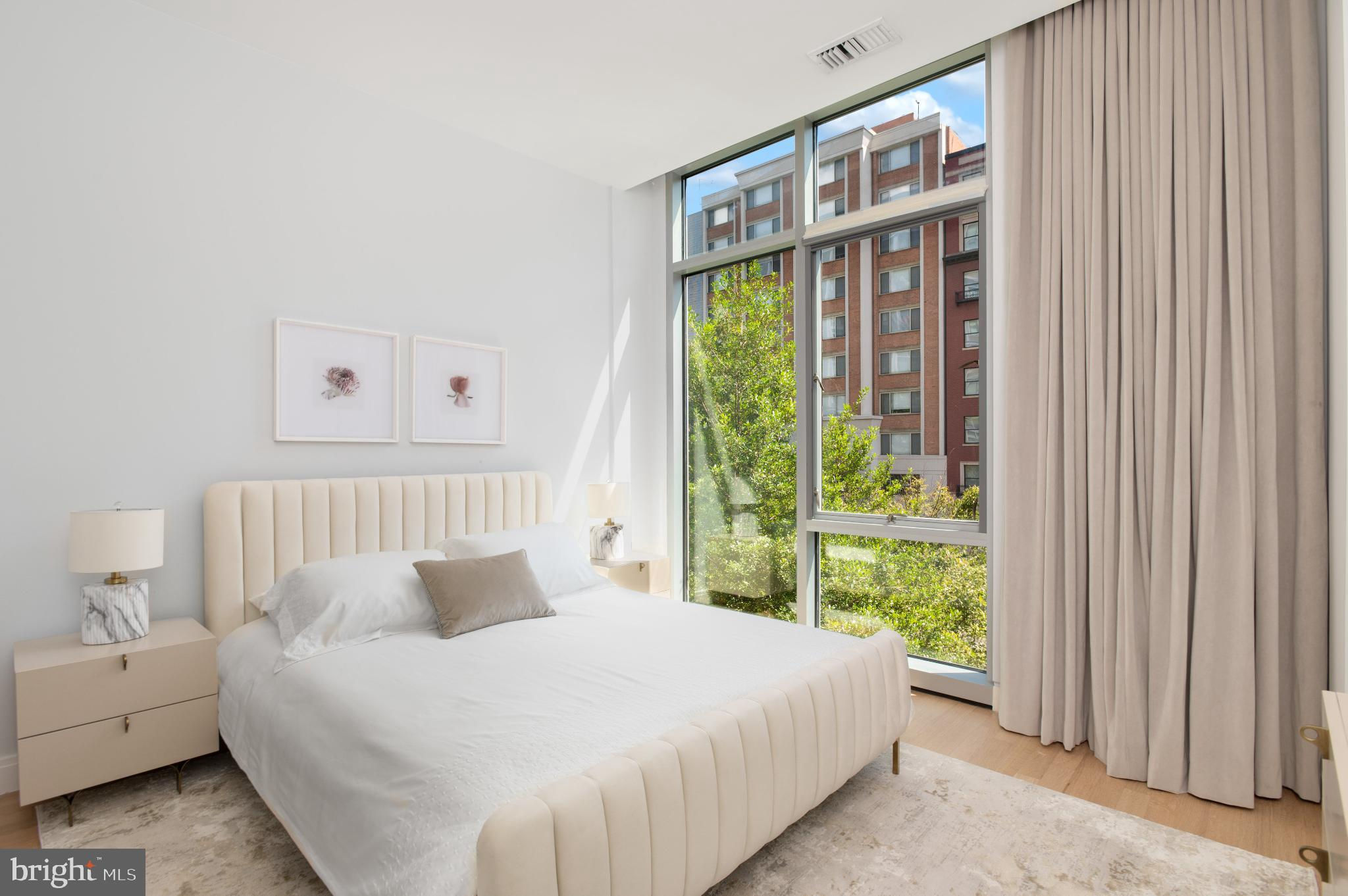 A rare opportunity to own a 3-bedroom condo in the acclaimed 22 West Condominium in DC’s sought-after West End! This expansive residence offers 2,143 interior SF, 3 Bed, 3 Baths, dramatic scale with an inviting entry foyer and a spectacular living room framed by two walls (eastern and western exposure!) of floor-to-ceiling windows overlooking tree lined 22nd St and New Hampshire Ave. The chef’s kitchen showcases Poggenpohl cabinetry, granite counters, and Sub-Zero and Bosch appliances. Recent upgrades include modern ceiling lighting, new bath flooring, a sliding door in the primary bath, motorized shades and curtains, and efficient dual HVAC systems. A custom Italian glass sliding wall by Ramadesio creates a flexible den/office (3rd Br) with privacy and light, while interiors are enhanced with recently refinished hardwood floors, and an accent column with a striking French mural. Two side-by-side garage spaces and a large storage unit convey. 22 West delivers the ease of full-service living with 24-hour front desk concierge, doorman, and on-site management. Residents enjoy a heated rooftop pool with expansive sundeck and grilling stations, a modern fitness center, and stylish party and meeting rooms that make entertaining effortless. The monthly condominium fee is truly all-inclusive—covering electricity, gas, water, heating and cooling, cable TV, Verizon Fios high-speed internet, and more—removing the burden of multiple bills and creating a seamless lock-and-leave lifestyle. Perfectly positioned in the heart of the West End, the building is steps to Trader Joe’s, Whole Foods, Equinox, Metro, and the endless dining and cultural options of Georgetown and Dupont Circle.