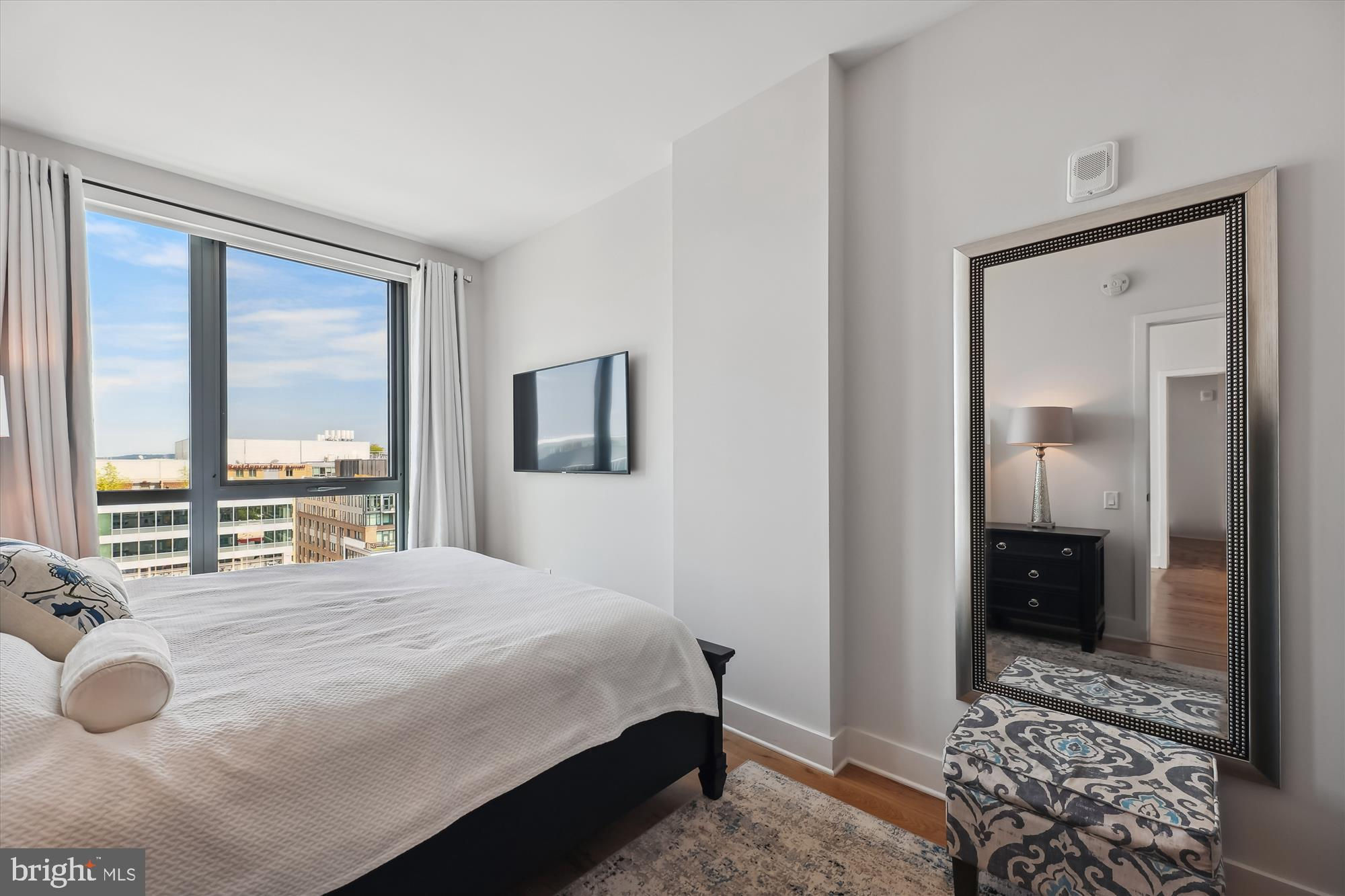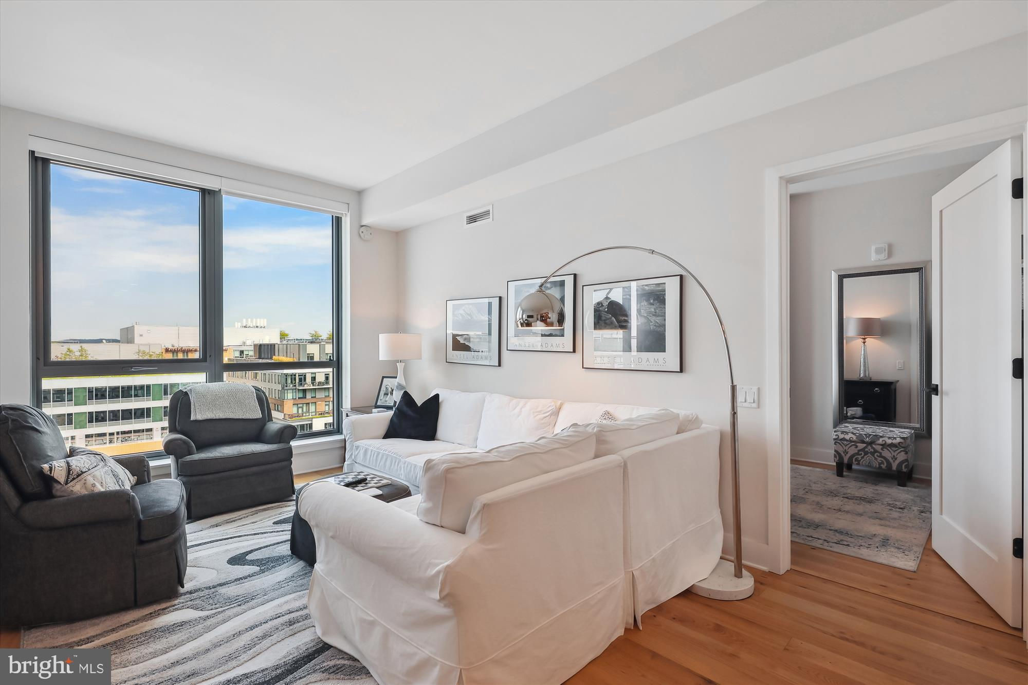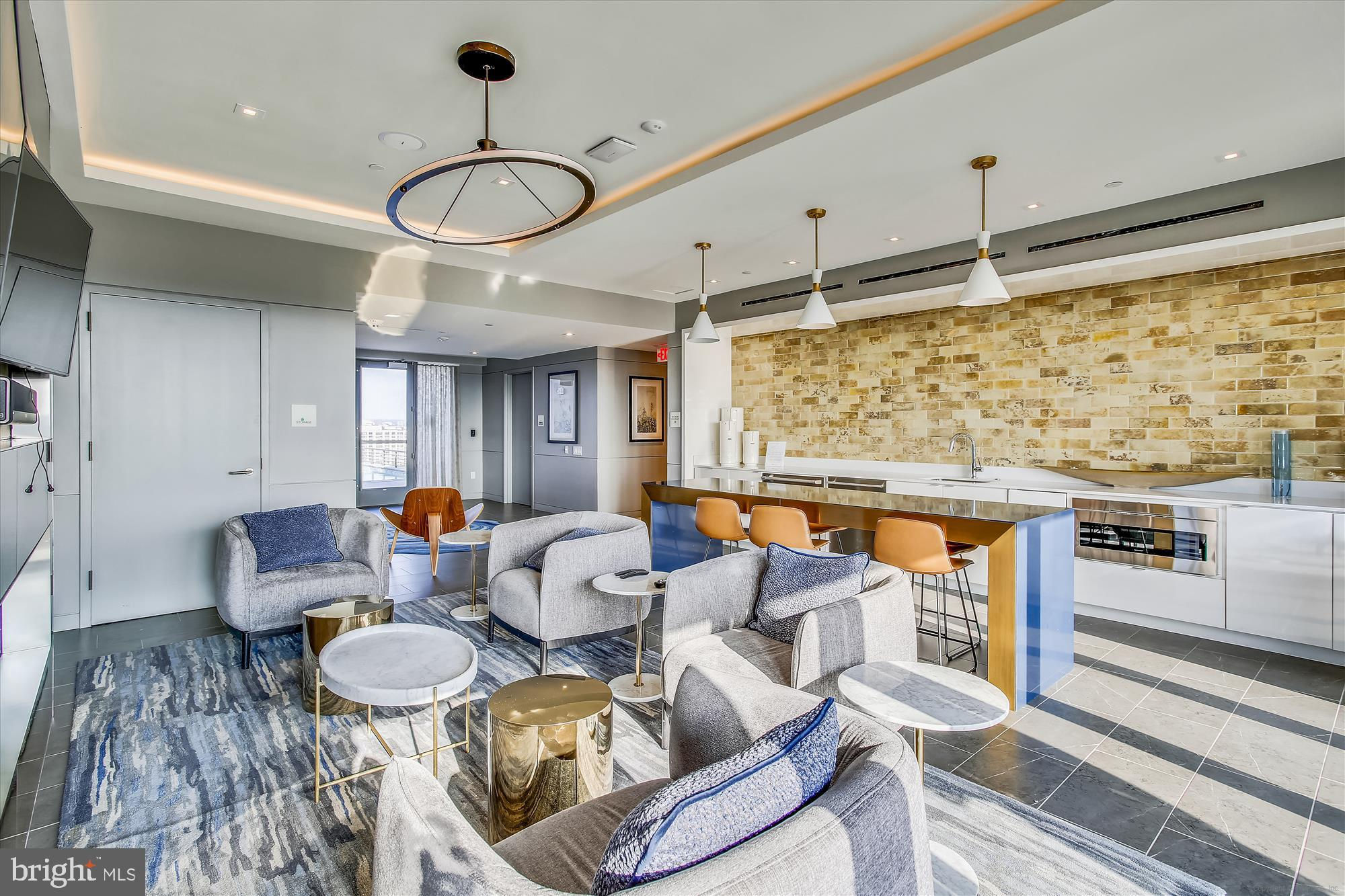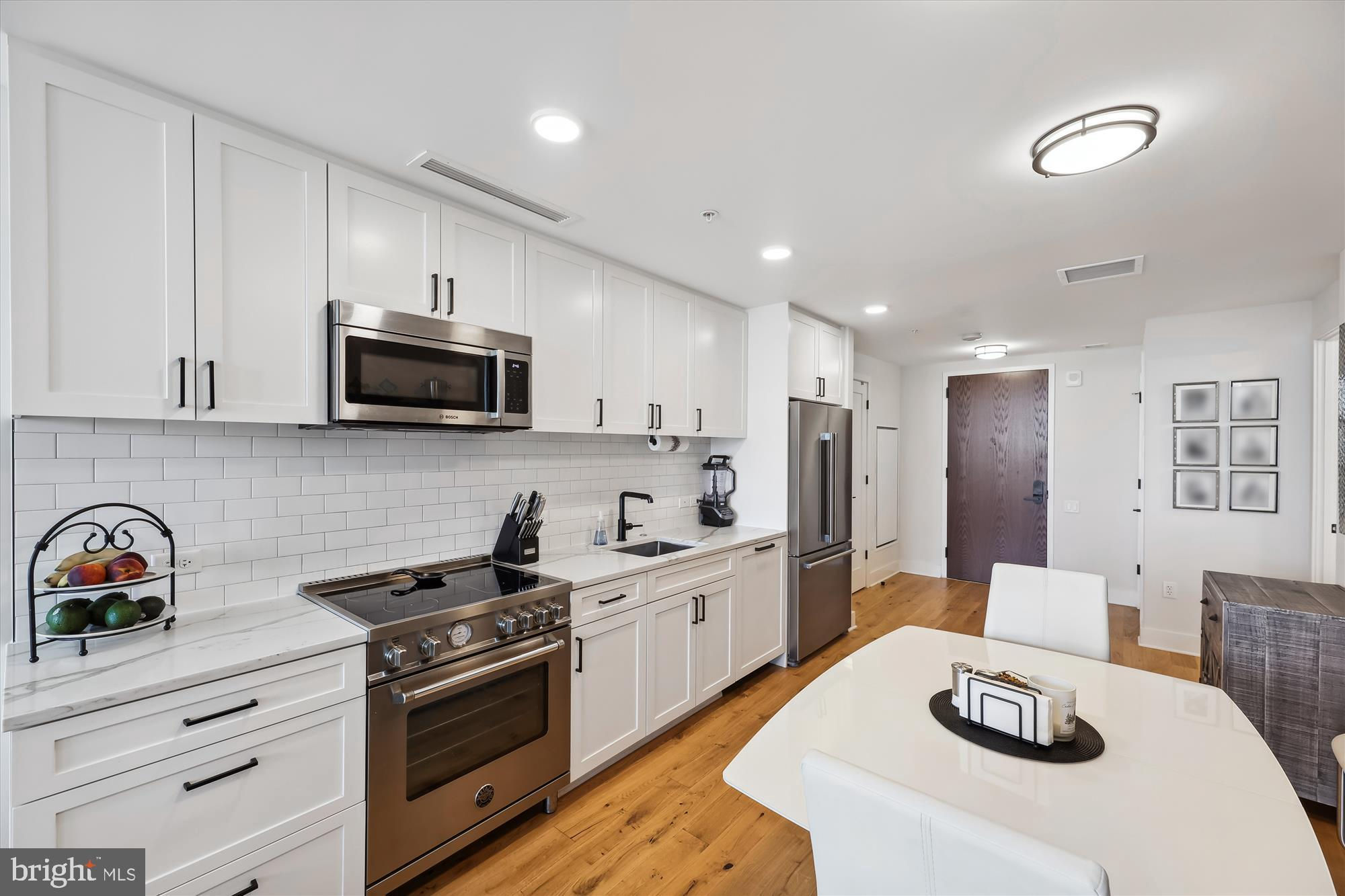 Step into The Avidian, nestled in the Navy Yard neighborhood, a harmonious blend of urban convenience and cozy community vibes. This two-bedroom, two-bath condo in the New Traditionalist color palette exudes modern elegance, featuring white cabinets with black handles and upgraded Bosch appliances. With slow-closed doors, a stackable Bosch washer and dryer, and custom closets in both spacious bedrooms, this unit is tailored for a sophisticated lifestyle. The building amenities include a rooftop pool, sundeck, lounge, fire pit, and grill dining tables, offering a luxurious retreat. On the lobby level, residents can unwind in the lounge with a café, billiards, and fireplace or stay active in the fitness center, Zen garden, or yoga deck. Pet owners will appreciate the convenience of the pet spa and dog play area. Commuting is a breeze with easy access to major transportation routes, including Interstate 395 and 695, and proximity to the Navy Yard ballpark on the green line. This 14-story building boasts high ceilings, 5-inch wide oak flooring, custom backsplash, under-cabinet lighting, and soft-close cabinetry. Enjoy the convenience of custom roller shades, a latch keyless entry system, and the option for an underground parking spot. Both bathrooms are generously sized, with the primary bath featuring a double vanity and an enormous shower stall, designed for comfort and luxury. Live in style at The Viviane, where every detail is crafted for refined urban living.