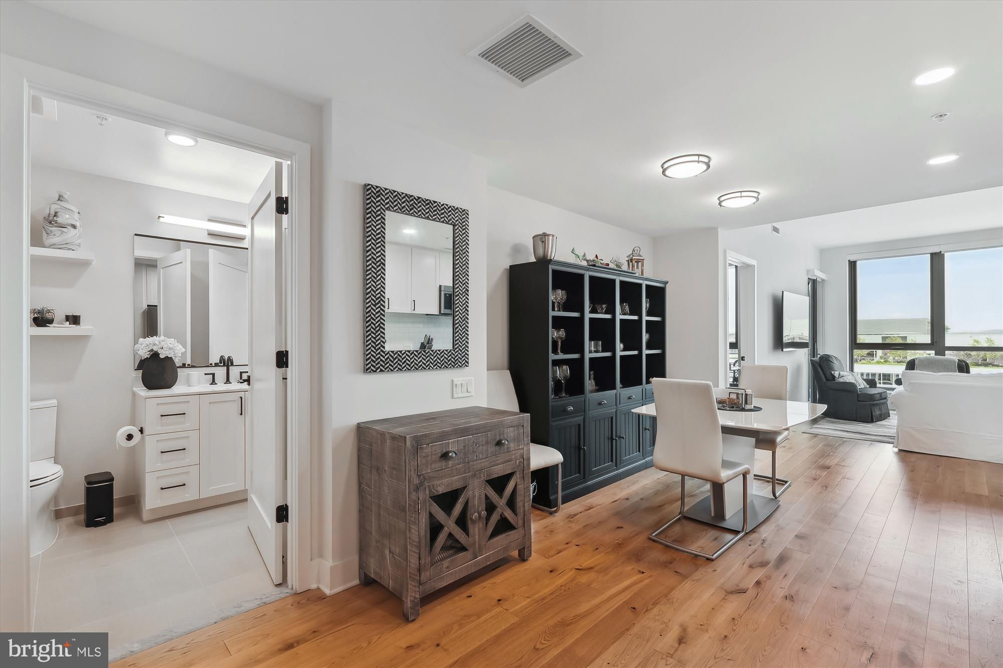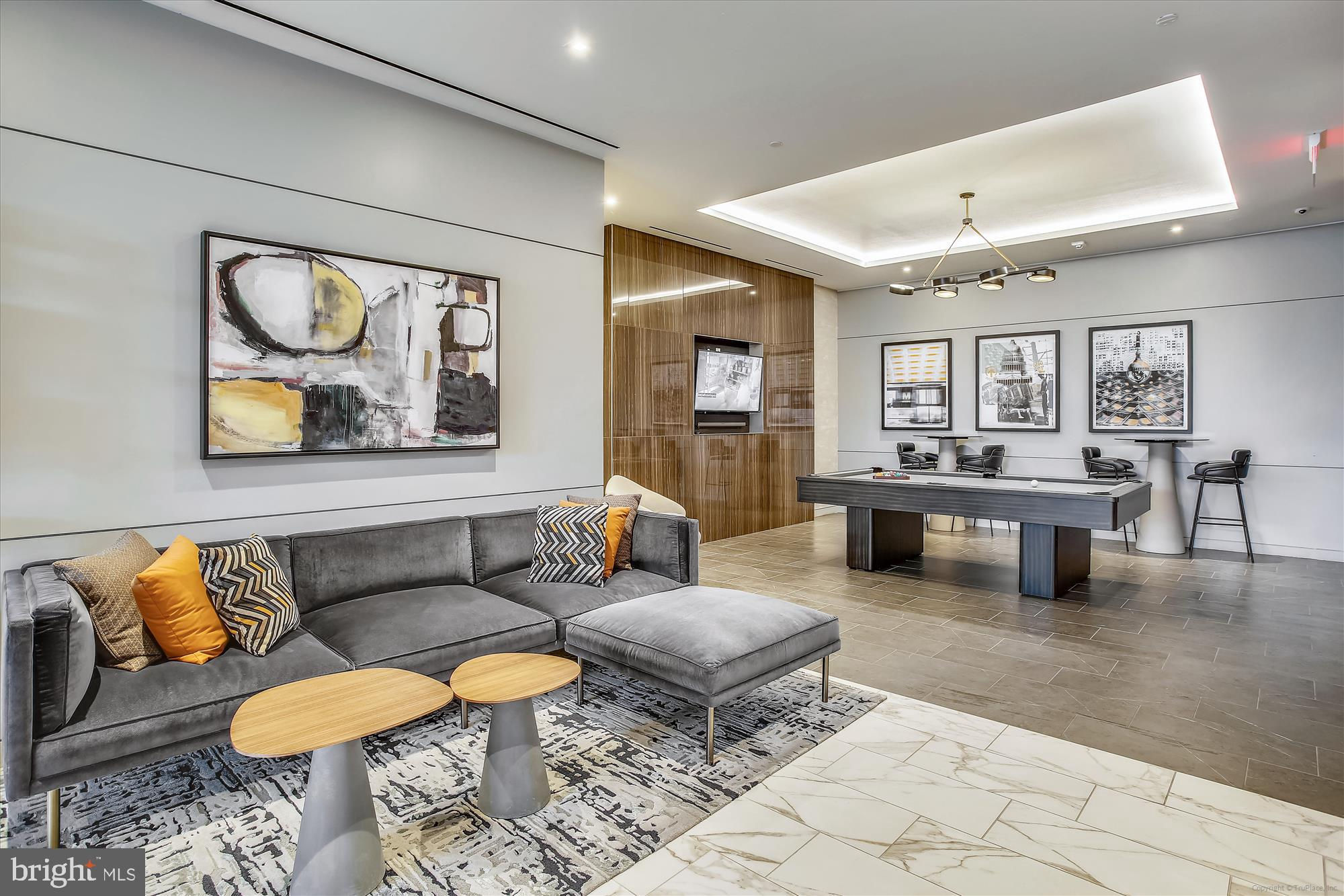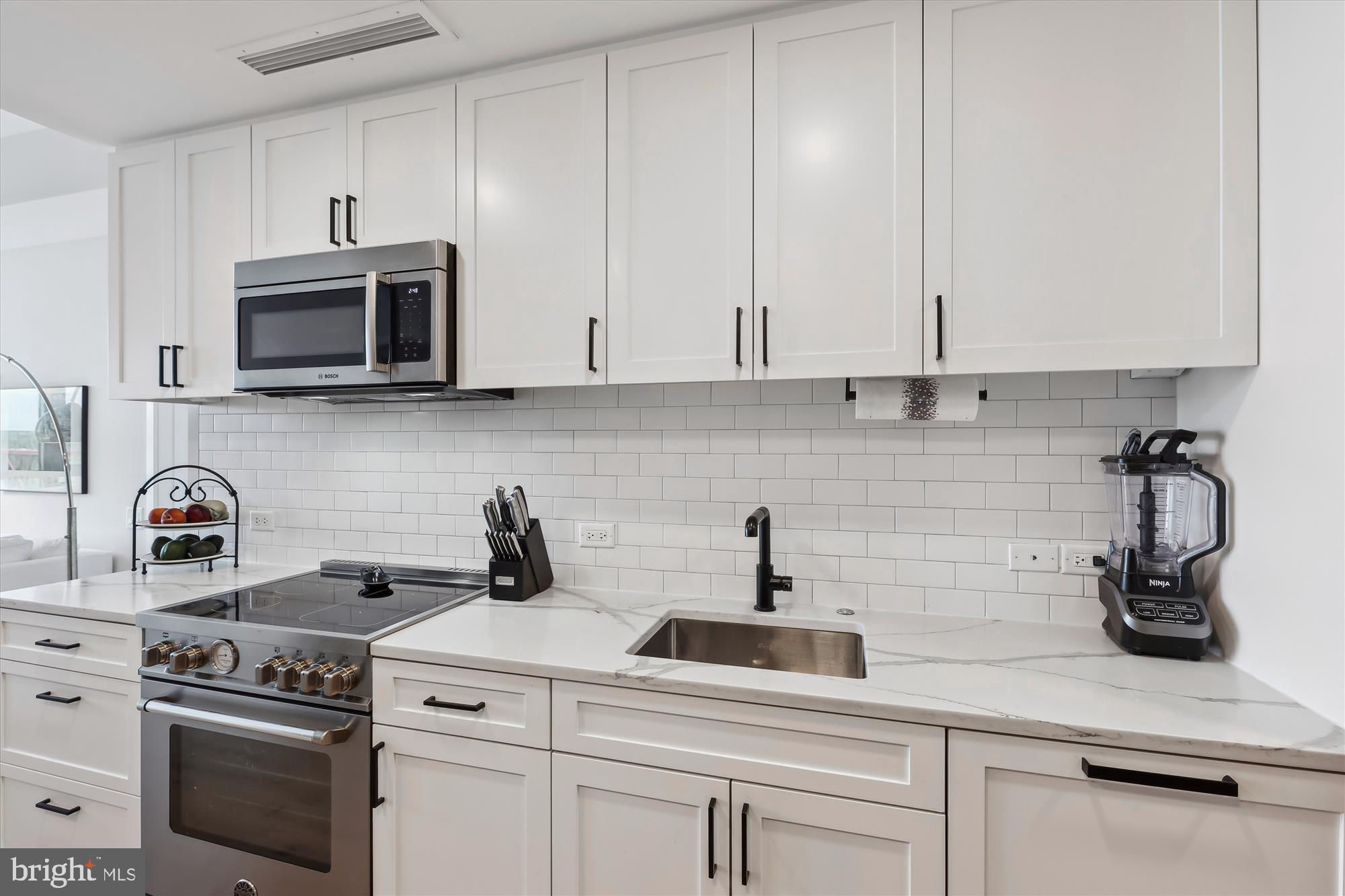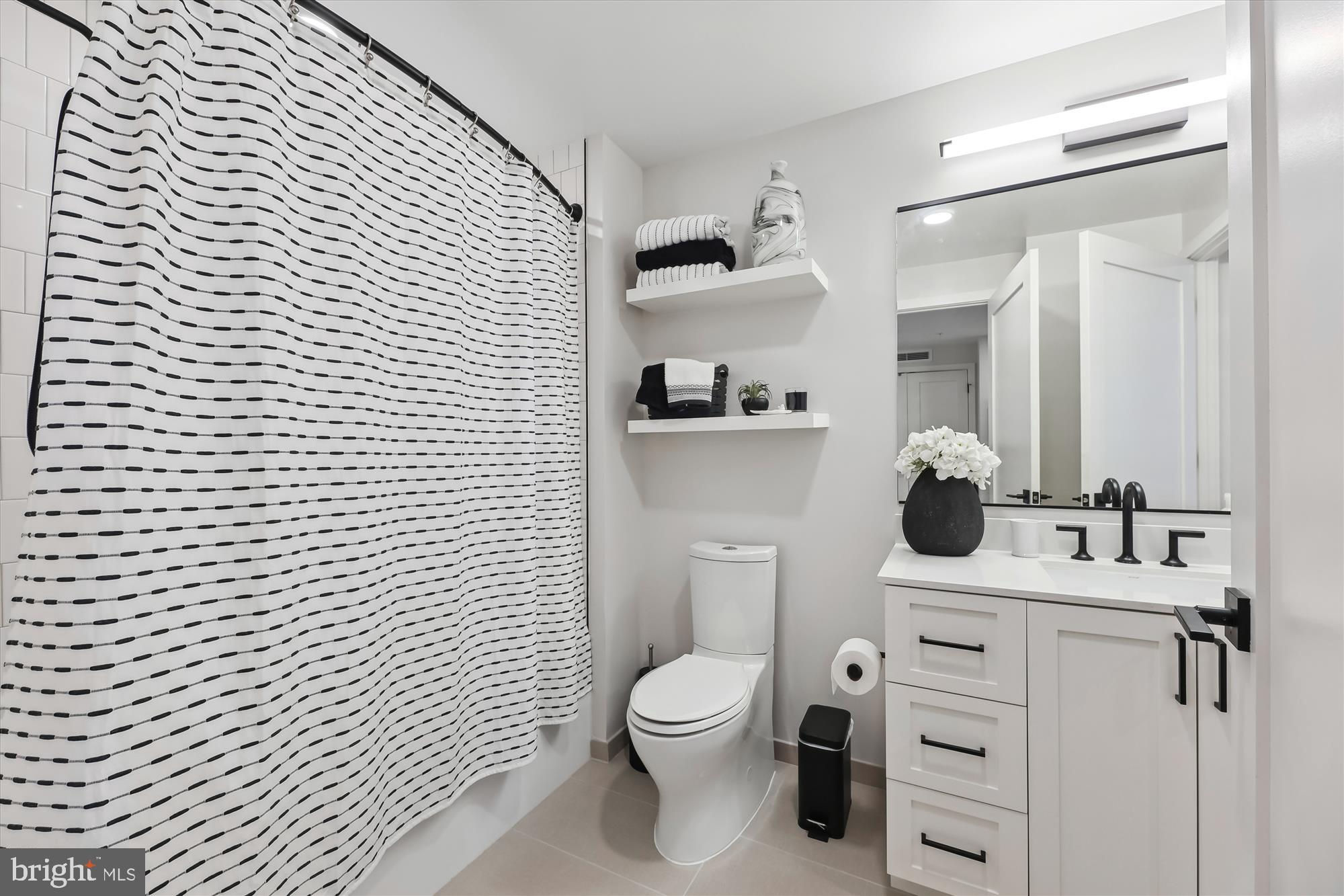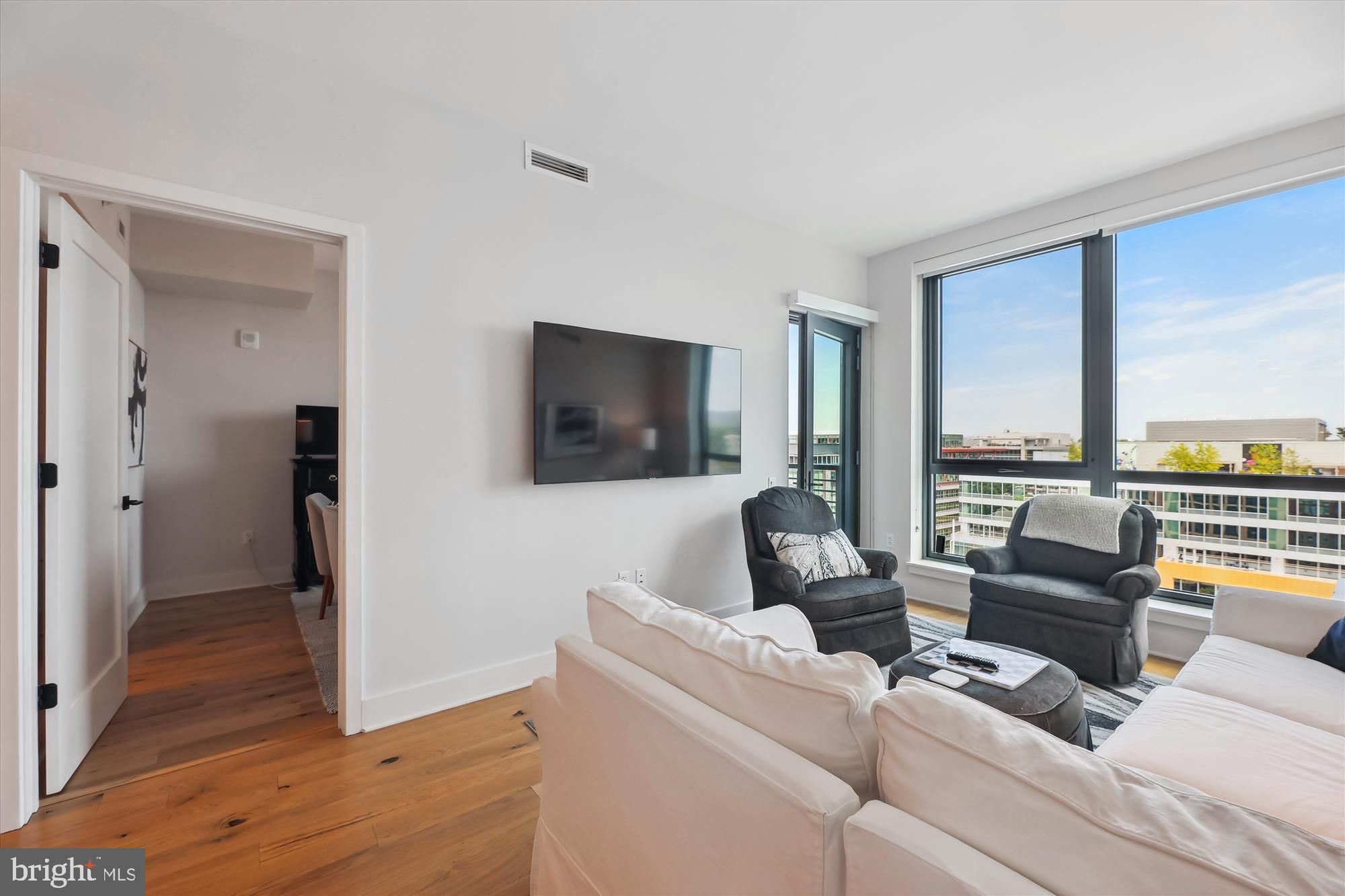 Step into The Avidian, nestled in the Navy Yard neighborhood, a harmonious blend of urban convenience and cozy community vibes. This two-bedroom, two-bath condo in the New Traditionalist color palette exudes modern elegance, featuring white cabinets with black handles and upgraded Bosch appliances. With slow-closed doors, a stackable Bosch washer and dryer, and custom closets in both spacious bedrooms, this unit is tailored for a sophisticated lifestyle. The building amenities include a rooftop pool, sundeck, lounge, fire pit, and grill dining tables, offering a luxurious retreat. On the lobby level, residents can unwind in the lounge with a café, billiards, and fireplace or stay active in the fitness center, Zen garden, or yoga deck. Pet owners will appreciate the convenience of the pet spa and dog play area. Commuting is a breeze with easy access to major transportation routes, including Interstate 395 and 695, and proximity to the Navy Yard ballpark on the green line. This 14-story building boasts high ceilings, 5-inch wide oak flooring, custom backsplash, under-cabinet lighting, and soft-close cabinetry. Enjoy the convenience of custom roller shades, a latch keyless entry system, and the option for an underground parking spot. Both bathrooms are generously sized, with the primary bath featuring a double vanity and an enormous shower stall, designed for comfort and luxury. Live in style at The Viviane, where every detail is crafted for refined urban living.