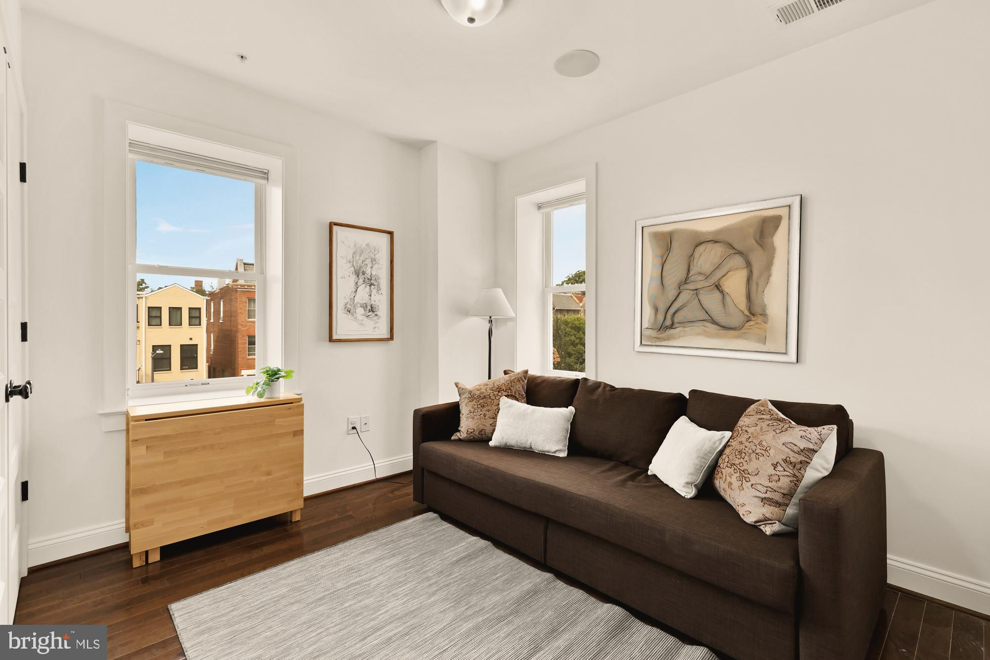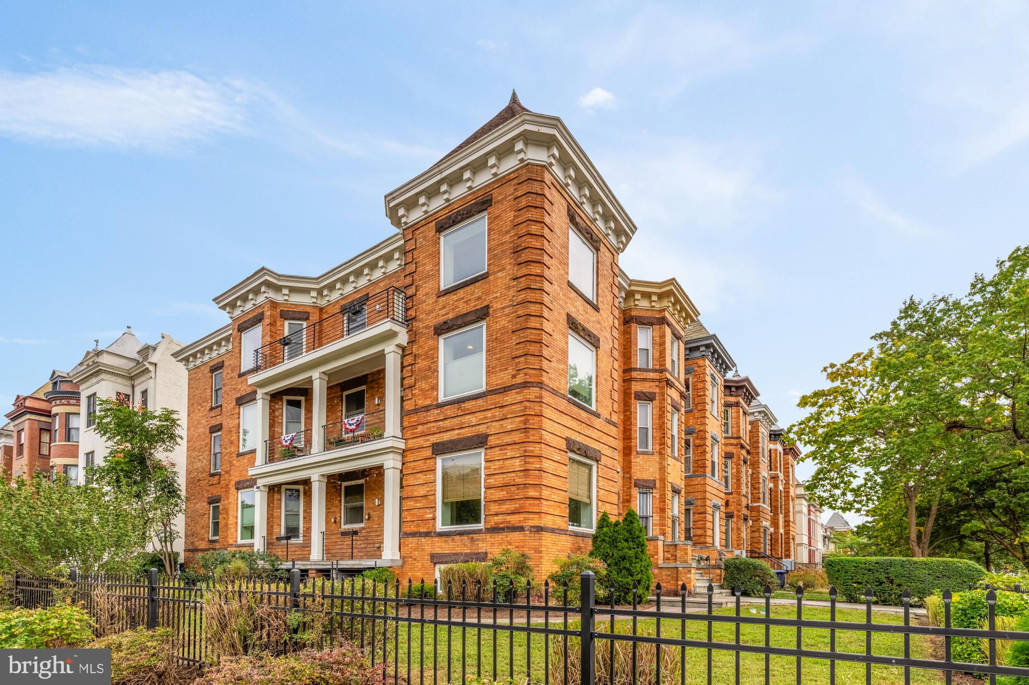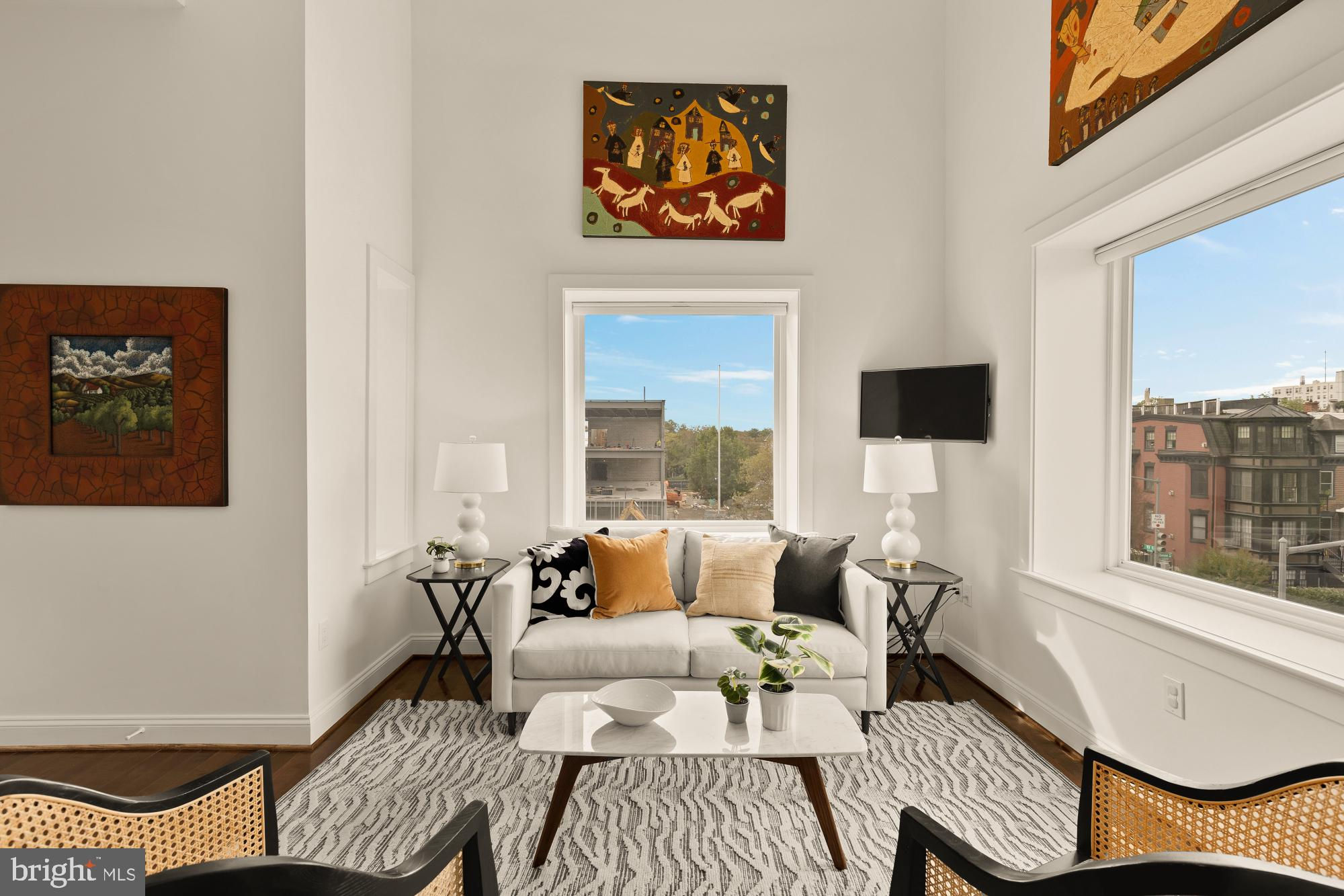 Penthouse living in the heart of Columbia Heights! This top-floor two-bedroom, two-bath condo combines soaring vaulted ceilings, abundant natural light, and thoughtfully designed indoor-outdoor living. The expansive private rooftop deck showcases sweeping views of the Capitol, Washington Monument, and the city skyline, wired for sound and complete with a storage closet. Off the kitchen, a side balcony offers a second retreat, ideal for morning coffee or al fresco dining. Inside, the open layout features a whole-home sound system, in-unit washer and dryer, and a spacious primary suite with en suite bath. The boutique building sits on a rare corner lot, with a shared yard that doubles as a dog run or a gathering space. The location is unmatched—just steps to neighborhood favorites including The Coupe, Thip Khao, El Chucho, Taqueria Habanero, and Wonderland Ballroom. Giant, Target, and the Columbia Heights Metro are nearby for easy errands, while Rock Creek Park is walkable for fresh-air escapes. A brand-new elementary school rising across the street will soon add even more vibrancy to this sought-after community. Vaulted ceilings, two outdoor spaces, a true primary suite, and a prime Columbia Heights location—this penthouse truly has it all.