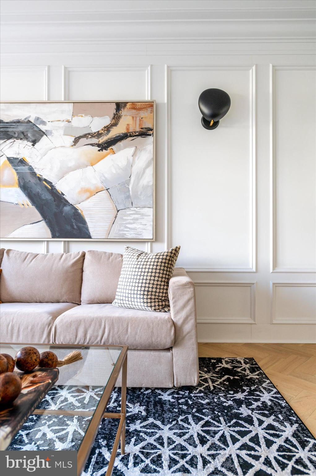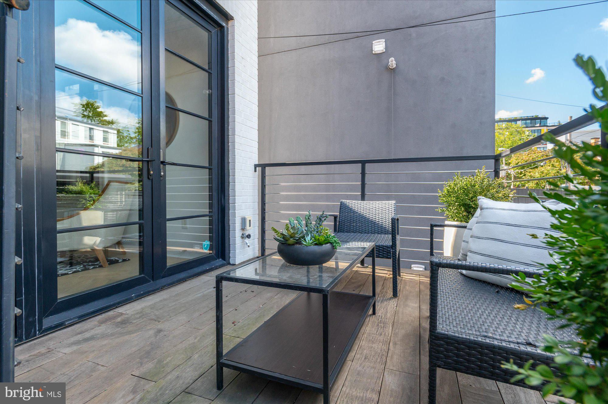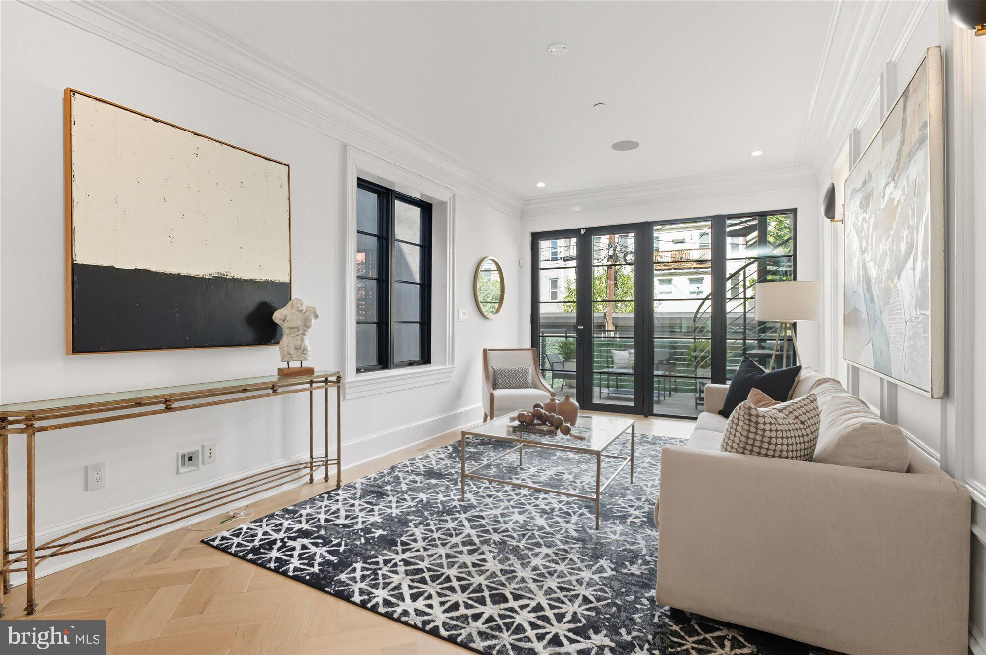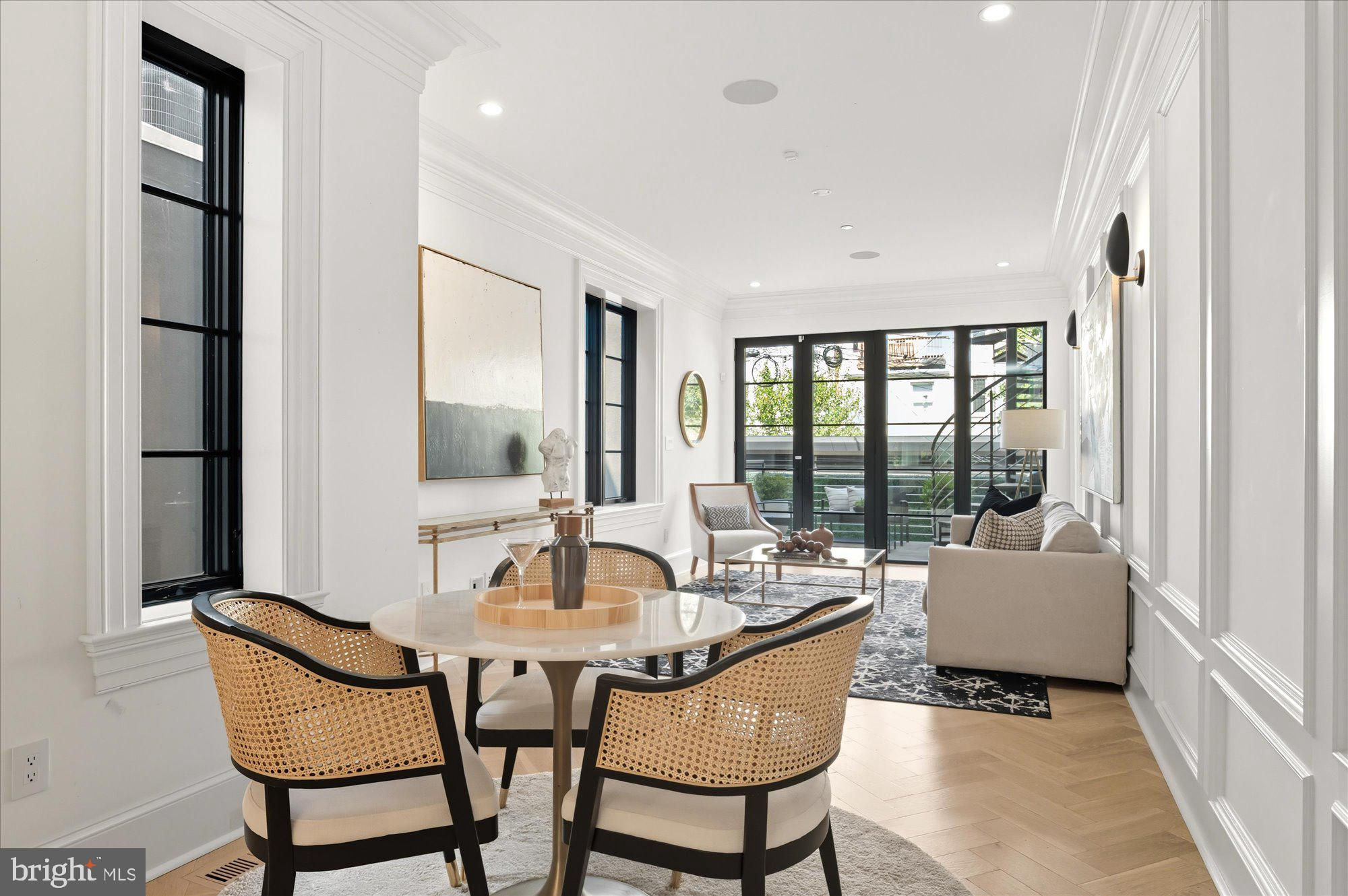 Beautiful Home, terrific Logan Circle Location! Nestled along one of Logan Circle's most coveted tree-lined streets, this exquisite two-story condo effortlessly blends historical grandeur with the luxuries of modern living. The residence preserves its architectural heritage while incorporating the conveniences and finishes that define today’s elevated lifestyle. Just steps from the vibrant 14th Street Corridor, with its eclectic mix of shops, restaurants, and cultural destinations, this home offers an unparalleled combination of location, style, and sophistication. Upon entering, the home immediately captivates with its striking white oak herringbone floors that flow seamlessly throughout, setting the tone for a space where elegance meets functionality. Custom-designed wrought iron railings add a touch of artistry to the open staircase, guiding you through a layout that balances openness with intimacy. The main level is highlighted by a dramatic dining room tucked within a turret, creating an elevated space for both entertaining and quiet reflection. A true chef’s kitchen, outfitted with sleek European cabinetry, top-tier Wolf six-burner range, and a panel-ready Sub-Zero refrigerator, invites culinary exploration. The striking quartz waterfall island serves as both a functional centerpiece and a sculptural statement. The expansive living room is bathed in light from floor-to-ceiling windows, with a seamless transition to the private terrace, ideal for enjoying a quiet evening or hosting guests. Thoughtfully placed wall moldings and a hidden powder room further elevate the home’s aesthetic, while soaring, voluminous ceilings throughout amplify the sense of space and light. On the lower level, high ceilings continue to lend a sense of grandeur, where three generously sized bedrooms are accompanied by equally stunning baths. The primary suite is a sanctuary of serenity, featuring an ensuite Zen-inspired bath complete with a freestanding soaking tub that commands attention. The spa-like experience continues with dual sinks, heated marble floors, and a separate shower. The second bedroom is equally luxurious, with its own ensuite bath boasting glamorous finishes, while the third bedroom shares a hall bath adorned with a mirrored vanity—a nod to modern opulence. A washer and dryer conveniently located on the bedroom level enhance the home's functionality. This rare gem also includes the convenience of one secure surface PARKING spot and promises an exceptional urban living experience in one of D.C.'s most desirable neighborhoods with Whole Foods and Le Diplomate just down the street. Here, history and modernity coexist harmoniously, offering a lifestyle defined by refinement and ease.