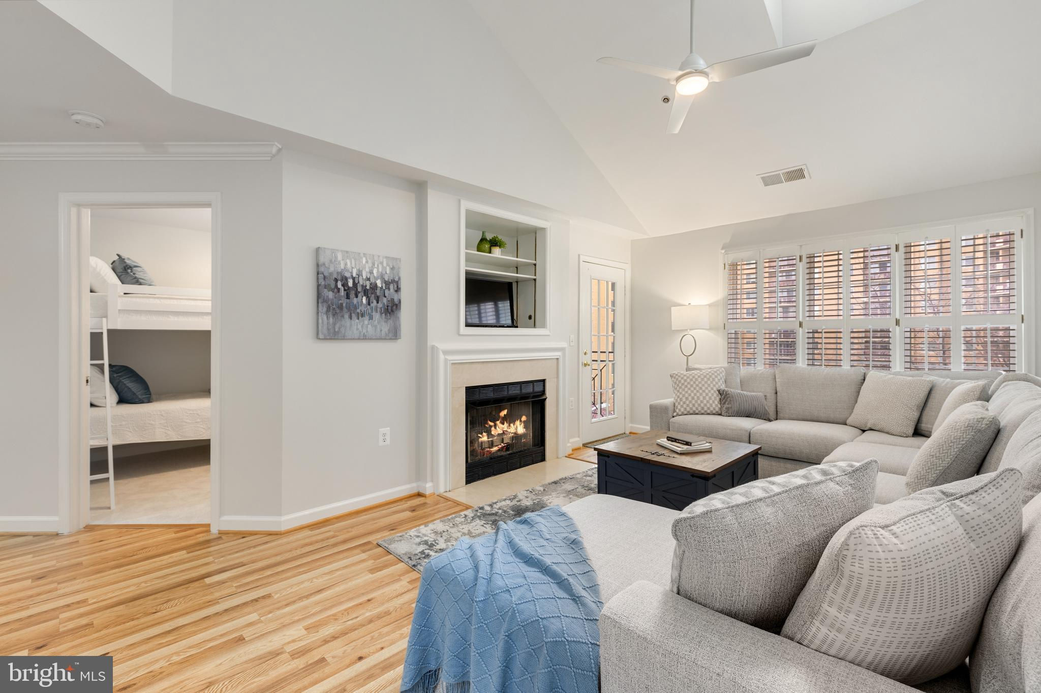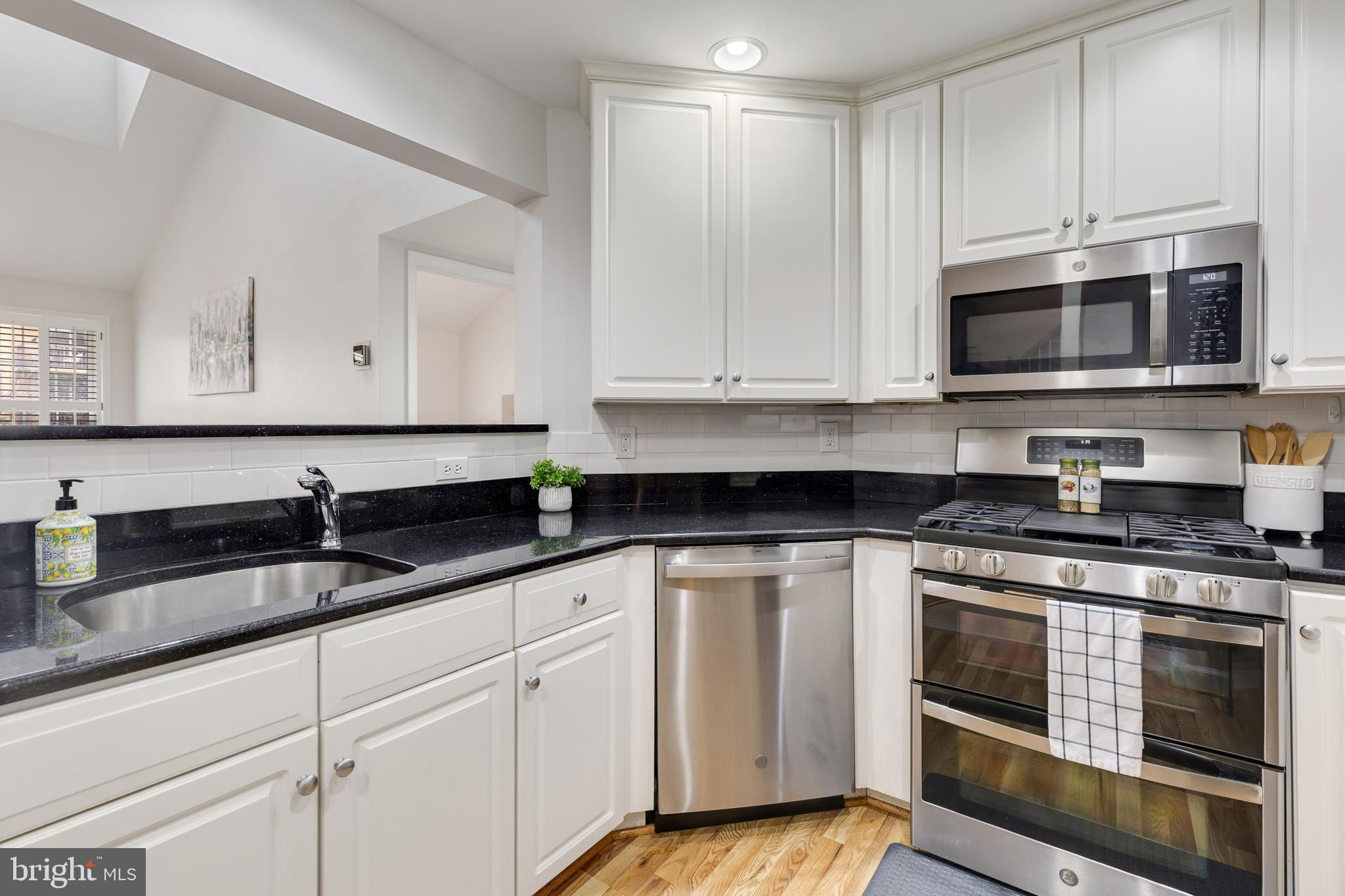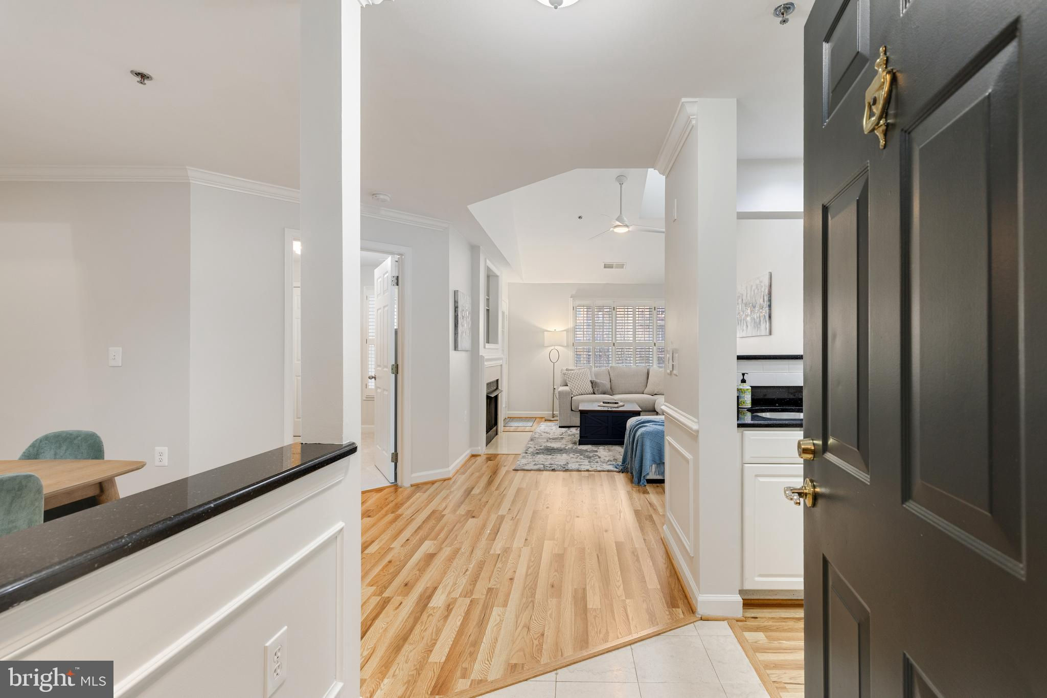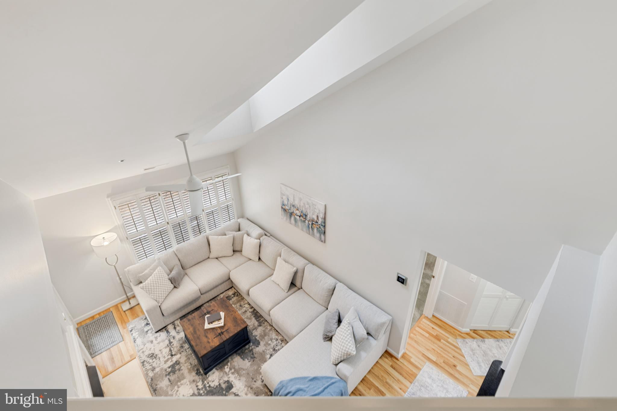 Gorgeous & RARE 3-bedroom, 2-bathroom 2-level condo located in the Courthouse Hill Condominium! This beautifully updated, freshly painted home welcomes you with a bright, open layout & wooden shutters throughout. Upon entry, the kitchen sits to your right, offering white cabinetry, stone countertops, a classic white subway tile backsplash, stainless steel appliances including a new dishwasher (2025), & hardwood flooring. To the left, the separate dining area provides plenty of room to entertain and includes convenient under-stair storage. A pantry closet in the back hallway adds even more functionality.The spacious living room features soaring vaulted ceilings with a skylight that flood the space with natural light, plus a ceiling fan, gas fireplace, & a built-in alcove perfect for your TV setup. Step out onto the private covered balcony - an ideal spot to enjoy morning coffee or unwind at the end of the day. The main level offers two carpeted bedrooms - one with soaring ceilings, a chandelier, & a walk-in closet, and the other featuring a charming light fixture & a serene view overlooking the balcony. The full bathroom on this level is accented with recessed lighting, a dual stone-topped vanity, tile flooring, & a sparkling white tiled shower with a sliding glass door & tub.Head upstairs to find plush carpeting throughout the upper level & a modern chandelier illuminating the stairway. A laundry closet with a stacked newer washer & dryer (2023) provides everyday convenience. The upper level is home to the HUGE primary bedroom suite, complete with overhead lighting, a massive walk-in closet, a sitting area with a ceiling fan with light, & a window that opens to overlook to the main level below. The en-suite bathroom includes oversized tile flooring, two separate stone-topped vanities, a white subway-tiled walk-in shower, & abundant built-in cabinetry for endless storage!Home includes 2 assigned garage parking spaces (#G2-48 & G2-49) that convey. Courthouse Hill offers fantastic amenities including a community pool, gym, party room, and bike storage. Just steps from Whole Foods, restaurants, shopping, the Metro, & MORE!