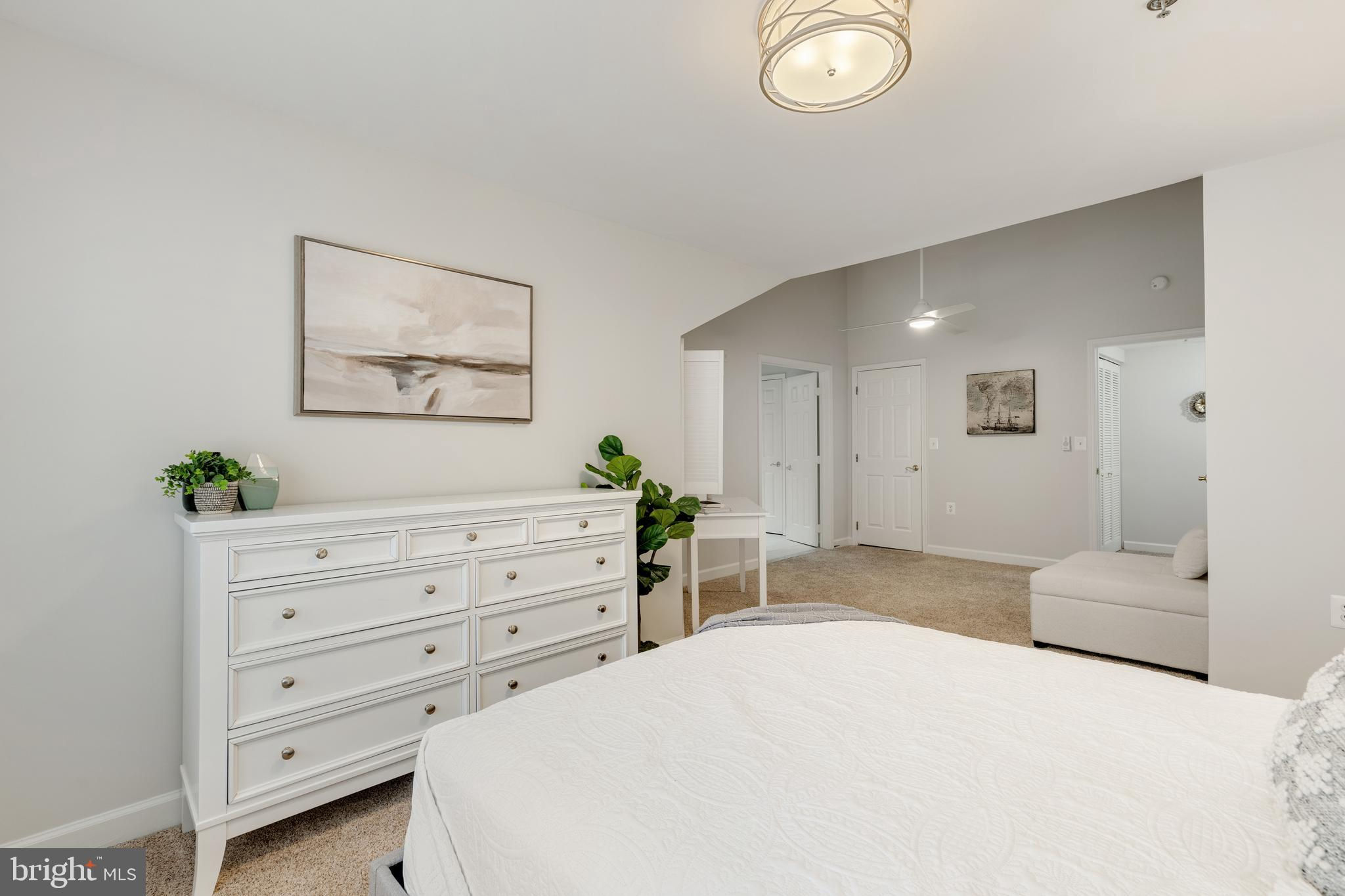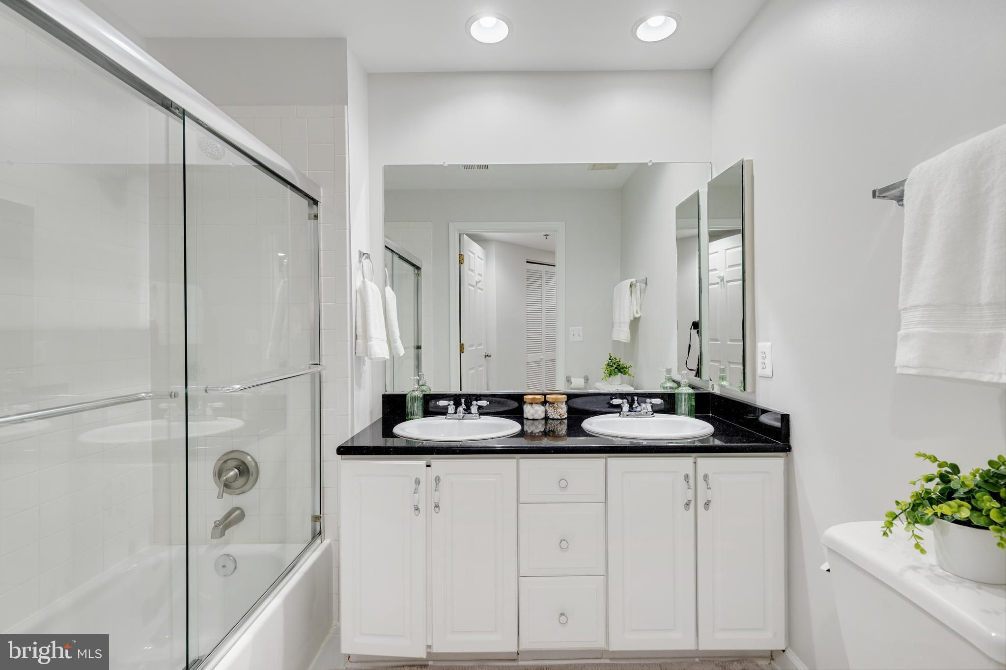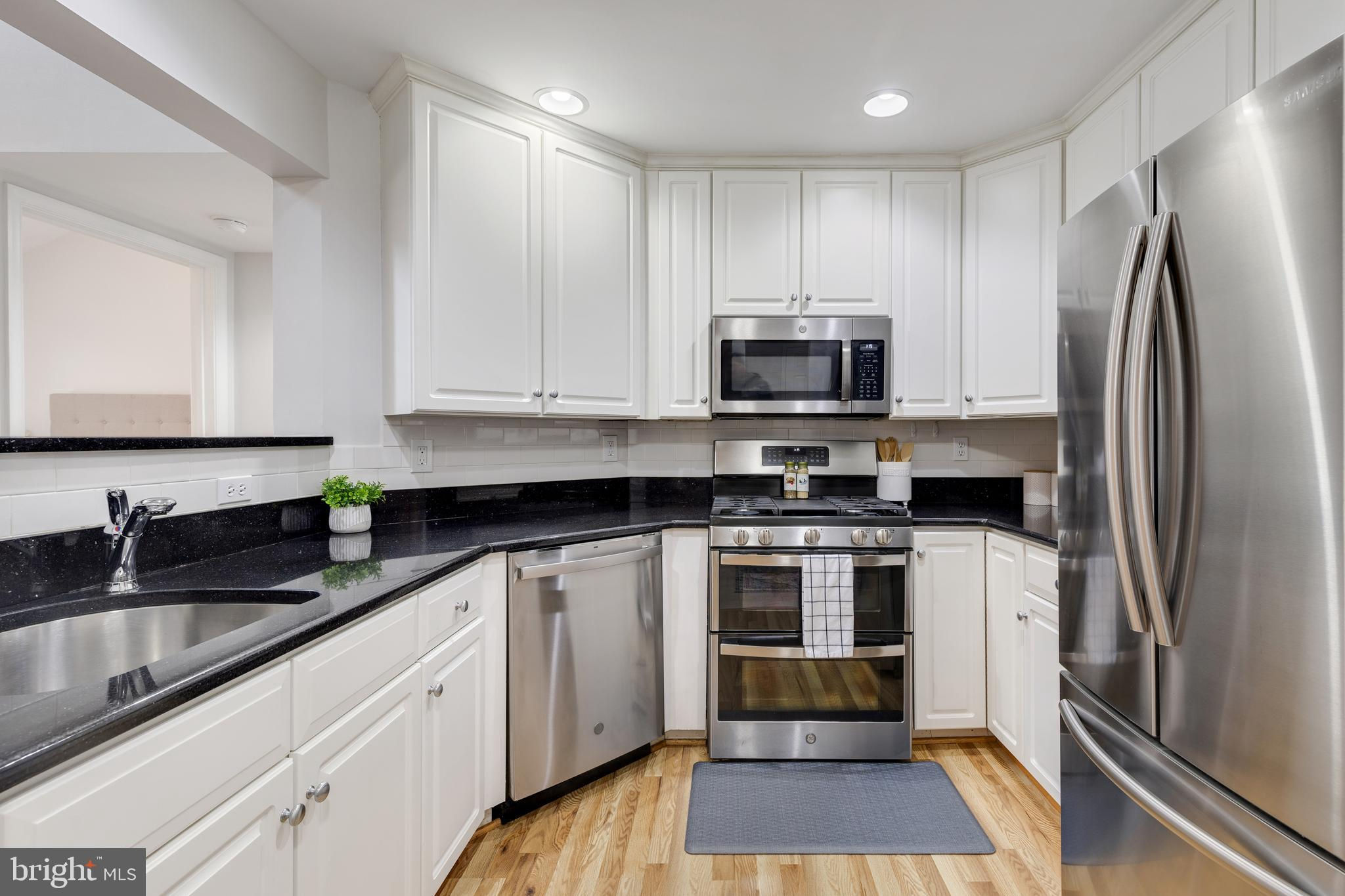Gorgeous & RARE 3-bedroom, 2-bathroom 2-level condo located in the Courthouse Hill Condominium! This beautifully updated, freshly painted home welcomes you with a bright, open layout & wooden shutters throughout. Upon entry, the kitchen sits to your right, offering white cabinetry, stone countertops, a classic white subway tile backsplash, stainless steel appliances including a new dishwasher (2025), & hardwood flooring. To the left, the separate dining area provides plenty of room to entertain and includes convenient under-stair storage. A pantry closet in the back hallway adds even more functionality.The spacious living room features soaring vaulted ceilings with a skylight that flood the space with natural light, plus a ceiling fan, gas fireplace, & a built-in alcove perfect for your TV setup. Step out onto the private covered balcony - an ideal spot to enjoy morning coffee or unwind at the end of the day. The main level offers two carpeted bedrooms - one with soaring ceilings, a chandelier, & a walk-in closet, and the other featuring a charming light fixture & a serene view overlooking the balcony. The full bathroom on this level is accented with recessed lighting, a dual stone-topped vanity, tile flooring, & a sparkling white tiled shower with a sliding glass door & tub.Head upstairs to find plush carpeting throughout the upper level & a modern chandelier illuminating the stairway. A laundry closet with a stacked newer washer & dryer (2023) provides everyday convenience. The upper level is home to the HUGE primary bedroom suite, complete with overhead lighting, a massive walk-in closet, a sitting area with a ceiling fan with light, & a window that opens to overlook to the main level below. The en-suite bathroom includes oversized tile flooring, two separate stone-topped vanities, a white subway-tiled walk-in shower, & abundant built-in cabinetry for endless storage!Home includes 2 assigned garage parking spaces (#G2-48 & G2-49) that convey. Courthouse Hill offers fantastic amenities including a community pool, gym, party room, and bike storage. Just steps from Whole Foods, restaurants, shopping, the Metro, & MORE!