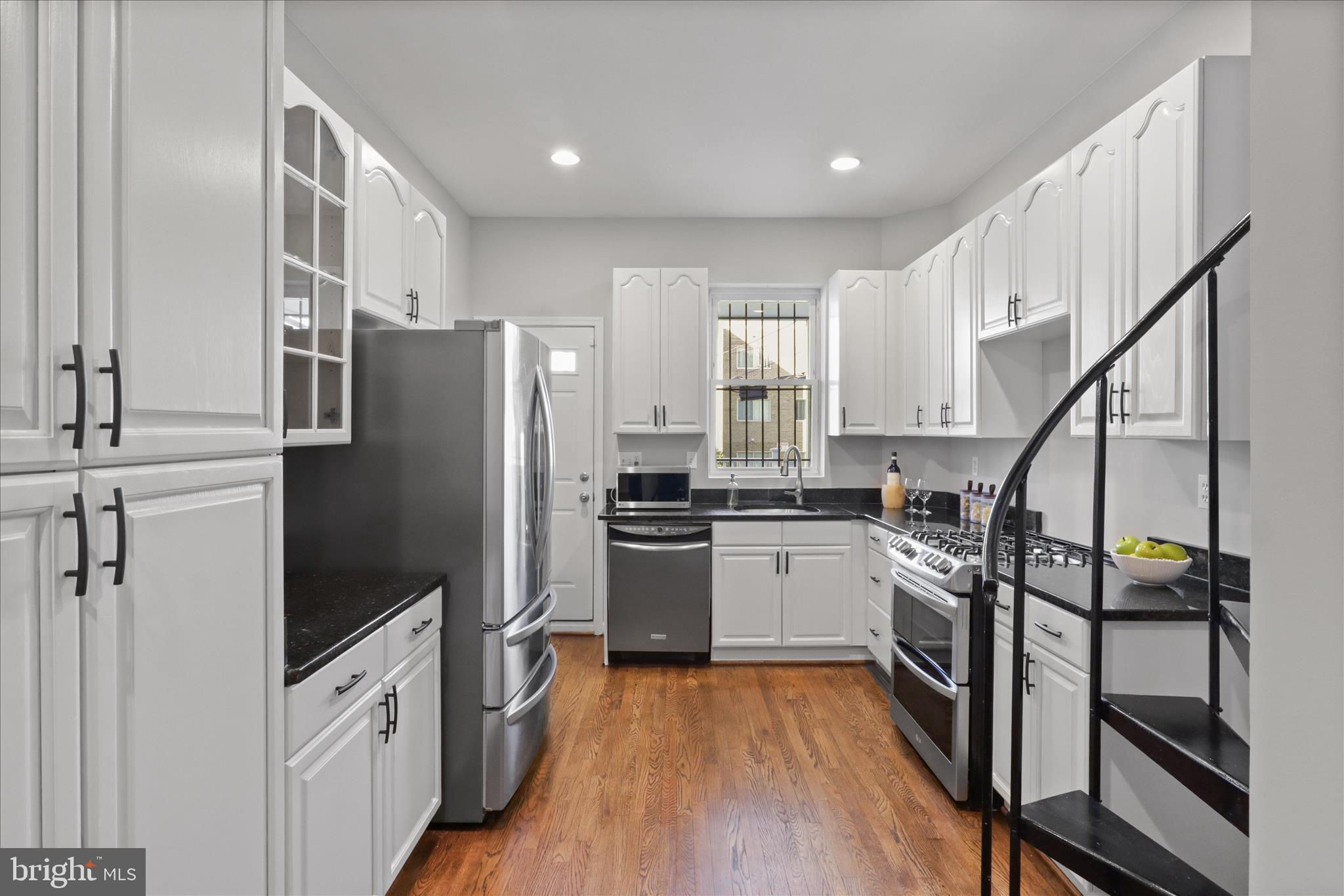 Welcome to this expansive four-level Art-Deco Victorian in the heart of Columbia Heights, offering over 4,200 square feet of living space where historic charm meets modern sophistication. The entire home has been freshly painted, featuring new carpet on the lower level, newly stained hardwood floors on the main and third levels, and brand-new LVP flooring on level two. The main level showcases spacious living and dining areas and a beautifully updated kitchen with stainless steel appliances, granite countertops, and a distinctive spiral staircase. Step out from the kitchen to a large rear terrace—perfect for morning coffee, entertaining, or dining al fresco. An attached one-car garage offers rare convenience in this sought-after neighborhood. The second level features a generous family room with exposed brick accents, a third bedroom with a private rear sunroom, a flexible bonus area, and a full bath—ideal for relaxing, working from home, or hosting guests. Upstairs, the top floor boasts a light-filled primary bedroom and a spacious secondary bedroom connected by a stylish Jack and Jill bath, highlighted by skylights and exposed brick detail. The finished lower level expands the living space with a Bonus room, full bath, and ample storage—perfect for guests, an au pair, or an in-law suite. Dual-zone HVAC (one gas, one electric) ensures comfort year-round. Recent Updates: • Heat Pump (2019) • Refrigerator, Stove & Oven (2020) • Primary Bath Remodel (2021) • HVAC & Hot Water Heater (2021) • Roofing & Attic Insulation (2021) • Railings & Banisters, Interior painting throughout, new carpet in lower level, hardwood floors sanded and stained on main & upper level 2, new LVP on upper level 1, freshly painted kitchen cabinets with new hardware (2025) Blending distinctive architectural details with thoughtful updates and over 4,200 sq ft of beautifully finished space, this home offers the perfect balance of character, comfort, and convenience—just steps to Metro, Meridian Park, shopping, dining, and all that vibrant Columbia Heights has to offer.