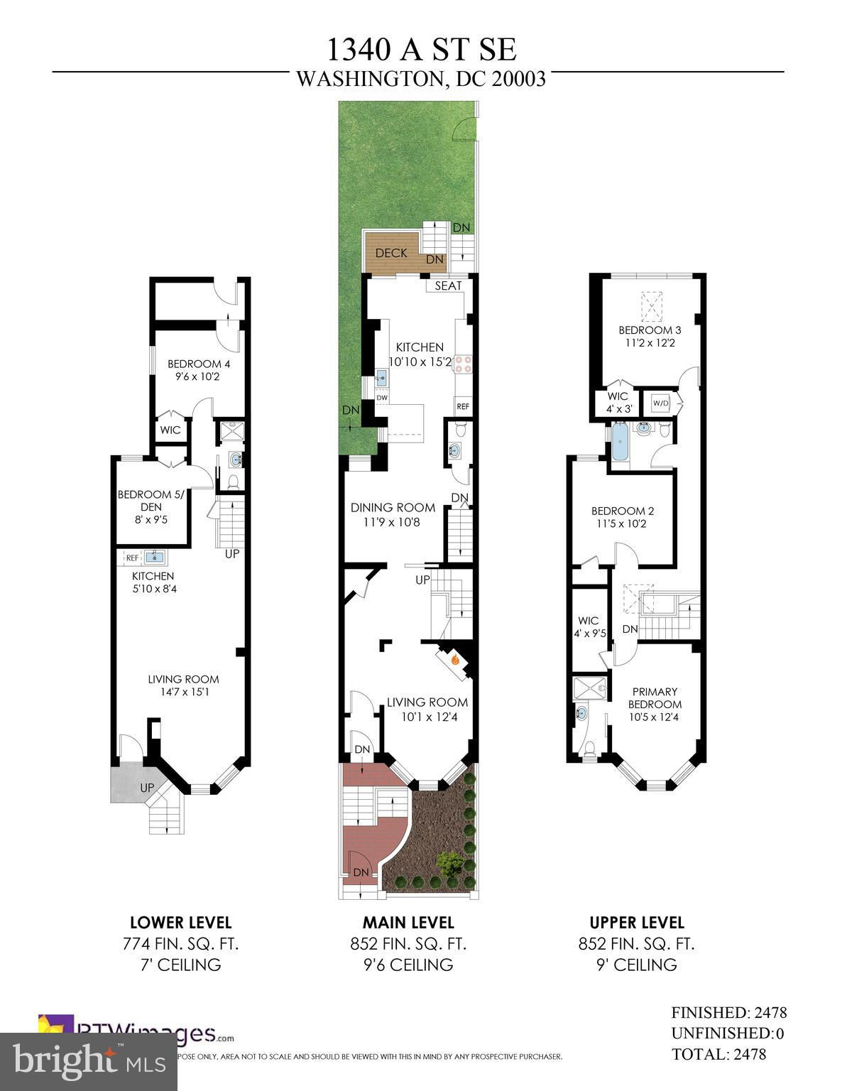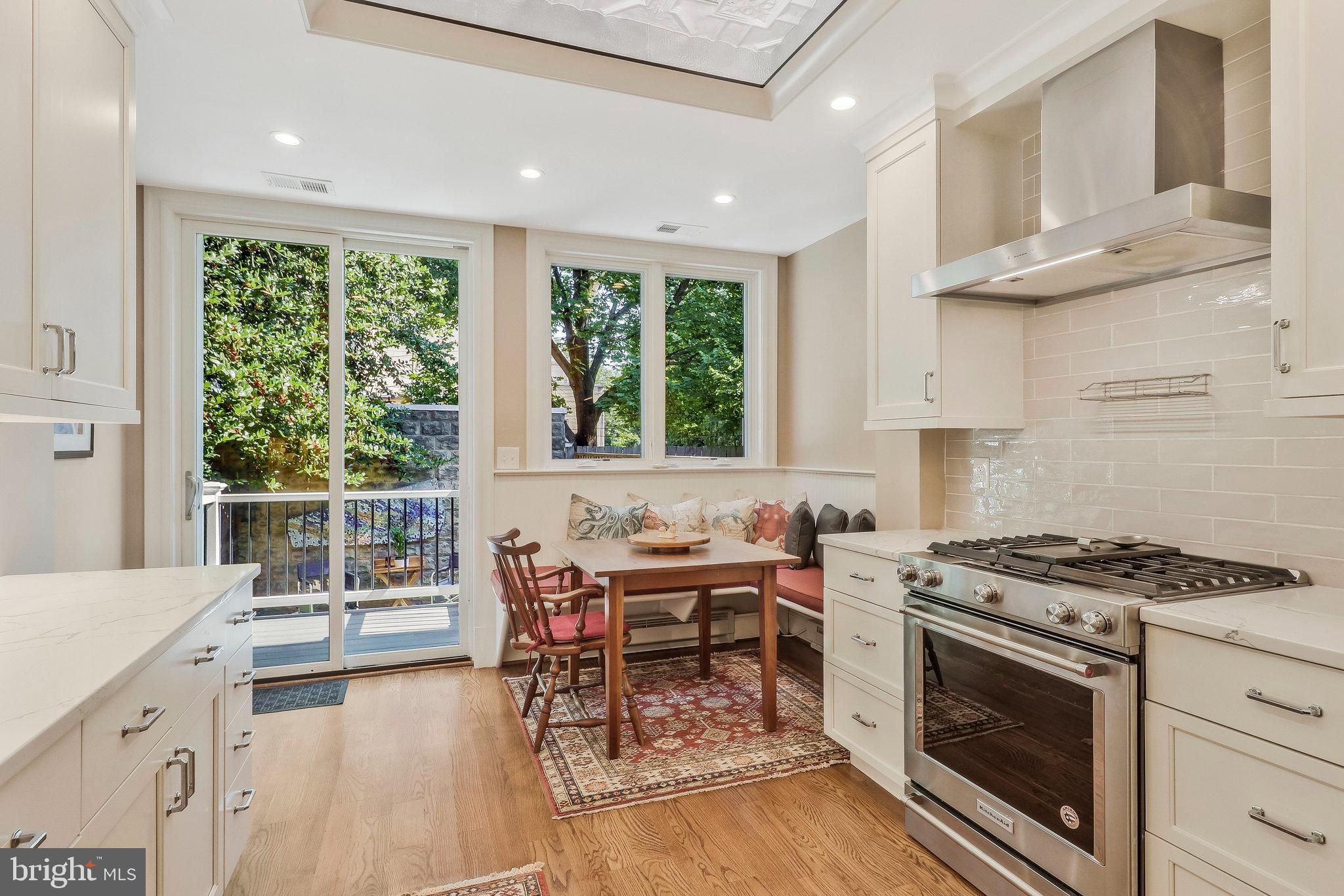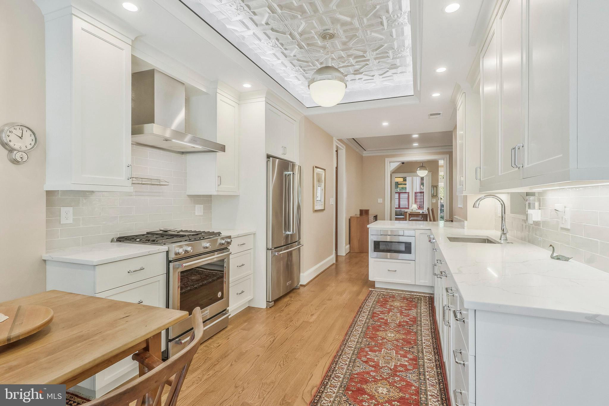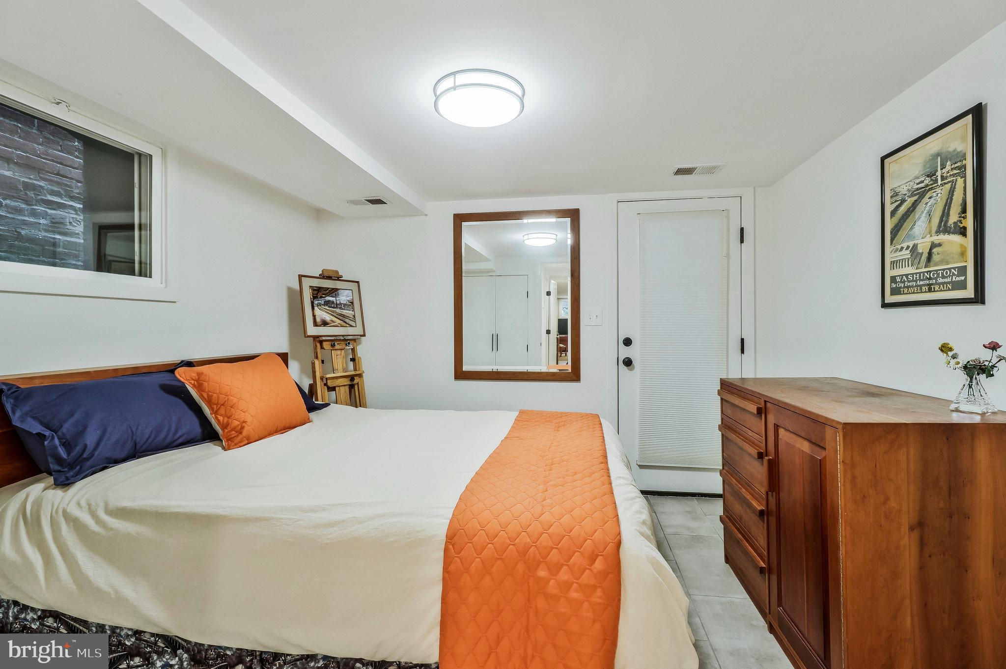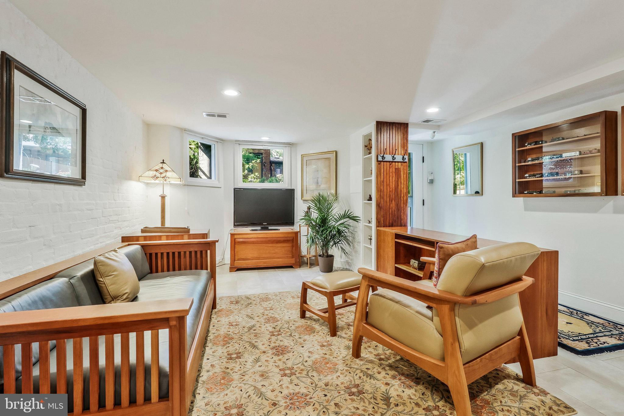 Just off of Lincoln Park on a quiet side street sits this historically updated perfect 5 bedroom, 3.5 bath, 3 level, 2478 SF (per floorplan) townhome. Thoughtfully renovated in 2018 and meticulously maintained since, the home exudes the perfect balance of old-world charm meets modern convenience. Features include: gleaming oak hardwood floors, 5 panel doors, unique black and white crown molding, classic stairway newel posts and balusters, exposed brick, and timeless lighting fixtures. The quintessential Capitol Hill metal steps and tiled vestibule entry are a nod to bygone eras. The Living Room features a bright bay with custom shutters, a pendant drum light with ceiling medallion, and a cozy gas fireplace with historic mantle. The landing to the winding staircase houses a tidy, utilitarian coat closet. An intact pocket door separates the landing from the Dining Room with vaulted ceiling, which opens to a wide, perfectly arranged chef’s Kitchen with: breakfast bar, playful silver tin recessed ceiling, corner built-in booth seating with table, white silestone counters with classic grey vein, copious cabinets and drawers, sink with window above, Kitchenaid appliances, and a bright window and sliding glass door leading to the rear yard. The recently built back deck is perched above a shaded private brick patio (currently covered with artificial grass - could easily be returned to brick.) Conveniently tucked off the Kitchen lies a Half Bathroom across from the door to the lower level interior stairs. Upstairs, light from a large skylight over the stairway landing dances in a wall mirror, brightening the hallway to the 3 bedrooms. The en-suite Primary BR features a bright bay window reading nook; a sliding door to the primary black and white marble Bathroom with a bright window and a glass-door shower; and a gigantic closet outfitted with a custom drawer and storage system. The 2nd/Center Bedroom has a window and sizable closet, and comfortably fits a queen bed. Down the hall, the Bathroom has a full shower/tub with a large marble ledge, oversized horizontal subway tile, and a playful Moroccan mosaic floor tile pattern. The new large stacked W/D is conveniently tucked into a closet between the hall bath and the 3rd Bedroom, which has a skylight and a wall of 3 windows overlooking the rear deck/yard, as well as a large closet. The fully finished, connected Lower Level In-Law Suite offers front and rear egress, 2 BRs (or 1 BR plus den, office, or workout space), a full bathroom with shower, a flexible great room, and a kitchenette with sink, drink fridge, and a 2nd small fridge (behind which a 2nd W/D hookup exists.) There is also a storage closet tucked beneath the stairs. An under-deck utility/storage area is at the back of the house beyond the rear BR. PRIMO location: easy access to 395 and 295, close to the Capitol, 3 metro stops, Eastern Market, The Roost, Barracks Row, H Street, Union Market, Safeway, Capital Bikeshares, Lincoln Park. Come see it for yourself! (Note that SF figures shown are not to be used for valuations.)
