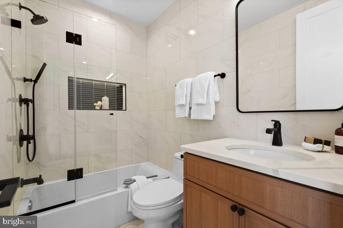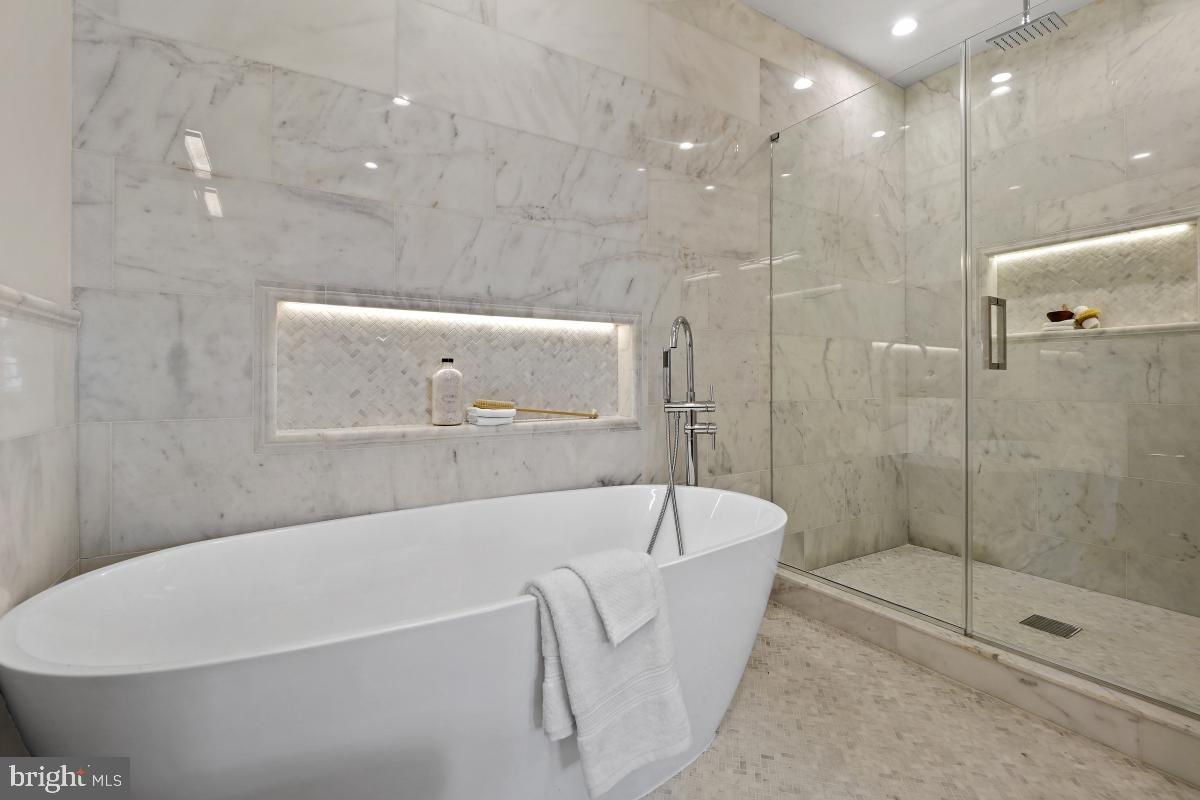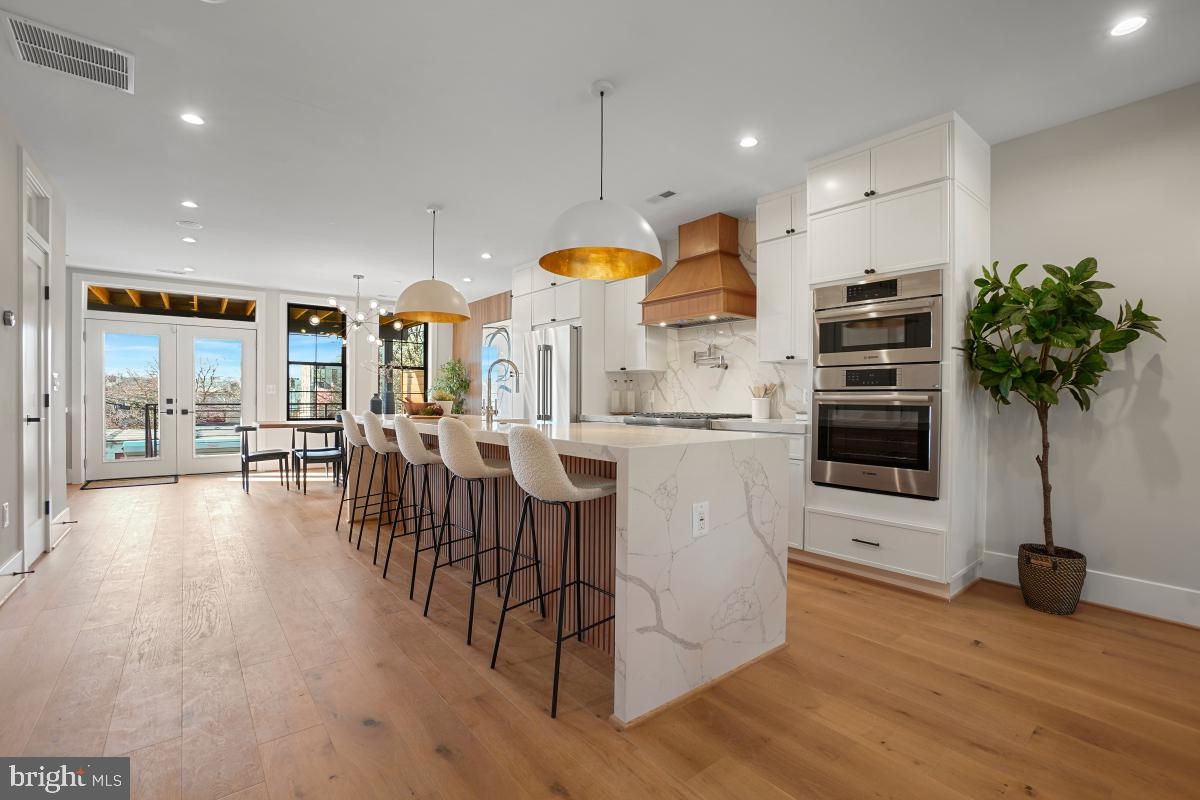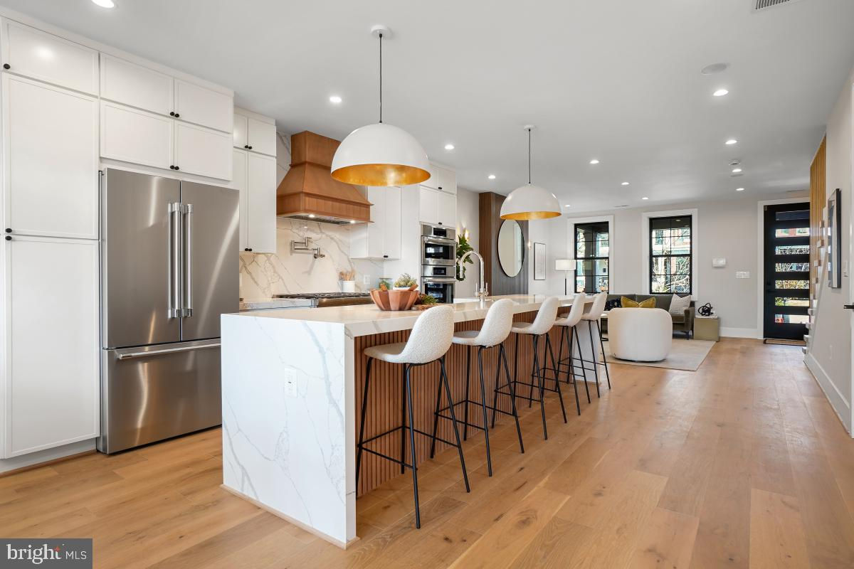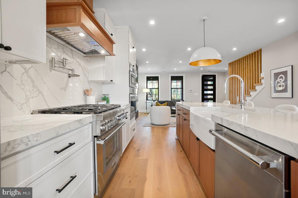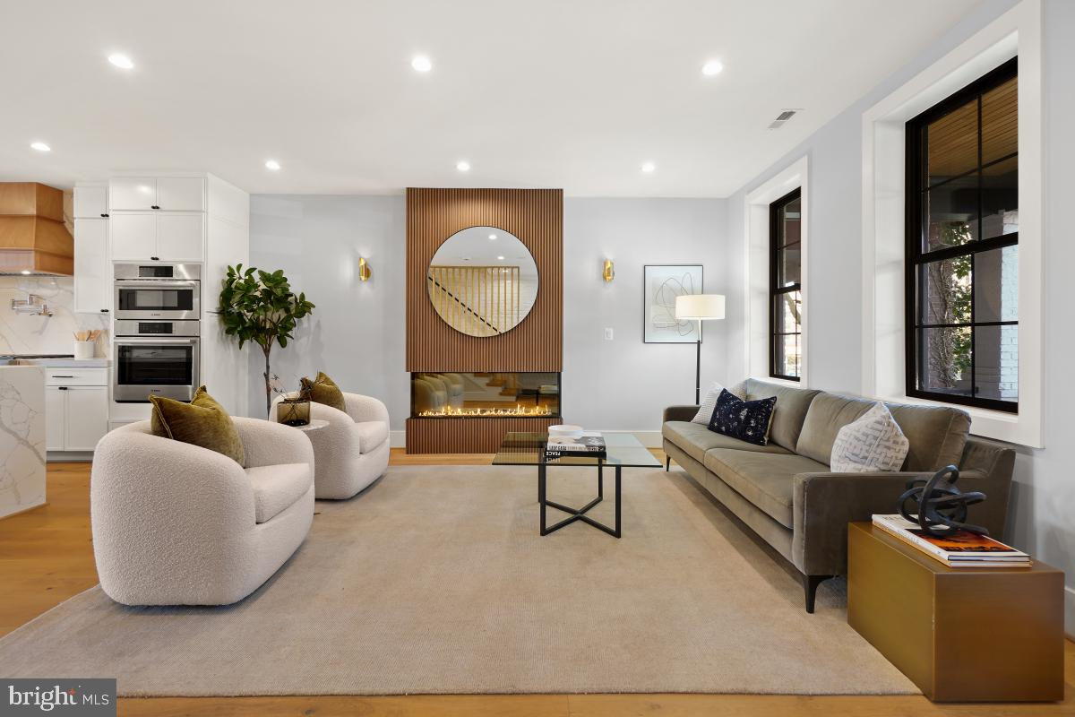 Welcome to your dream home. This stunning completely renovated 5-bed, 3.5-bath home is flooded with natural light and boasting an inviting open floor plan. Ideal for entertaining, this gem features wide oak wood floors, a built-in Bluetooth audio system, and recessed lighting throughout. The kitchen is a chef's delight with premium quartz stone countertops, enhanced double floor to ceiling cabinets, upgraded stainless steel appliances including 36” six burner gas stove, chimney hood, pot filler, double oven with convection microwave, and a spacious island with a waterfall edge. Luxurious marble baths with designer finishes. The primary bedroom is a retreat with walk-in closets and a custom-built spiral staircase leading to a light-filled office space. The primary bath is a spa-like oasis with a standalone designer tub, dual sink vanity, and a walk-in shower. The lower level offers family room for entertaining with 2 bedrooms,1 bath, wet bar, built-in microwave, wine-fridge, rear entrance, and patio. This home has laundry on upper and lower levels. All systems in this home are new: plumbing, electrical, dual zoned Carrier HVAC systems, and upgraded tankless water heater. The temperature is zoned and controlled by NEST thermostat on all levels. Enjoy a private landscaped yard with dual large decks and 2-car secured parking with a roll-up garage door. Conveniently situated in close proximity to Rock Creek Park, public transportation with easy access to the amenities of Columbia Heights, Petworth, and 16th Street Heights and Mount Pleasant.