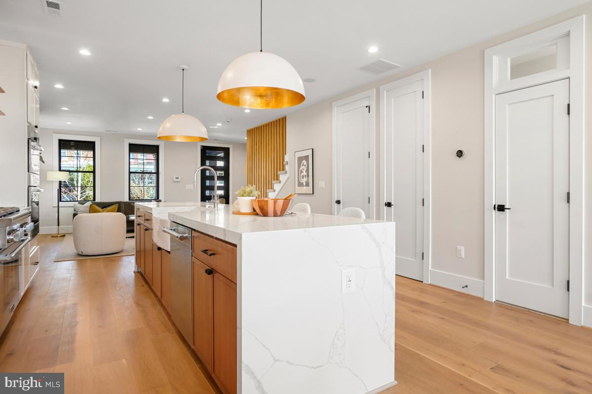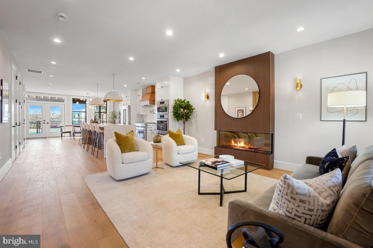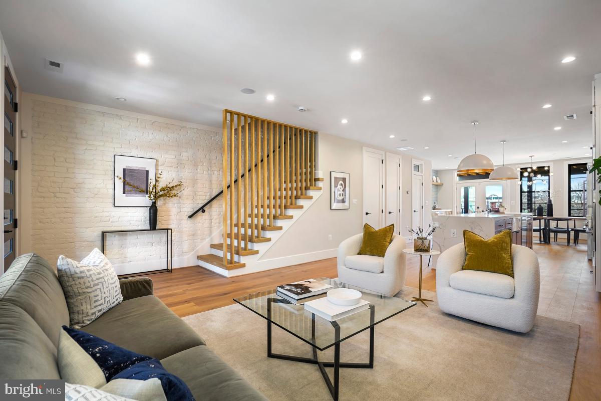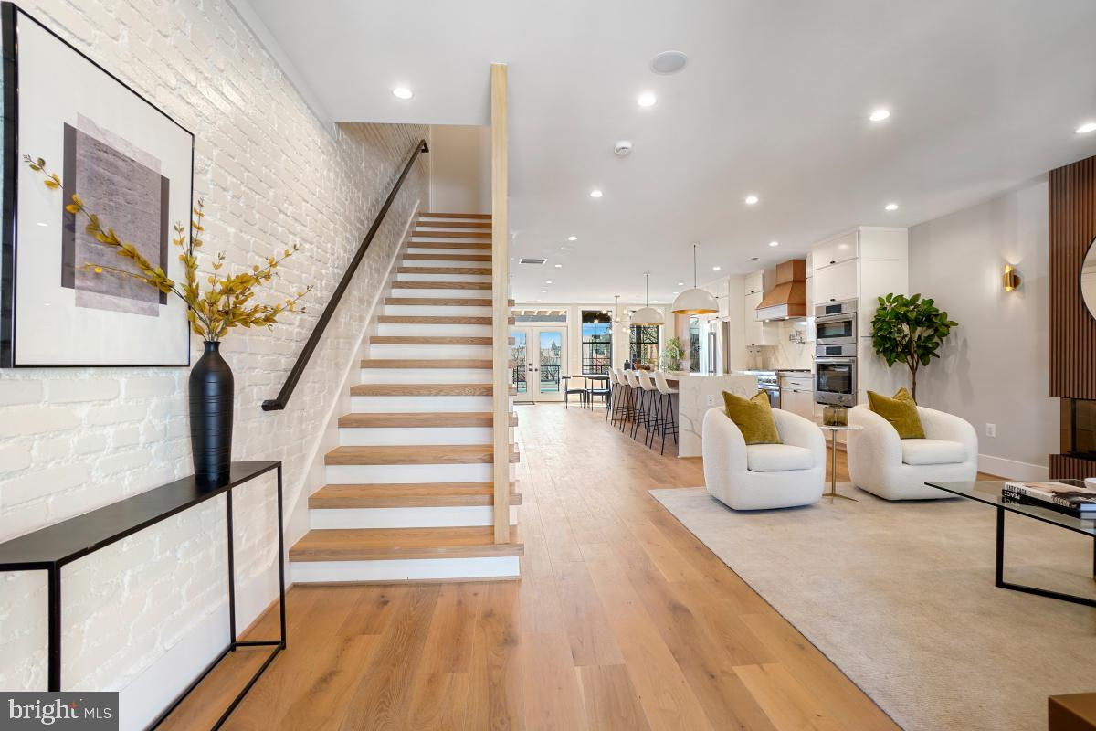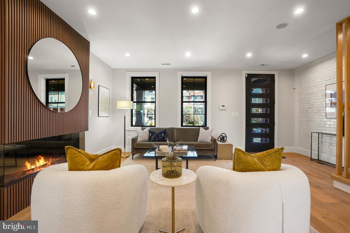 MAZING VALUE! Welcome to your dream home. This stunning completely renovated 5-bed, 3.5-bath home is flooded with natural light and boasting an inviting open floor plan. Ideal for entertaining, this gem features wide oak wood floors, a built-in Bluetooth audio system, and recessed lighting throughout. The kitchen is a chef's delight with premium quartz stone countertops, enhanced double floor to ceiling cabinets, upgraded stainless steel appliances including 36” six burner gas stove, chimney hood, pot filler, double oven with convection microwave, and a spacious island with a waterfall edge. Luxurious marble baths with designer finishes. The primary bedroom is a retreat with walk-in closets and a custom-built spiral staircase leading to a light-filled office space. The primary bath is a spa-like oasis with a standalone designer tub, dual sink vanity, and a walk-in shower. The lower level offers family room for entertaining with 2 bedrooms,1 bath, wet bar, built-in microwave, wine-fridge, rear entrance, and patio. This home has laundry on upper and lower levels. All systems in this home are new: plumbing, electrical, dual zoned Carrier HVAC systems, and upgraded tankless water heater. Enjoy a private landscaped yard with dual large decks and 2-car secured parking with a roll-up garage door. Conveniently situated in close proximity to Rock Creek Park, public transportation with easy access to the amenities of Columbia Heights, Petworth, and 16th Street Heights and Mount Pleasant.
