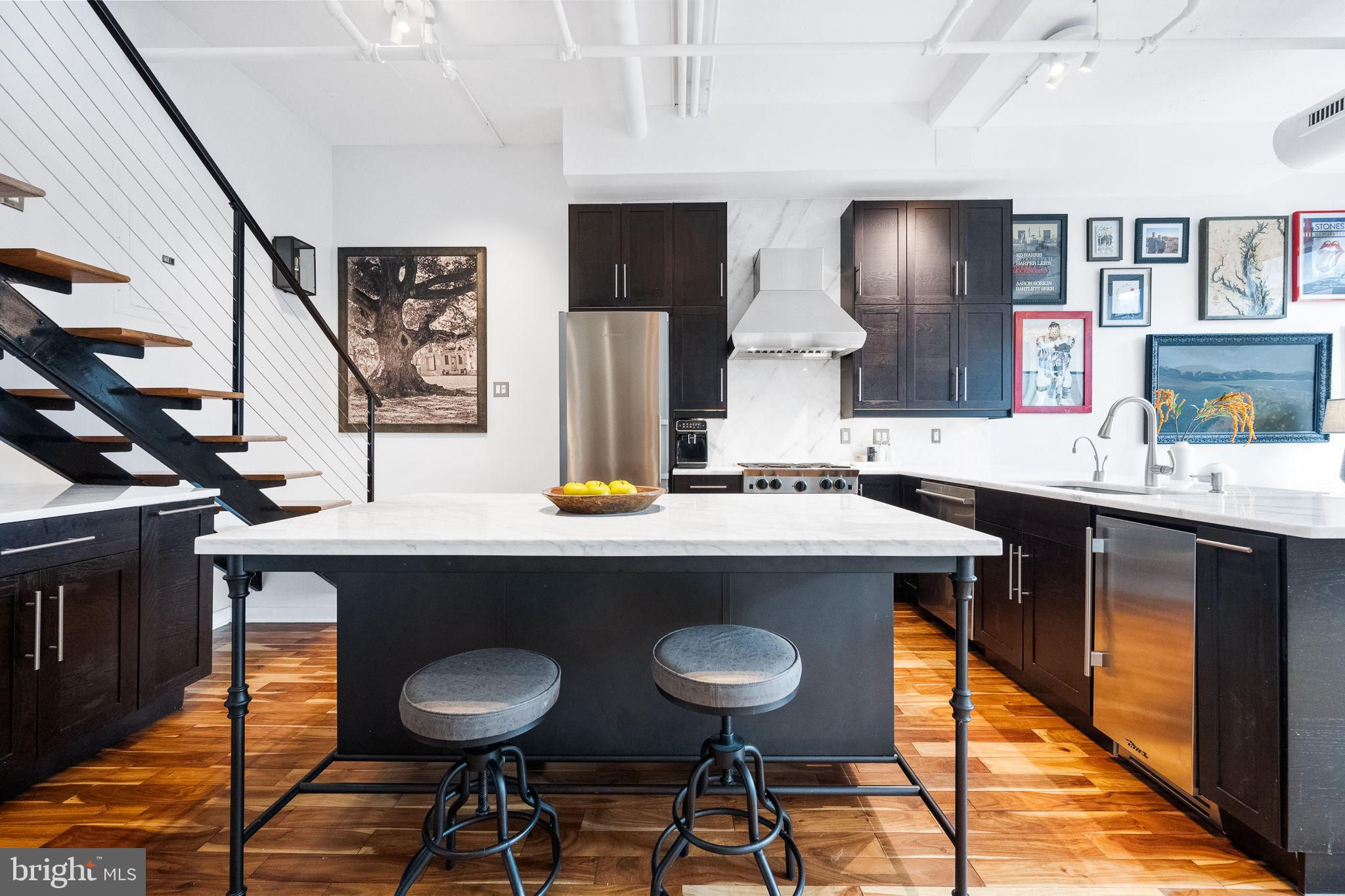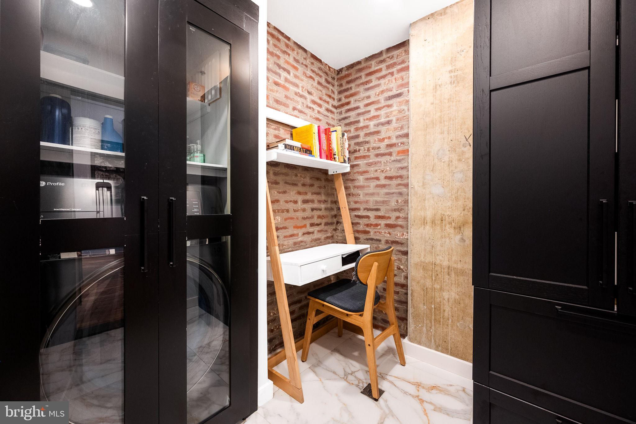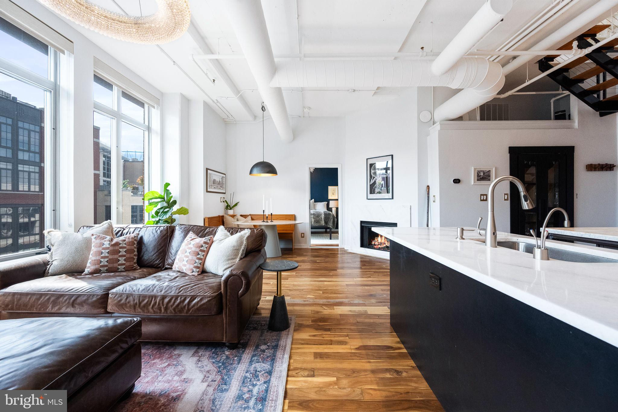 This highly sought after penthouse condo on one of DC's most coveted blocks offers 2 bedrooms + den, 2.5 baths, and a private rooftop terrace graciously laid out over 2 levels. This unit will immediately delight you upon entry - an expanse of southern facing oversized windows, 10+ foot ceilings, hardwood floors, and gas fireplace. Turn to your right and press the button to a secret room, revealing the half bath, laundry, and flex space that can be used as an office, wine storage, pantry, and more. Updated kitchen with stainless steel appliances, gas range, additional separate ice maker, new counter tops, and two moveable islands for additional storage. All bathrooms are fully renovated and thoughtfully carry the design throughout the unit. The primary bedroom includes an en suite full bath with double vanity, plus walk-in closet. Upstairs you'll find the second bedroom, den, a full bathroom, and the stunning rooftop terrace where you can enjoy both sunrise and sunset across the DC skyline. Additional thoughtful upgrades include smart switches throughout the unit and relocating the primary bedroom entrance to create a dedicated dining room space. This offering includes one assigned parking garage space and one assigned storage unit. Logan Circle's Lofts14 offers amenities including: front desk concierge, rooftop deck with lounge, separate package room, and 2 elevators.