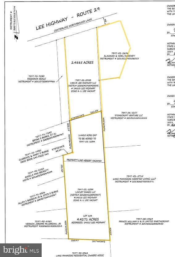 8 Acres of land for sale in Gainesville on US-29 next to Lake Manassas and VDOT. Three lots zoned B-1 and A-1 in Prince William County. Approx. 340 ft of frontage on US-29 with over 50,000 cars driving by daily. Adjoins Robert Trent Jones Golf Course, a private golf club located on Lake Manassas. Cell Tower lease not included in sale. Agent Related to Owner. Owner/Agent. AS-IS. Zoning: 14809 Lee Hwy and 14813 Lee Hwy have been recently rezoned to B-1, Commercial. Site Plan: Site Plan created for Starbucks with Drive Through, Auto Zone, and retail strip center. Comp Plan: Comp Plan is RN2, Residential Neighborhood, which would allow for rezoning to quarter acre residential lots.