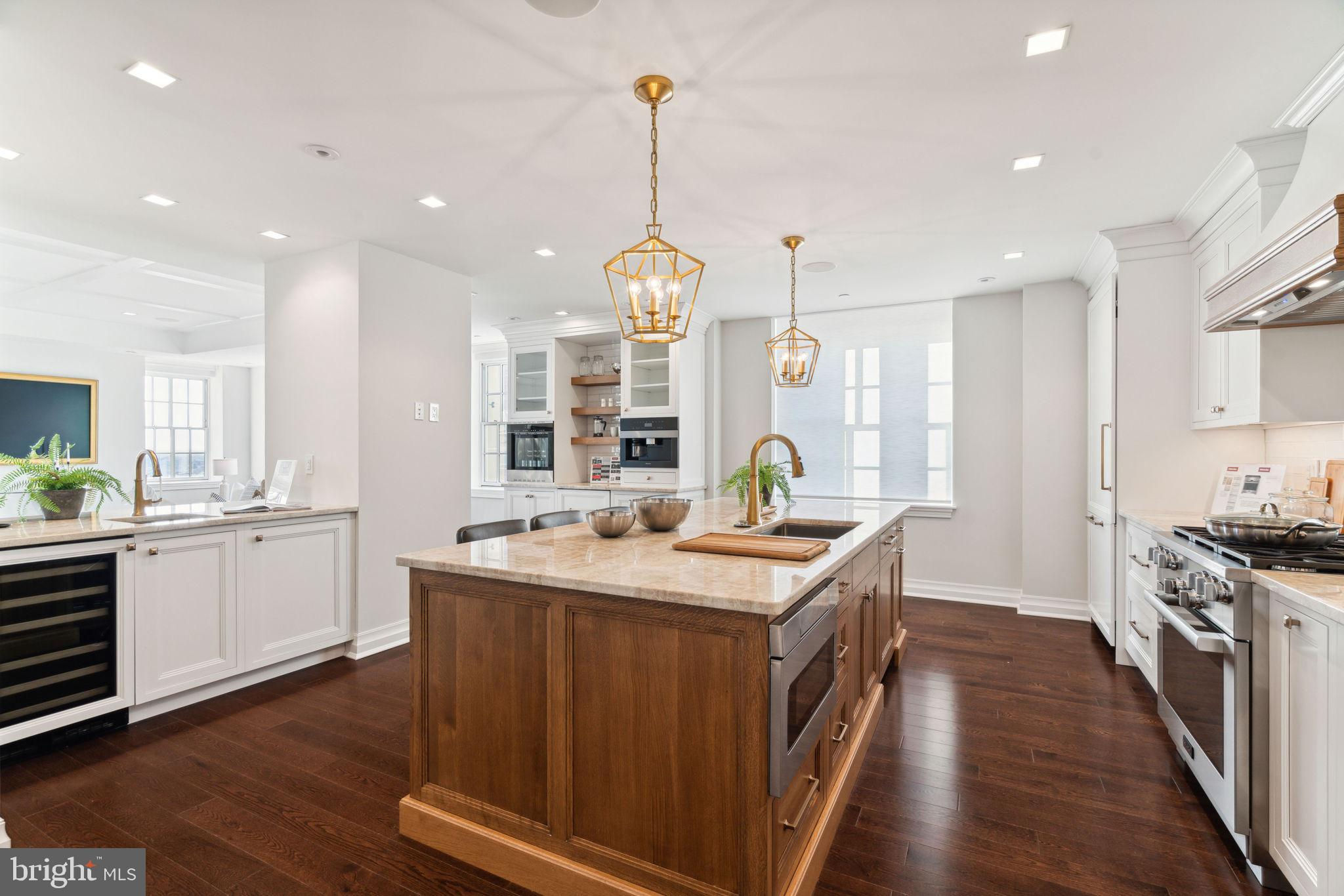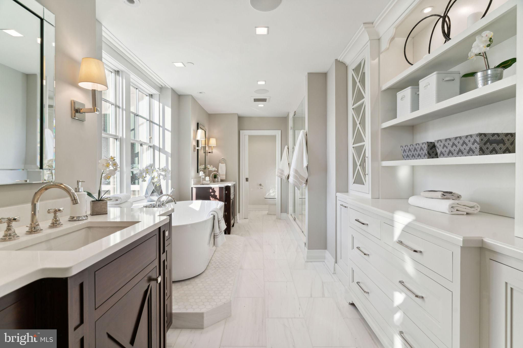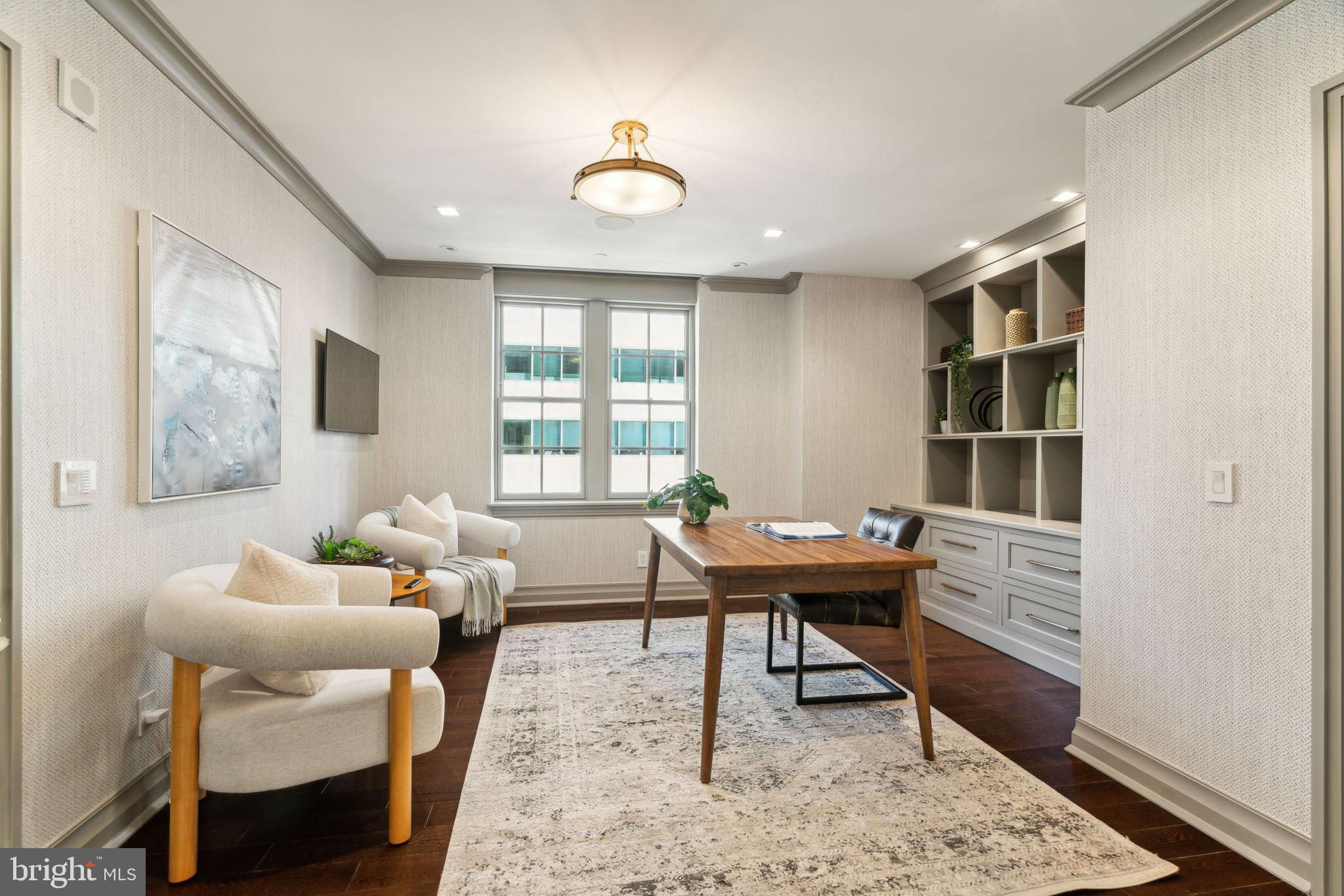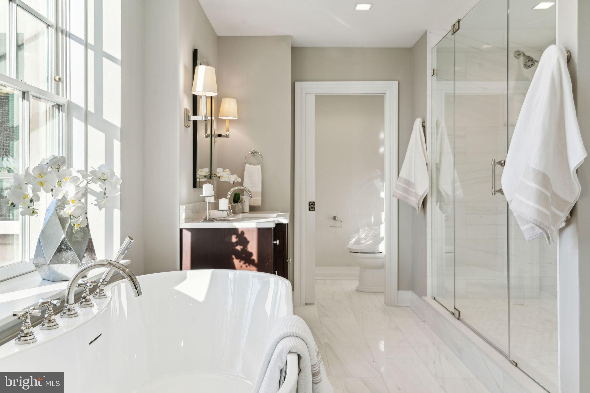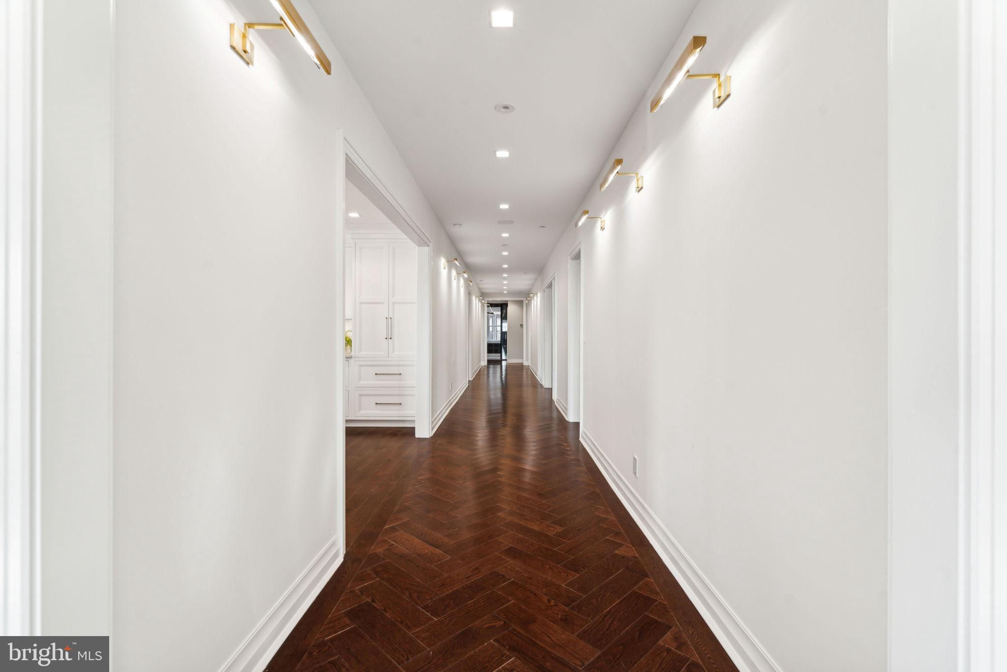 Stunning custom-built full floor residence with luxurious finishes, panoramic city views, and a balcony at The Lanesborough in Center City. This contemporary home includes 4 bedrooms (or 3 plus a private home office), 3.5 bathrooms, Mercier hardwood floors with herringbone inlay, and a plethora of custom appointments and high-end systems. Enter off of the building's secure, fobbed elevator into the custom vestibule with dramatic French doors. Past the entry is the grand center gallery which runs the length of the home. There is a powder room on one side of the hall and laundry closet with LG front load washer and dryer on the other. The private balcony showcasing spectacular city views is also located here. At the end of the center gallery past the bedrooms and office is the open great room with living/dining area and kitchen. An ideal space for both living and entertaining! The expansive living/dining room features 8 windows for ample natural light, a decorative reflective ceiling, and a surround sound entertainment system. The open chef’s kitchen features custom Honeybrook cabinetry, Taj Mahal quartzite kitchen counters, and a state of the industry appliance package which includes Miele built-in refrigerator/freezer, Miele professional gas range, Bosch fully integrated dishwasher, Marvel wine & beverage center, Dacor fully integrated wine dispenser & preservation system, Miele built-in coffee center, and Marvel integrated refrigerator drawers. All of the bedrooms feature walk-in designer inspired closets and full ensuite bathrooms. The spacious primary suite boasts large windows, a wood paneled wall feature, and a large, built-out walk-in closet with shelving and drawers. The gorgeous primary bathroom includes two separate vanities, built-in linen storage, large soaking tub, and an Italian marble oversized walk-in shower with frameless glass entry and accent lighting. Across from the primary bedroom is the home office with French doors and built-ins that can be used as a fourth bedroom. Additional home details include an automated window shade system, an automated lighting system, an “ahead of the curve” computer network, and a music system that includes architectural speakers installed throughout the home that are easily controlled via smart device app. The Lanesborough offers residents the highest level of finish in each space. This elegant boutique building is one of a kind and is sure to please the most discerning purchaser of a Center City high-rise home. Residents enjoy a twenty-four hour doorman and concierge and state-of-the-art fitness center. One 10' x 12' storage unit located in the basement of the building is included.