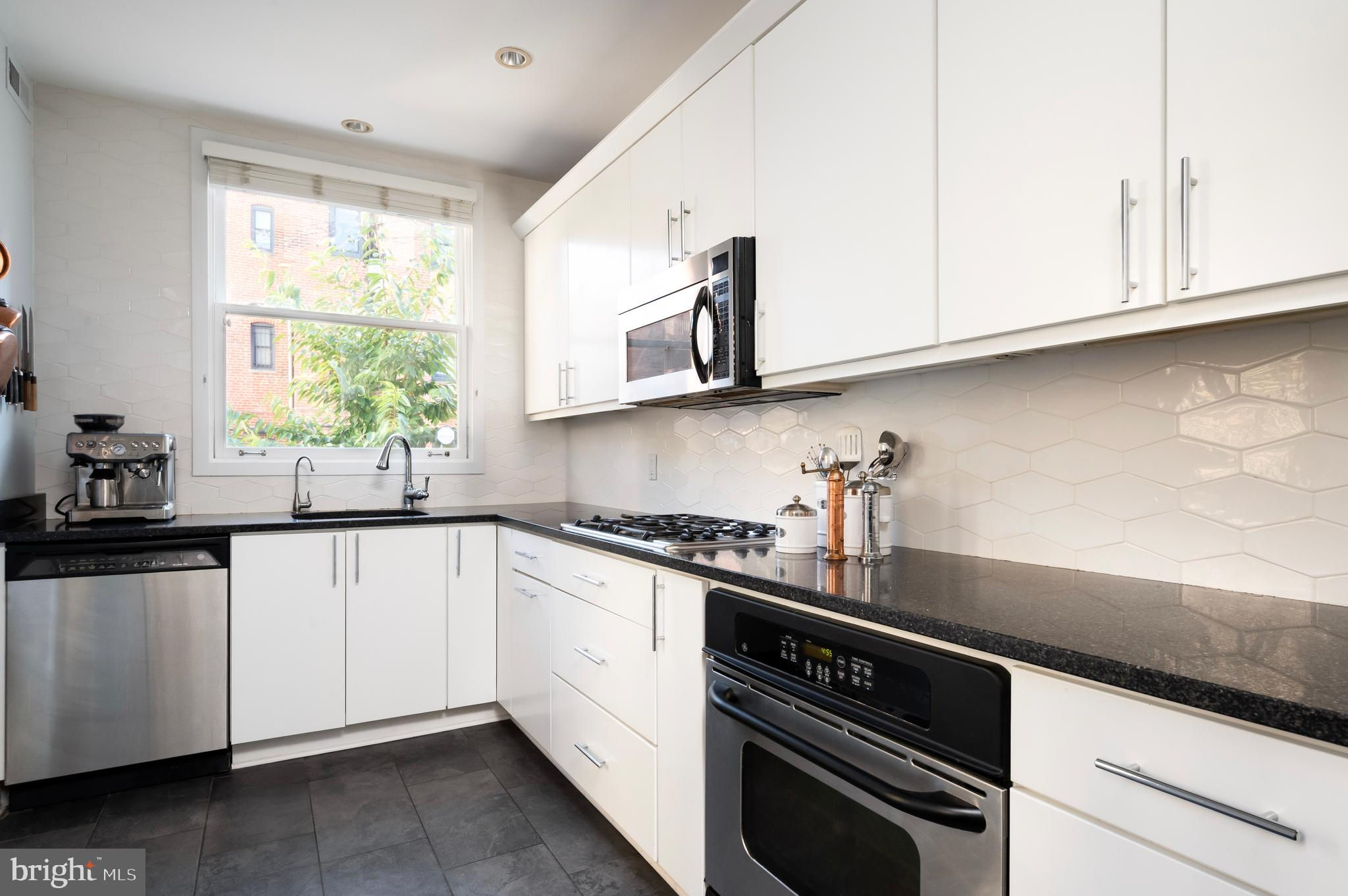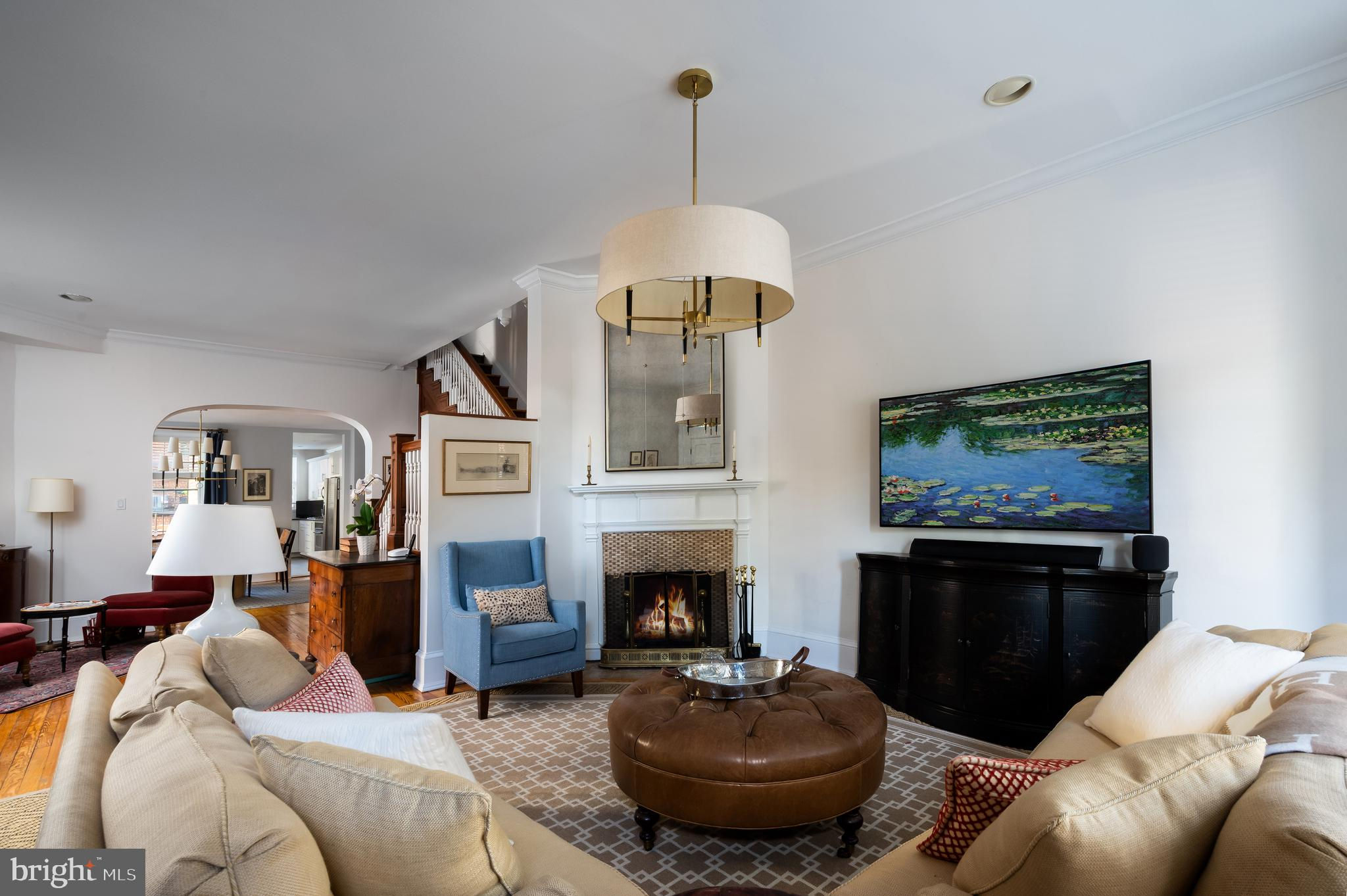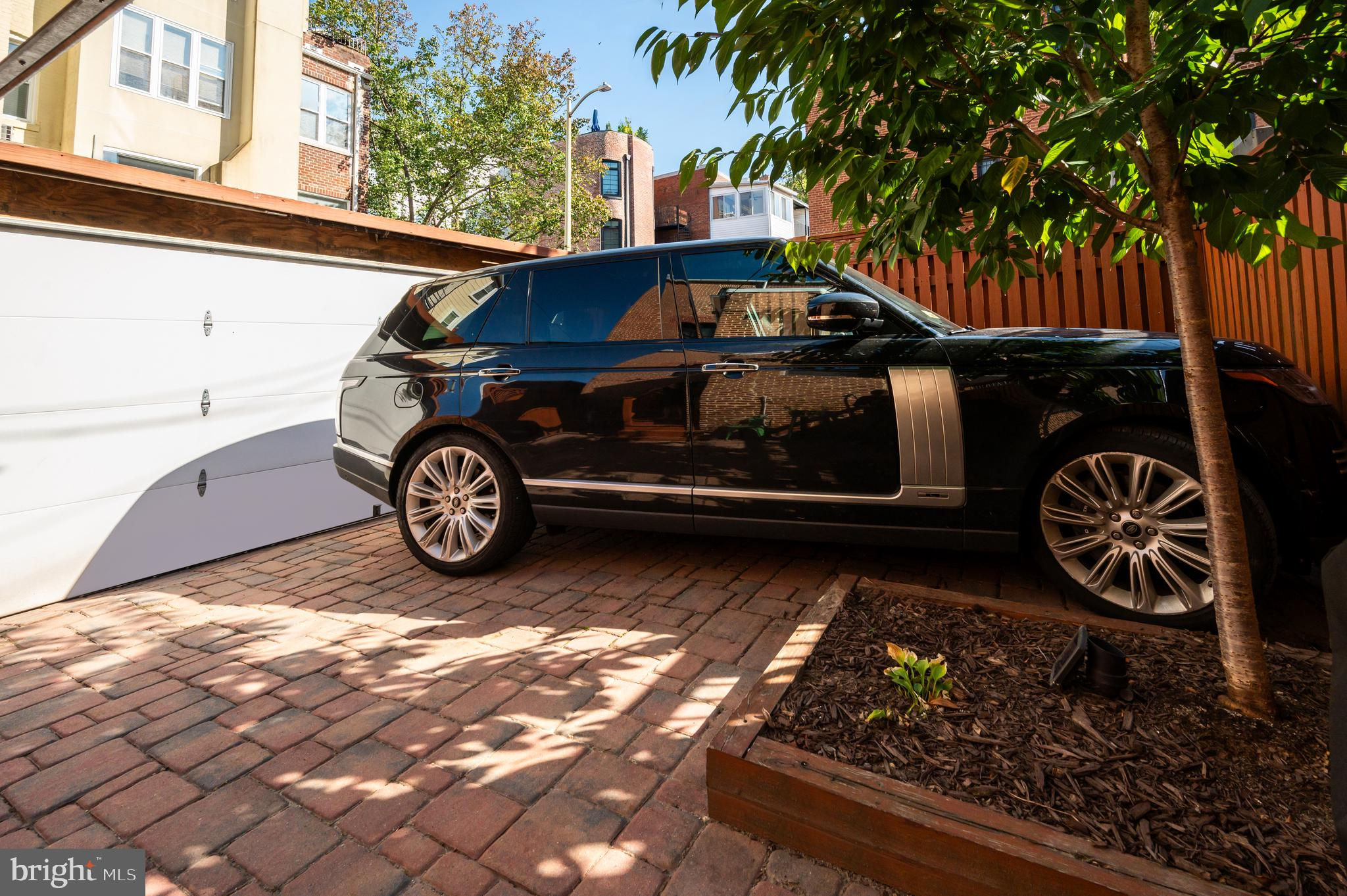 This home features a newly renovated lower level apartment with Certificate of Occupancy | Prominently situated amidst verdant surroundings in an enviable location bound by the 16th and U Street Corridors, 1612 T Street Northwest is a stately example of townhome living. Originally constructed at the turn of the 20th century, the end-unit residence has been painstakingly restored and improved throughout the decades to straddle the line between modern convenience and preserved historic charm. The imposing four-level structure is classically clad in brown brick, accented by intricate contrasting details. A brick paver walkway steps up from the sidewalk, traversing a petite front garden dominated by a Japanese maple, and ascending a set of steps to the gloss black front door capped by a semicircular transom window. The main level is introduced by grand formal spaces sharing an effortless flow yet maintaining an appropriate level of separation to host elegant gatherings. High ceilings and a refreshingly bright palette create an ethereal ambiance throughout. The formal living room is generously proportioned, featuring a deep bay window lined with clever integrated storage, as well as a roaring angled fireplace with brown mosaic surround. The original grand staircase is a showpiece, highlighting rich, intricate millwork and concealing the formal powder room. Through an archway is the formal dining room, its stunning fireplace surrounded by a hand-carved wooden mantle propped up by mini Ionic columns with a Carrara marble insert. The kitchen, flooded with natural light, features minimalist cabinetry, a hexagonal subway tile backsplash, dark granite countertops, and a suite of full-size stainless steel appliances. A skylight bathes the grand staircase in natural light. Ascending it to the upper level reveals a sumptuous primary suite. The bedroom features clever integrated storage solutions and a private sitting nook, as well as a sumptuous ensuite bath with double vanity and large, tile-clad shower and tub combination. The second upper level bedroom is equally lavish, with a roaring fireplace, private balcony, custom built-ins, and marble bath. Three additional well-proportioned bedrooms are found on the top level, one of which is currently utilized as a large home office with a wall of built-ins. It features a small terrace with sweeping city views. A fully-tiled hall bath is conveniently located steps away from all bedrooms. Fully self-sufficient, the lower level (with certificate of occupancy) has a dedicated exterior entrance, facilitating use as an in-law suite or additional income-generating opportunity. It features a full kitchen, living area, bedroom, and full bath. Benefitting from its end-unit position, the home’s side alley leads directly to the private parking pad, fully fenced and secured by a roll-up garage door and an additional surface space outside the fence– a true luxury within the highly sought-after neighborhood. The parking pad is finished in pavers, doubling as an outdoor entertaining area with direct access from the main level. Historically unique, spacious, rich in amenities, and situated in one of Washington’s most desirable locations close to top restaurants, nightlife, and public transit, 1612 T Street NW stands at the pinnacle of urban lifestyles.