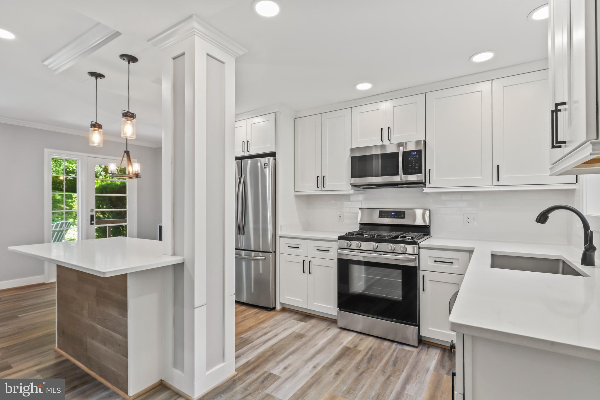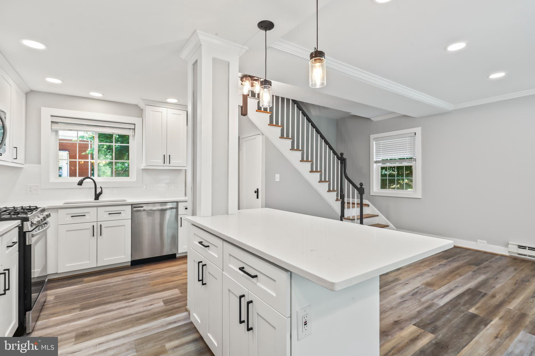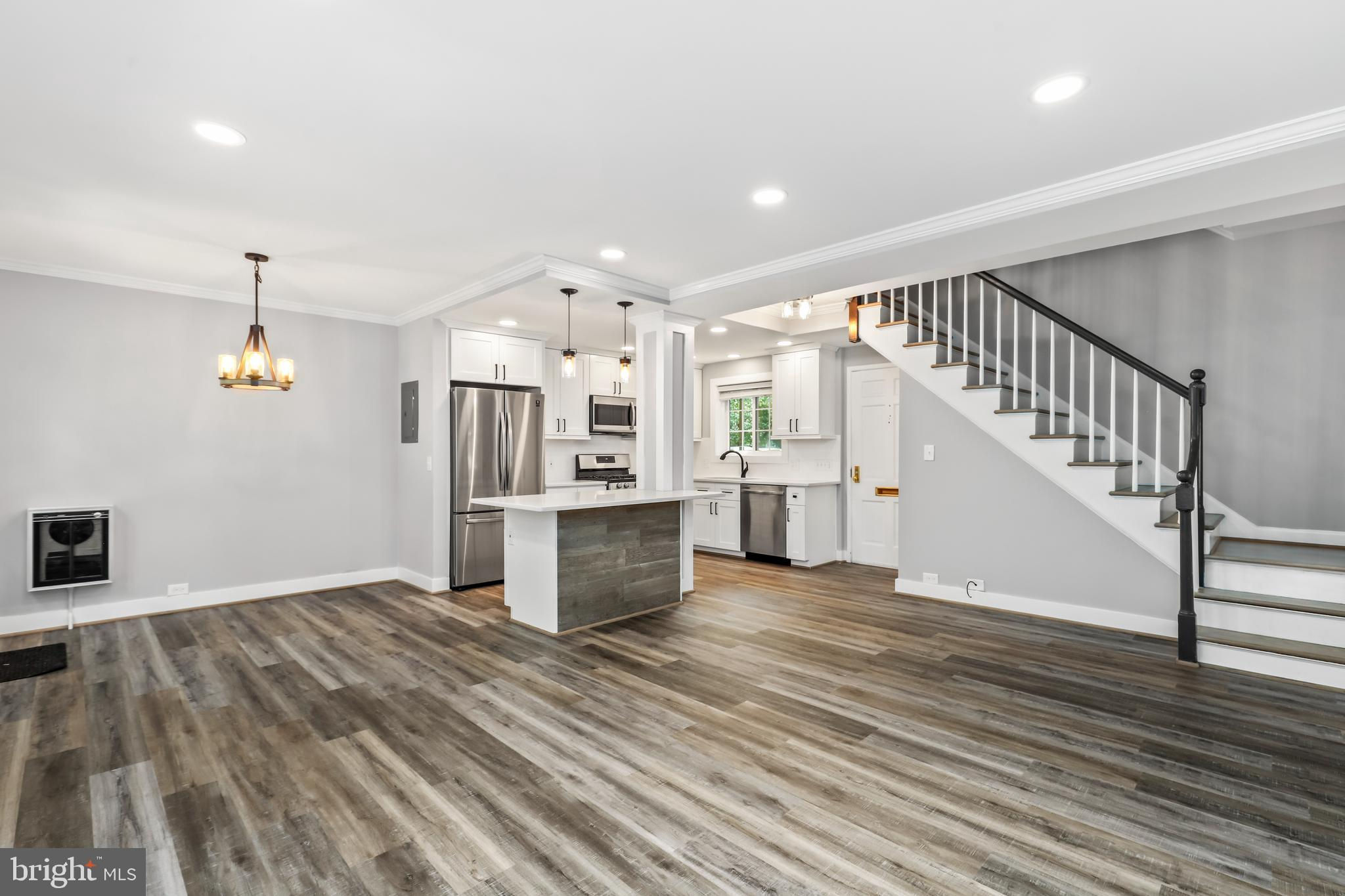 NEW PRICE! Absolutely stunning 2 bed, 1 bath end-unit townhouse, perfect for modern living! Enjoy brand new flooring throughout this beautifully updated home. The kitchen is a chef's dream, featuring sleek stainless steel appliances, a spacious island, updated light fixtures, and elegant white countertops and cabinets. The living area is illuminated by recessed lighting, adding a contemporary touch. Upstairs, you'll find two cozy bedrooms and a shared full bathroom with a gorgeous tiled shower and a chic white vanity. The backyard is a private oasis with a patio, perfect for entertaining. Ideally situated near major commuter routes, this gem is a must-see! Come tour today and fall in love with your new home!