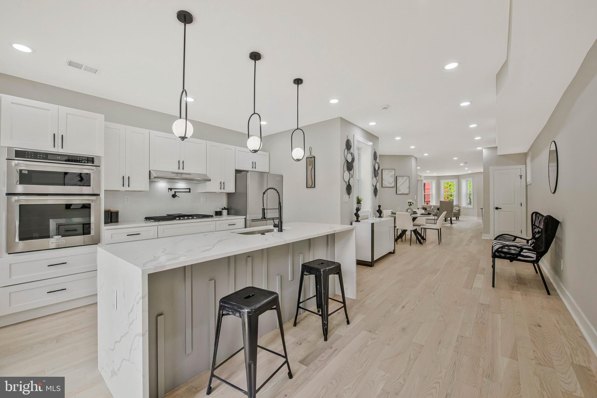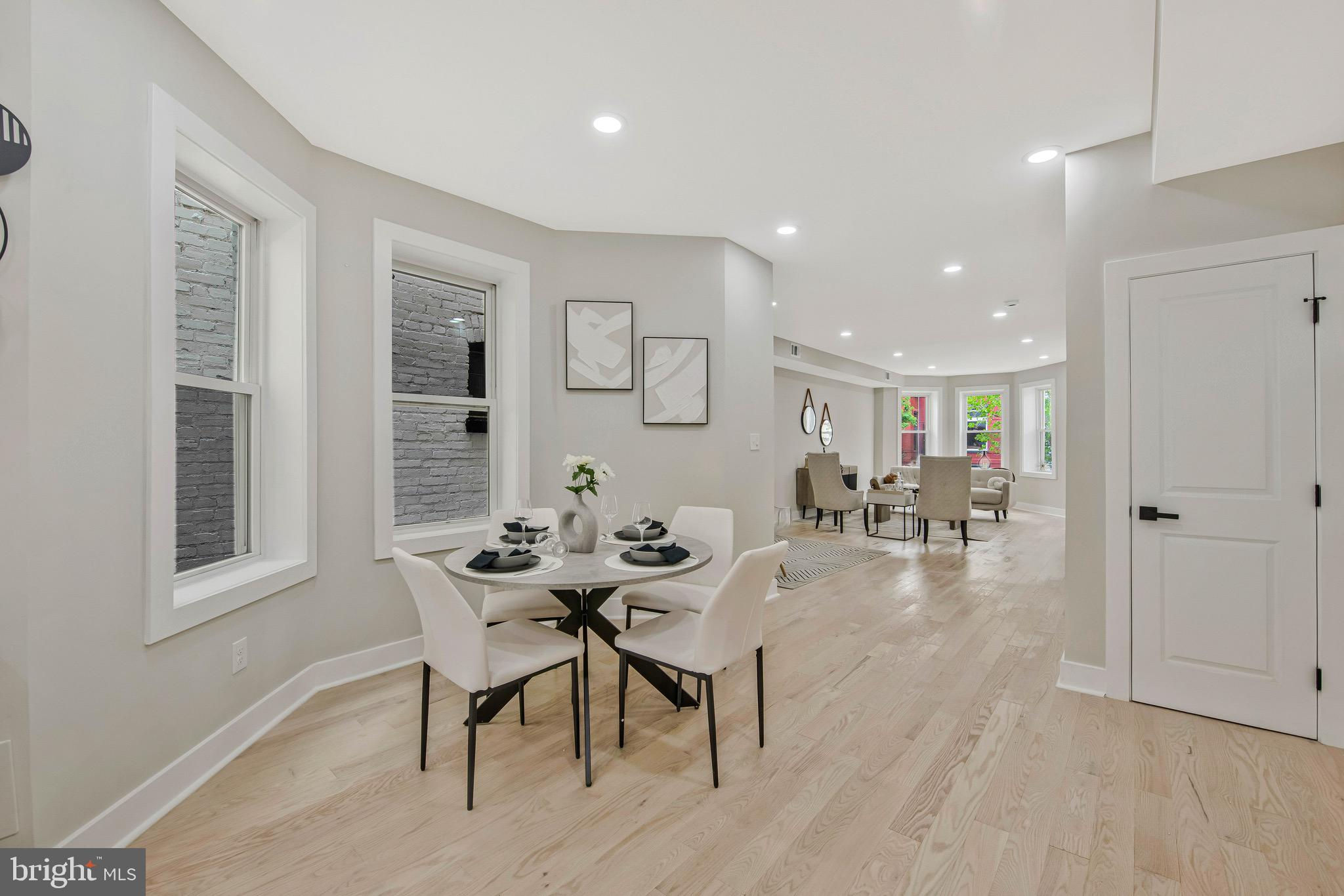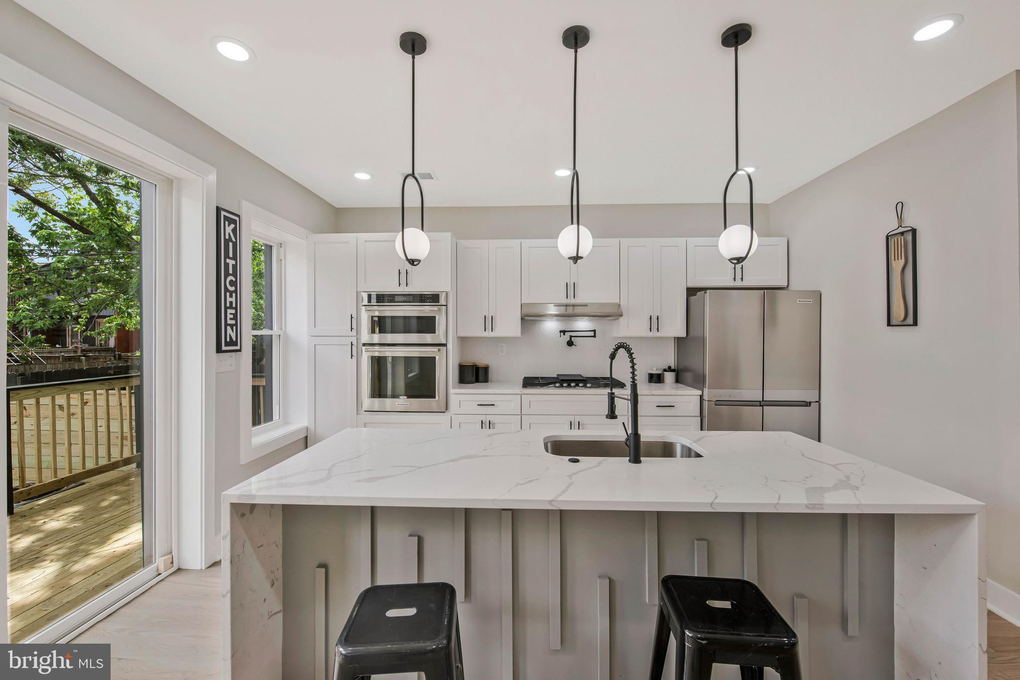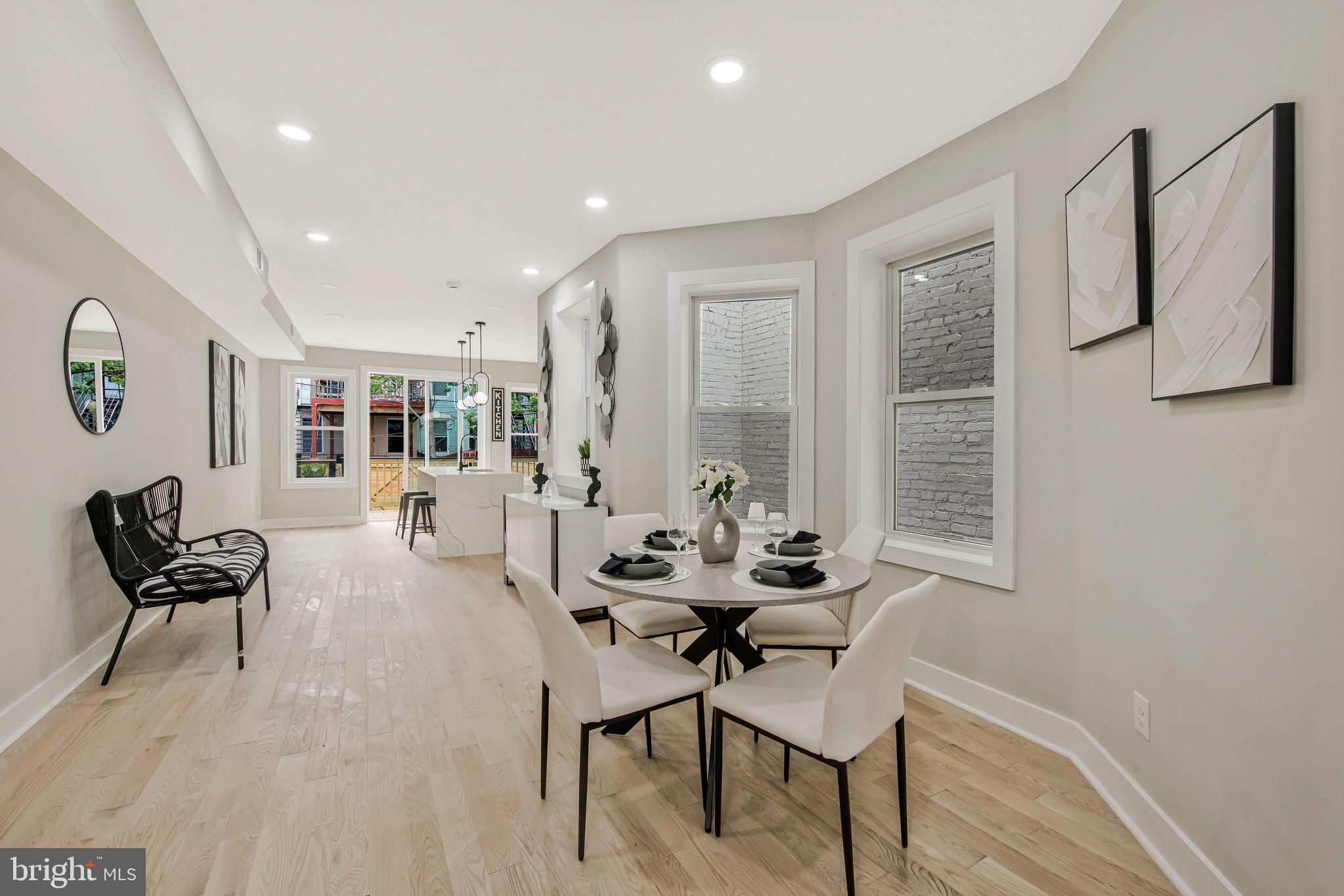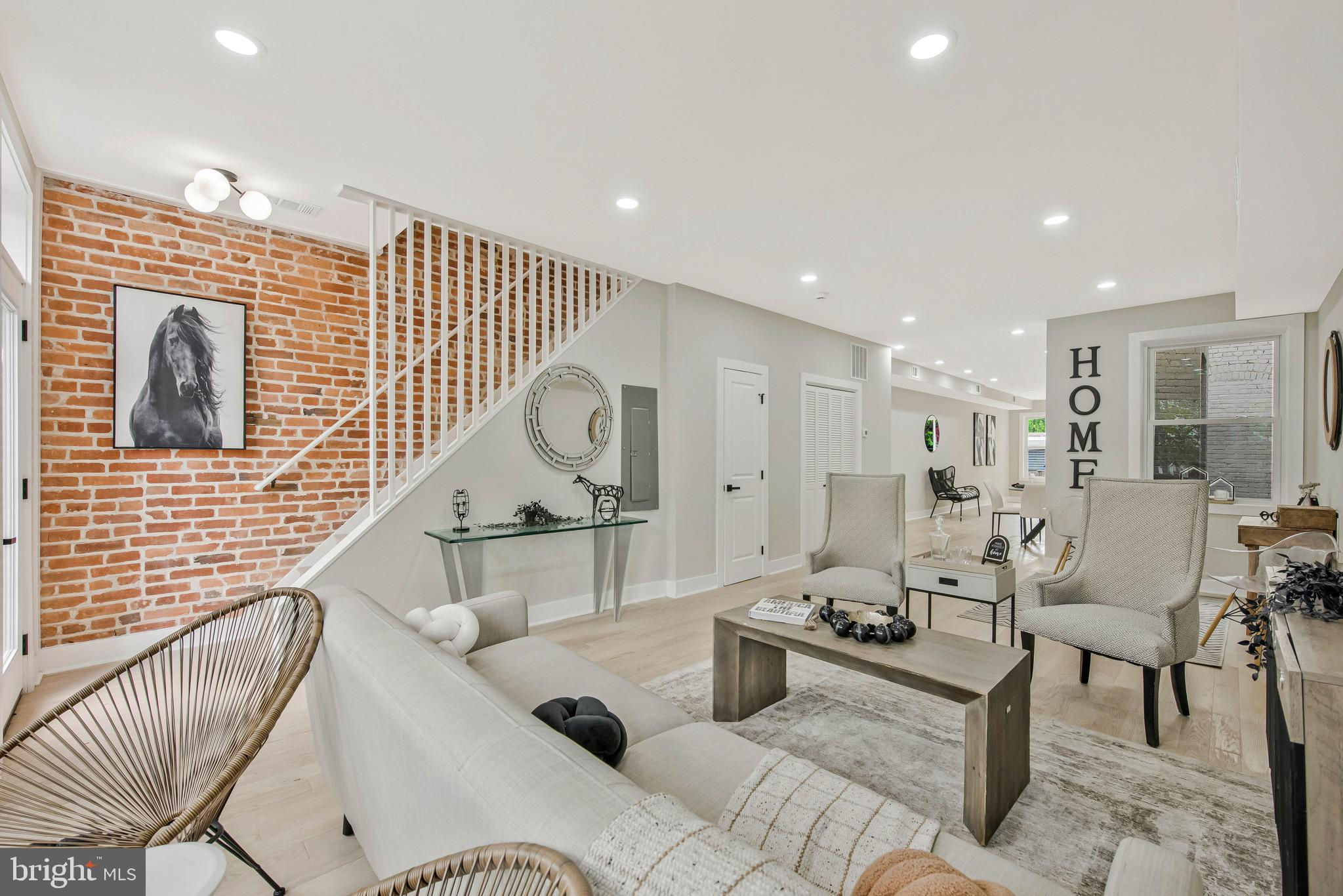 2 Parking Spots in Rear!!! Welcome to 1713 4th Street NW—a beautifully reimagined, light-filled two-level row-home in the heart of the vibrant Shaw neighborhood. This stunning residence seamlessly blends classic DC charm with modern sophistication, offering high ceilings, expansive windows, and an open, airy floor plan designed for today’s lifestyle. Step inside to discover a warm and inviting living area where an exposed brick accent wall and architectural staircase set the tone for timeless character. The flow continues into a dedicated dining space and a gourmet kitchen at the rear of the home—featuring shaker-style white cabinetry, granite countertops, a custom tile backsplash, stainless steel appliances with gas cooking, and a large waterfall island perfect for casual dining or entertaining. The main level showcases gleaming hardwood floors, fresh designer paint, and an updated powder room, plus direct access to a private deck and fenced backyard—an ideal retreat for outdoor gatherings or quiet mornings with coffee. Upstairs, you’ll find three spacious bedrooms, all with ceiling fans and wood flooring, along with two updated full baths. The primary suite offers a serene escape with a luxurious en-suite bath and generous closet space. A washer and dryer are conveniently located on the upper level for easy living. Completing this perfect package are two private parking spaces in the rear, a rare and valuable feature in the city. Situated just blocks from the Shaw-Howard Metro, and steps from some of DC’s most beloved spots—Big Bear Café, The Royal, Dacha Beer Garden, Boundary Stone, Beau Thai, and the Bloomingdale Farmers Market—this home offers the ultimate in urban DC living with a neighborhood that’s as dynamic as it is welcoming.