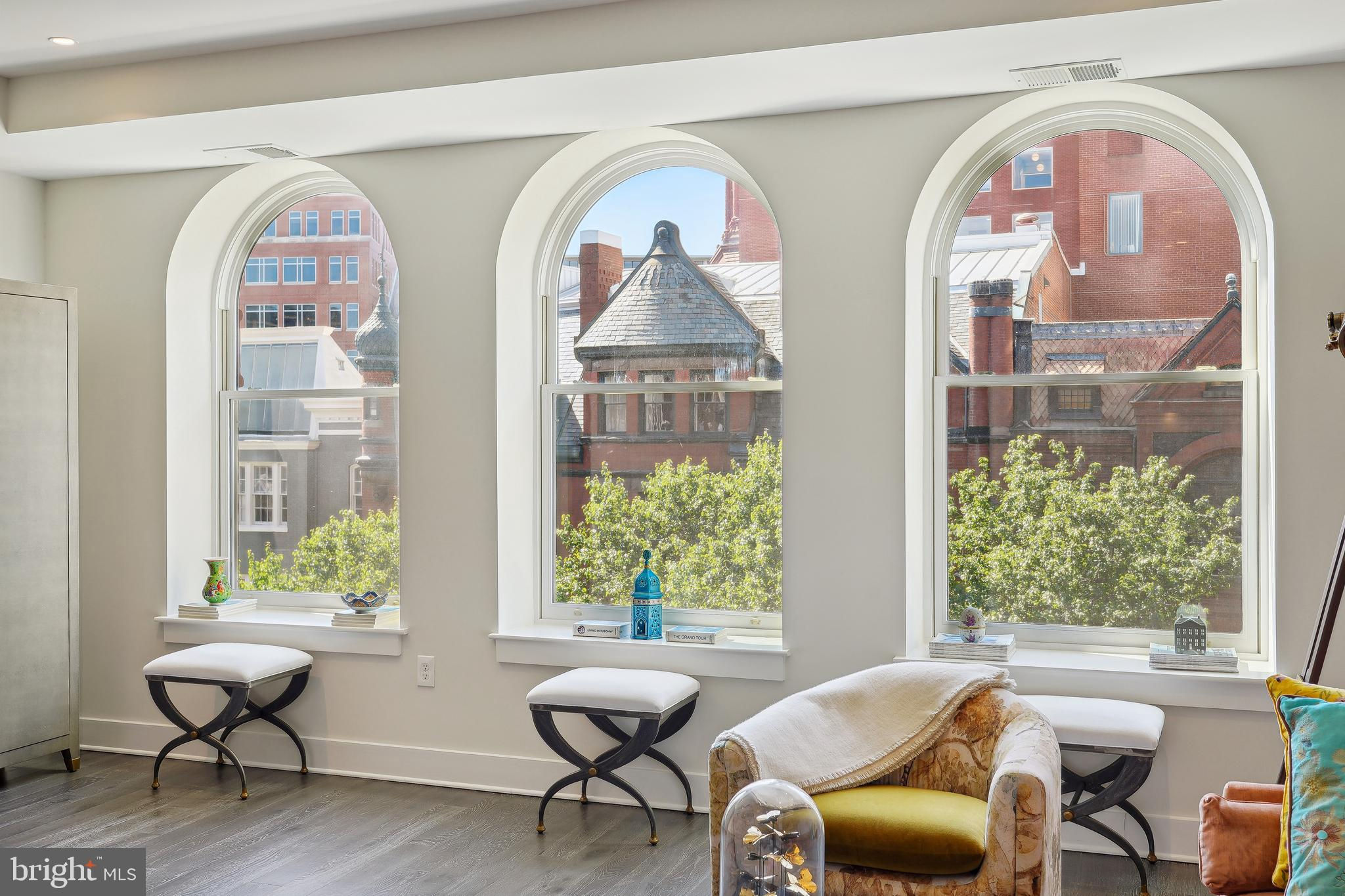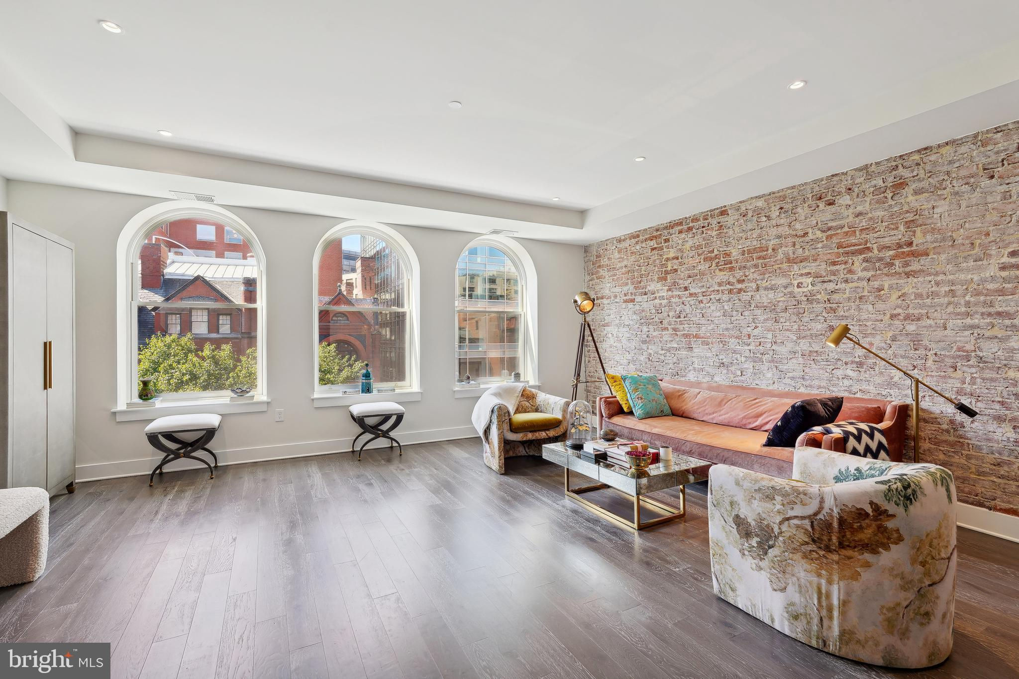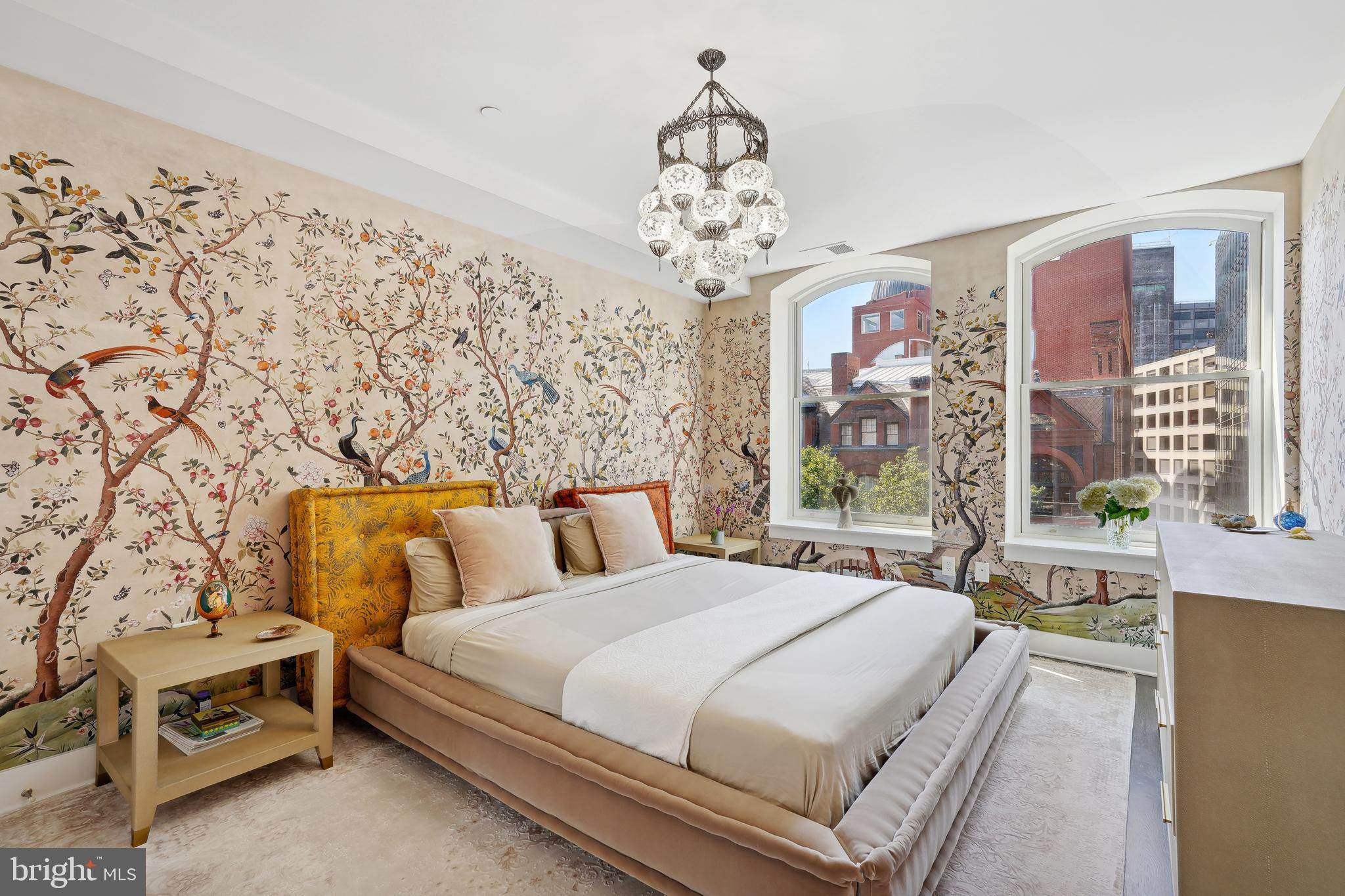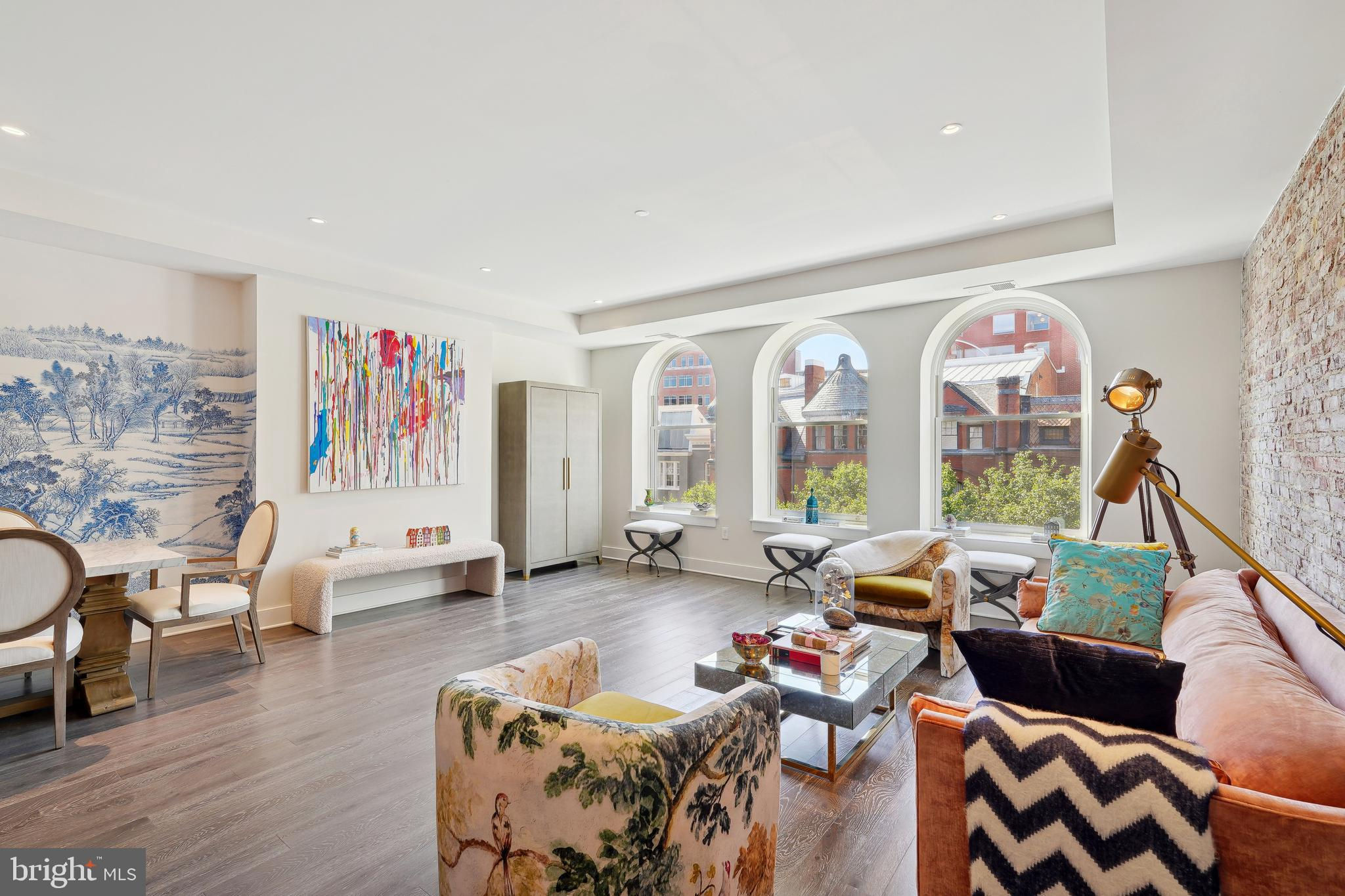 NEW PRICE! See 3D Walkthrough Tour! Residence 410 in the Historic Row at 1745N is nestled in the heart of Dupont Circle. This distinguished one-level designer home boasts premium size and beyond exceptional views. A blend of historic charm and modern sensibilities await a new owner. Step into this architecturally distinct sanctuary and be greeted by the warmth of exposed brick and the elegance of arched windows. As you cross the threshold into the foyer, you'll immediately sense the craftsmanship and attention to detail that permeates every inch of this one-bedroom with large den and attached second full bath. An additional powder room bath in entry foyer of this 1,466 SF home. Southern sunlight beaming through the expansive windows creates a captivating living space, offering breathtaking views of the historic Cathedral of St. Matthews, charming Italianesque row homes, and delicate cherry blossoms. It's not just a home; it's a canvas for an artistic vision of urban beauty. Inside, the finer details await your discovery: Bosch stainless steel appliances, including gas cooking, quartz countertops, and custom cabinetry adorn the spacious kitchen. Live like Yves Saint Laurent with designer chinoiserie wallpaper inspired by his apartment in Paris. Wide-plank premium hardwood flooring leads you through the open floor plan, while custom built-in closets provide ample storage space. But the perks don't end there. Residence 410 comes complete with concierge service, secure deliveries, a convenient bike room, and a tranquil outdoor courtyard plus a rooftop with city views, ensuring both luxury and convenience at your fingertips. Any worries about parking vanish with an included reserved underground garage space. Embrace the vibrant energy of downtown DC, with parks, museums, and renowned eateries just moments away. And when you're ready to unwind, return to the tranquility of your elegant home, surrounded by the rich history and cultural allure of Dupont Circle. Experience the seamless blend of historic charm and modern luxury at the Historic Row at 1745N Dupont. Your new chapter awaits!