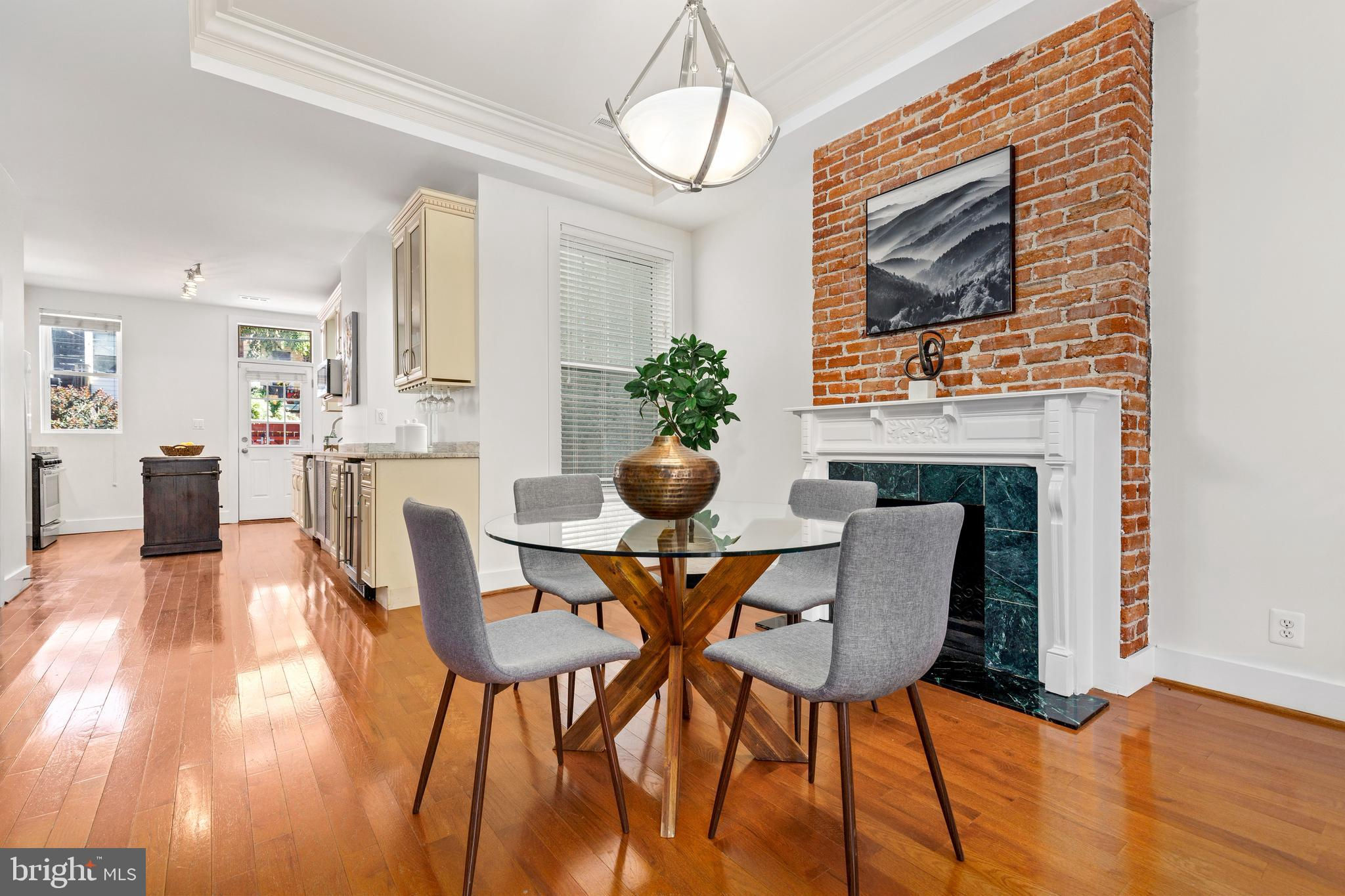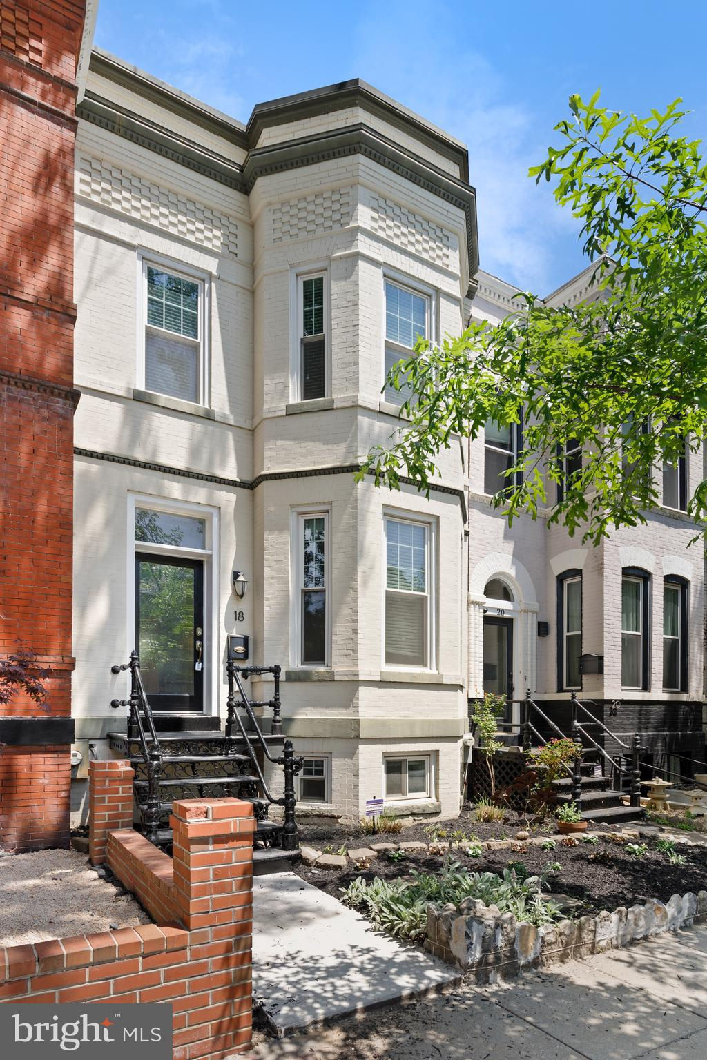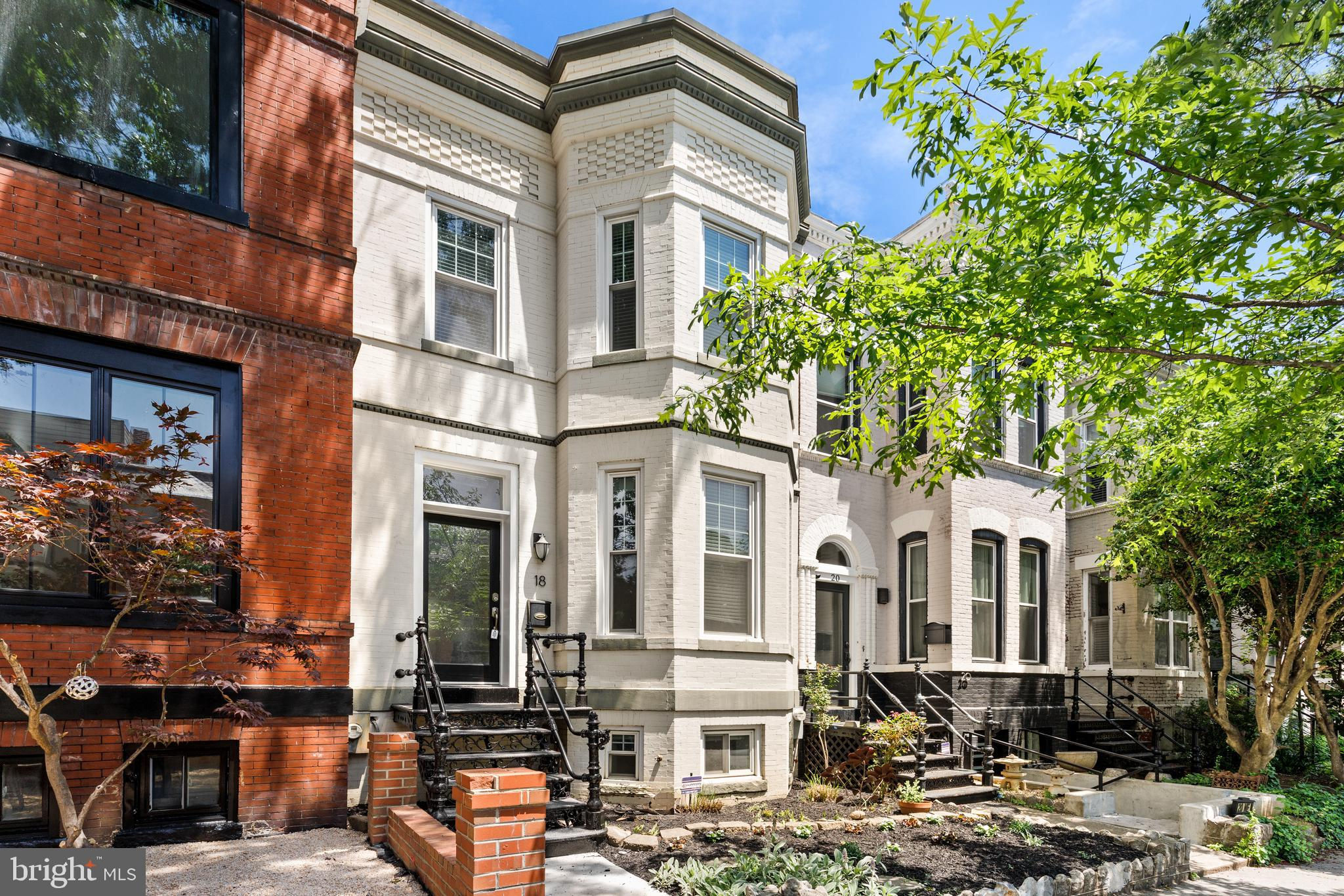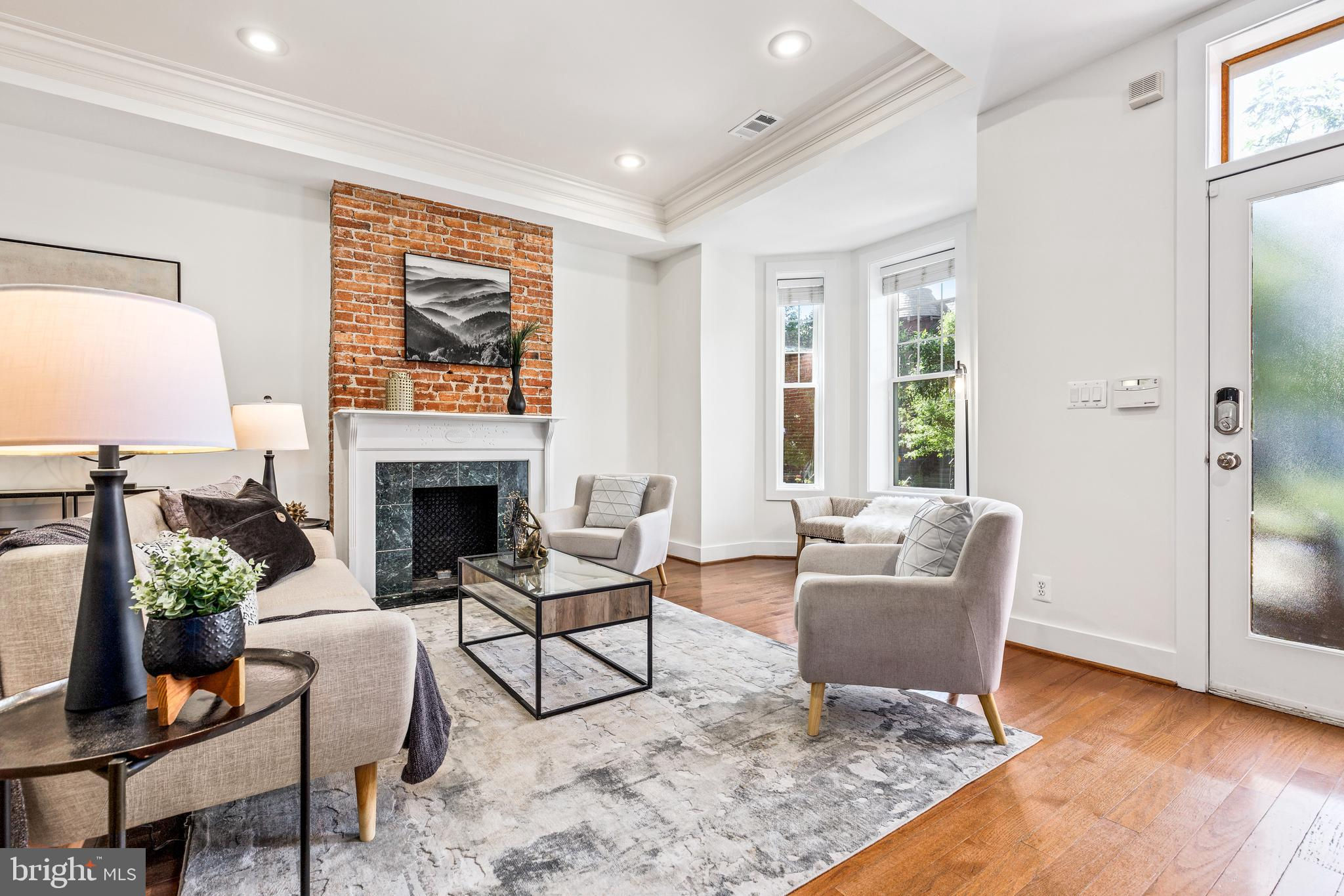 On an enchanting, tree-lined street in Eckington, this delightful row house offers three floors of living space. Historic details fill this lovely home with charm, from the exposed brick to the bay windows. Hardwood floors sweep through the open floor plan, with two fireplaces anchoring the main floor and a powder room for guests. Three windows fill the open kitchen with natural light, and a door leads to the back patio and gated parking pad. Home chefs will love the full suite of Bosch stainless-steel appliances, ample cabinet space and prep island. Upstairs, soaring ceilings will immediately catch the eye. The primary bedroom is filled with light from the bay windows, which create the perfect reading nook. Double closets with organizers offer plenty of storage, and the marble, en suite bath boasts a double vanity and glass shower. The finished lower level with exposed brick and a wet bar is an ideal family room, while the bedroom and full bath create a welcoming in-law suite for visiting guests. Every detail in this stunning home has been beautifully renovated, from the marble baths to the skylights. Enjoy all this blossoming neighborhood has to offer, including the food stalls of Union Market, a bouldering gym, upcoming Right Proper Brewhouse, award-winning restaurants like The Red Hen and music venues like Songbyrd. Shop at nearby Trader Joe’s and Harris Teeter. The metro is just over a mile away.