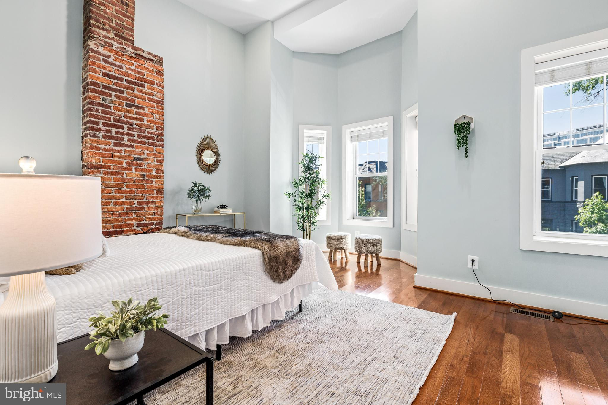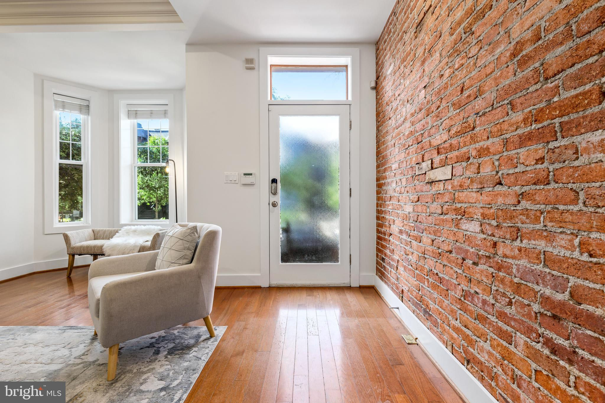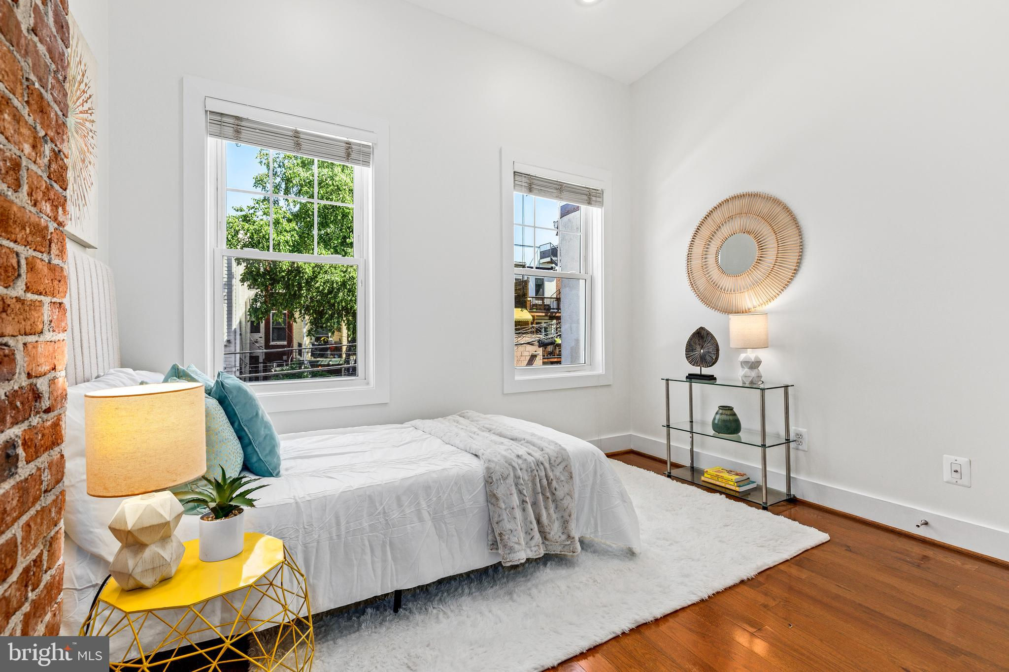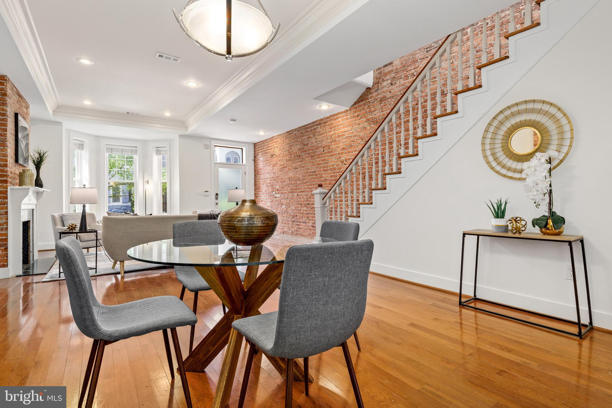 On an enchanting, tree-lined street in Eckington, this delightful row house offers three floors of living space. Historic details fill this lovely home with charm, from the exposed brick to the bay windows. Hardwood floors sweep through the open floor plan, with two fireplaces anchoring the main floor and a powder room for guests. Three windows fill the open kitchen with natural light, and a door leads to the back patio and gated parking pad. Home chefs will love the full suite of Bosch stainless-steel appliances, ample cabinet space and prep island. Upstairs, soaring ceilings will immediately catch the eye. The primary bedroom is filled with light from the bay windows, which create the perfect reading nook. Double closets with organizers offer plenty of storage, and the marble, en suite bath boasts a double vanity and glass shower. The finished lower level with exposed brick and a wet bar is an ideal family room, while the bedroom and full bath create a welcoming in-law suite for visiting guests. Every detail in this stunning home has been beautifully renovated, from the marble baths to the skylights. Enjoy all this blossoming neighborhood has to offer, including the food stalls of Union Market, a bouldering gym, upcoming Right Proper Brewhouse, award-winning restaurants like The Red Hen and music venues like Songbyrd. Shop at nearby Trader Joe’s and Harris Teeter. The metro is just over a mile away.