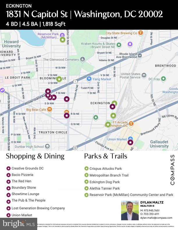 This beautifully updated row home blends historic character with modern functionality across three finished levels. Every bedroom has its own dedicated full bath, making it ideal for multi-generational living, guests, or roommates. Natural light pours in from the east-west exposures, highlighting architectural details like crown molding, exposed beams, and a striking wood-lined turret. The open-concept main level features a chef-worthy kitchen outfitted with high-end Viking appliances and ample room for entertaining. Throughout the home, you’ll find generous storage and a low-maintenance layout—with no yard work and no condo fee. The finished lower level includes great ceiling height, a bedroom, full bath, and kitchenette—perfect as a guest suite, au pair quarters, additional living space, or short term rental. Located just minutes from MedStar Washington Hospital Center and steps from the exciting new Reservoir District, the home also offers close proximity to Union Market, Trader Joe’s, the Alamo Drafthouse Cinema, and a vibrant mix of local restaurants. Getting around is effortless, with nearby Metro access, multiple bus lines, the Metropolitan Branch Trail, and quick access to downtown and major highways. Enjoy beautiful views of the Capitol. Timeless character, everyday convenience, and an unbeatable D.C. location—this home delivers on all fronts. Some photos are virtually staged.