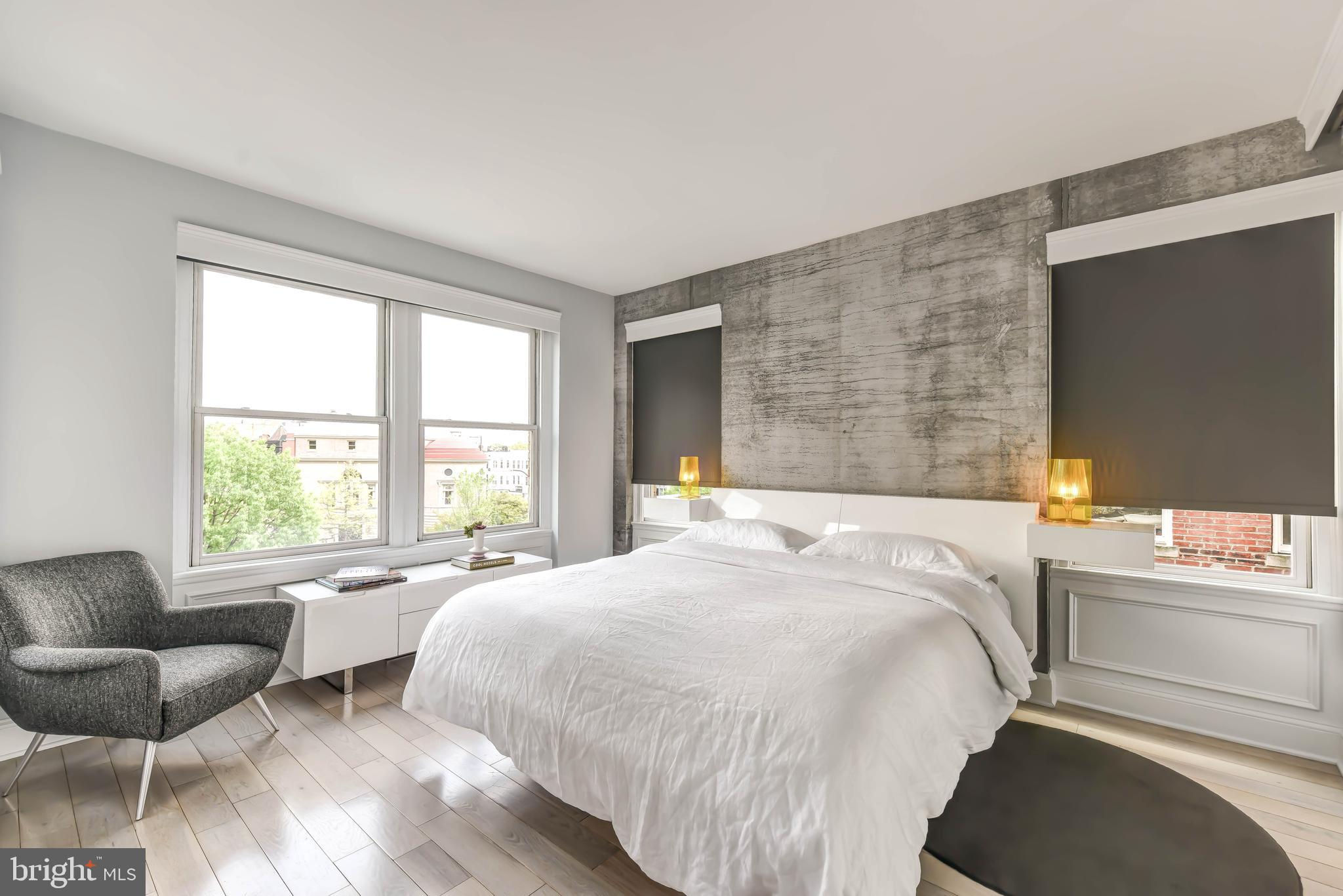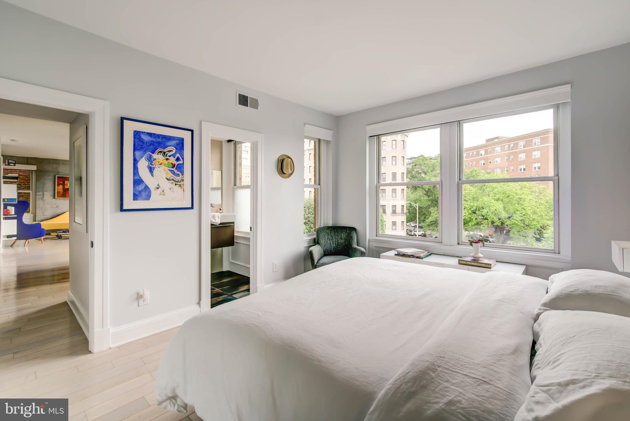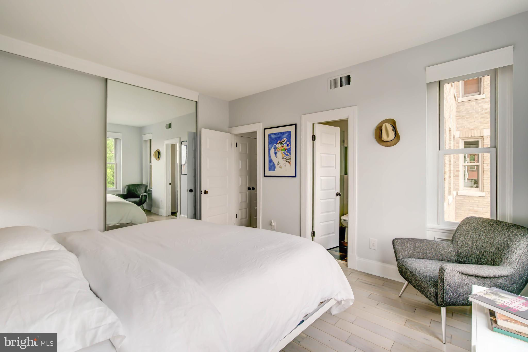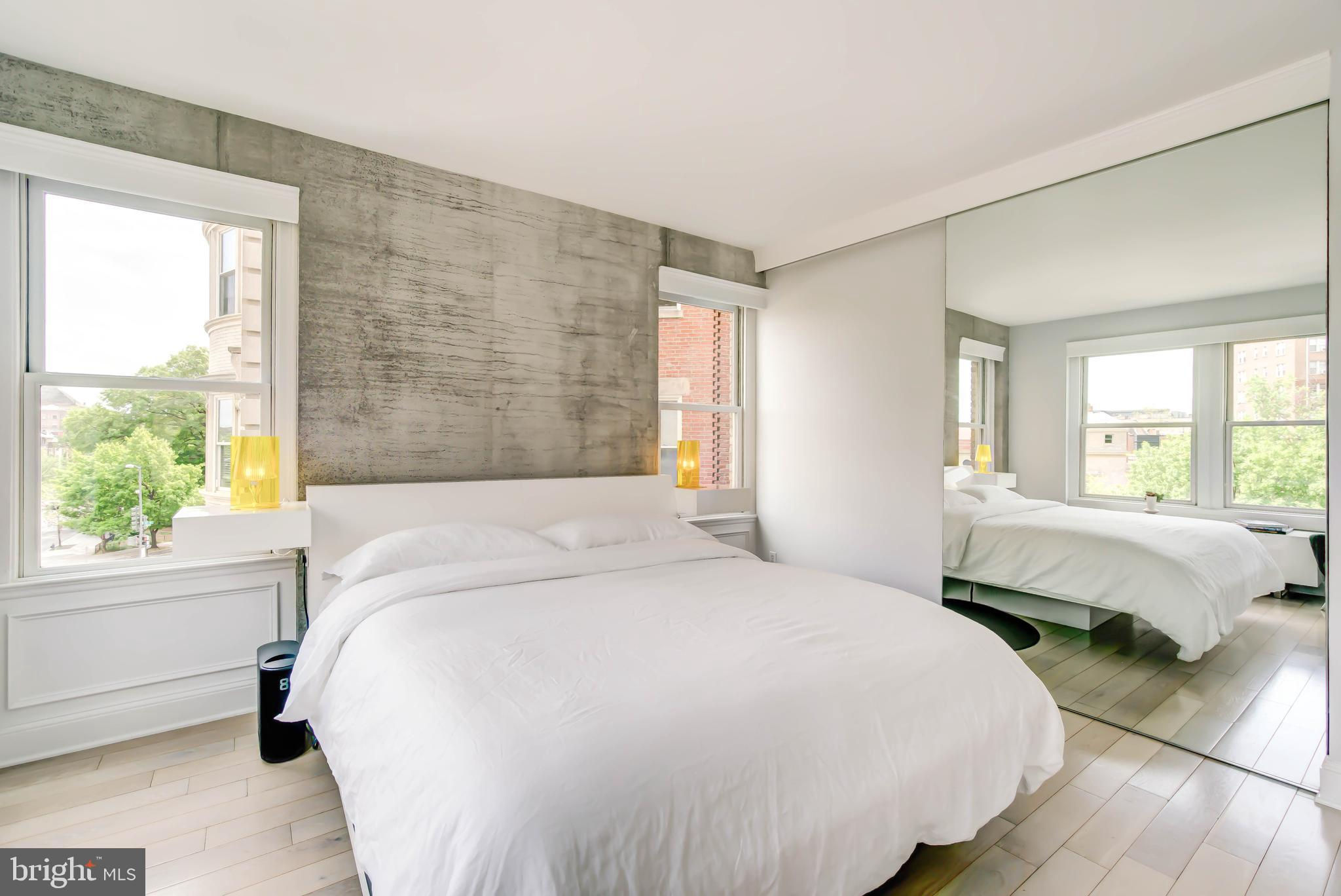 Paris meets NYC in this sensational, one-of-a-kind urban abode. Set high atop 16th Street in a Beaux Arts gem dating back to 1911, unit 300 spans this boutique building's entire eastern front facade with 14 windows capturing a panoramic view that includes the treetops of Meridian Hill Park, incredible morning sunrises and even the iconic Masonic Temple. If natural light feeds your soul, prepare to flourish here. This setting has been the muse for a series of design aficionados who have transformed this formerly two-bedroom, two-bathroom residence into a more open and elegant one-bedroom unit that still maintains the flexibility to easily convert back to a two-bedroom home should one desire it (see Documents Section for prospective 2BR plan). BRAND NEW HVAC INSTALLED. The current owner worked in collaboration with NYC design firm, Nemaworkshop, to reimagine the space once again by opening up the kitchen to the entry hall and dining area, installing 4" white oak floors throughout, adding custom wall coverings (including ConcreteWall- imported from Norway), replacing all 14 windows and adorning them with Hunter Douglas automated roller shades with blackouts in the primary, building out a fabulous mirrored wall in the primary that glides to reveal custom closets and a smartly designed, minimalist work station in the living room. Additional luxury features in the kitchen include a Wolf Induction cooktop, a Bertazzoni Wall Oven, and Quartz waterfall counters. The two spa-inspired baths feature Duravit sinks, Ann Sacks tile, and frameless glass shower enclosures set in teak wood. Every single detail of this unit has been designed to delight and this is an offering that you will not want to miss! 2008 16th Street's prime location lies at the intersection of several of the District's most sought-after neighborhoods- Dupont Circle, Adams Morgan, and the U Street, 14th Street & 17th Street Corridors. Every possible amenity is at your fingertips with exquisite restaurant and retail offerings, proximity to the grocery(Trader Joe's & Whole Foods), gyms ( 500 feet to Vida Fitness), Metro (.4mi to U Street/Green Line, and .7 to Dupont Circle/Red Line) and greenspace with majestic Meridian Hill Park just blocks away.