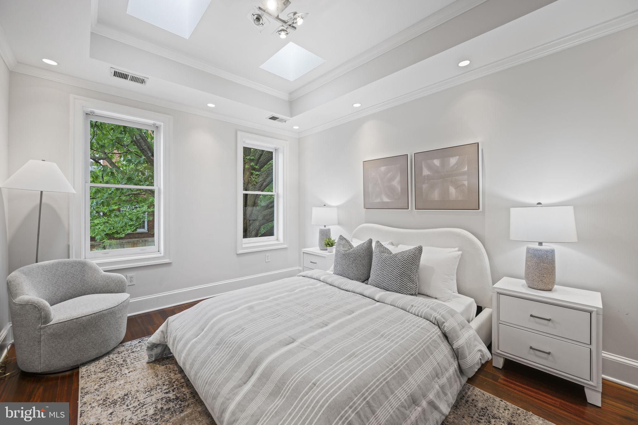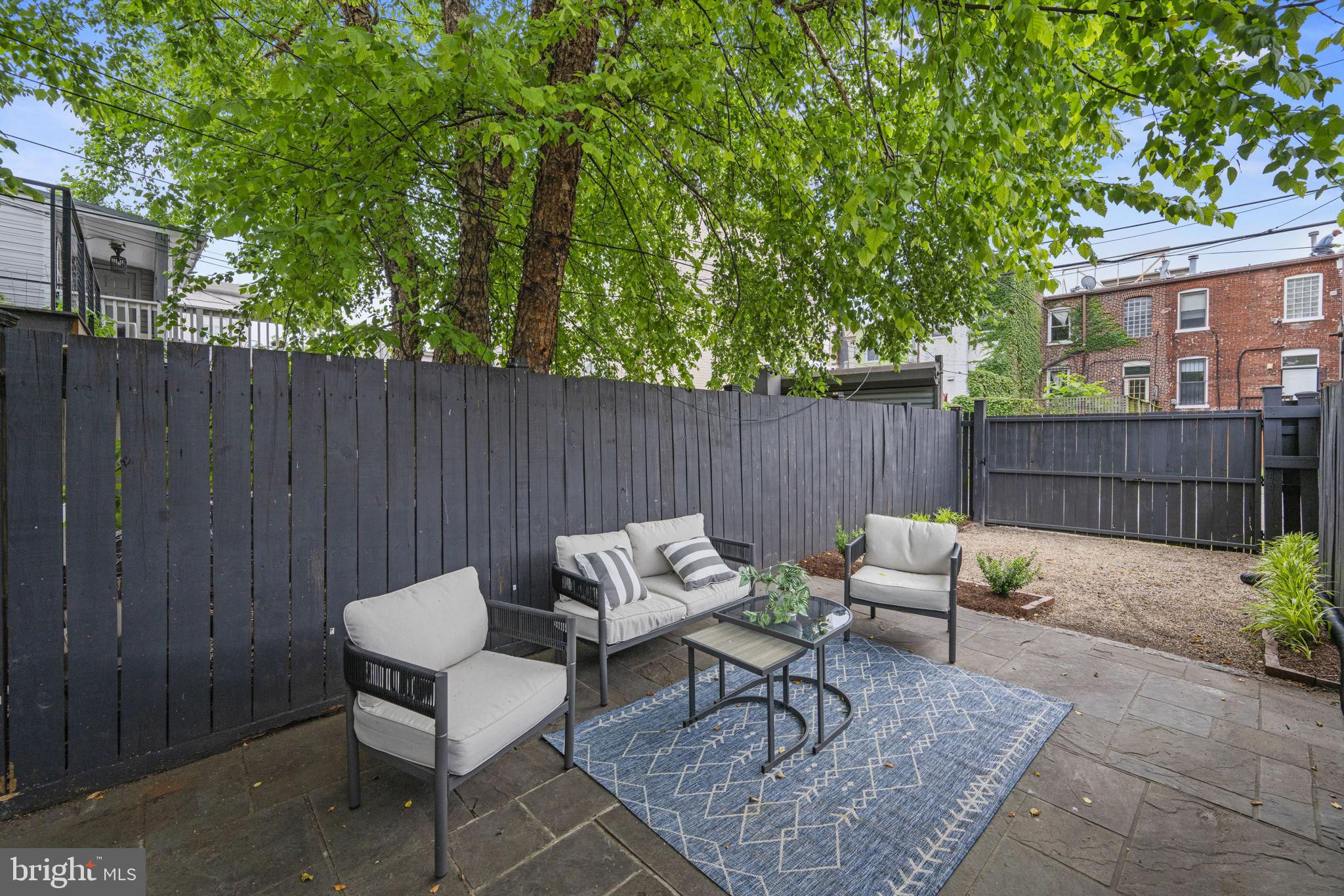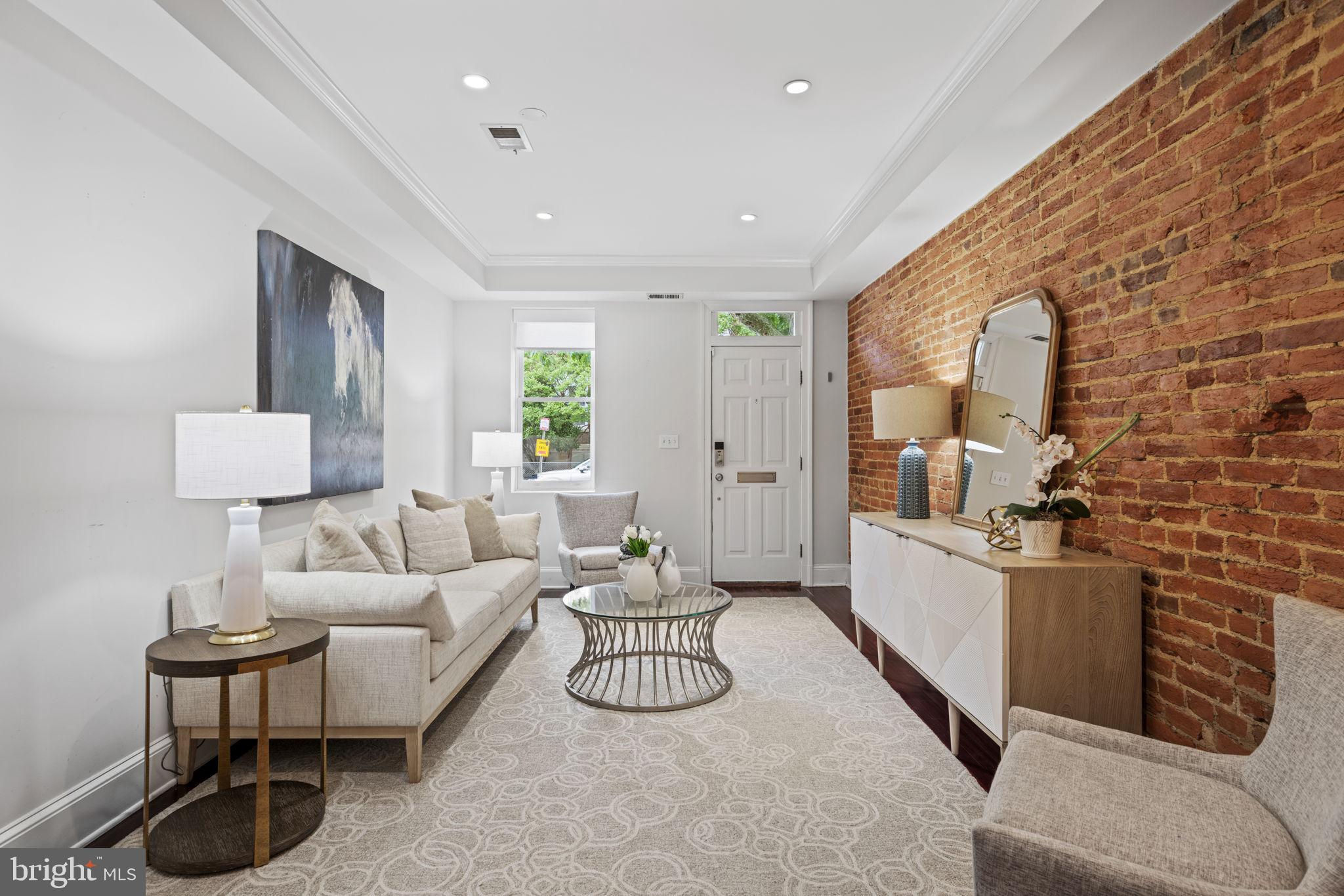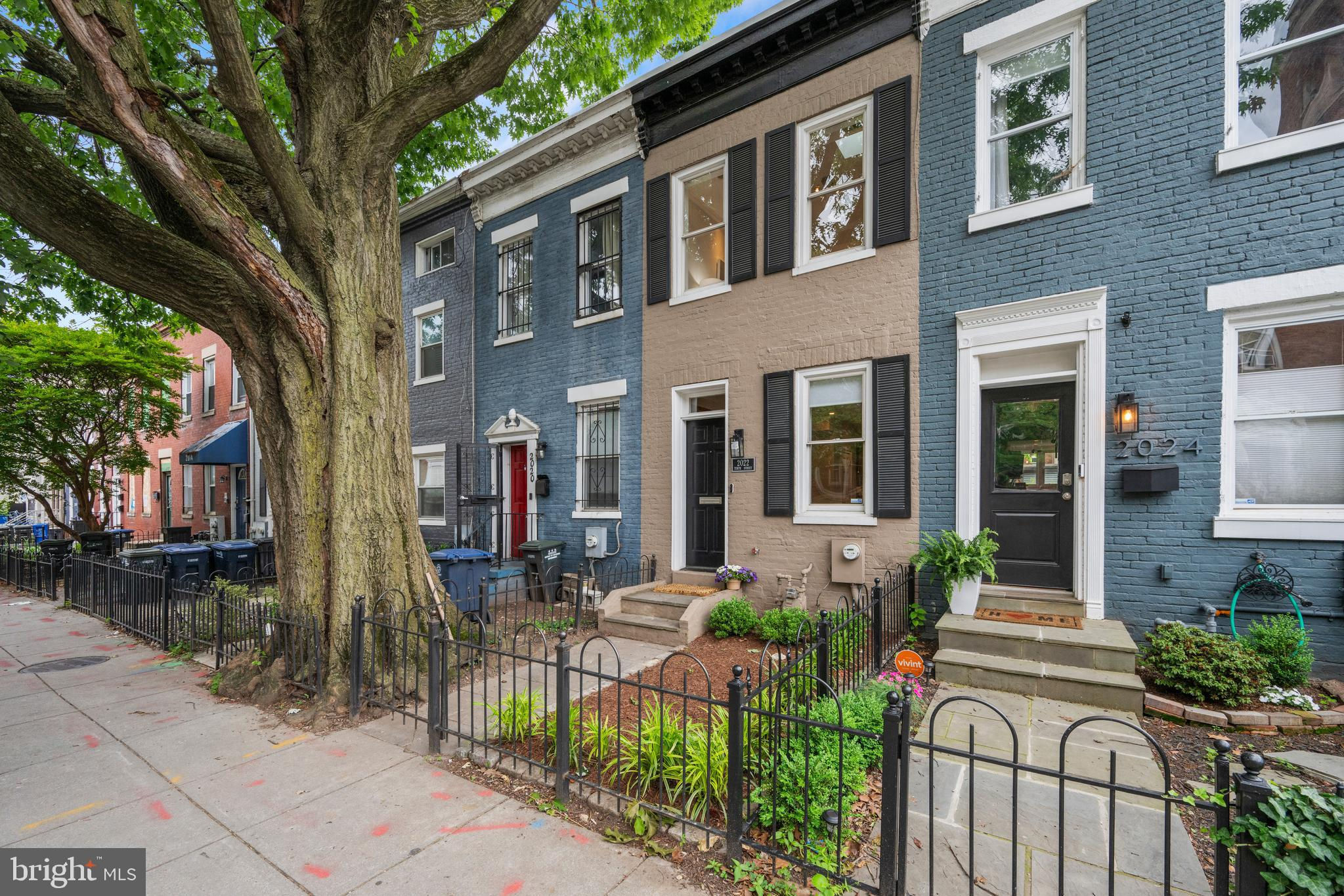 Originally built in 1880 and reconstructed to meticulous standards, this stunning two-bedroom, two-and-a-half-bathroom residence now boasts a contemporary 21st-century design behind a historic Federal facade from the turn of the century. Situated on an exceptionally deep lot spanning 99 feet, the property allows for an impressive open floor plan, lofty ceiling heights, and generously proportioned rooms. Its East/West orientation welcomes ample morning sunlight to the front of the home and lovely sunsets enjoyed from the rear garden and flagstone terrace. Among its notable features are a chef's kitchen with granite countertops and breakfast bar, stainless steel appliances including a gas range, and a dining area featuring an exposed brick accent wall. There is a convenient first-floor powder room, and a spacious family room/den with French doors opening to the rear garden, terrace, and private parking area. The second level comprises two expansive bedrooms and two full bathrooms, including the owner's suite which offers ample space for a king-sized bed, and an ensuite bath adorned with travertine marble tile and an oversized shower. The front bedroom is equally spacious, accentuated by a coffered ceiling with dual skylights. A new roof was installed in 2022, as well as a tankless hot water heater in 2023, and commercial-grade Carrier HVAC system in late 2020, both of which contribute to high efficiency and reduced energy consumption. With a front garden enclosed by a historic wrought iron fence and a newly landscaped garden, as well as a flagstone terrace and gated parking area at the rear, this home presents an attractive, private alternative to luxury condominium living. Positioned less than half a block from the METRO station, just two blocks from Whole Foods Market, and steps from the shops and restaurants along the vibrant U Street Corridor, this property offers a rare opportunity for refined urban living .