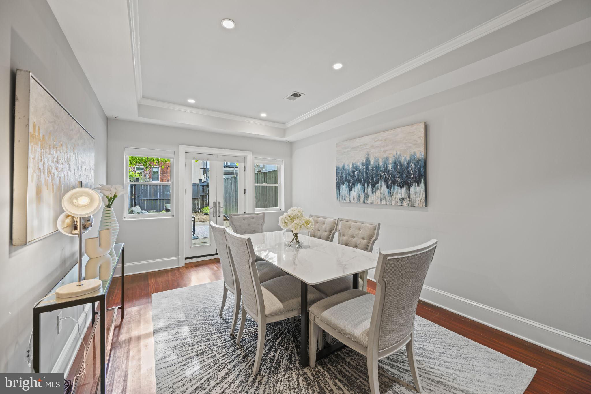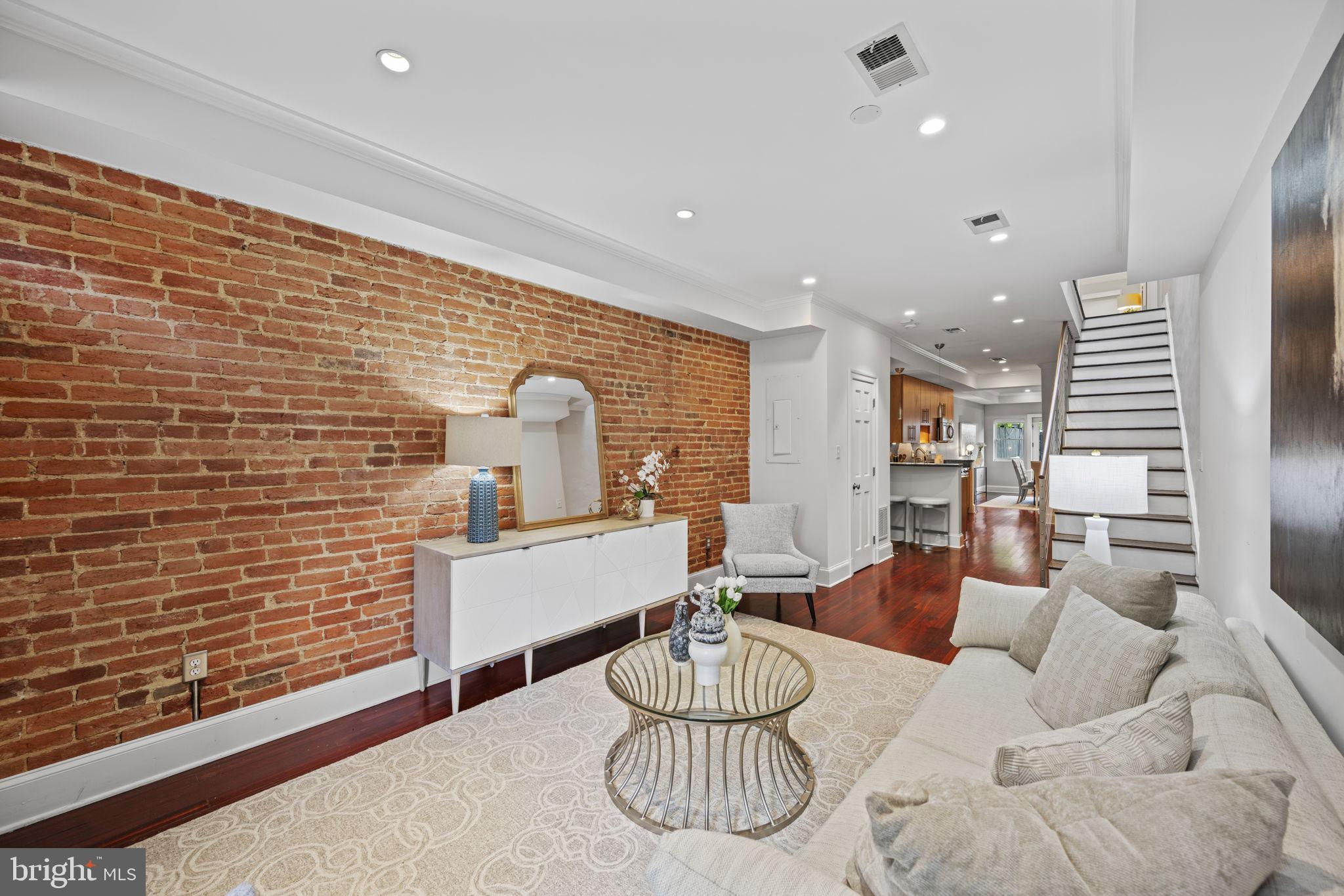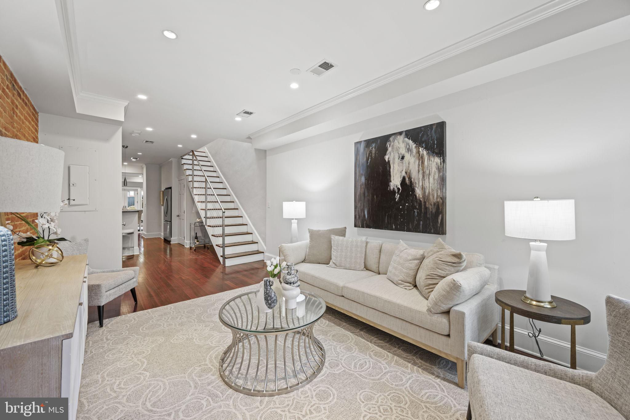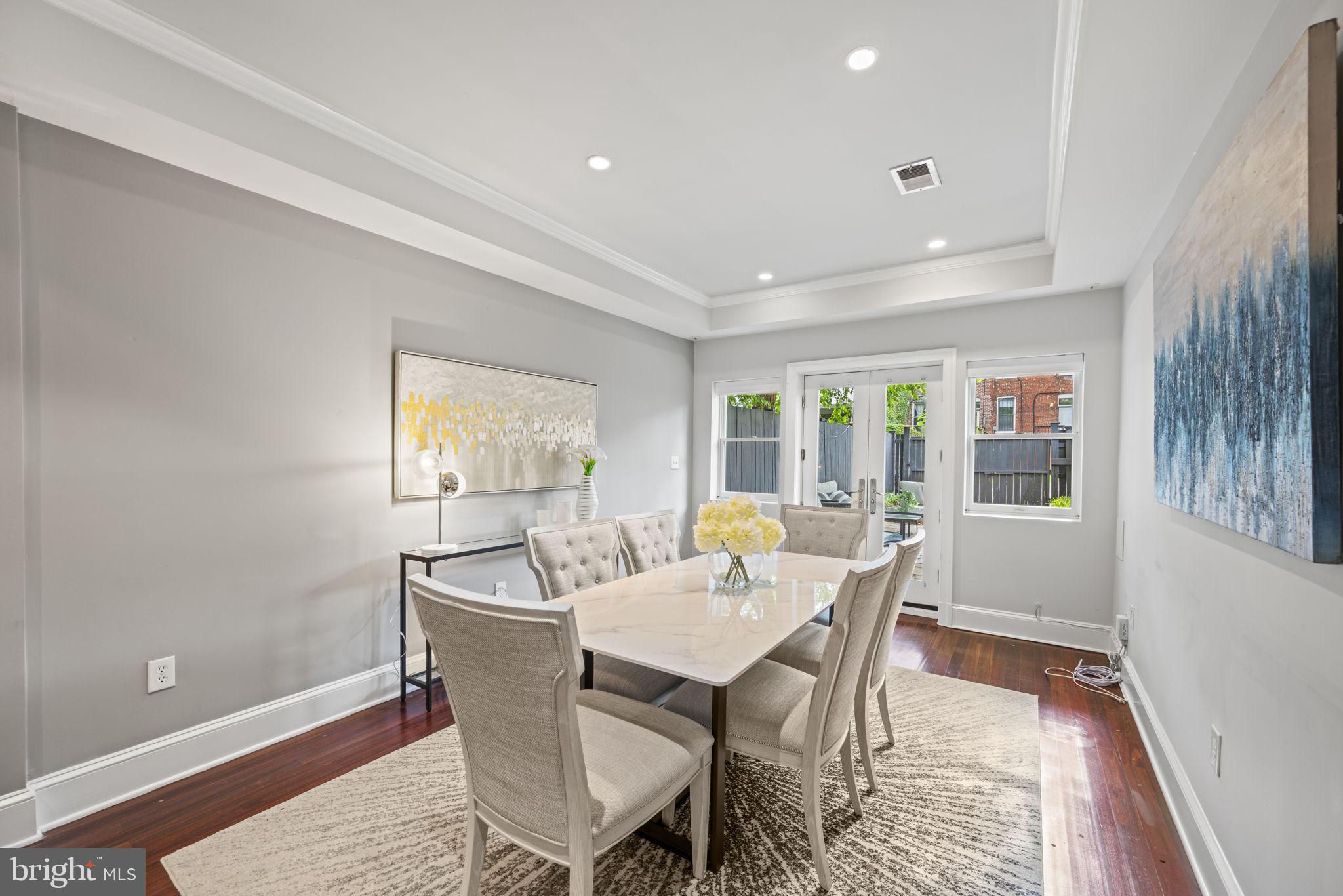 Originally built in 1880 and reconstructed to meticulous standards, this stunning two-bedroom, two-and-a-half-bathroom residence now boasts a contemporary 21st-century design behind a historic Federal facade from the turn of the century. Situated on an exceptionally deep lot spanning 99 feet, the property allows for an impressive open floor plan, lofty ceiling heights, and generously proportioned rooms. Its East/West orientation welcomes ample morning sunlight to the front of the home and lovely sunsets enjoyed from the rear garden and flagstone terrace. Among its notable features are a chef's kitchen with granite countertops and breakfast bar, stainless steel appliances including a gas range, and a dining area featuring an exposed brick accent wall. There is a convenient first-floor powder room, and a spacious family room/den with French doors opening to the rear garden, terrace, and private parking area. The second level comprises two expansive bedrooms and two full bathrooms, including the owner's suite which offers ample space for a king-sized bed, and an ensuite bath adorned with travertine marble tile and an oversized shower. The front bedroom is equally spacious, accentuated by a coffered ceiling with dual skylights. A new roof was installed in 2022, as well as a tankless hot water heater in 2023, and commercial-grade Carrier HVAC system in late 2020, both of which contribute to high efficiency and reduced energy consumption. With a front garden enclosed by a historic wrought iron fence and a newly landscaped garden, as well as a flagstone terrace and gated parking area at the rear, this home presents an attractive, private alternative to luxury condominium living. Positioned less than half a block from the METRO station, just two blocks from Whole Foods Market, and steps from the shops and restaurants along the vibrant U Street Corridor, this property offers a rare opportunity for refined urban living .