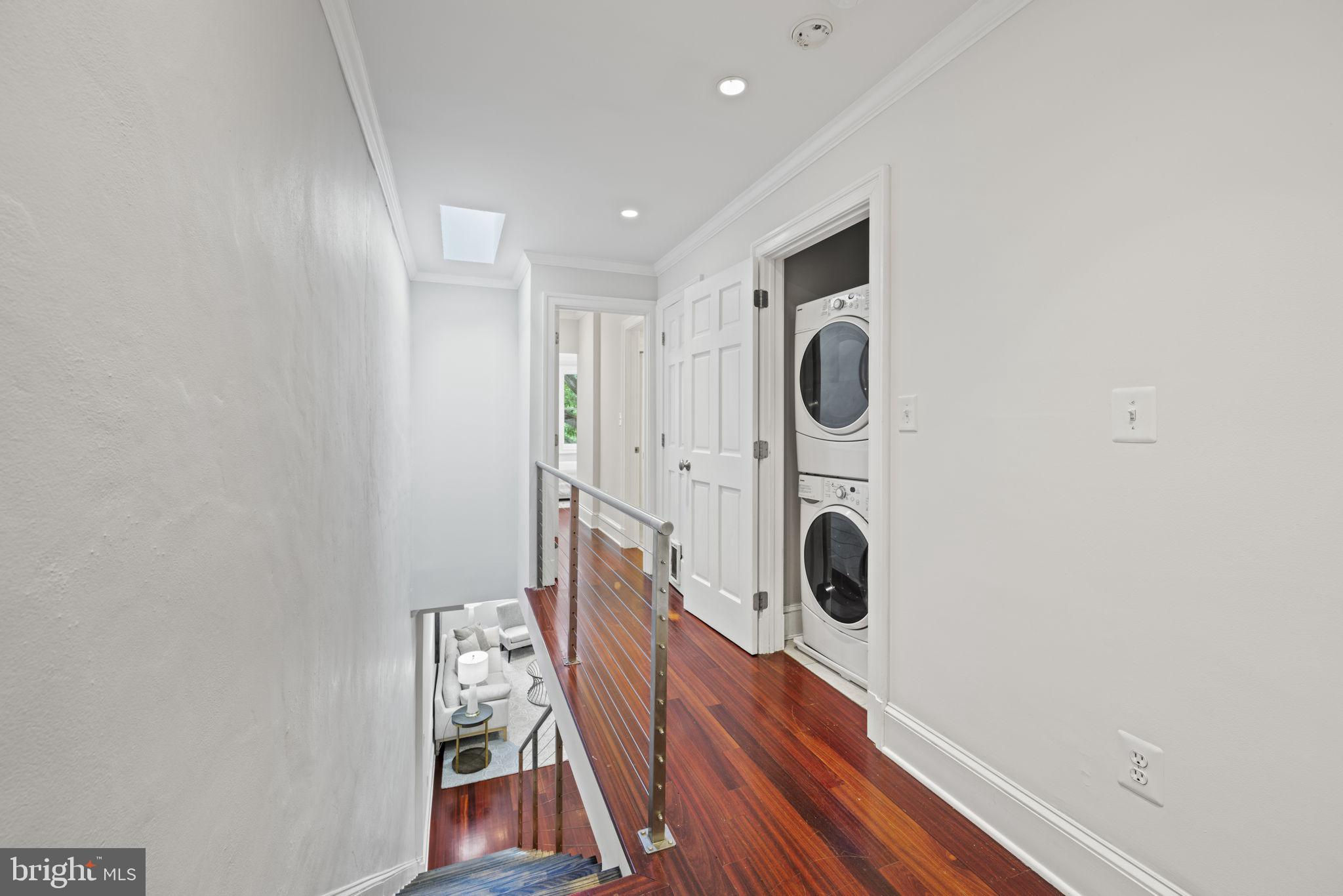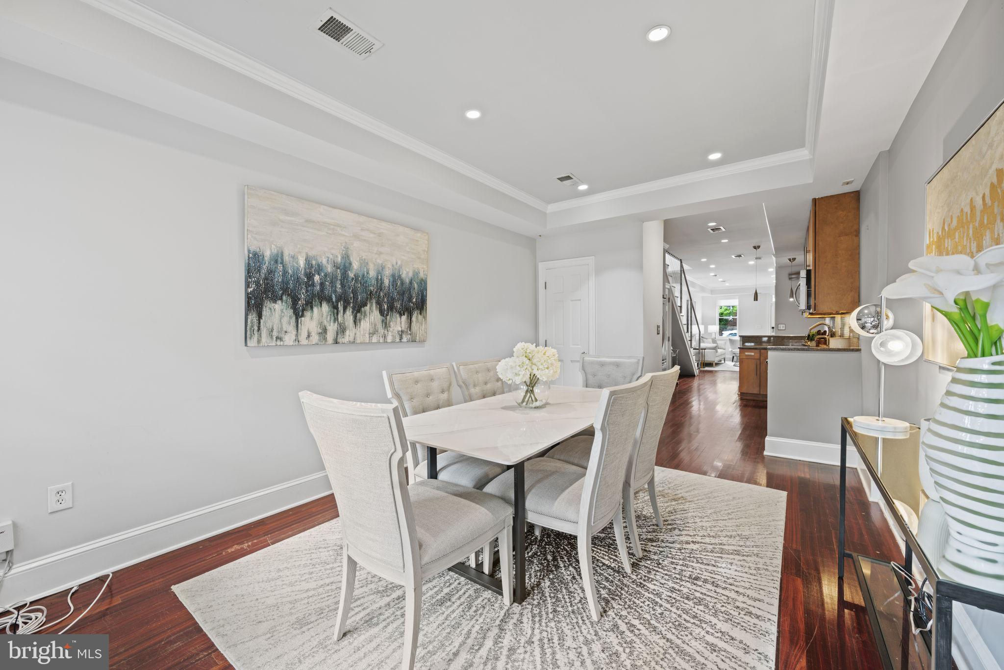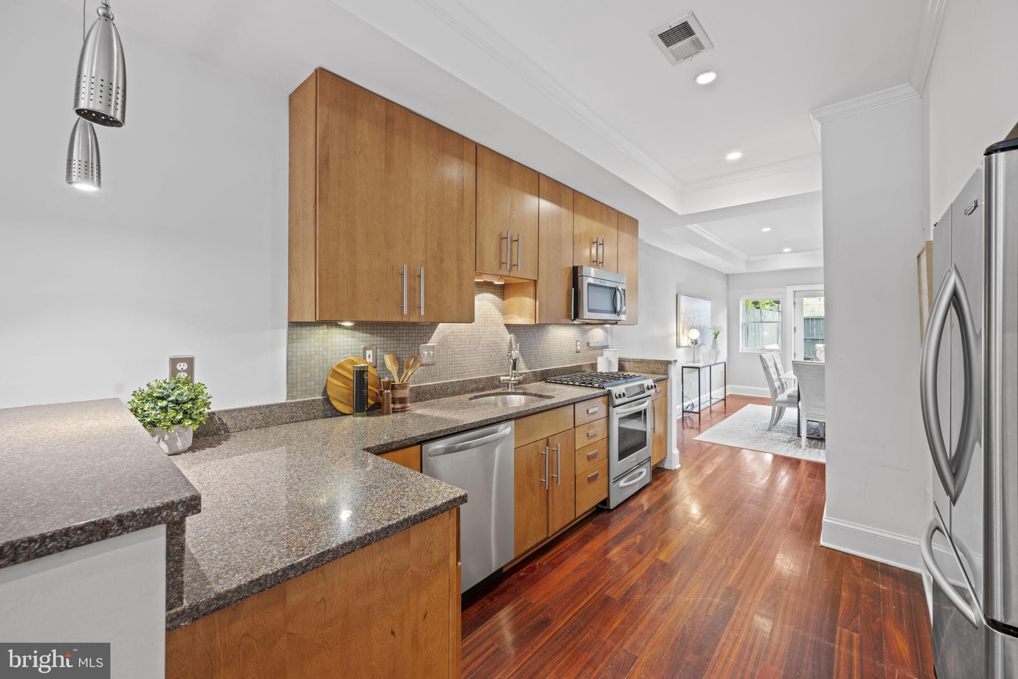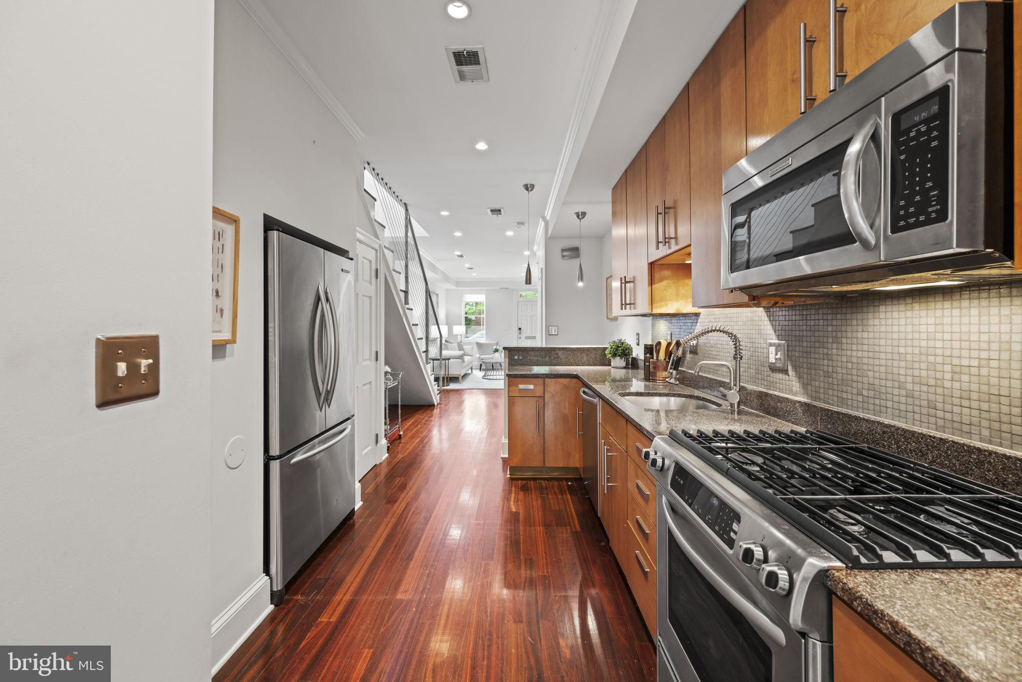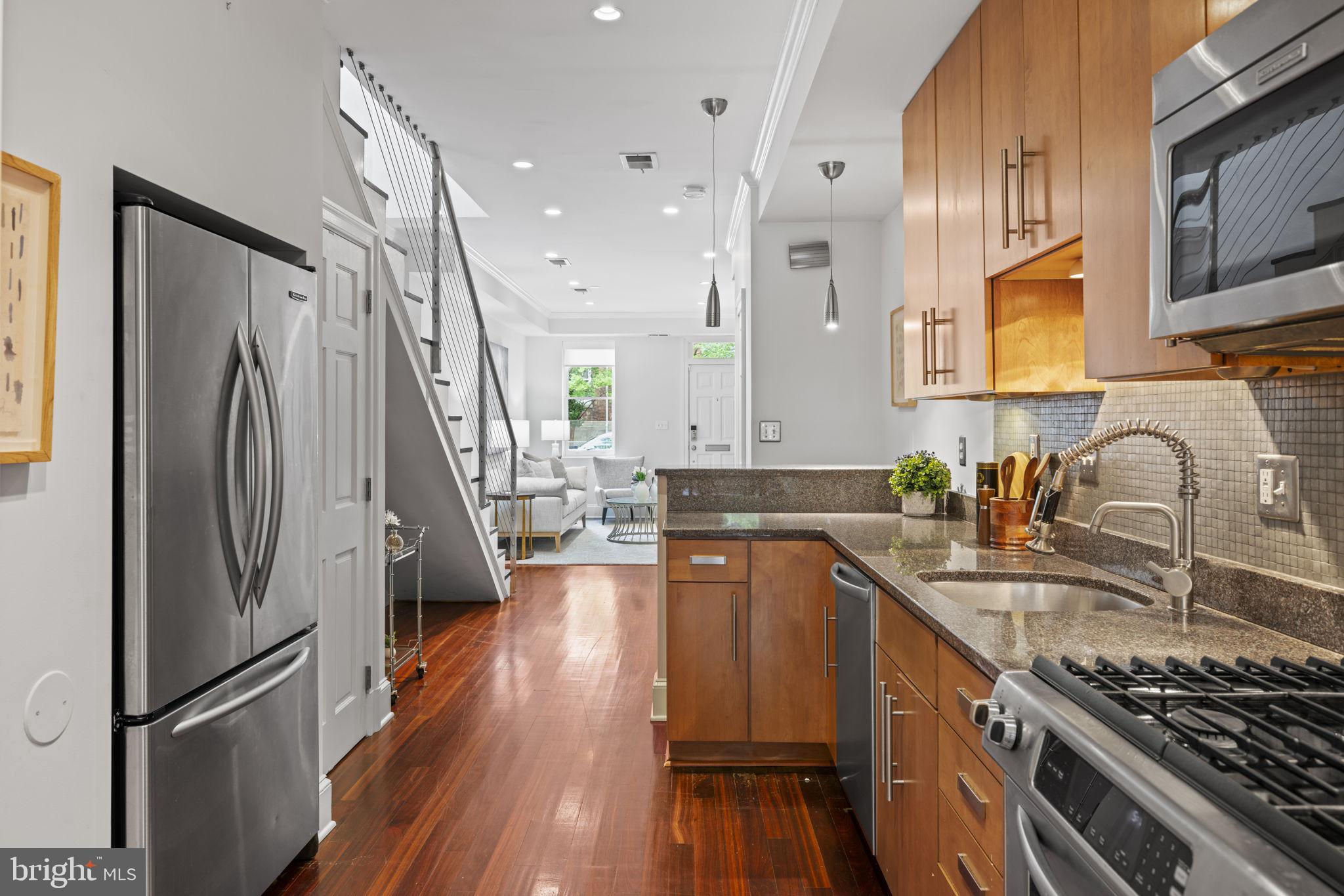 Originally built in 1880 and reconstructed to meticulous standards, this stunning two-bedroom, two-and-a-half-bathroom residence now boasts a contemporary 21st-century design behind a historic Federal facade from the turn of the century. Situated on an exceptionally deep lot spanning 99 feet, the property allows for an impressive open floor plan, lofty ceiling heights, and generously proportioned rooms. Its East/West orientation welcomes ample morning sunlight to the front of the home and lovely sunsets enjoyed from the rear garden and flagstone terrace. Among its notable features are a chef's kitchen with granite countertops and breakfast bar, stainless steel appliances including a gas range, and a dining area featuring an exposed brick accent wall. There is a convenient first-floor powder room, and a spacious family room/den with French doors opening to the rear garden, terrace, and private parking area. The second level comprises two expansive bedrooms and two full bathrooms, including the owner's suite which offers ample space for a king-sized bed, and an ensuite bath adorned with travertine marble tile and an oversized shower. The front bedroom is equally spacious, accentuated by a coffered ceiling with dual skylights. A new roof was installed in 2022, as well as a tankless hot water heater in 2023, and commercial-grade Carrier HVAC system in late 2020, both of which contribute to high efficiency and reduced energy consumption. With a front garden enclosed by a historic wrought iron fence and a newly landscaped garden, as well as a flagstone terrace and gated parking area at the rear, this home presents an attractive, private alternative to luxury condominium living. Positioned less than half a block from the METRO station, just two blocks from Whole Foods Market, and steps from the shops and restaurants along the vibrant U Street Corridor, this property offers a rare opportunity for refined urban living .