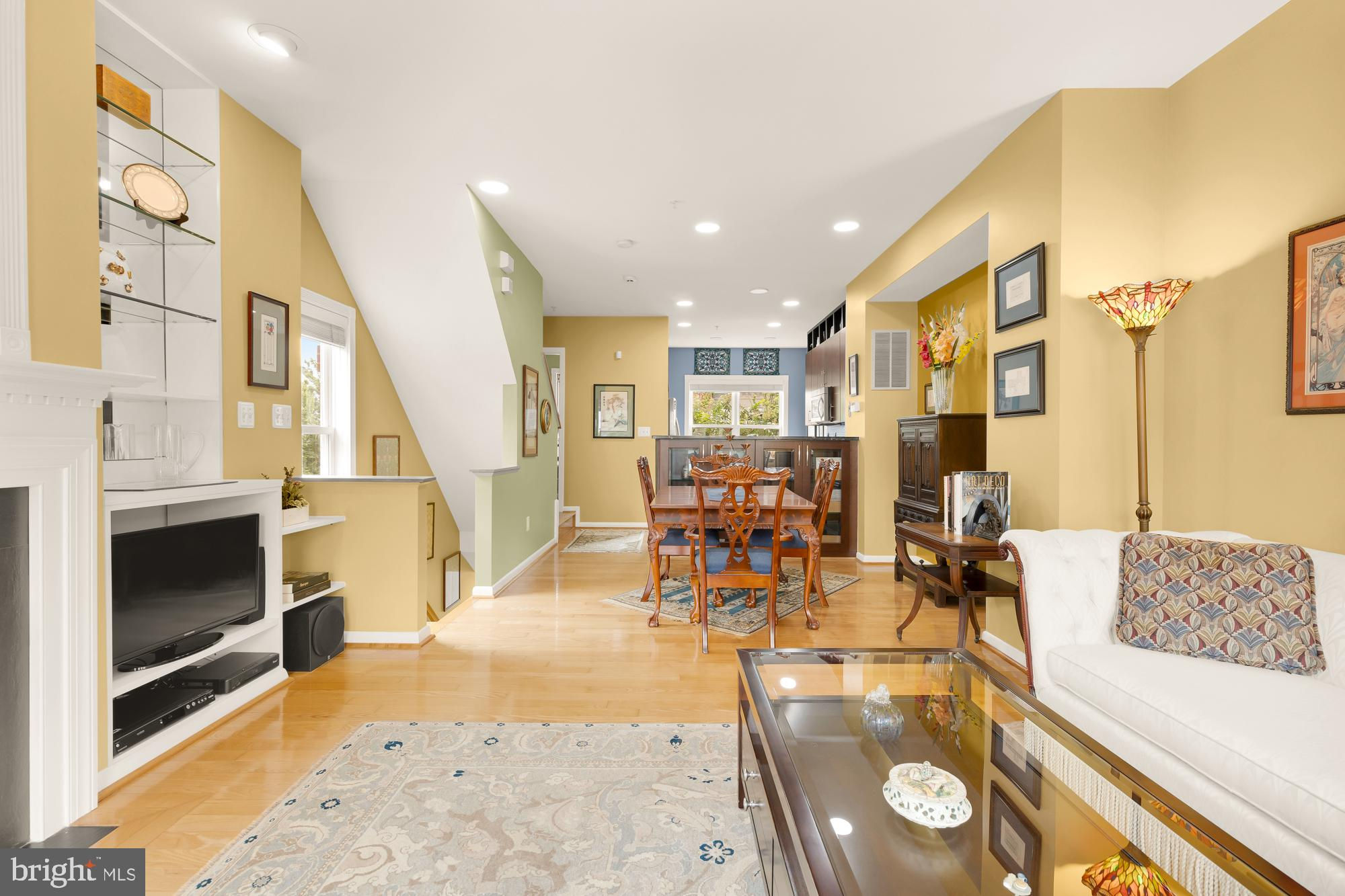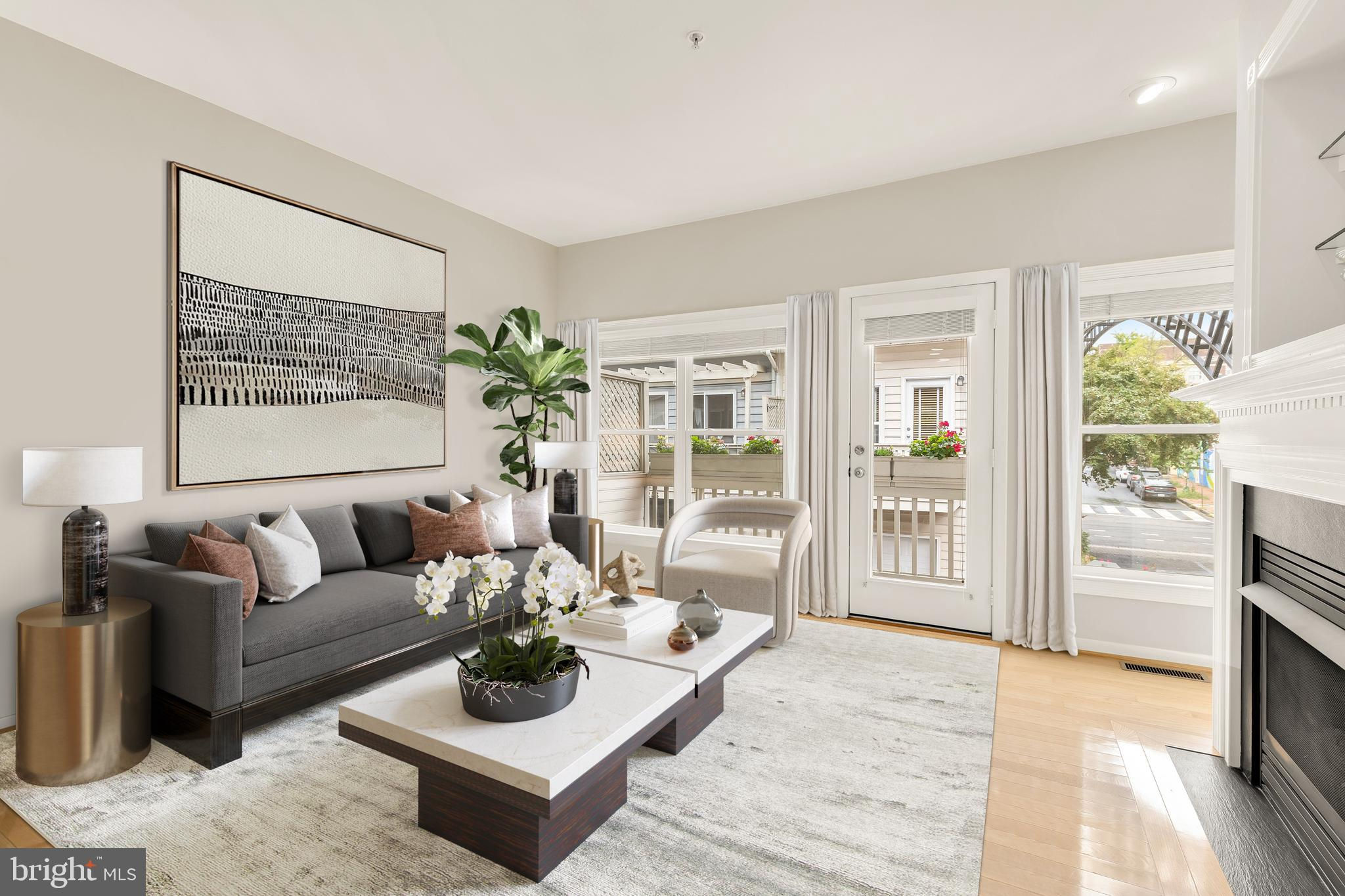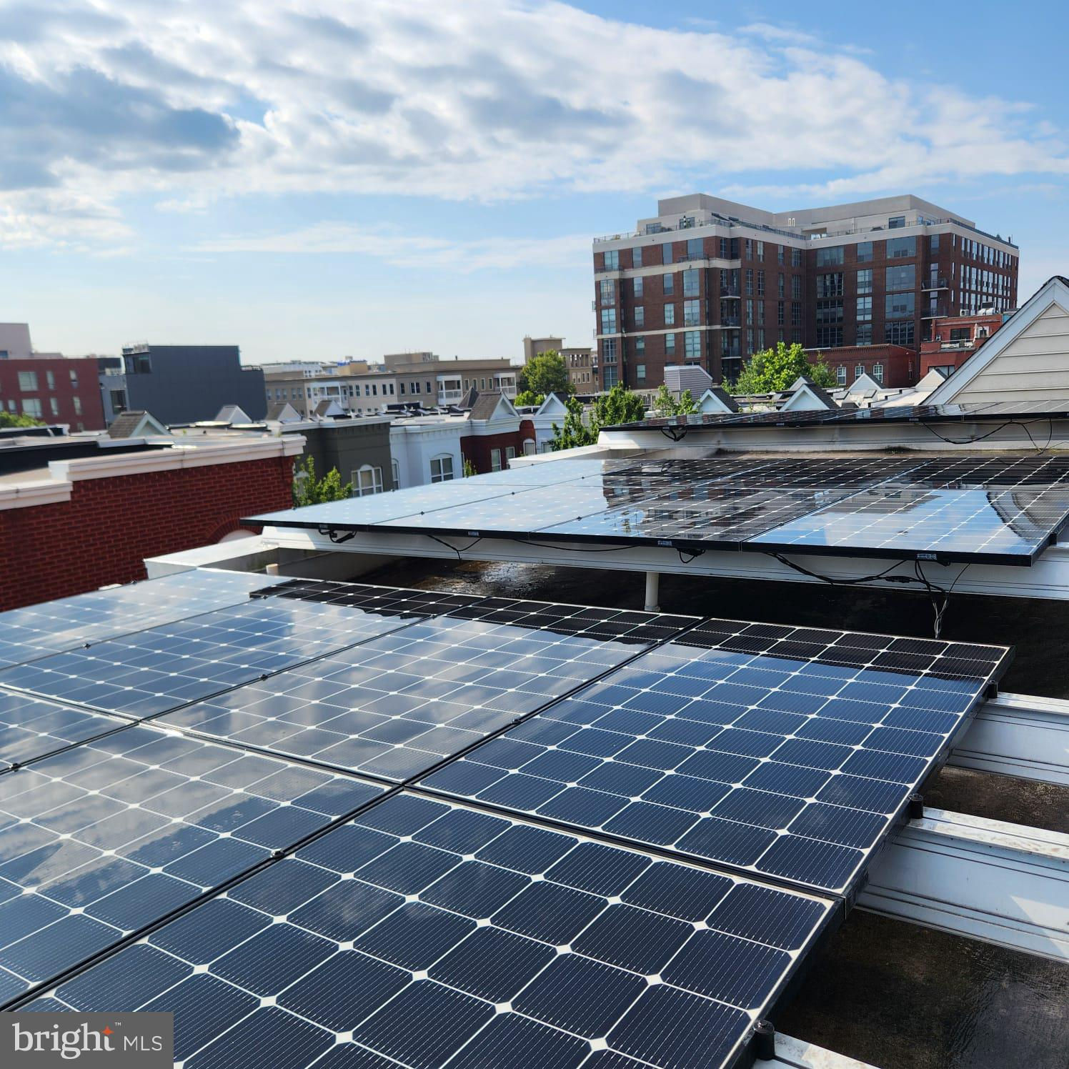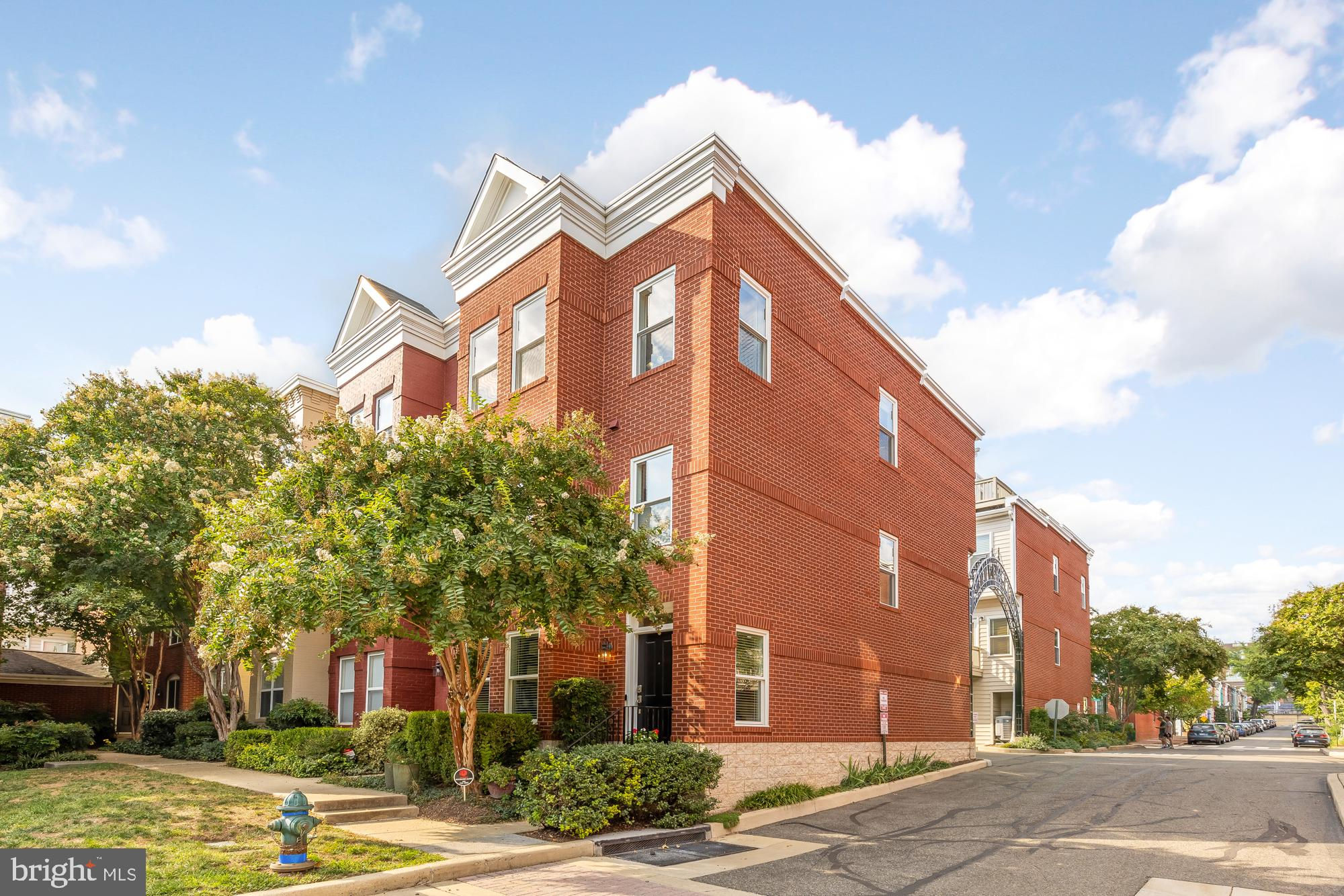 Discover your urban oasis in this rarely available three-story end-unit home, located within the coveted courtyard of Harrison Square. Built by EYA in 2001 and lovingly maintained by its original owner, this light-filled residence offers the spacious feel of a single-family home, with windows on three sides showcasing stunning views of the Washington Monument, city skyline and local murals. The main level offers seamless indoor and outdoor living with an open-concept design that features 9-foot ceilings, an eat-in kitchen, a formal dining area, and a cozy living room with a gas fireplace. Step outside to the private deck/balcony, ideal for entertaining or enjoying quiet moments. The upper level features two generously sized bedrooms, each with brand-new en-suite bathrooms. The primary suite, perched above the treetops, serves as a serene retreat within the heart of the community. Head down to the first floor entry level, which includes a versatile den or home office overlooking the courtyard, easily convertible into a third bedroom. This home is adorned with high-end finishes, including rare ash hardwood floors, porcelain tile, and energy-efficient Marvin fiberglass double-hung windows. The property is equipped with a 20-panel, 6.7kw solar system and battery backup, delivering significant energy savings and additional income through solar renewable energy credits (SRECs). The entry-level office/den features radiant heated flooring and provides access to a one-car garage complete with built-in cabinetry and ample storage. Experience unmatched convenience with off-street guest parking and a low HOA fee that covers landscaping, trash, and snow removal. Ideally located just two blocks from the U Street Metro (Green/Yellow lines), you'll have immediate access to vibrant nightlife, Whole Foods, Trader Joe's, theaters, gyms, the 14th Street Corridor and all the city has to offer. This exceptional home truly combines urban living with comfort and style.