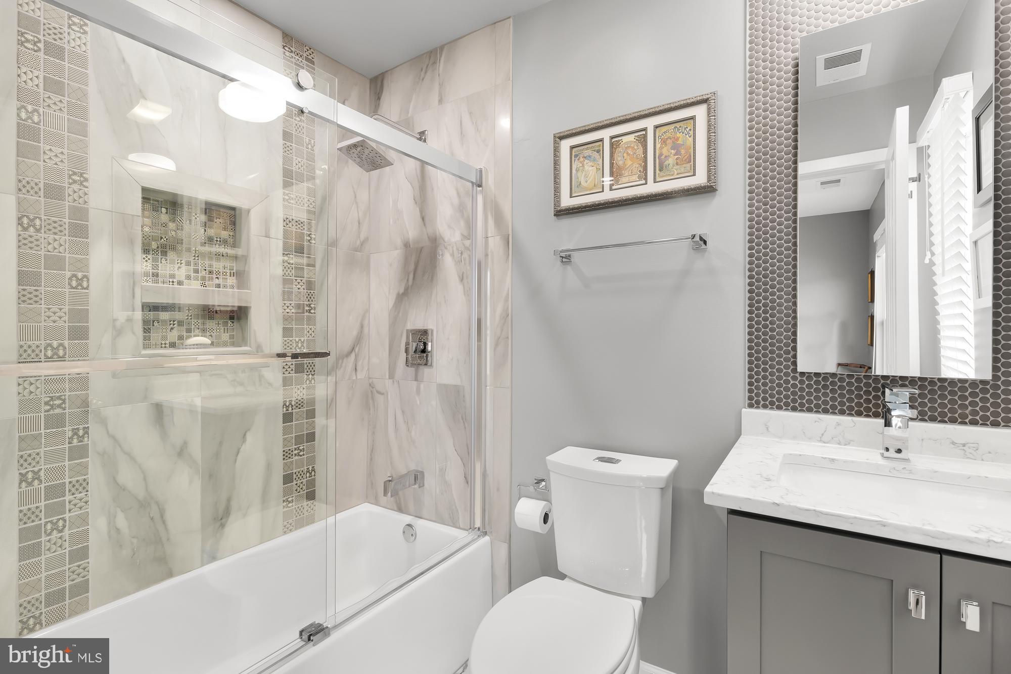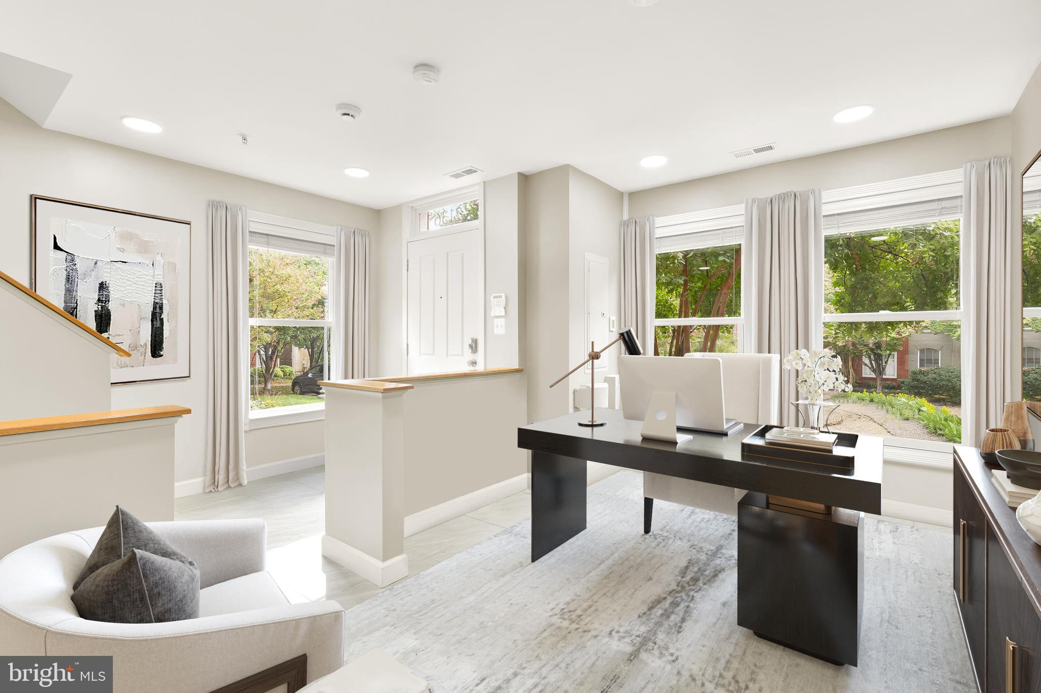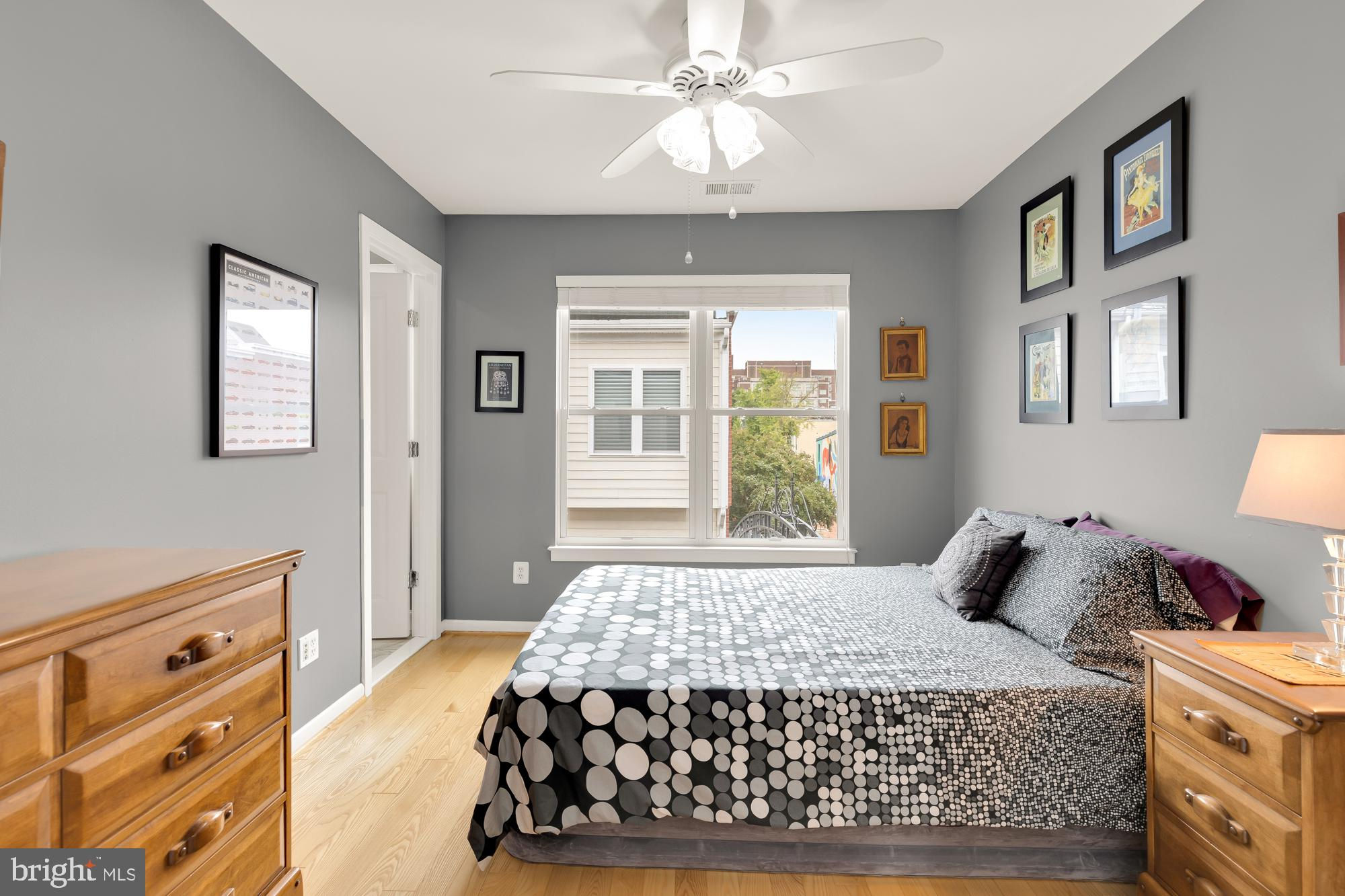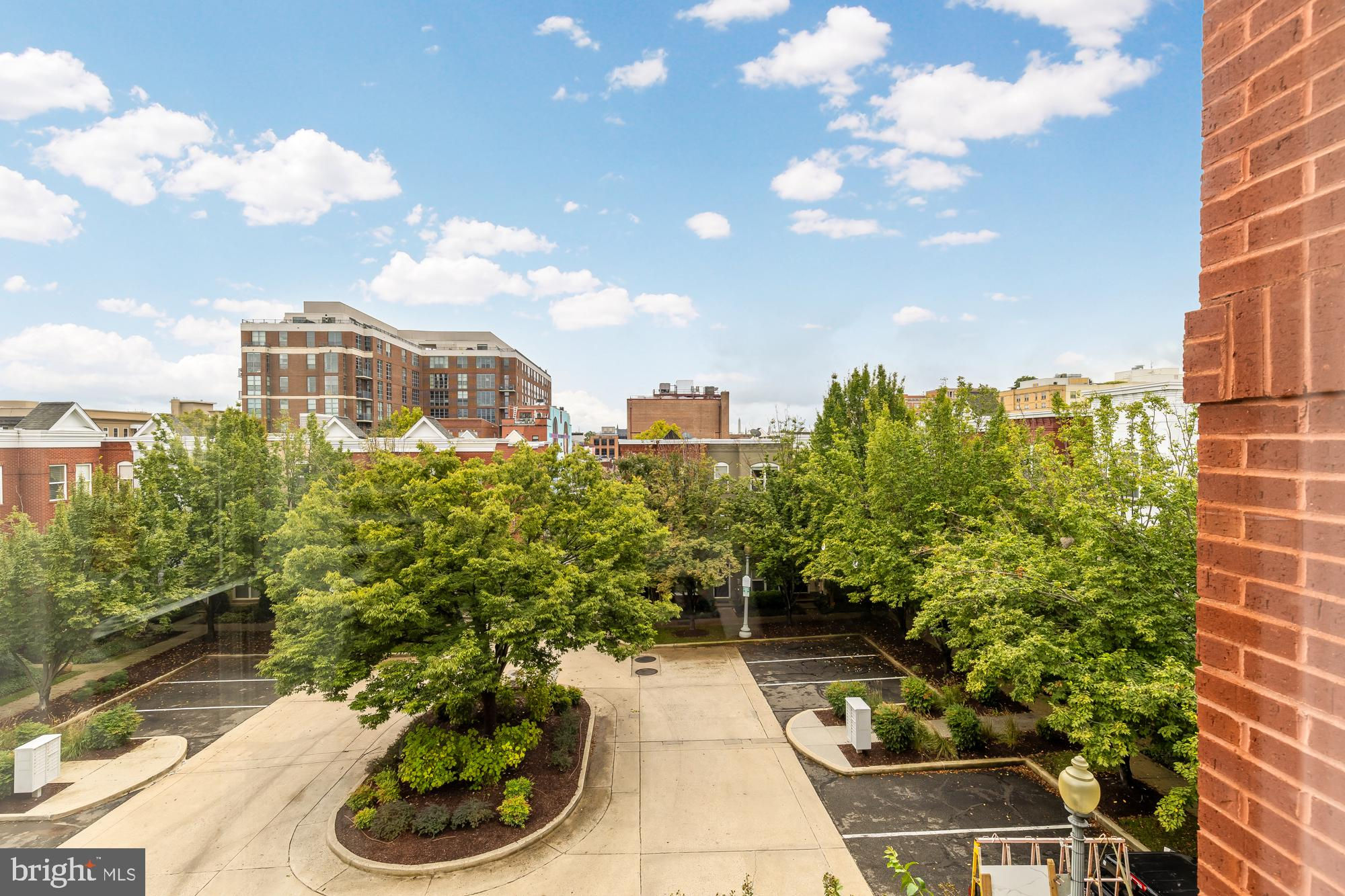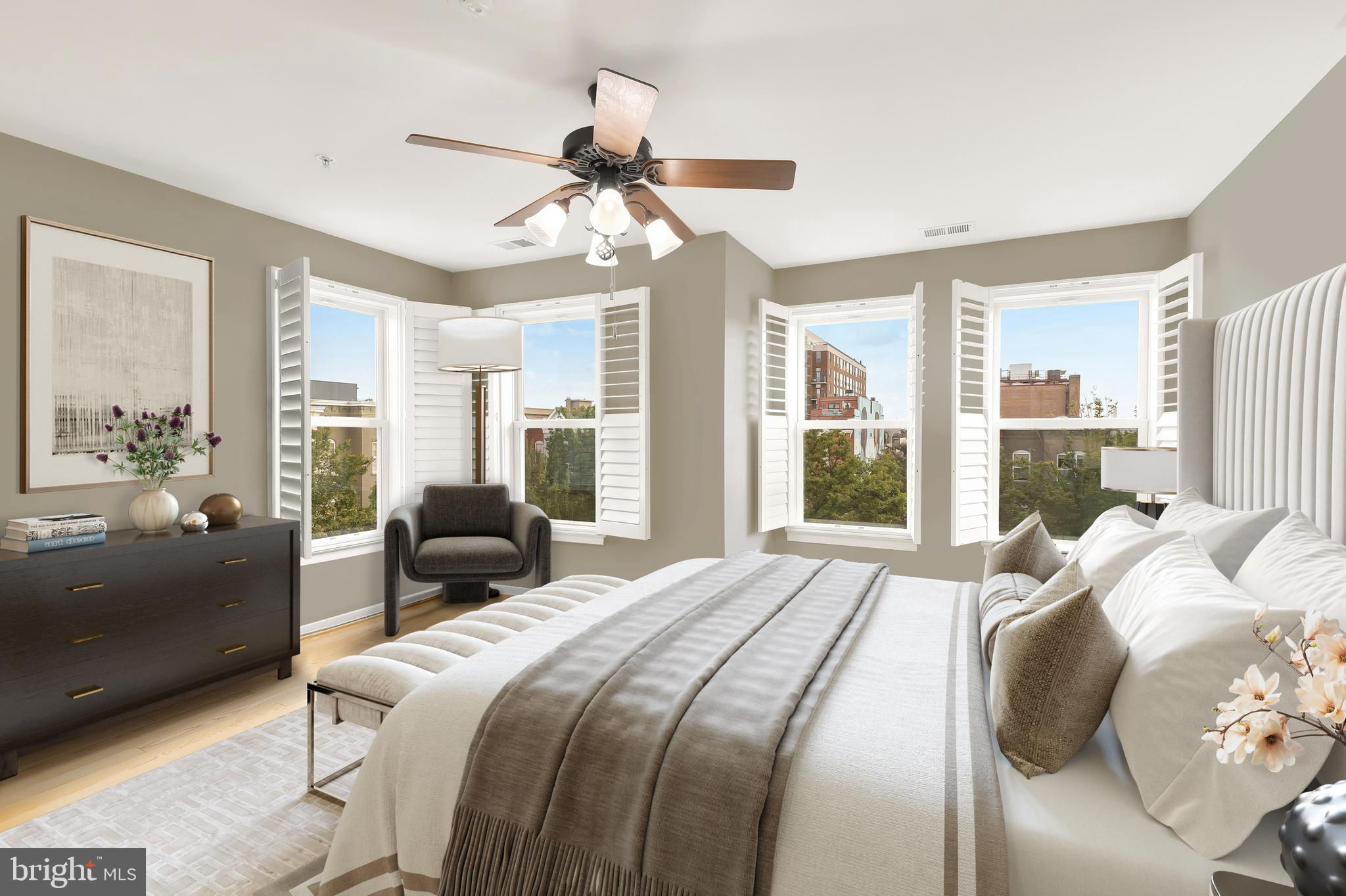 Discover your urban oasis in this rarely available three-story end-unit home, located within the coveted courtyard of Harrison Square. Built by EYA in 2001 and lovingly maintained by its original owner, this light-filled residence offers the spacious feel of a single-family home, with windows on three sides showcasing stunning views of the Washington Monument, city skyline and local murals. The main level offers seamless indoor and outdoor living with an open-concept design that features 9-foot ceilings, an eat-in kitchen, a formal dining area, and a cozy living room with a gas fireplace. Step outside to the private deck/balcony, ideal for entertaining or enjoying quiet moments. The upper level features two generously sized bedrooms, each with brand-new en-suite bathrooms. The primary suite, perched above the treetops, serves as a serene retreat within the heart of the community. Head down to the first floor entry level, which includes a versatile den or home office overlooking the courtyard, easily convertible into a third bedroom. This home is adorned with high-end finishes, including rare ash hardwood floors, porcelain tile, and energy-efficient Marvin fiberglass double-hung windows. The property is equipped with a 20-panel, 6.7kw solar system and battery backup, delivering significant energy savings and additional income through solar renewable energy credits (SRECs). The entry-level office/den features radiant heated flooring and provides access to a one-car garage complete with built-in cabinetry and ample storage. Experience unmatched convenience with off-street guest parking and a low HOA fee that covers landscaping, trash, and snow removal. Ideally located just two blocks from the U Street Metro (Green/Yellow lines), you'll have immediate access to vibrant nightlife, Whole Foods, Trader Joe's, theaters, gyms, the 14th Street Corridor and all the city has to offer. This exceptional home truly combines urban living with comfort and style.