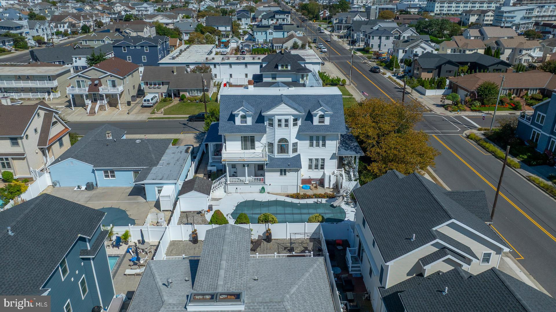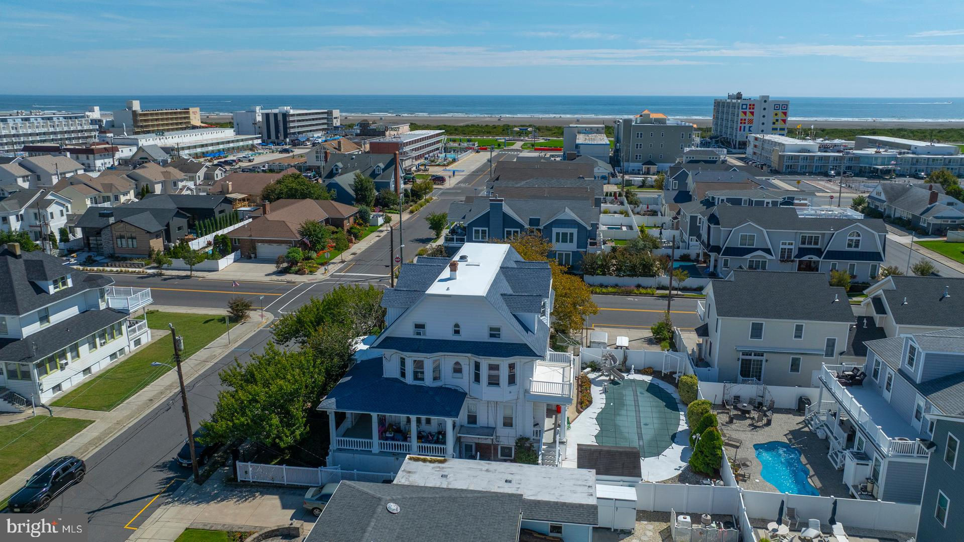 Welcome to 216 E Fern Road, a grand three-story single-family residence situated on a spacious 100' × 100' corner lot just two blocks from the beach and boardwalk. This unparalleled Wildwood Crest location is paired with an impressive 4,404 square feet of living space, featuring 10 bedrooms and 2.5 bathrooms — exceptional for large families, summer retreats, or vacation gatherings. From the moment you arrive, its timeless wraparound concrete porch framed by stately white pillars sets a tone of character and charm. A fully fenced-in lot provides privacy, while the in-ground pool, four-car driveway parking, gas fireplace, and laundry room enhance lifestyle, comfort, and convenience. A full basement and shed add flexibility for your storage needs, while recent upgrades such as a new roof just two years ago provide peace of mind for years to come. Beyond its immediate livability, this property also holds significant investment and development appeal. The combination of its rare lot size, prime location, and enduring architectural style makes it an ideal choice for those seeking a restoration project, a luxury update, or new development opportunities in one of Wildwood Crest’s most desirable neighborhoods. 216 E Fern Road is more than a home — it’s a landmark property, blending coastal living today with exciting possibilities for the future. Seize this rare chance to own a standout property in Wildwood Crest — don’t miss out, schedule your tour today!
