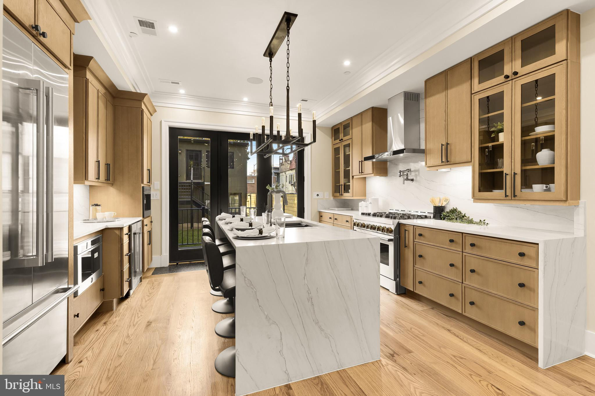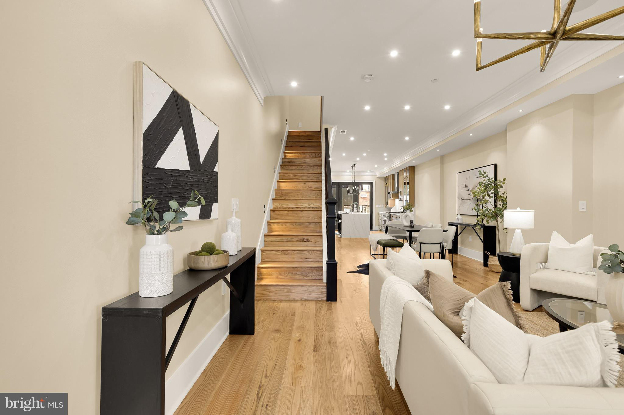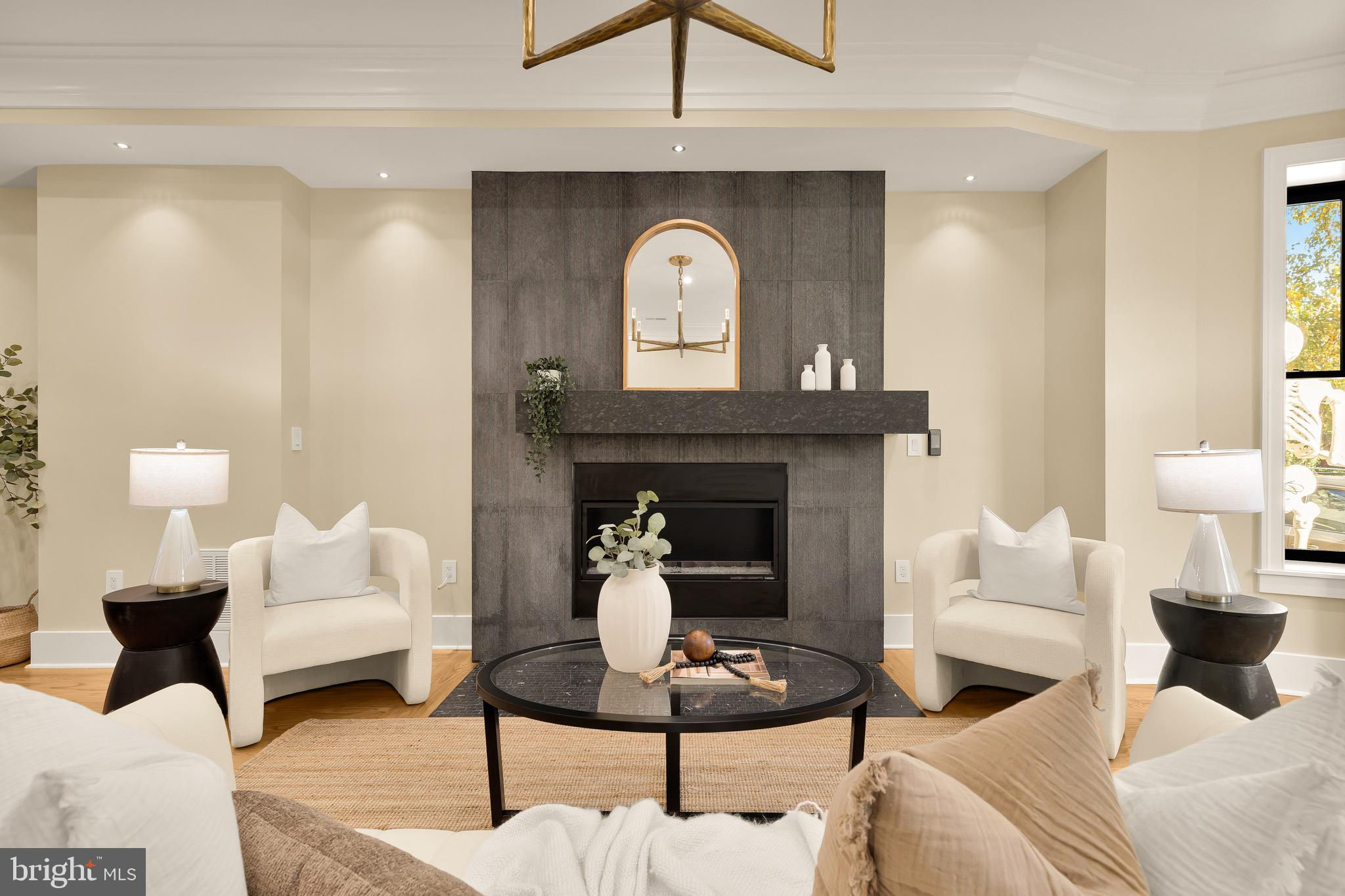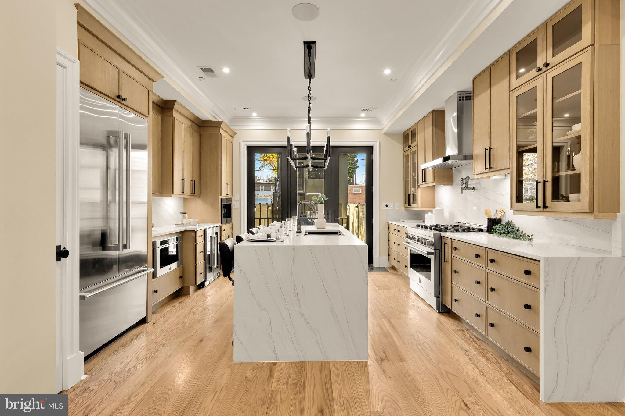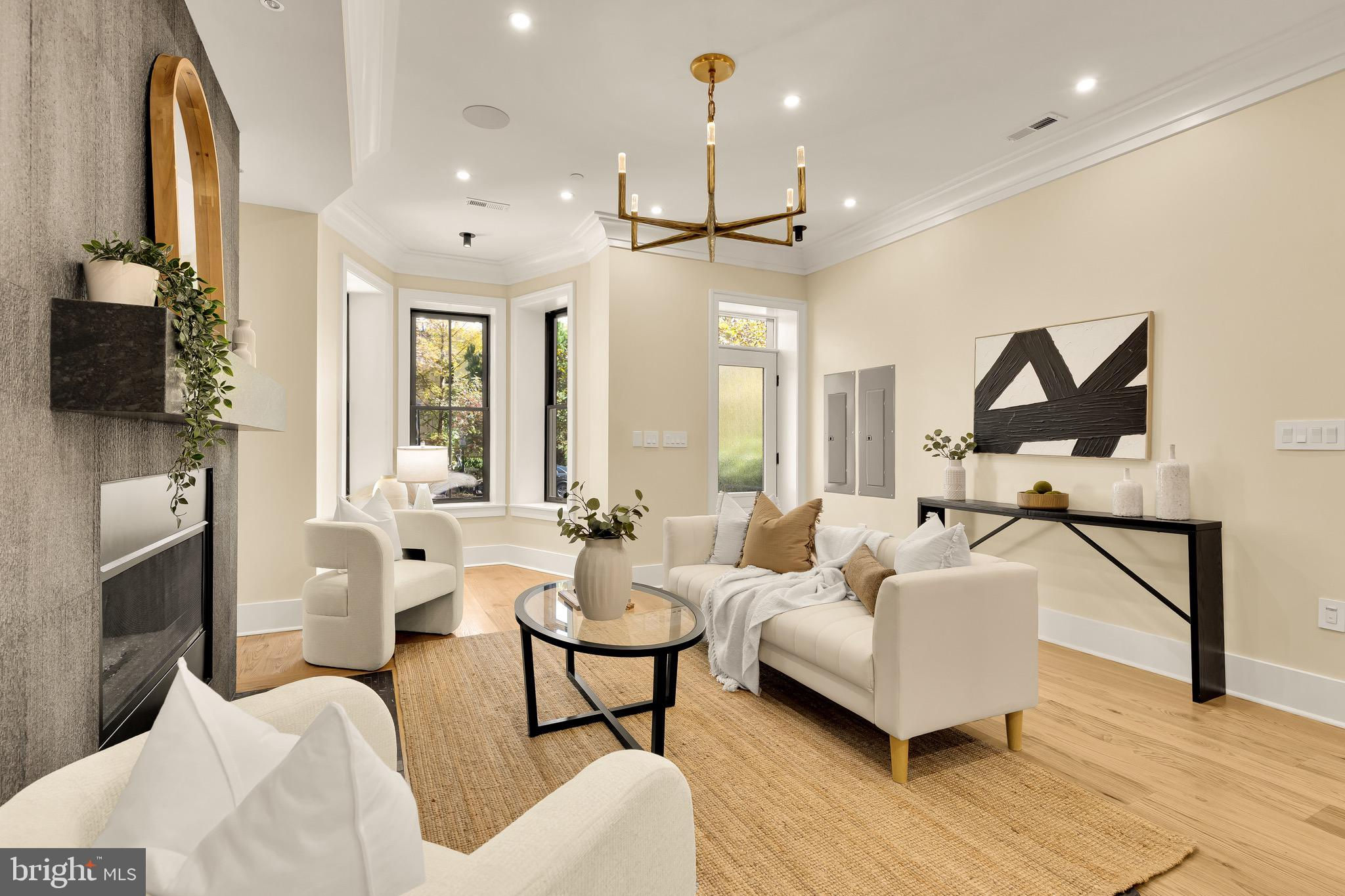 On a tree-lined block by Lincoln Park, this classic Capitol Hill row home has been fully reimagined by Kittrell Homes—marrying historic architecture with modern comfort across 2,845 SF, 4 bedrooms, 3 full baths, 2 half baths, and garage parking. Thoughtful finishes and systems upgrades include 7-inch oak floors, Restoration Hardware lighting, Farrow & Ball paint/wallcoverings, whole-home audio, and smart controls for everyday ease. The main level flows from a bay-front living room with gas fireplace to open dining and a chef’s kitchen with quartz counters, waterfall island with bar seating, workstation sink, LED-lit cabinetry, and a JennAir suite. Steel-framed glass doors extend the living space onto the rear deck. Upstairs, the second floor offers two bedrooms, each with an en-suite bath, plus hall storage and laundry. The top-level primary suite is a private retreat with walk-in closet, en-suite bath, wet bar with wine fridge, gas fireplace, and a private balcony—a rare perch above the treetops. In total, all bedrooms feature en-suite baths for uncompromised privacy. Out back, the carriage house above the detached garage adds true flexibility: a climate-controlled bay with EV-ready wiring and a 300 SF finished loft with kitchenette (microwave + wine fridge) and a half bath plumbed for a full bath—ideal for an office, studio, gym, or guest overflow. Behind the scenes: three 2025 HVAC units (three zones), a 75-gallon hot water heater, smart thermostats, and exterior security cameras—delivering efficiency and peace of mind in an A+ location moments to Eastern Market and Metro.