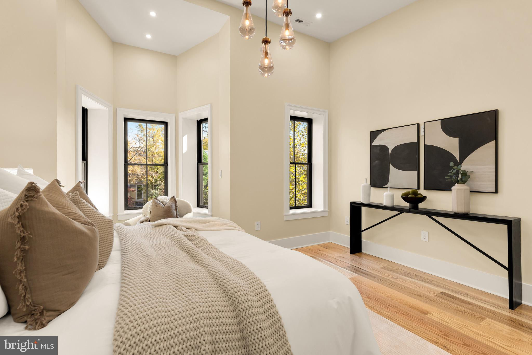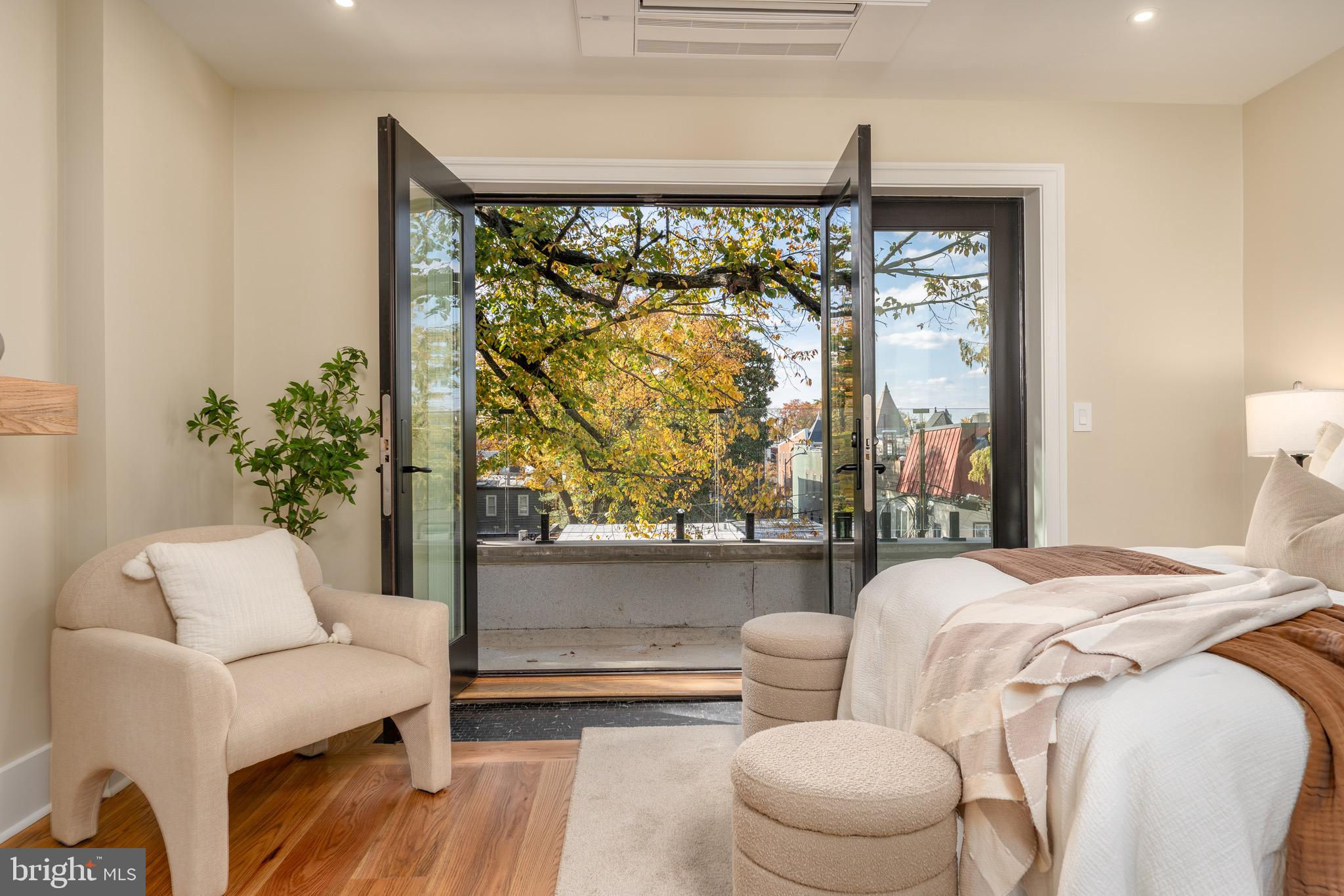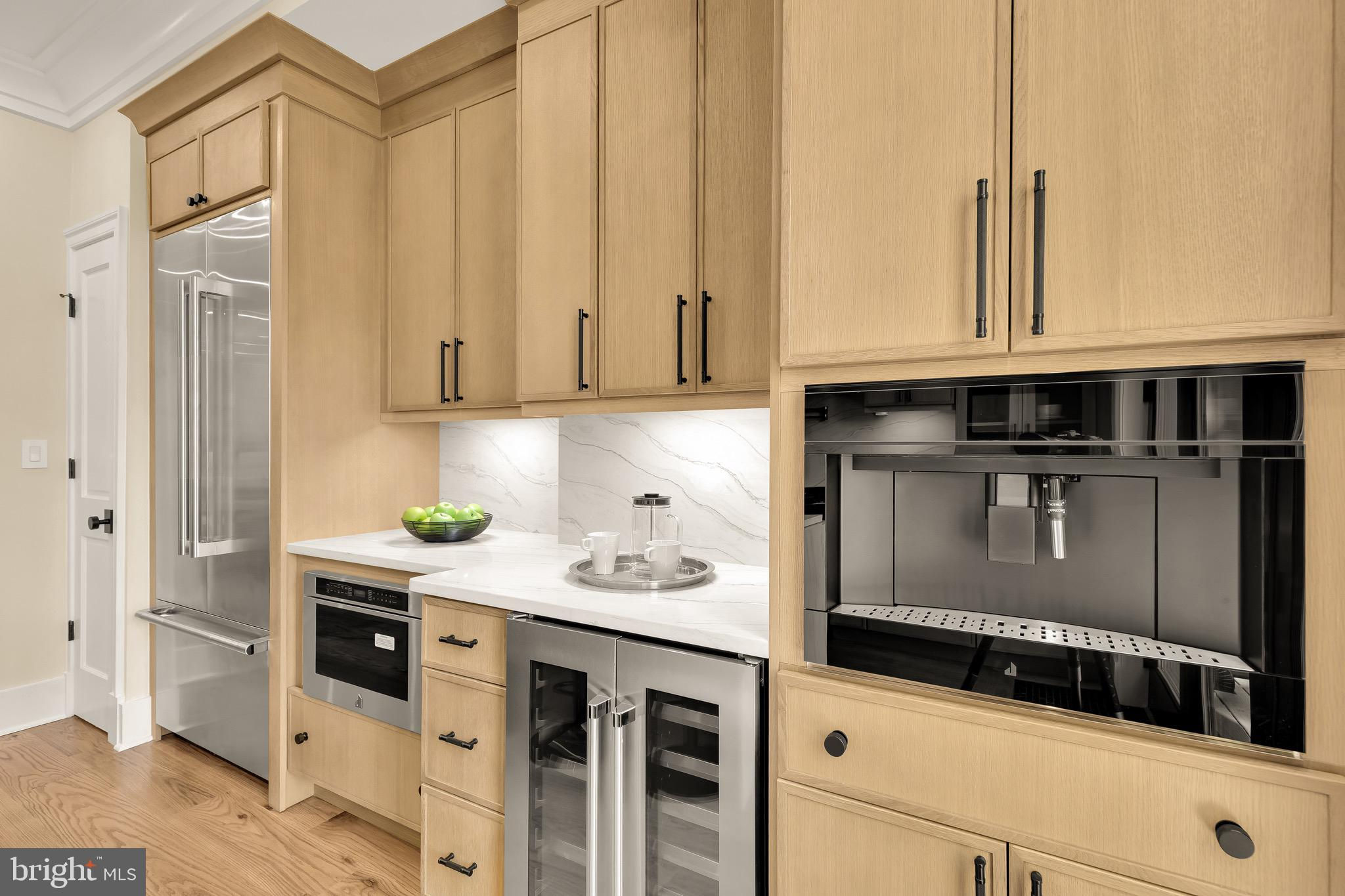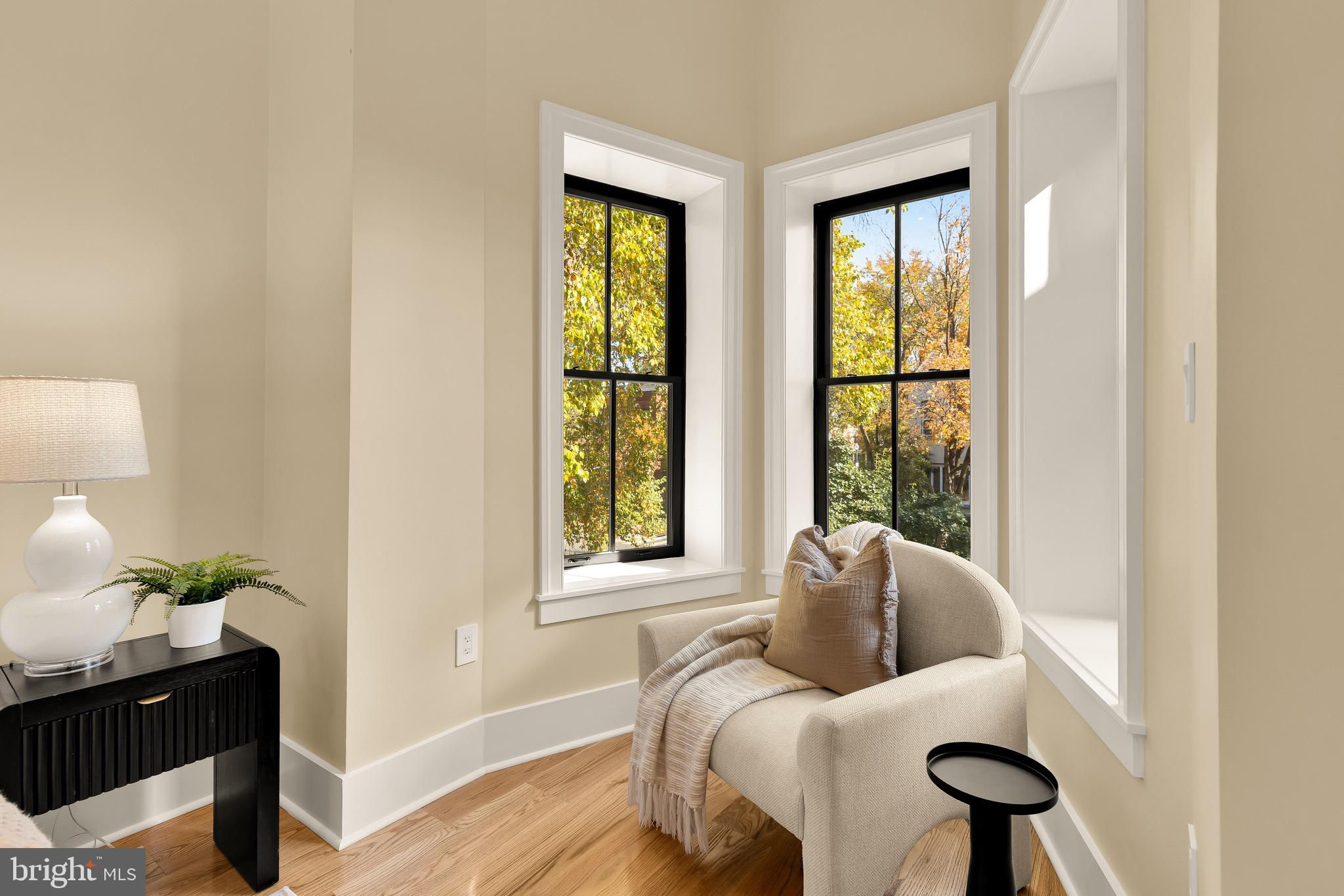 On a tree-lined block by Lincoln Park, this classic Capitol Hill row home has been fully reimagined by Kittrell Homes—marrying historic architecture with modern comfort across 2,845 SF, 4 bedrooms, 3 full baths, 2 half baths, and garage parking. Thoughtful finishes and systems upgrades include 7-inch oak floors, Restoration Hardware lighting, Farrow & Ball paint/wallcoverings, whole-home audio, and smart controls for everyday ease. The main level flows from a bay-front living room with gas fireplace to open dining and a chef’s kitchen with quartz counters, waterfall island with bar seating, workstation sink, LED-lit cabinetry, and a JennAir suite. Steel-framed glass doors extend the living space onto the rear deck. Upstairs, the second floor offers two bedrooms, each with an en-suite bath, plus hall storage and laundry. The top-level primary suite is a private retreat with walk-in closet, en-suite bath, wet bar with wine fridge, gas fireplace, and a private balcony—a rare perch above the treetops. In total, all bedrooms feature en-suite baths for uncompromised privacy. Out back, the carriage house above the detached garage adds true flexibility: a climate-controlled bay with EV-ready wiring and a 300 SF finished loft with kitchenette (microwave + wine fridge) and a half bath plumbed for a full bath—ideal for an office, studio, gym, or guest overflow. Behind the scenes: three 2025 HVAC units (three zones), a 75-gallon hot water heater, smart thermostats, and exterior security cameras—delivering efficiency and peace of mind in an A+ location moments to Eastern Market and Metro.