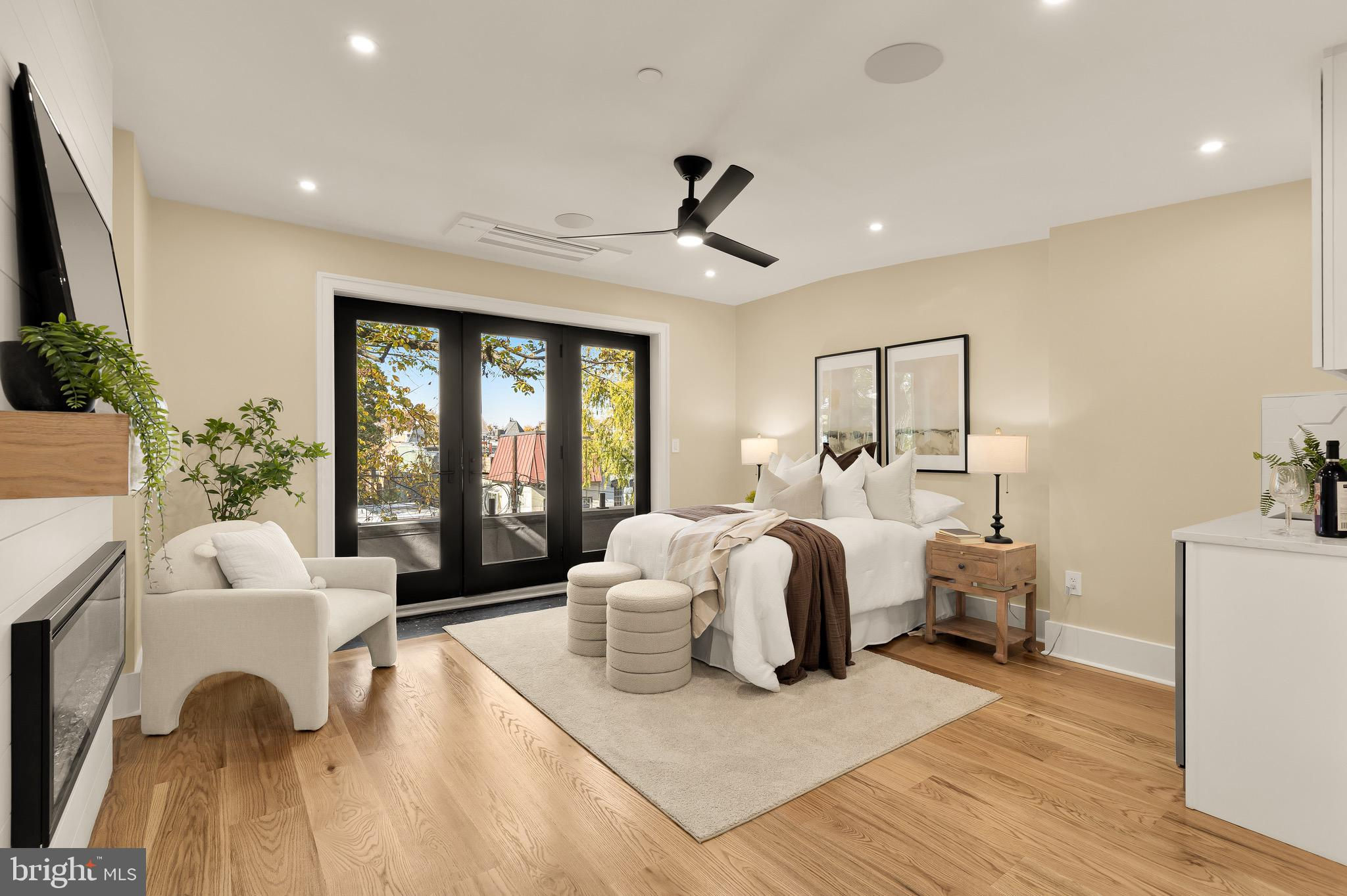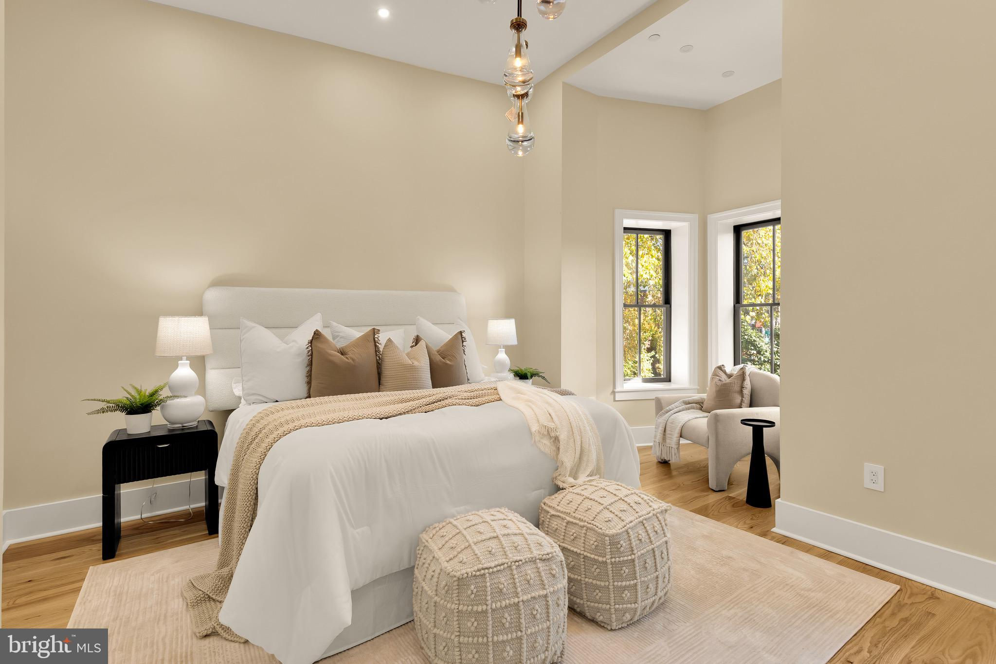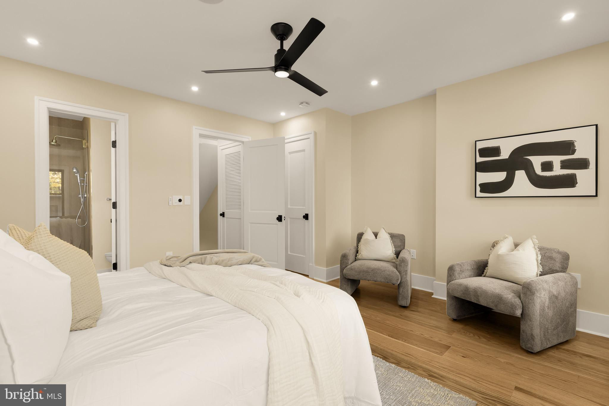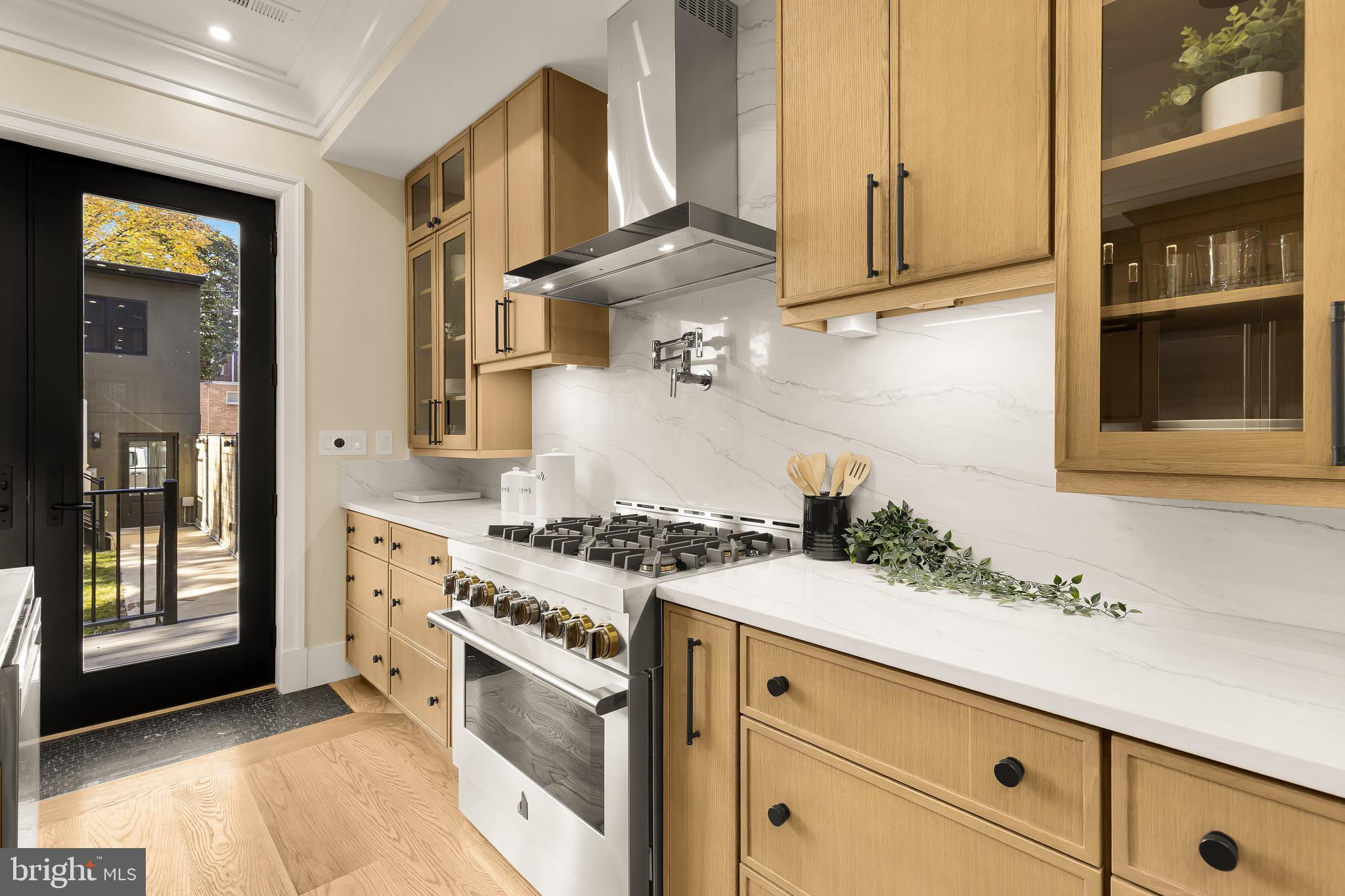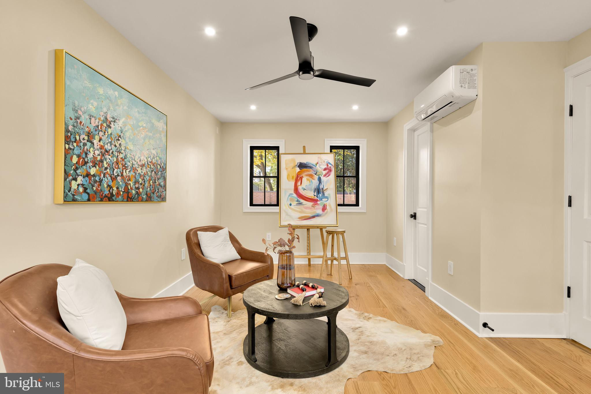 On a tree-lined block by Lincoln Park, this classic Capitol Hill row home has been fully reimagined by Kittrell Homes—marrying historic architecture with modern comfort across 2,845 SF, 4 bedrooms, 3 full baths, 2 half baths, and garage parking. Thoughtful finishes and systems upgrades include 7-inch oak floors, Restoration Hardware lighting, Farrow & Ball paint/wallcoverings, whole-home audio, and smart controls for everyday ease. The main level flows from a bay-front living room with gas fireplace to open dining and a chef’s kitchen with quartz counters, waterfall island with bar seating, workstation sink, LED-lit cabinetry, and a JennAir suite. Steel-framed glass doors extend the living space onto the rear deck. Upstairs, the second floor offers two bedrooms, each with an en-suite bath, plus hall storage and laundry. The top-level primary suite is a private retreat with walk-in closet, en-suite bath, wet bar with wine fridge, gas fireplace, and a private balcony—a rare perch above the treetops. In total, all bedrooms feature en-suite baths for uncompromised privacy. Out back, the carriage house above the detached garage adds true flexibility: a climate-controlled bay with EV-ready wiring and a 300 SF finished loft with kitchenette (microwave + wine fridge) and a half bath plumbed for a full bath—ideal for an office, studio, gym, or guest overflow. Behind the scenes: three 2025 HVAC units (three zones), a 75-gallon hot water heater, smart thermostats, and exterior security cameras—delivering efficiency and peace of mind in an A+ location moments to Eastern Market and Metro.