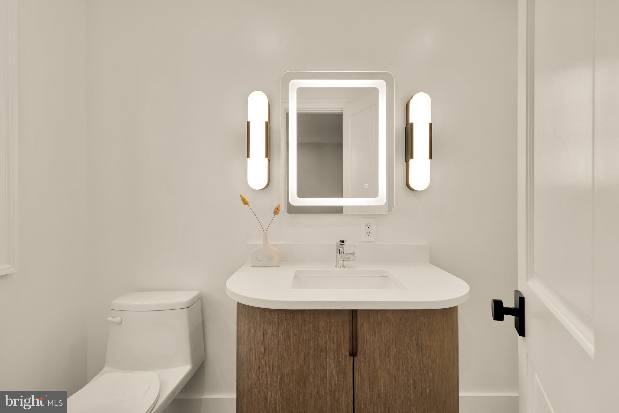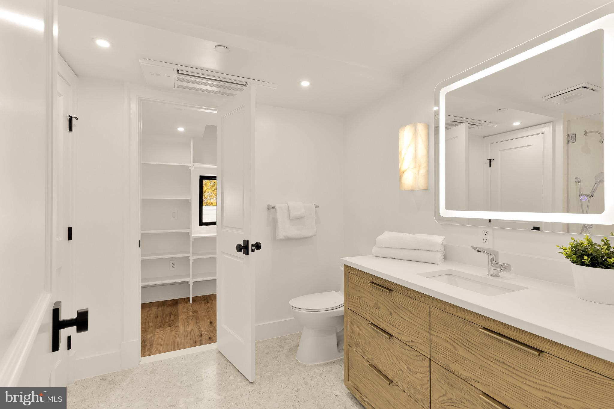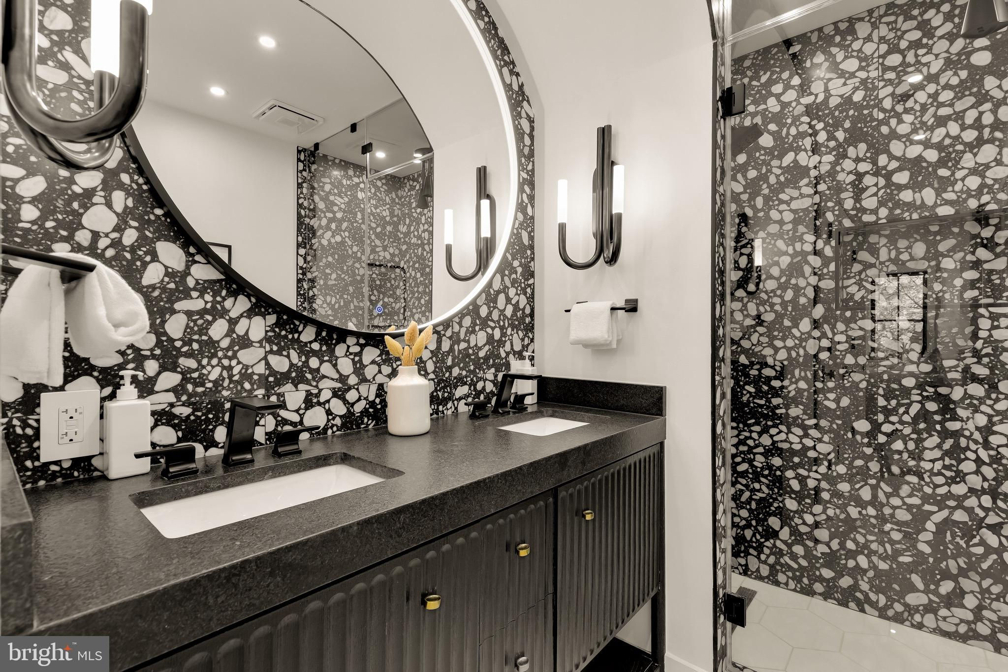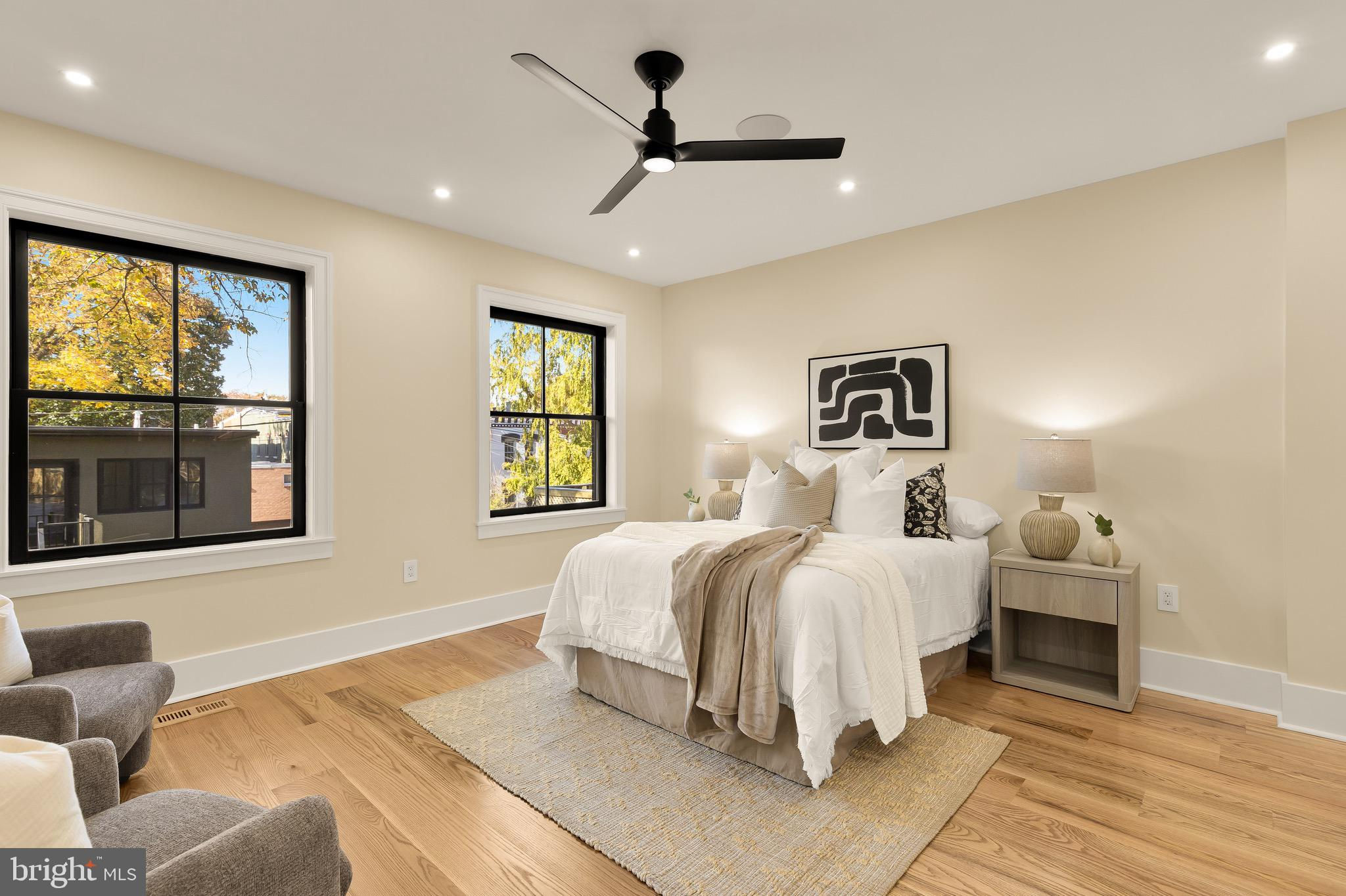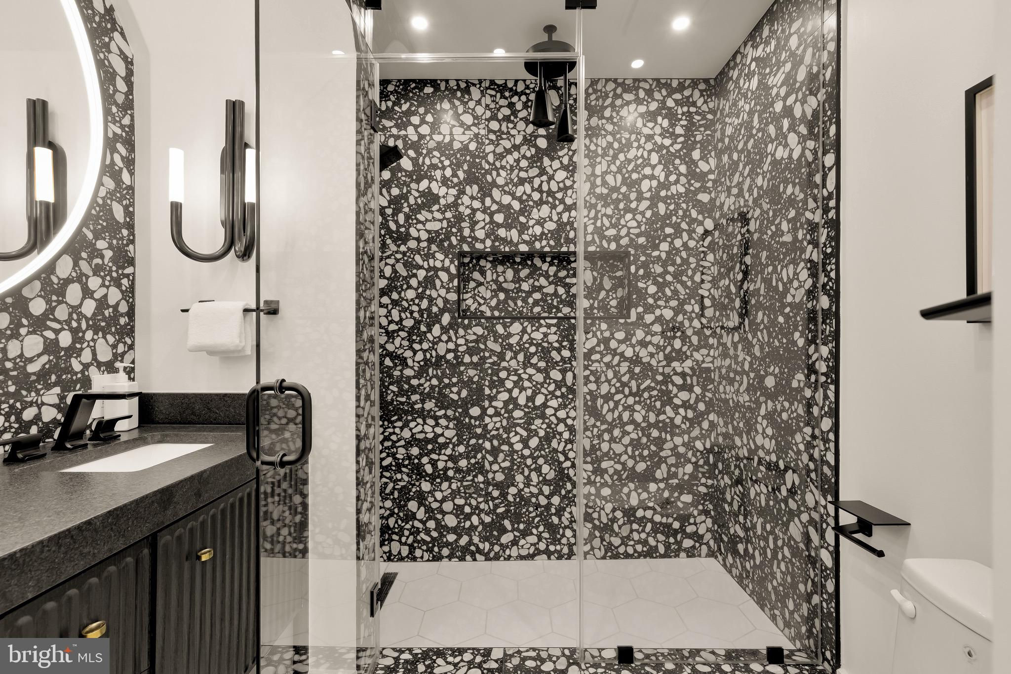On a tree-lined block by Lincoln Park, this classic Capitol Hill row home has been fully reimagined by Kittrell Homes—marrying historic architecture with modern comfort across 2,845 SF, 4 bedrooms, 3 full baths, 2 half baths, and garage parking. Thoughtful finishes and systems upgrades include 7-inch oak floors, Restoration Hardware lighting, Farrow & Ball paint/wallcoverings, whole-home audio, and smart controls for everyday ease. The main level flows from a bay-front living room with gas fireplace to open dining and a chef’s kitchen with quartz counters, waterfall island with bar seating, workstation sink, LED-lit cabinetry, and a JennAir suite. Steel-framed glass doors extend the living space onto the rear deck. Upstairs, the second floor offers two bedrooms, each with an en-suite bath, plus hall storage and laundry. The top-level primary suite is a private retreat with walk-in closet, en-suite bath, wet bar with wine fridge, gas fireplace, and a private balcony—a rare perch above the treetops. In total, all bedrooms feature en-suite baths for uncompromised privacy. Out back, the carriage house above the detached garage adds true flexibility: a climate-controlled bay with EV-ready wiring and a 300 SF finished loft with kitchenette (microwave + wine fridge) and a half bath plumbed for a full bath—ideal for an office, studio, gym, or guest overflow. Behind the scenes: three 2025 HVAC units (three zones), a 75-gallon hot water heater, smart thermostats, and exterior security cameras—delivering efficiency and peace of mind in an A+ location moments to Eastern Market and Metro.