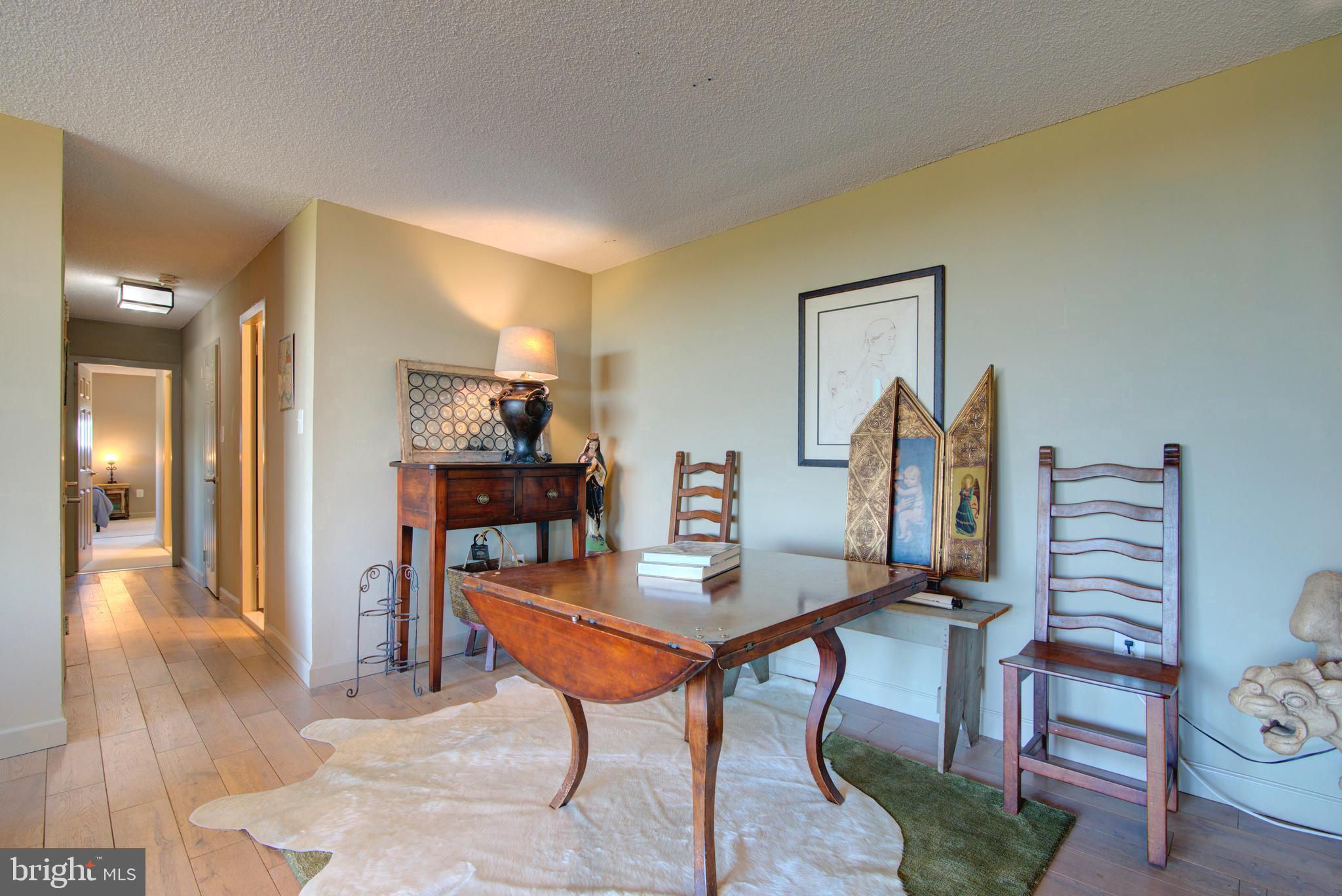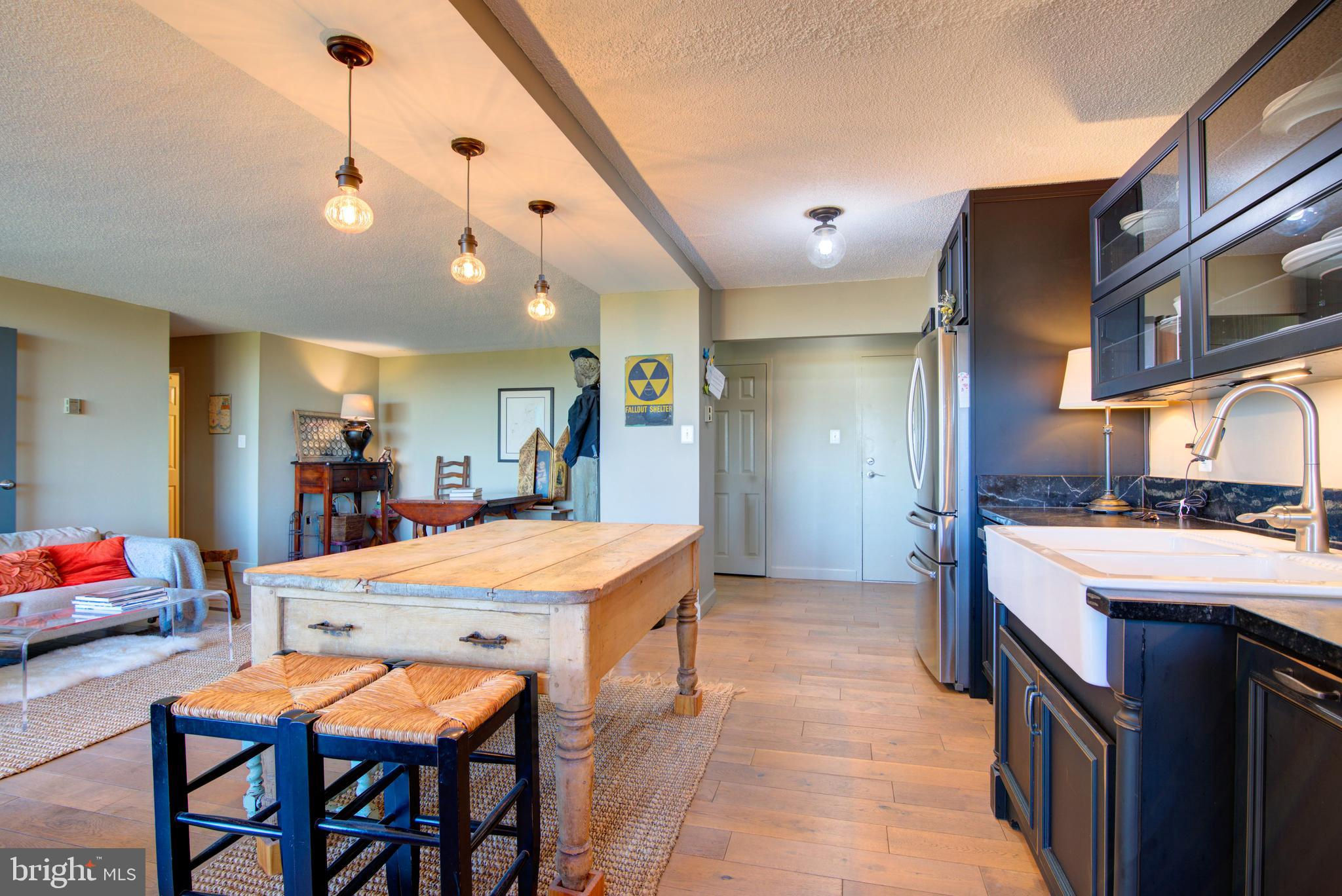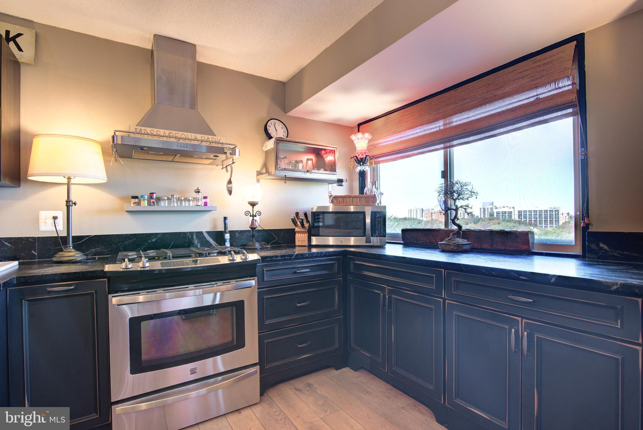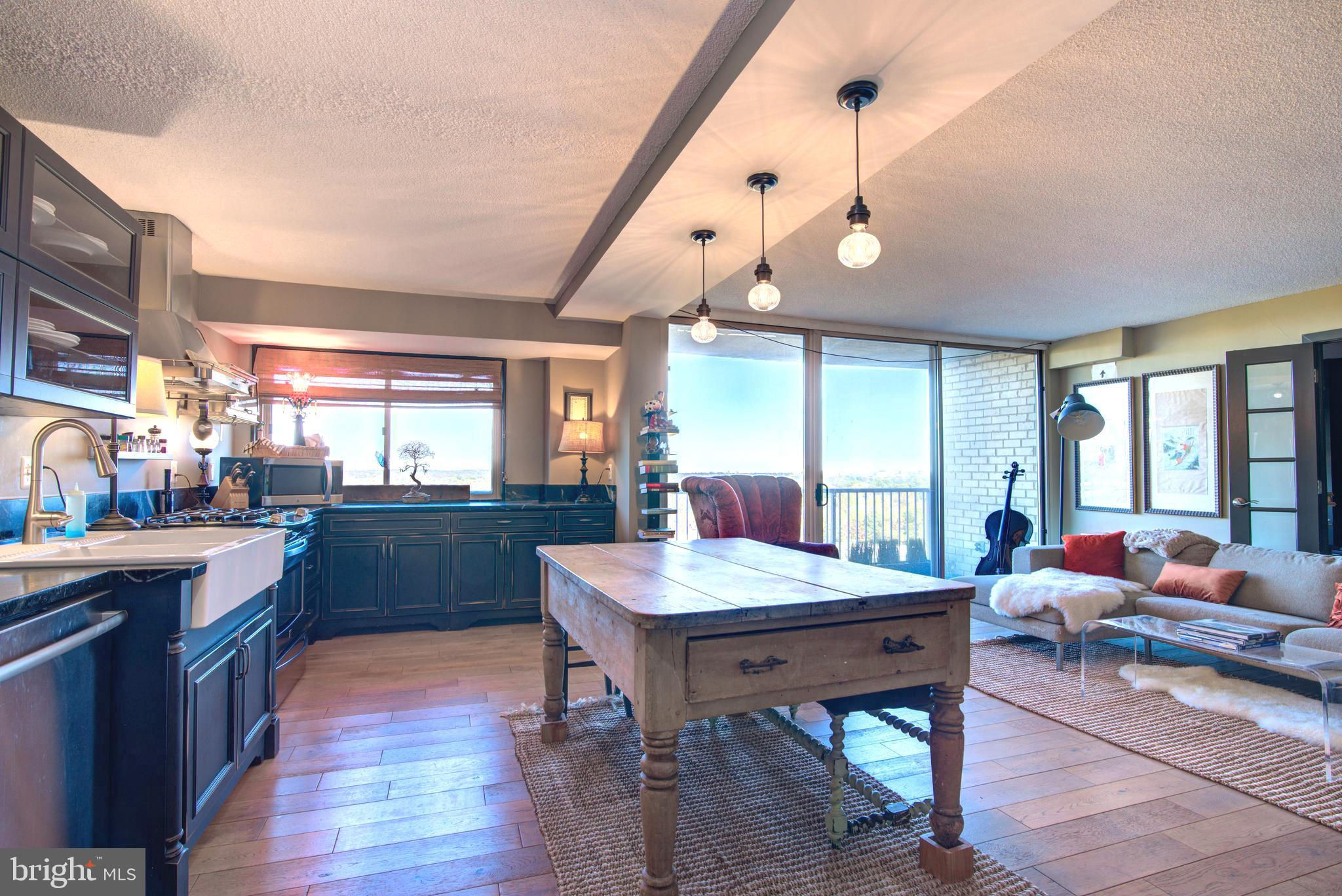 Stunning 3BR/2BA Condo w/ Panoramic Views of the Northern Virginia/DC Skyline! Open concept Kitchen w/ soft close cabs, rare Soapstone countertops, double-sided porcelain farmhouse sink, SS appliances, gas cooking w/ exhaust hood. Must see the view from the kitchen work space! Gorgeous 6in wide plank hardwood flooring ($30K upgrade). Upgraded BA's w/ new glass shower enclosures & brushed nickel hardware. 3rd BR converted to office w/ french doors opening to living space. Condo fee incl all utils (electric, gas, water, trash), Pool, fitness center, community rm, 24 hr concierge. Conveniently located adjacent to Ft Ward (summer concerts) & Holmes Run Trail. Blocks to 395 access, Bradlee Center shopping & dining. Mins to Pentagon & DC!