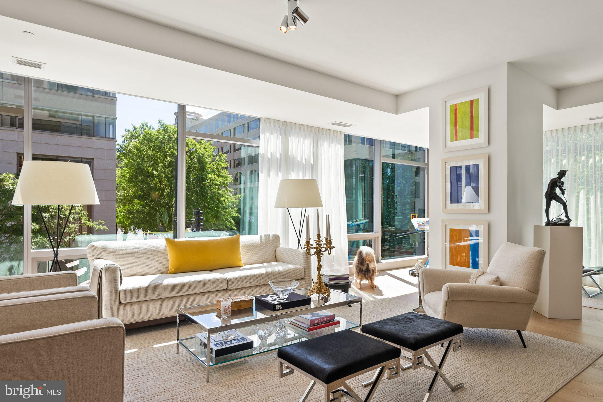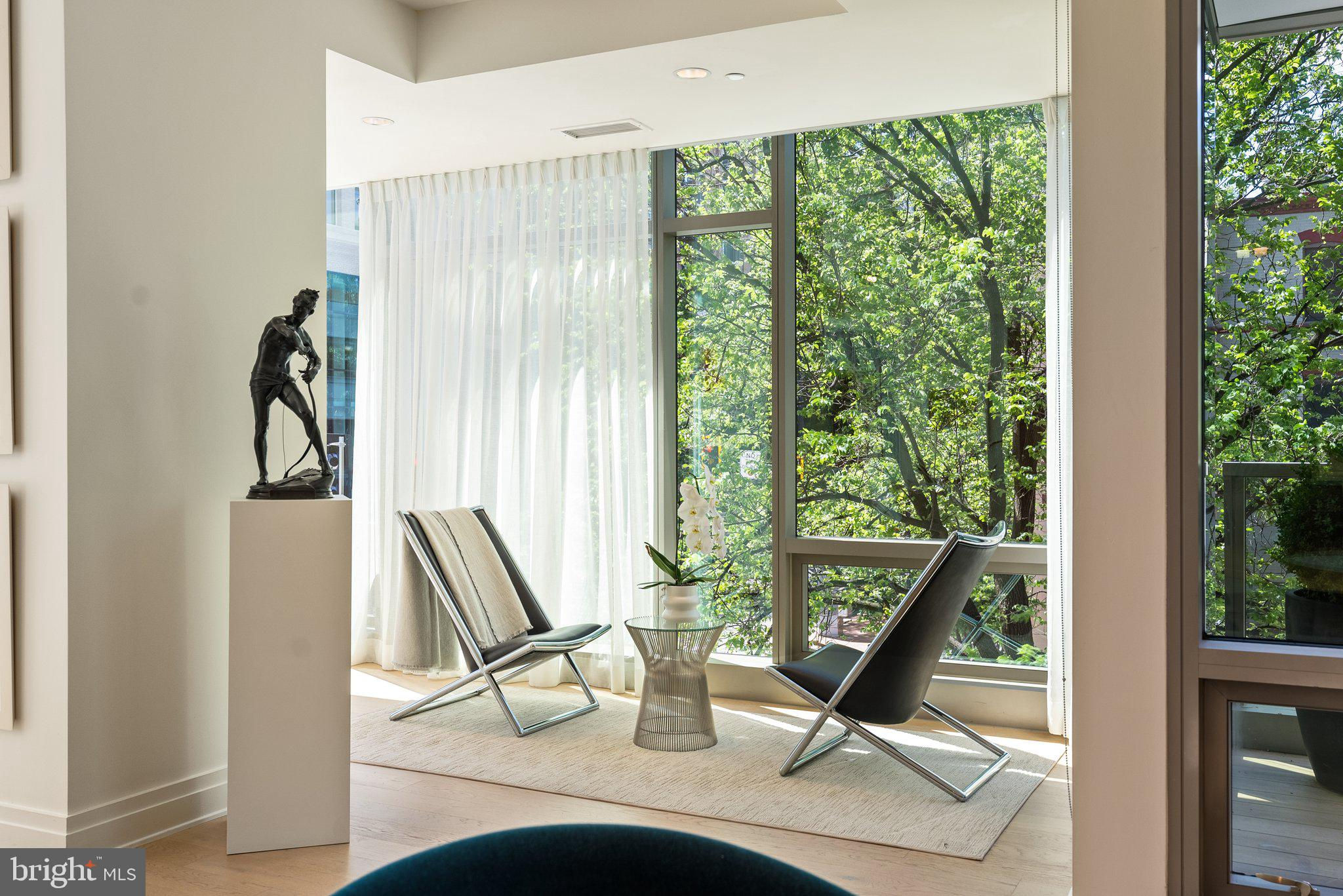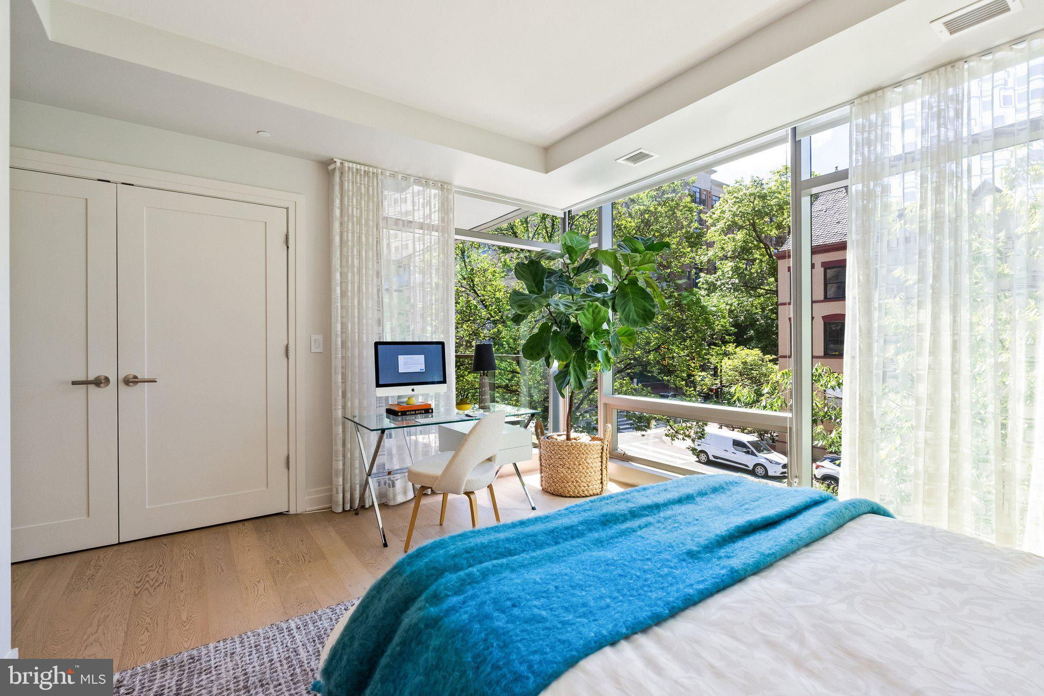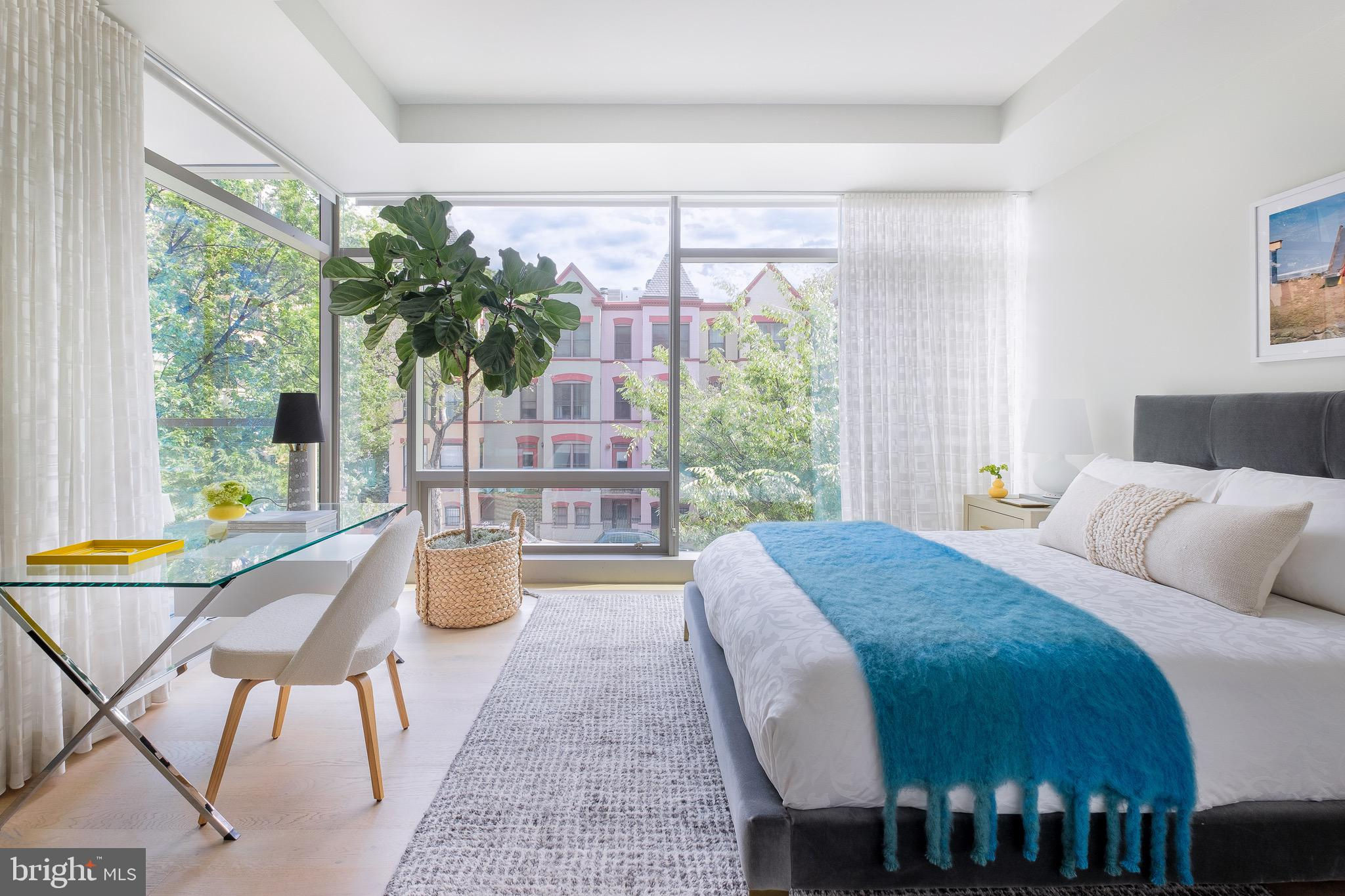 One-of-kind unit, with TWO BEDROOMS + DEN, this is one of the city’s most desirable and discerning addresses for fine urban living. Unit 203 profiled in Southern Living Magazine is rare offering: an airy, expansive 2,200+ square foot residence where form meets function in a harmonious blend of clean modernism and timeless materials. The home delivers a masterful level of design intention, featuring bespoke upgrades that speak to both architectural sophistication and everyday comfort. As you enter, you're greeted into a gracious foyer and then you step into the breathtaking, light-filled interior. Floor-to-ceiling windows along multiple exposures floods the open-concept living spaces with natural light, offering uninterrupted views of mature foliage and an elegant transition to the private balcony — a serene perch, the ideal place to enjoy morning coffee. The spatial layout is fluid and intuitive featuring wide plank white oak flooring and bespoke lighting -- anchored by a gourmet kitchen that serves as both a culinary workspace and a visual focal point. Outfitted with sleek cabinetry including a custom-crafted pantry, premium stainless steel appliances (Bosch and Thermador), natural countertops and a waterfall island with seating for three or more, the kitchen is open to the living and dining zones, each defined by expansive sight lines. The foyer area rounds out with a walk-in coat closet and a chic and whimsical wallpapered powder room for guests. The spacious primary suite is a serene, private retreat conceived for ease and indulgence -- easily accommodating a king sized bed and multiple furniture layouts. The expansive window features custom tailored black-out draperies. The white and crisp ensuite bath delivers a double vanity, finely crafted porcelain tile work, an oversized shower with European fittings, and a secluded water closet. Down the hall, the light-filled second bedroom adapts easily to varying needs, whether as a guest room, library or studio. The en suite full bath, thoughtfully designed with a tub/shower configuration, delivers comfort for both residents and guests. Down the hall is the custom-designed den -- a jewel box featuring an artisan glass partition and door and a signature chandelier -- an ideal space for cozy movie nights in. This singular residence is further enhanced by two dedicated parking spaces and in-unit, full-sized laundry with energy efficient front loading machines. Residents benefit from an extensive suite of outstanding building amenities including The Cove a stylish community room with a wet bar and meeting rooms, a state of the art fitness center with access to a trainer, yoga studio, 24-7 desk attendant, concierge services, and a beautifully landscaped rooftop terrace offering panoramic views across the city skyline. Located just steps from the vibrant heart of the city — with Georgetown, Rock Creek Park, Michelin-starred dining, boutique shopping, and Metro access all within walking distance — 2501 M is not simply a residence, but a refined living destination in one of Washington’s most coveted boutique condo buildings. Welcome Home!