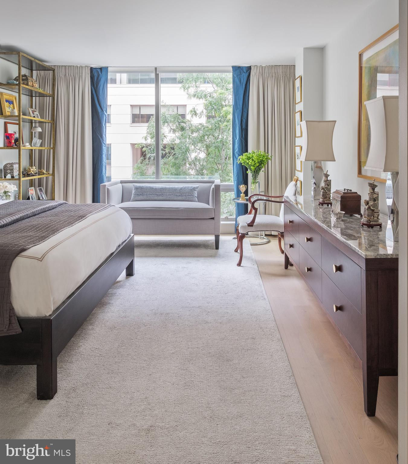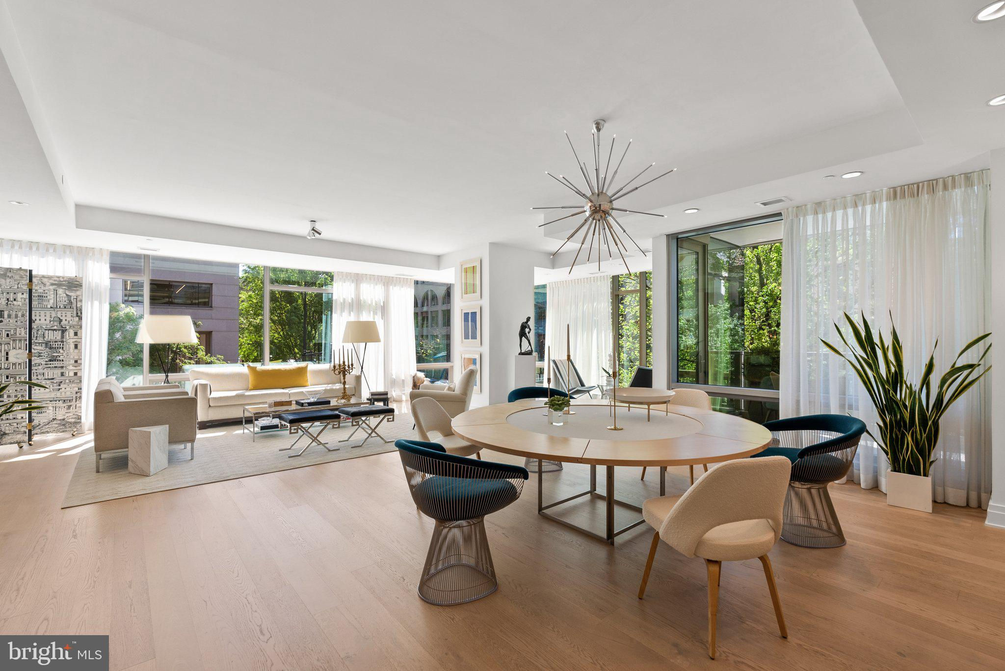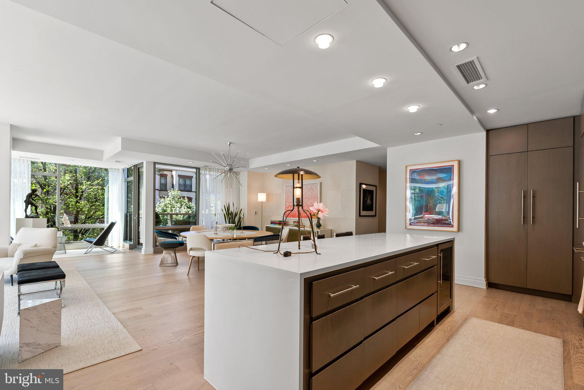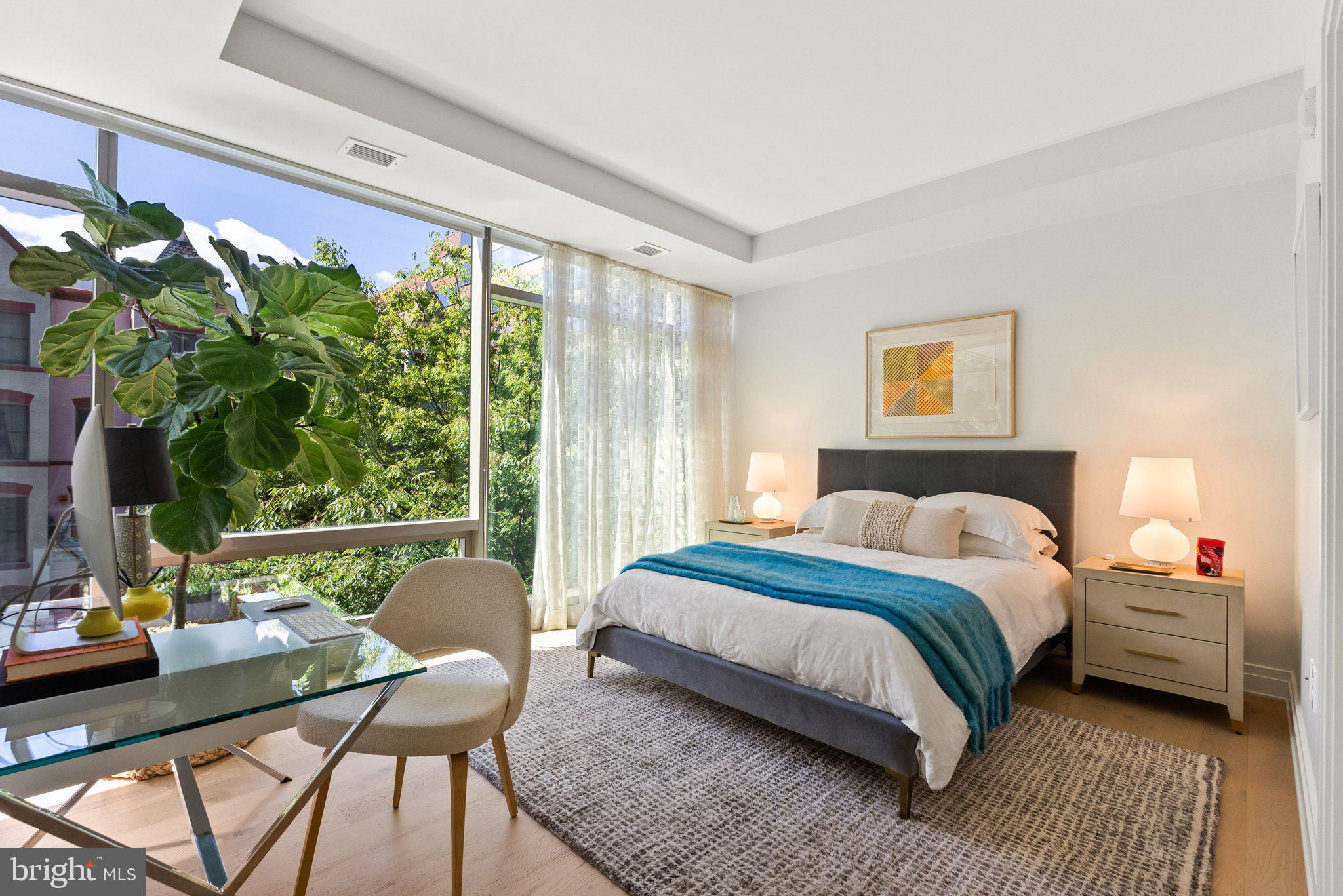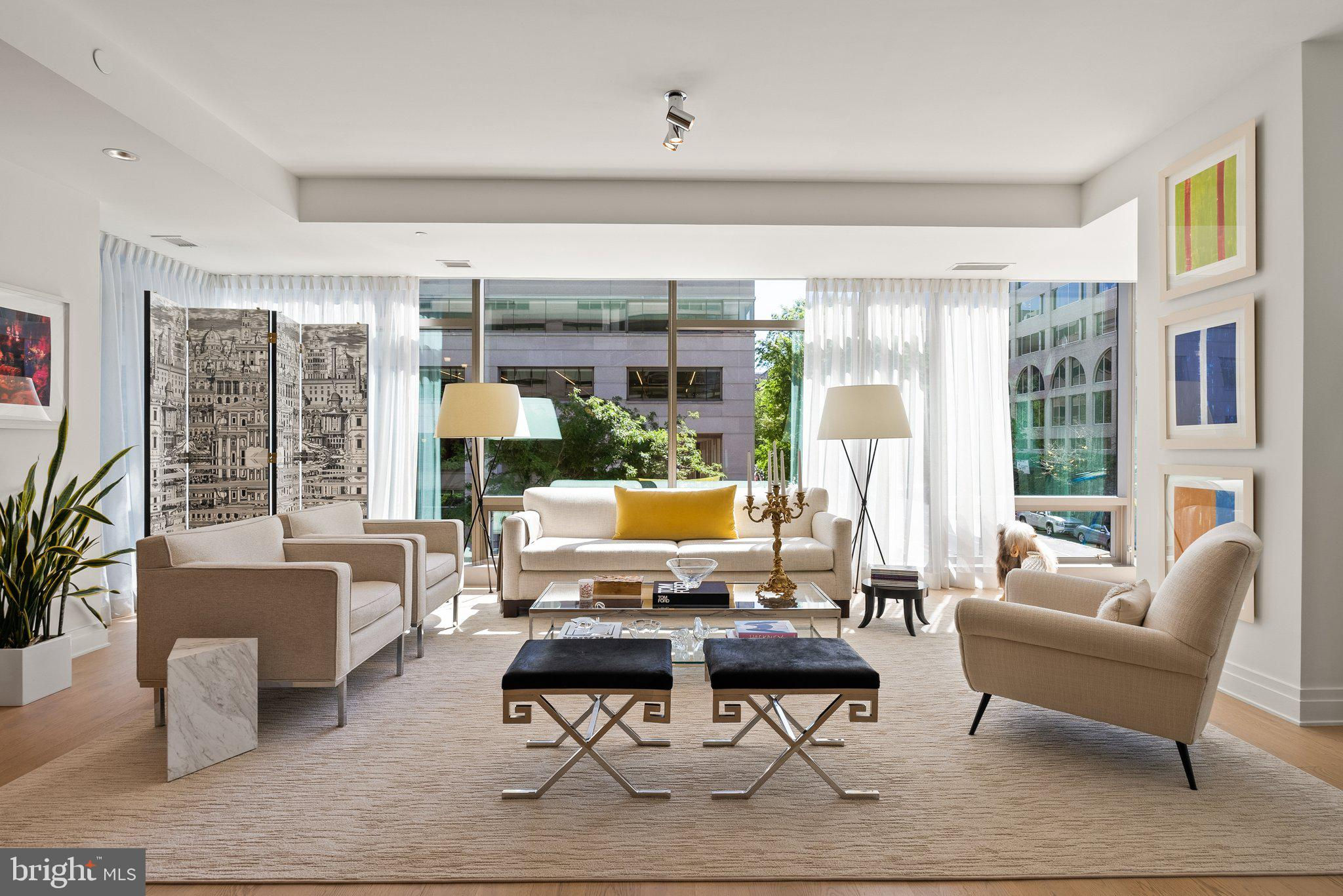 One-of-kind unit, with TWO BEDROOMS + DEN, this is one of the city’s most desirable and discerning addresses for fine urban living. Unit 203 profiled in Southern Living Magazine is rare offering: an airy, expansive 2,200+ square foot residence where form meets function in a harmonious blend of clean modernism and timeless materials. The home delivers a masterful level of design intention, featuring bespoke upgrades that speak to both architectural sophistication and everyday comfort. As you enter, you're greeted into a gracious foyer and then you step into the breathtaking, light-filled interior. Floor-to-ceiling windows along multiple exposures floods the open-concept living spaces with natural light, offering uninterrupted views of mature foliage and an elegant transition to the private balcony — a serene perch, the ideal place to enjoy morning coffee. The spatial layout is fluid and intuitive featuring wide plank white oak flooring and bespoke lighting -- anchored by a gourmet kitchen that serves as both a culinary workspace and a visual focal point. Outfitted with sleek cabinetry including a custom-crafted pantry, premium stainless steel appliances (Bosch and Thermador), natural countertops and a waterfall island with seating for three or more, the kitchen is open to the living and dining zones, each defined by expansive sight lines. The foyer area rounds out with a walk-in coat closet and a chic and whimsical wallpapered powder room for guests. The spacious primary suite is a serene, private retreat conceived for ease and indulgence -- easily accommodating a king sized bed and multiple furniture layouts. The expansive window features custom tailored black-out draperies. The white and crisp ensuite bath delivers a double vanity, finely crafted porcelain tile work, an oversized shower with European fittings, and a secluded water closet. Down the hall, the light-filled second bedroom adapts easily to varying needs, whether as a guest room, library or studio. The en suite full bath, thoughtfully designed with a tub/shower configuration, delivers comfort for both residents and guests. Down the hall is the custom-designed den -- a jewel box featuring an artisan glass partition and door and a signature chandelier -- an ideal space for cozy movie nights in. This singular residence is further enhanced by two dedicated parking spaces and in-unit, full-sized laundry with energy efficient front loading machines. Residents benefit from an extensive suite of outstanding building amenities including The Cove a stylish community room with a wet bar and meeting rooms, a state of the art fitness center with access to a trainer, yoga studio, 24-7 desk attendant, concierge services, and a beautifully landscaped rooftop terrace offering panoramic views across the city skyline. Located just steps from the vibrant heart of the city — with Georgetown, Rock Creek Park, Michelin-starred dining, boutique shopping, and Metro access all within walking distance — 2501 M is not simply a residence, but a refined living destination in one of Washington’s most coveted boutique condo buildings. Welcome Home!
