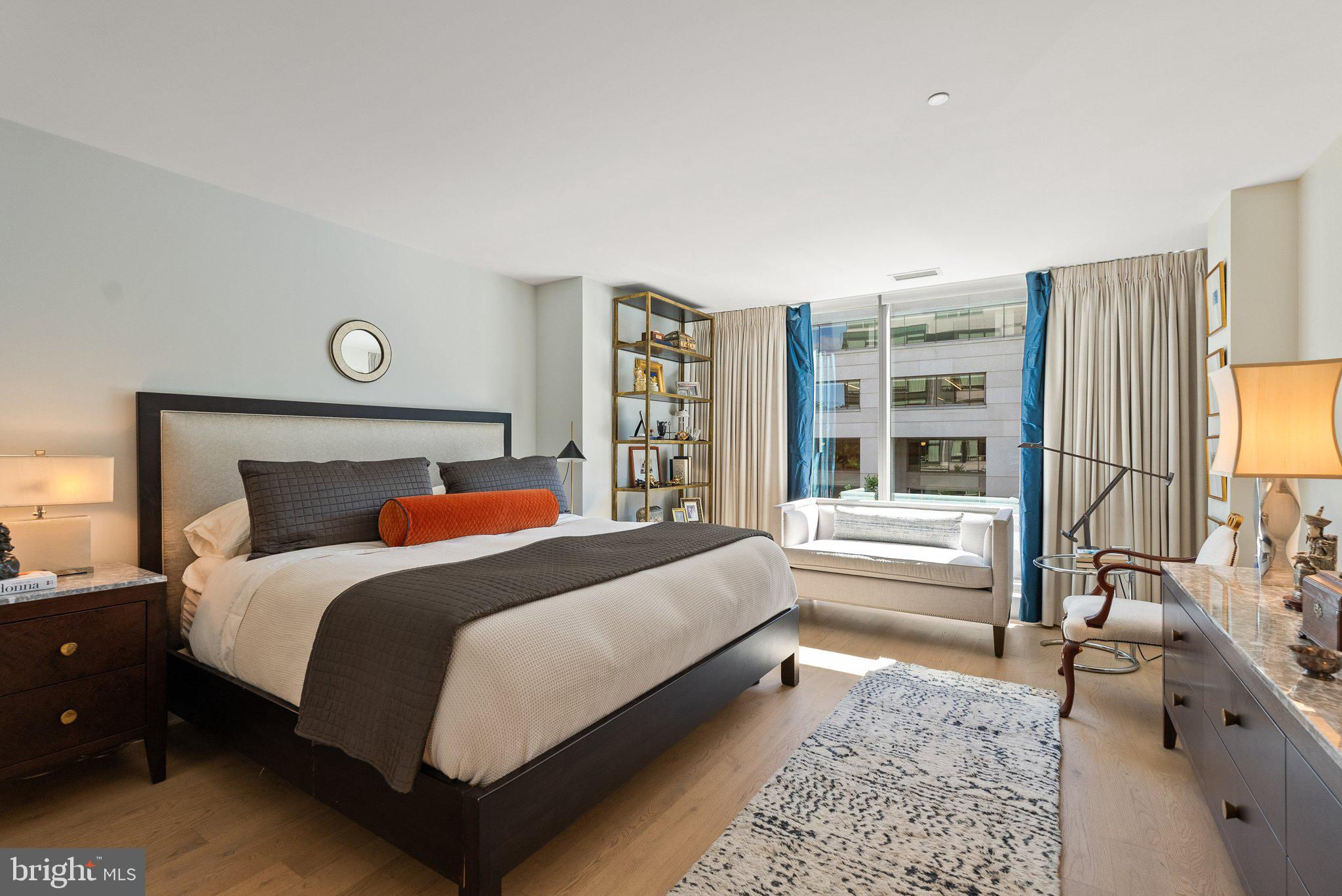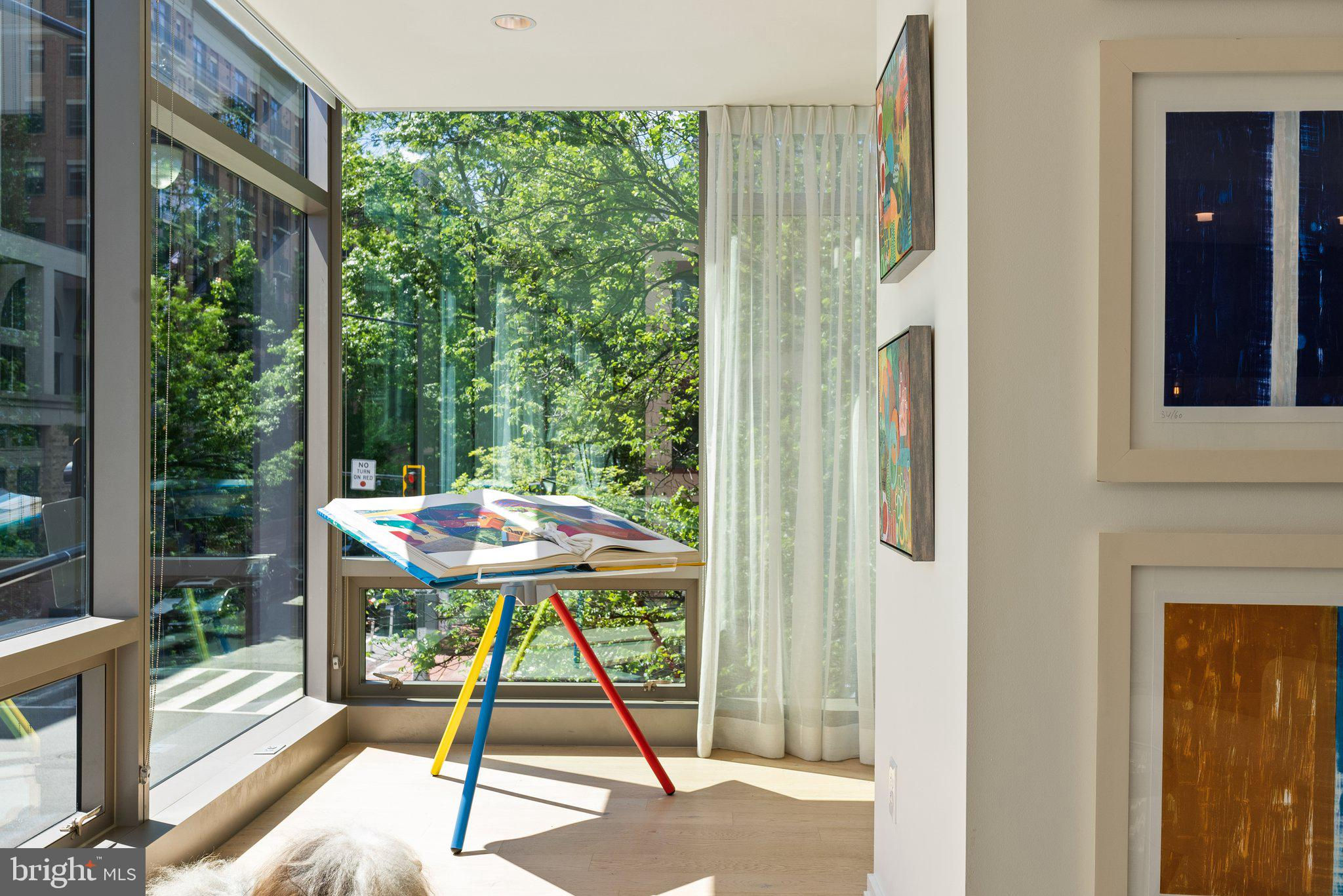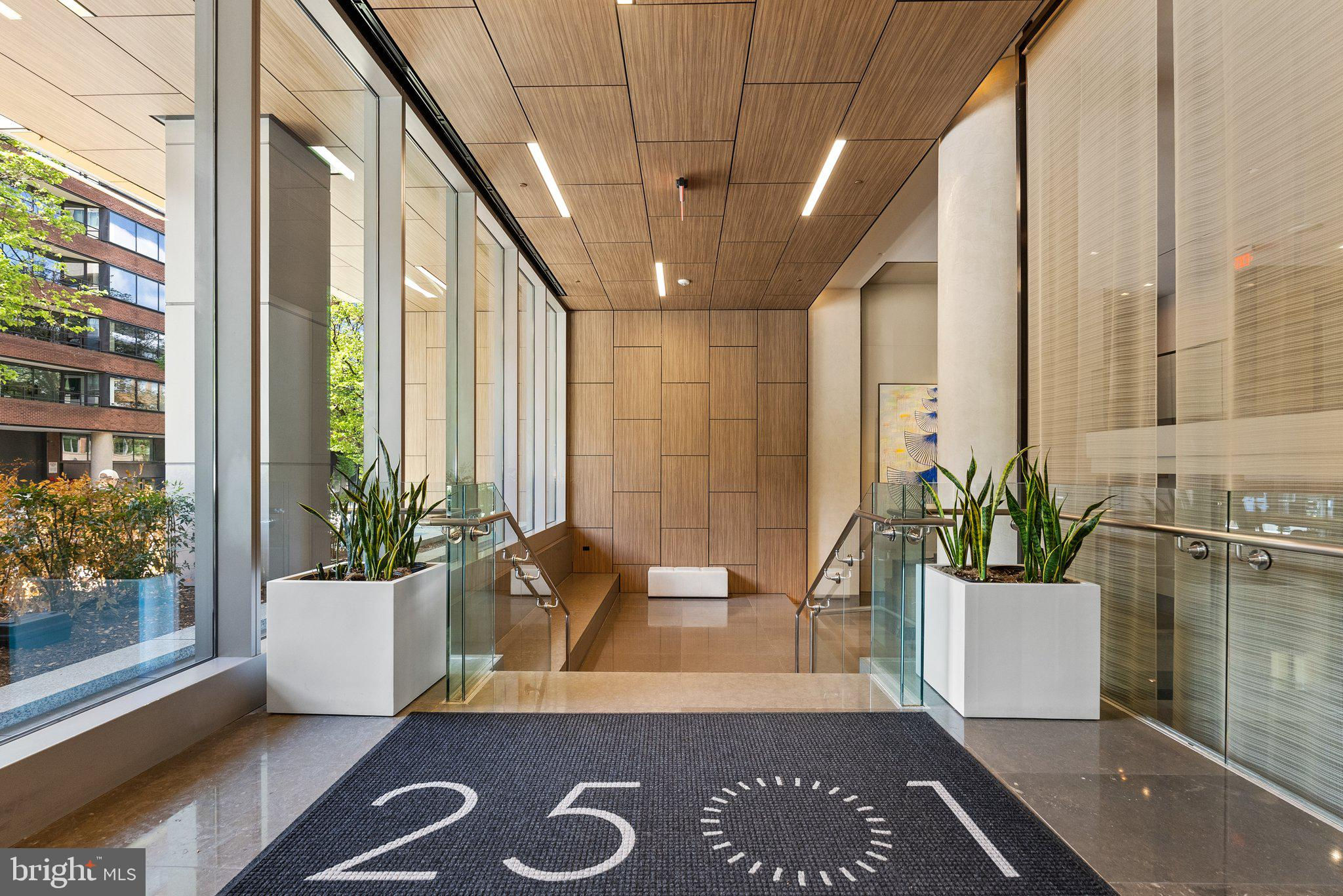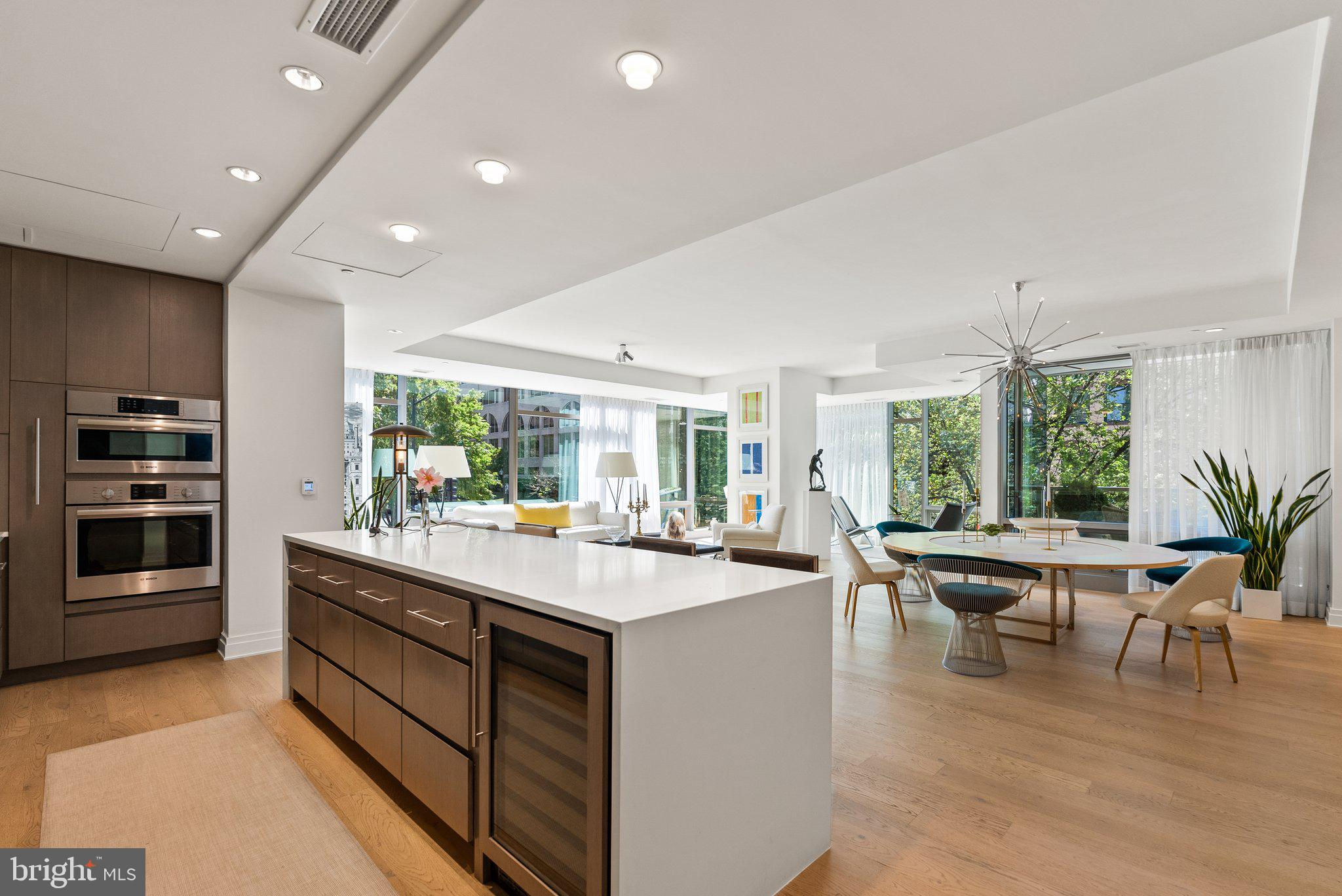 One-of-kind unit, with TWO BEDROOMS + DEN, this is one of the city’s most desirable and discerning addresses for fine urban living. Unit 203 profiled in Southern Living Magazine is rare offering: an airy, expansive 2,200+ square foot residence where form meets function in a harmonious blend of clean modernism and timeless materials. The home delivers a masterful level of design intention, featuring bespoke upgrades that speak to both architectural sophistication and everyday comfort. As you enter, you're greeted into a gracious foyer and then you step into the breathtaking, light-filled interior. Floor-to-ceiling windows along multiple exposures floods the open-concept living spaces with natural light, offering uninterrupted views of mature foliage and an elegant transition to the private balcony — a serene perch, the ideal place to enjoy morning coffee. The spatial layout is fluid and intuitive featuring wide plank white oak flooring and bespoke lighting -- anchored by a gourmet kitchen that serves as both a culinary workspace and a visual focal point. Outfitted with sleek cabinetry including a custom-crafted pantry, premium stainless steel appliances (Bosch and Thermador), natural countertops and a waterfall island with seating for three or more, the kitchen is open to the living and dining zones, each defined by expansive sight lines. The foyer area rounds out with a walk-in coat closet and a chic and whimsical wallpapered powder room for guests. The spacious primary suite is a serene, private retreat conceived for ease and indulgence -- easily accommodating a king sized bed and multiple furniture layouts. The expansive window features custom tailored black-out draperies. The white and crisp ensuite bath delivers a double vanity, finely crafted porcelain tile work, an oversized shower with European fittings, and a secluded water closet. Down the hall, the light-filled second bedroom adapts easily to varying needs, whether as a guest room, library or studio. The en suite full bath, thoughtfully designed with a tub/shower configuration, delivers comfort for both residents and guests. Down the hall is the custom-designed den -- a jewel box featuring an artisan glass partition and door and a signature chandelier -- an ideal space for cozy movie nights in. This singular residence is further enhanced by two dedicated parking spaces and in-unit, full-sized laundry with energy efficient front loading machines. Residents benefit from an extensive suite of outstanding building amenities including The Cove a stylish community room with a wet bar and meeting rooms, a state of the art fitness center with access to a trainer, yoga studio, 24-7 desk attendant, concierge services, and a beautifully landscaped rooftop terrace offering panoramic views across the city skyline. Located just steps from the vibrant heart of the city — with Georgetown, Rock Creek Park, Michelin-starred dining, boutique shopping, and Metro access all within walking distance — 2501 M is not simply a residence, but a refined living destination in one of Washington’s most coveted boutique condo buildings. Welcome Home!