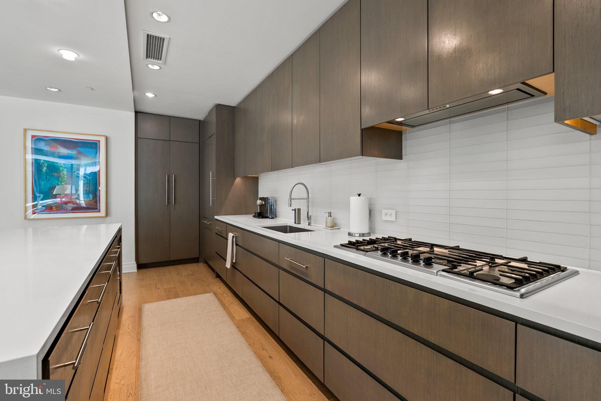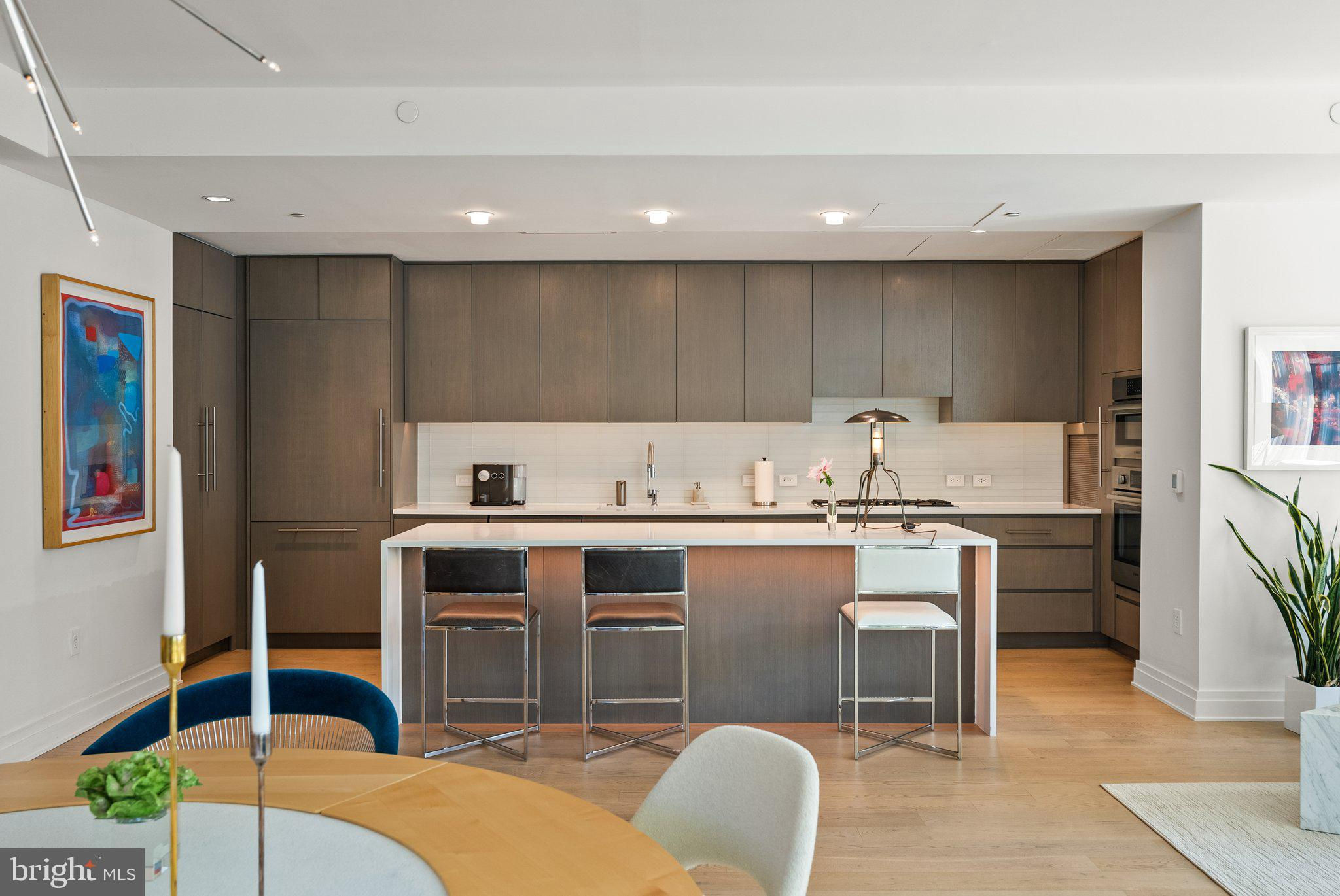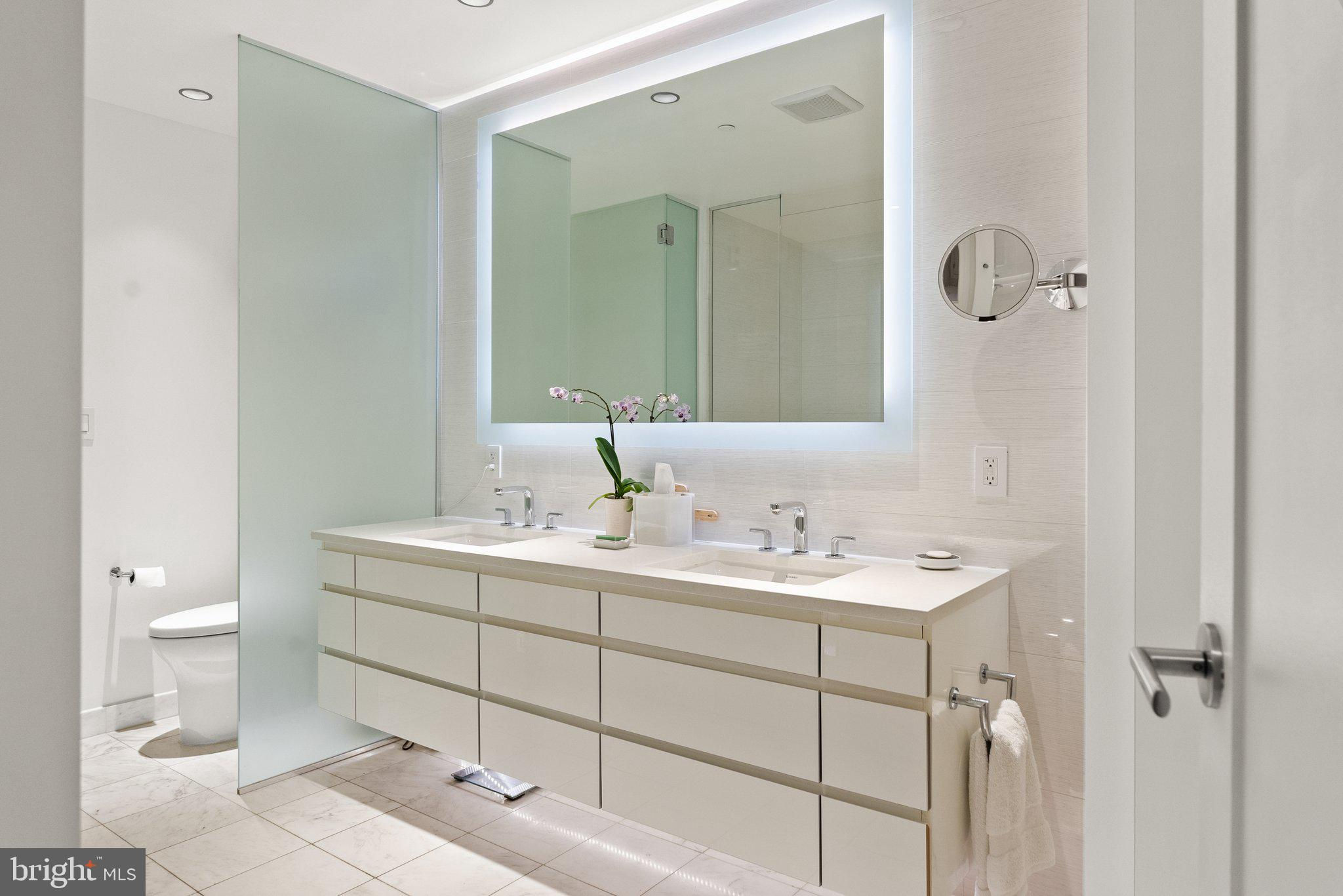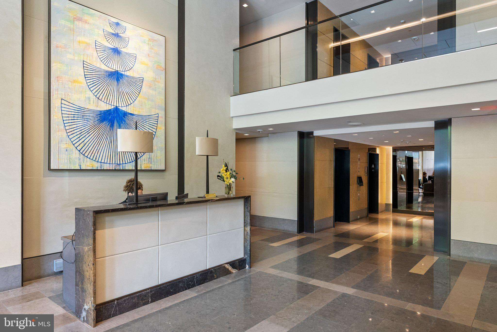One-of-kind unit, with TWO BEDROOMS + DEN, this is one of the city’s most desirable and discerning addresses for fine urban living. Unit 203 profiled in Southern Living Magazine is rare offering: an airy, expansive 2,200+ square foot residence where form meets function in a harmonious blend of clean modernism and timeless materials. The home delivers a masterful level of design intention, featuring bespoke upgrades that speak to both architectural sophistication and everyday comfort. As you enter, you're greeted into a gracious foyer and then you step into the breathtaking, light-filled interior. Floor-to-ceiling windows along multiple exposures floods the open-concept living spaces with natural light, offering uninterrupted views of mature foliage and an elegant transition to the private balcony — a serene perch, the ideal place to enjoy morning coffee. The spatial layout is fluid and intuitive featuring wide plank white oak flooring and bespoke lighting -- anchored by a gourmet kitchen that serves as both a culinary workspace and a visual focal point. Outfitted with sleek cabinetry including a custom-crafted pantry, premium stainless steel appliances (Bosch and Thermador), natural countertops and a waterfall island with seating for three or more, the kitchen is open to the living and dining zones, each defined by expansive sight lines. The foyer area rounds out with a walk-in coat closet and a chic and whimsical wallpapered powder room for guests. The spacious primary suite is a serene, private retreat conceived for ease and indulgence -- easily accommodating a king sized bed and multiple furniture layouts. The expansive window features custom tailored black-out draperies. The white and crisp ensuite bath delivers a double vanity, finely crafted porcelain tile work, an oversized shower with European fittings, and a secluded water closet. Down the hall, the light-filled second bedroom adapts easily to varying needs, whether as a guest room, library or studio. The en suite full bath, thoughtfully designed with a tub/shower configuration, delivers comfort for both residents and guests. Down the hall is the custom-designed den -- a jewel box featuring an artisan glass partition and door and a signature chandelier -- an ideal space for cozy movie nights in. This singular residence is further enhanced by two dedicated parking spaces and in-unit, full-sized laundry with energy efficient front loading machines. Residents benefit from an extensive suite of outstanding building amenities including The Cove a stylish community room with a wet bar and meeting rooms, a state of the art fitness center with access to a trainer, yoga studio, 24-7 desk attendant, concierge services, and a beautifully landscaped rooftop terrace offering panoramic views across the city skyline. Located just steps from the vibrant heart of the city — with Georgetown, Rock Creek Park, Michelin-starred dining, boutique shopping, and Metro access all within walking distance — 2501 M is not simply a residence, but a refined living destination in one of Washington’s most coveted boutique condo buildings. Welcome Home!