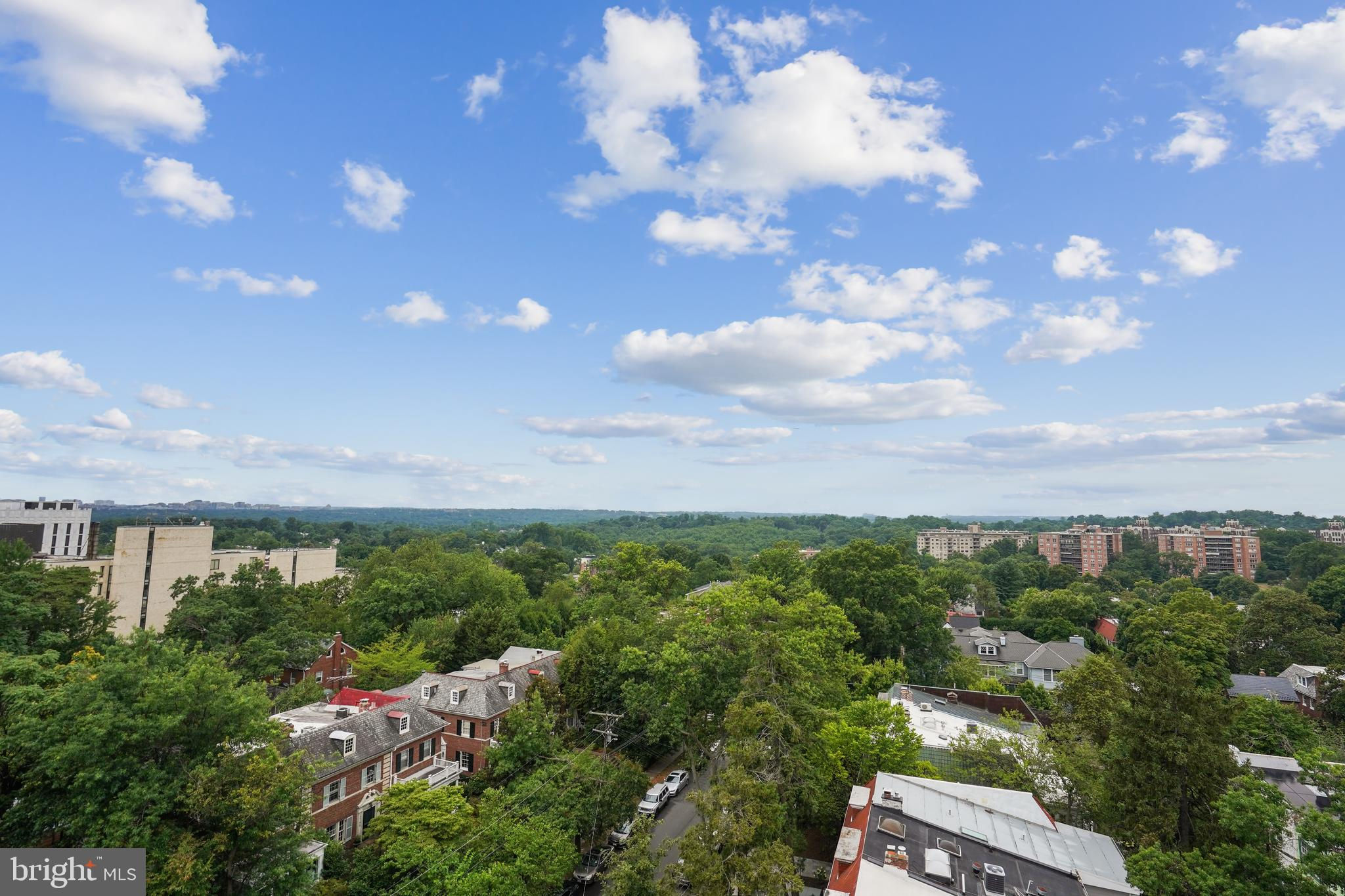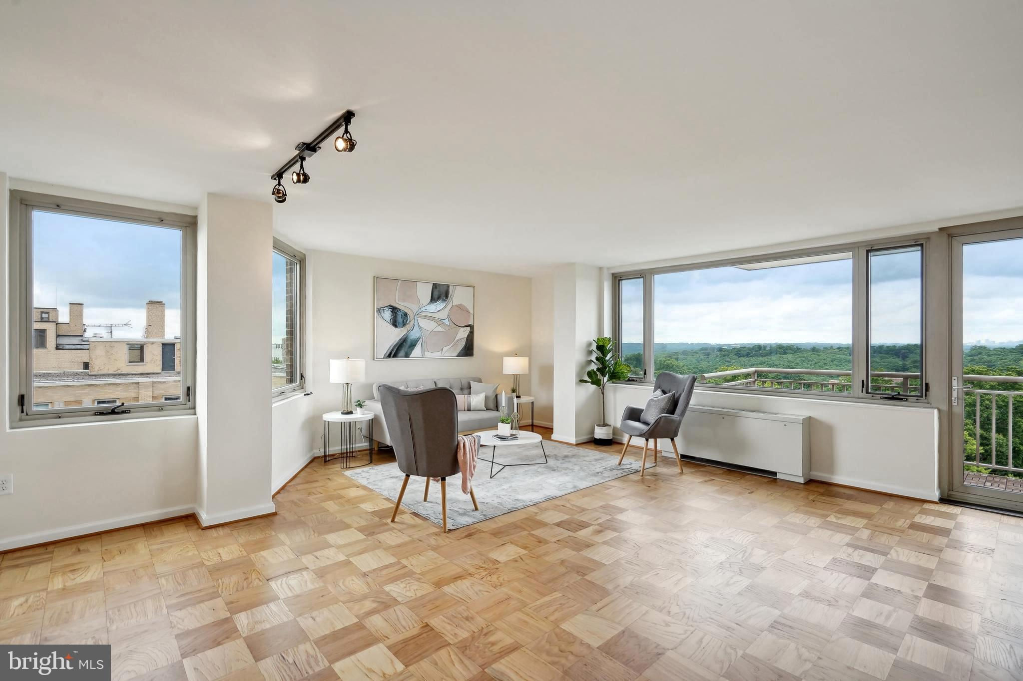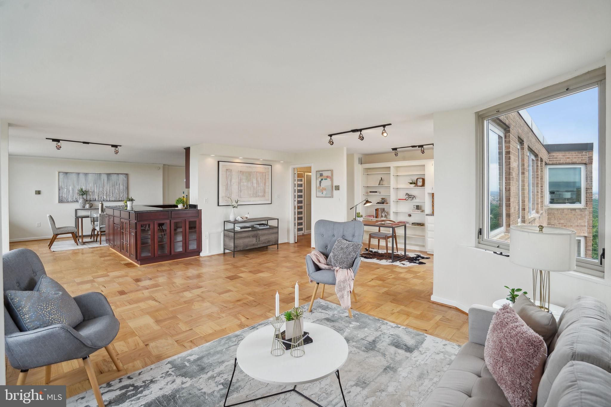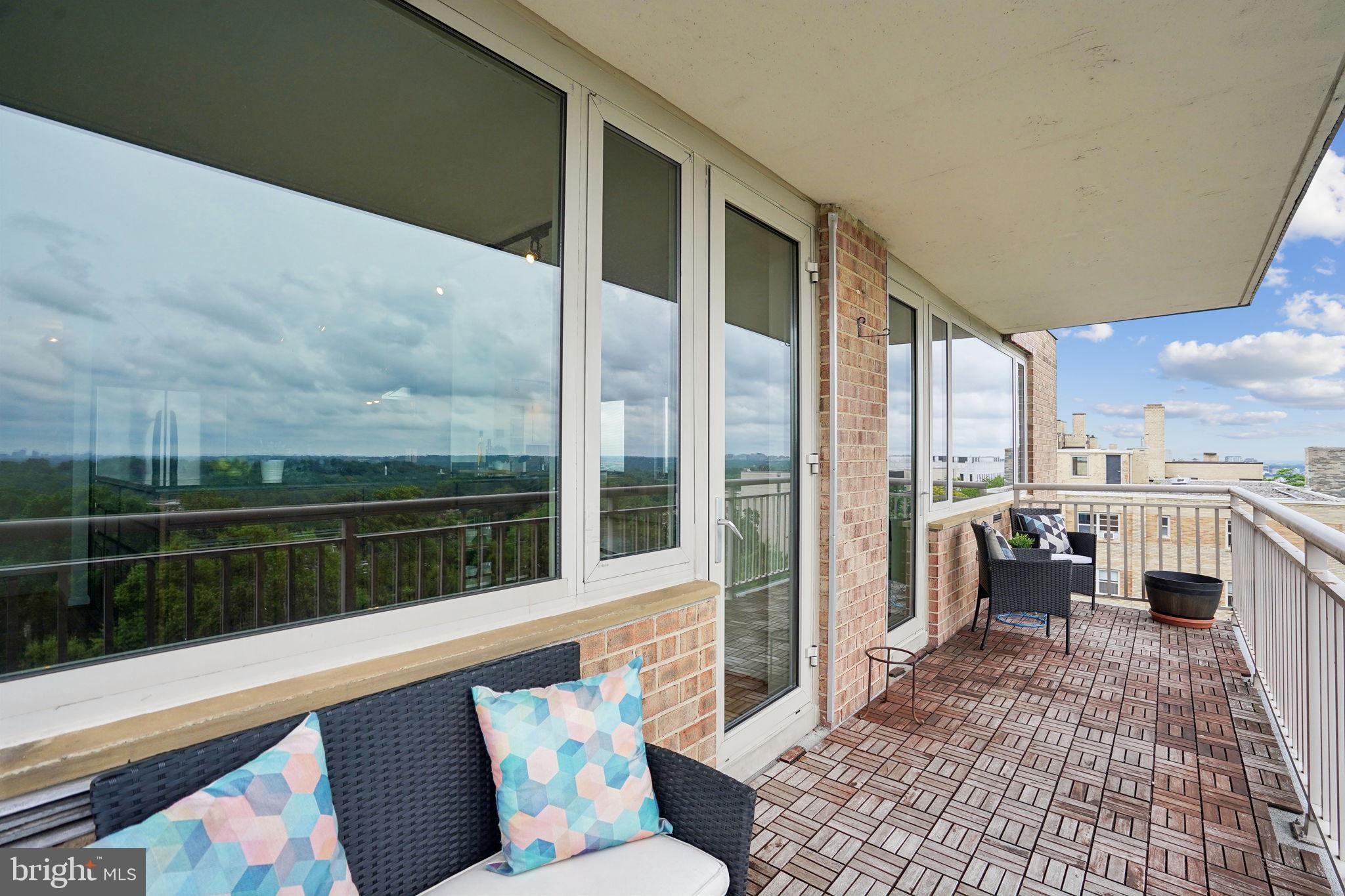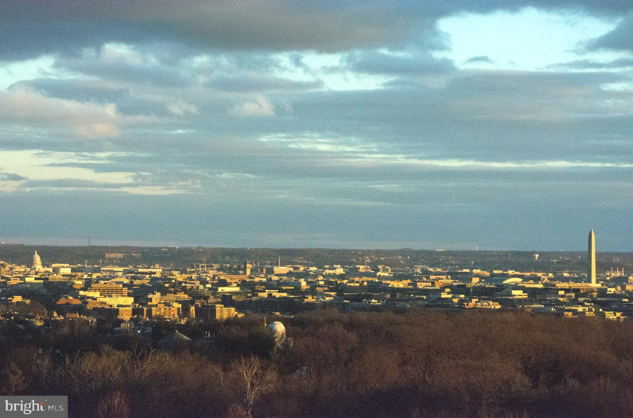 TRULY EXTRAORDINARY! THE VIEWS! THE SPACE! THE LOCATION! YOU MUST STEP INSIDE TO FULLY EXPERIENCE THIS stunning one-in-a-million property minus a million dollar price tag! Mere photos cannot do this penthouse apartment justice and priced well below it's recent appraised value. This two bedroom, two bath plus den "began life" (units 1003 and 1004) as two one bedroom units now artfully combined into an approximately 1,600 sf open floor plan top-floor unit featuring panoramic views to the south featuring the Washington Monument, the Capital, and the Potomac and Tysons Corner and Reston to the west. On a clear day even the mountains are visible!!! Step onto your 23' west-facing balcony and enjoy morning coffee or relax with your evening cocktail while regaled by spectacular sunsets. The gourmet kitchen boasts custom cabinets providing storage and glass doored display space, buffet- style serving counters of black Galaxy granite, stainless steel appliances including French door refrigerator with ice maker, gas range, self cleaning oven and new (May 2024) dishwasher. Customized baths -- one with jacuzzi, ceramic tile surrounds, and double vanity -- the other Turkish travertine tile shower and surround and shale flooring, double vanities with glass basins, custom lighting and "notions and lotions" cabinet for extra storage. The primary bedroom is accessed by a walk-in closet/walk through dressing room with custom shelving and drawers and another custom fitted closet. The second bedroom offers yet another walk-in closet and linen storage in hallway adjacent to bath. The den/wet bar alcove adjacent to the living room is perfect for settling down with a good book or use as office space with panoramic views . The area could also be configured as a third bedroom . Two separately deeded garage parking spaces are included. Located just two blocks south of Mass Avenue and the iconic National Cathedral, the apartment offers a walk score of 86. To the south just a few blocks you'll find Whole Foods, Trader Joe's and a host of restaurants and services. Less than a mile to the north is the Cathedral Commons retail area featuring Giant Foods and CVS plus DC Community Pool located at Hearst and membership to pool available at St. Albans (indoor) A front desk and security, common area laundry room and recently renovated lobby complete this one of a kind offering! Note: tax assessment for one unit only Taxes shown are correct for both units together.