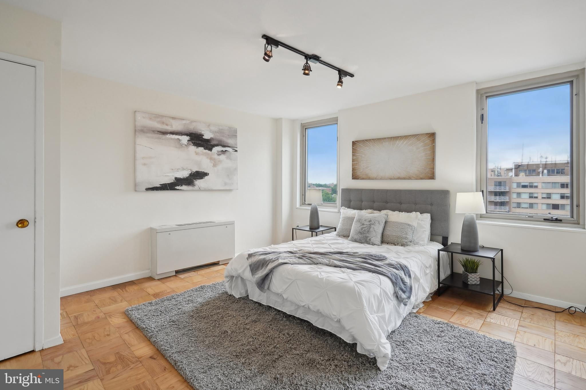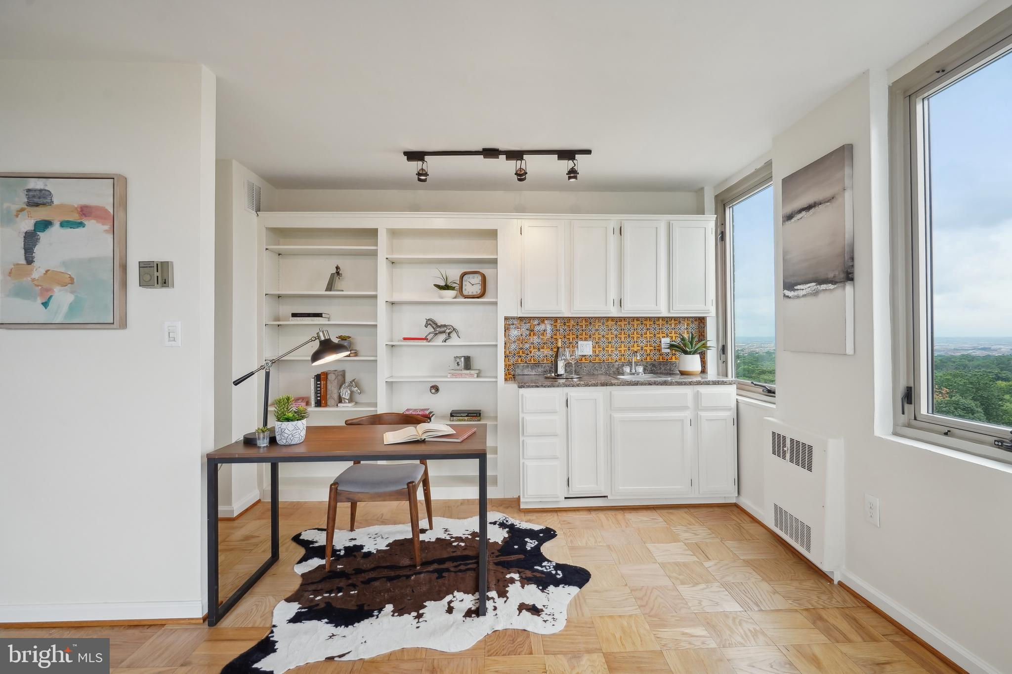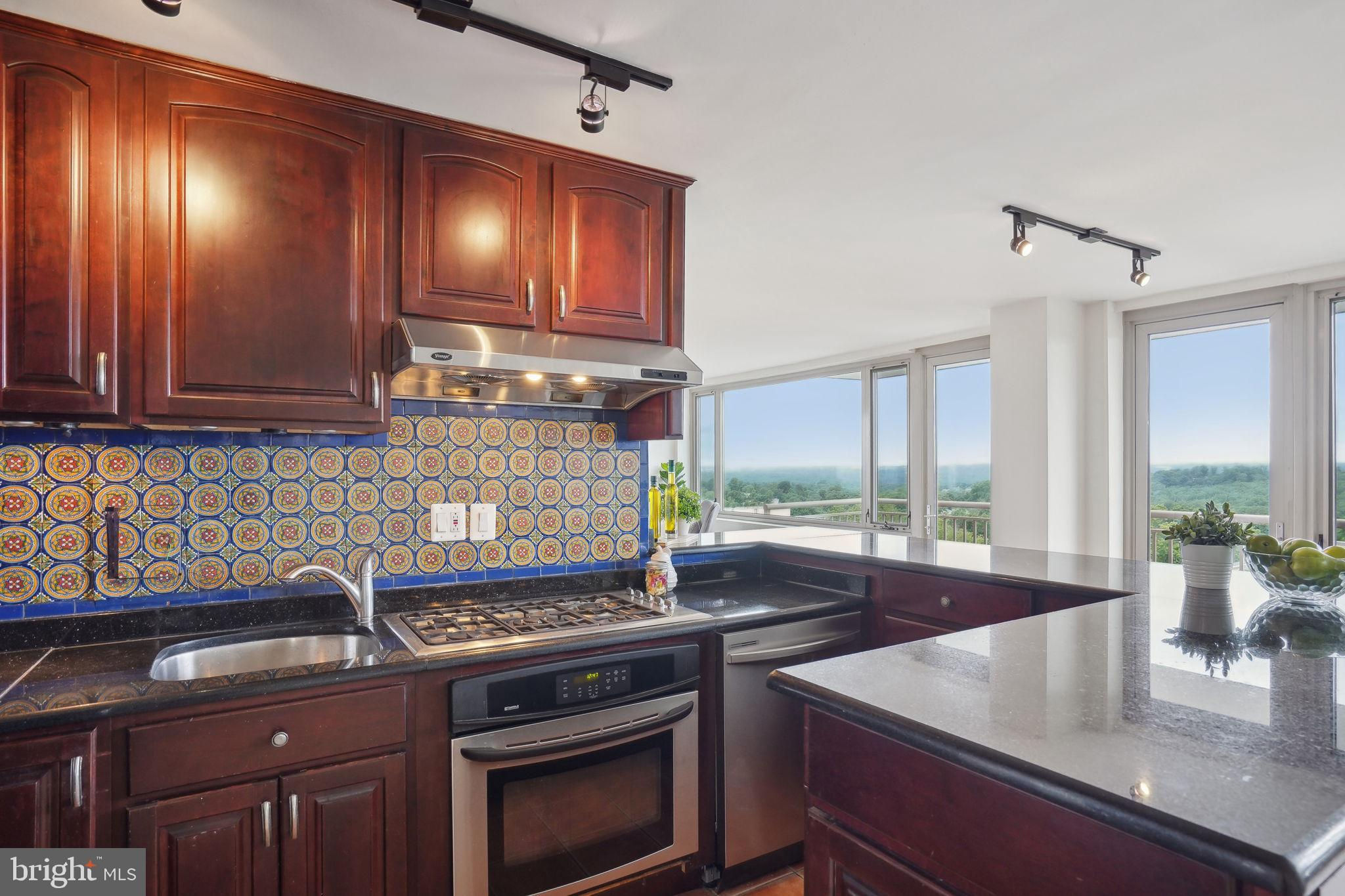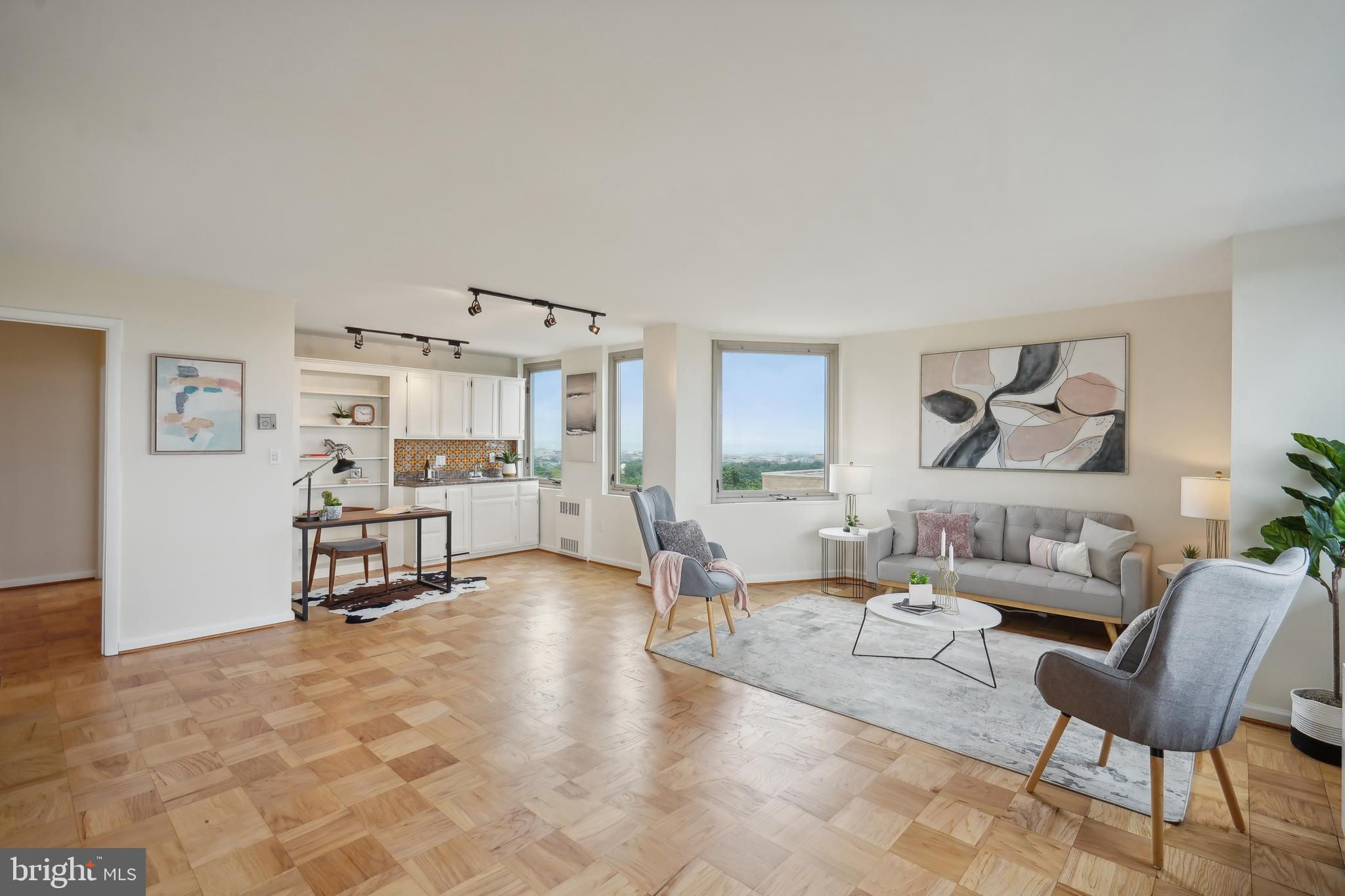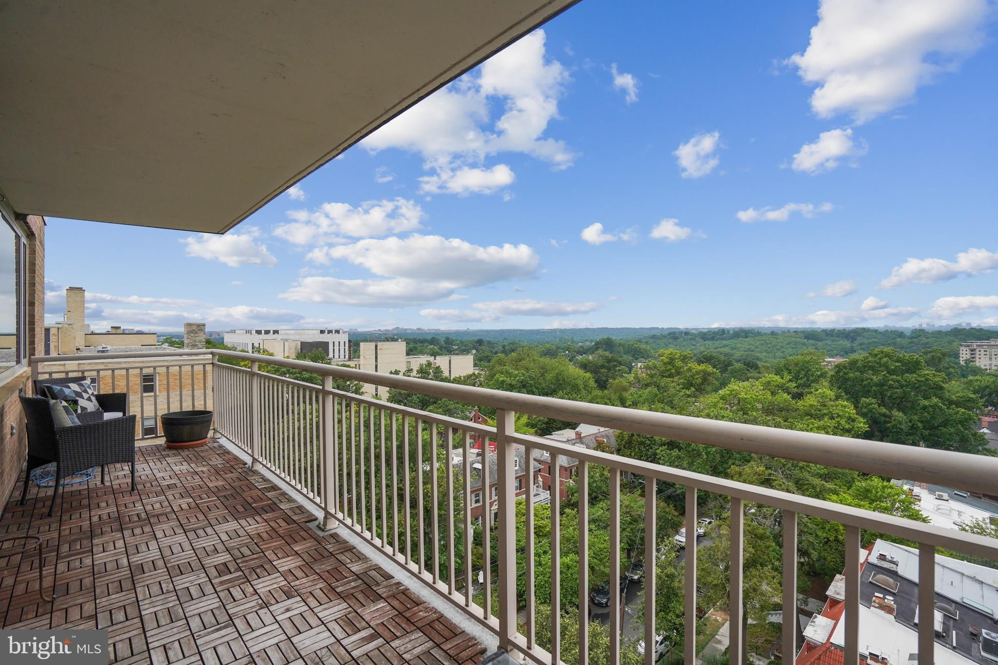 TRULY EXTRAORDINARY! THE VIEWS! THE SPACE! THE LOCATION! YOU MUST STEP INSIDE TO FULLY EXPERIENCE THIS stunning one-in-a-million property minus a million dollar price tag! Mere photos cannot do this penthouse apartment justice and priced well below it's recent appraised value. This two bedroom, two bath plus den "began life" (units 1003 and 1004) as two one bedroom units now artfully combined into an approximately 1,600 sf open floor plan top-floor unit featuring panoramic views to the south featuring the Washington Monument, the Capital, and the Potomac and Tysons Corner and Reston to the west. On a clear day even the mountains are visible!!! Step onto your 23' west-facing balcony and enjoy morning coffee or relax with your evening cocktail while regaled by spectacular sunsets. The gourmet kitchen boasts custom cabinets providing storage and glass doored display space, buffet- style serving counters of black Galaxy granite, stainless steel appliances including French door refrigerator with ice maker, gas range, self cleaning oven and new (May 2024) dishwasher. Customized baths -- one with jacuzzi, ceramic tile surrounds, and double vanity -- the other Turkish travertine tile shower and surround and shale flooring, double vanities with glass basins, custom lighting and "notions and lotions" cabinet for extra storage. The primary bedroom is accessed by a walk-in closet/walk through dressing room with custom shelving and drawers and another custom fitted closet. The second bedroom offers yet another walk-in closet and linen storage in hallway adjacent to bath. The den/wet bar alcove adjacent to the living room is perfect for settling down with a good book or use as office space with panoramic views . The area could also be configured as a third bedroom . Two separately deeded garage parking spaces are included. Located just two blocks south of Mass Avenue and the iconic National Cathedral, the apartment offers a walk score of 86. To the south just a few blocks you'll find Whole Foods, Trader Joe's and a host of restaurants and services. Less than a mile to the north is the Cathedral Commons retail area featuring Giant Foods and CVS plus DC Community Pool located at Hearst and membership to pool available at St. Albans (indoor) A front desk and security, common area laundry room and recently renovated lobby complete this one of a kind offering! Note: tax assessment for one unit only Taxes shown are correct for both units together.