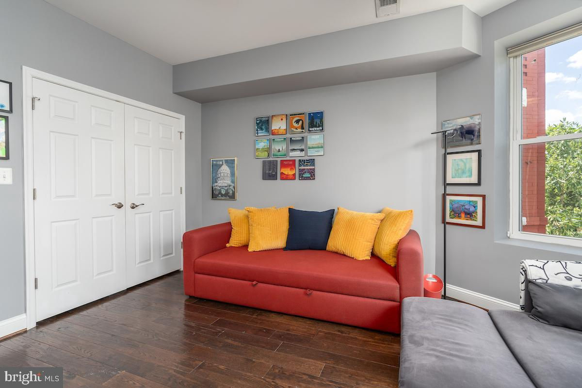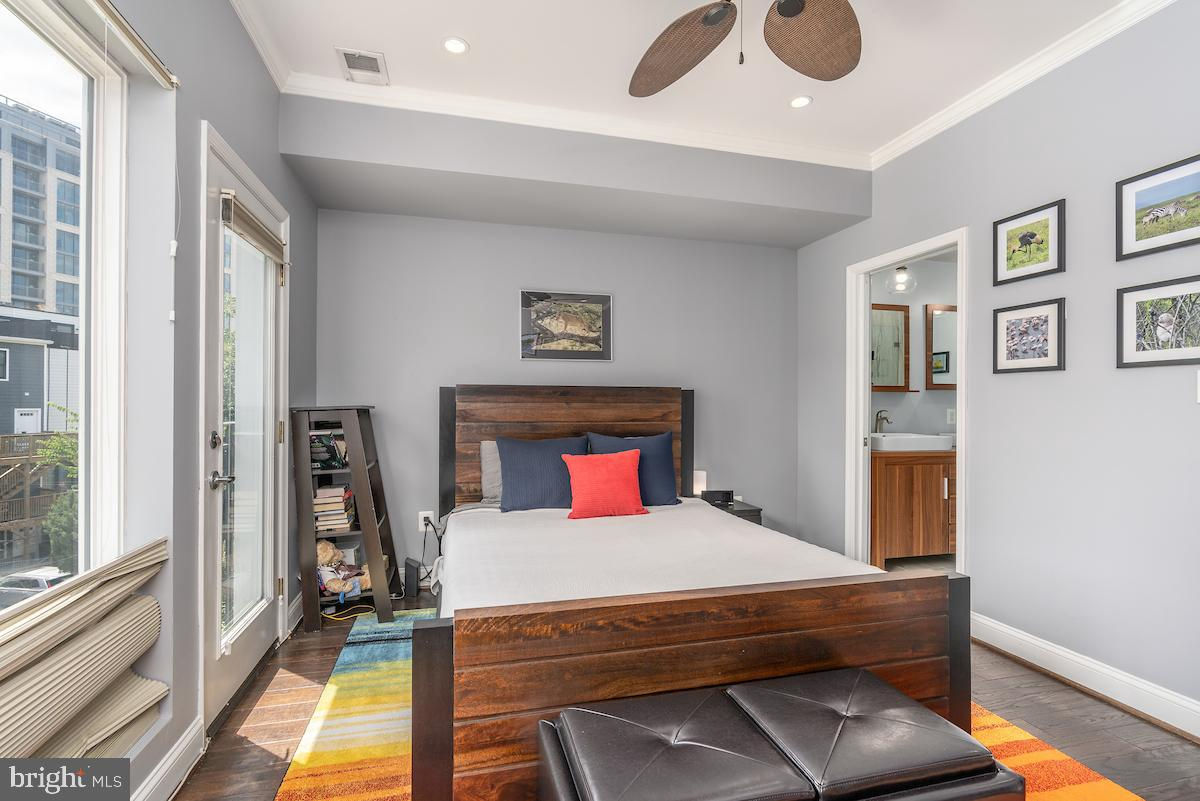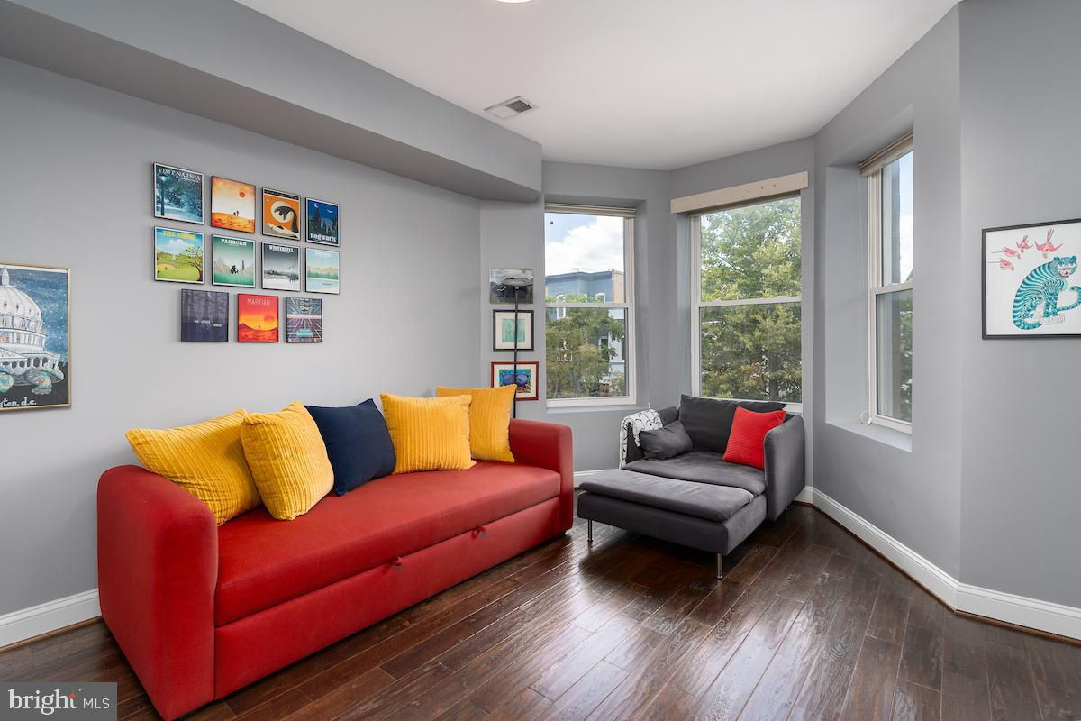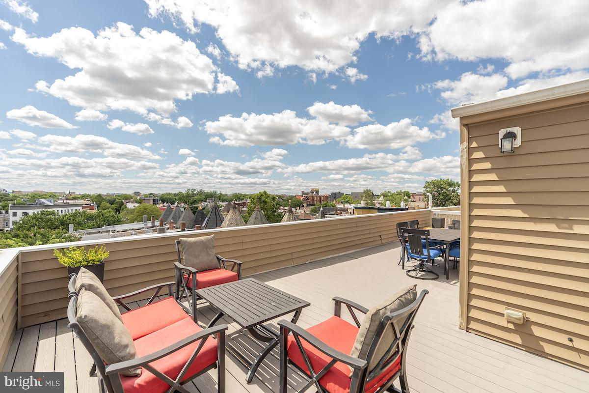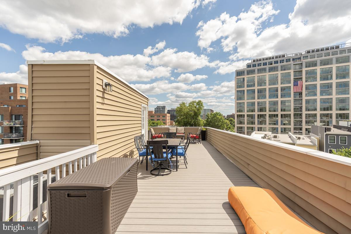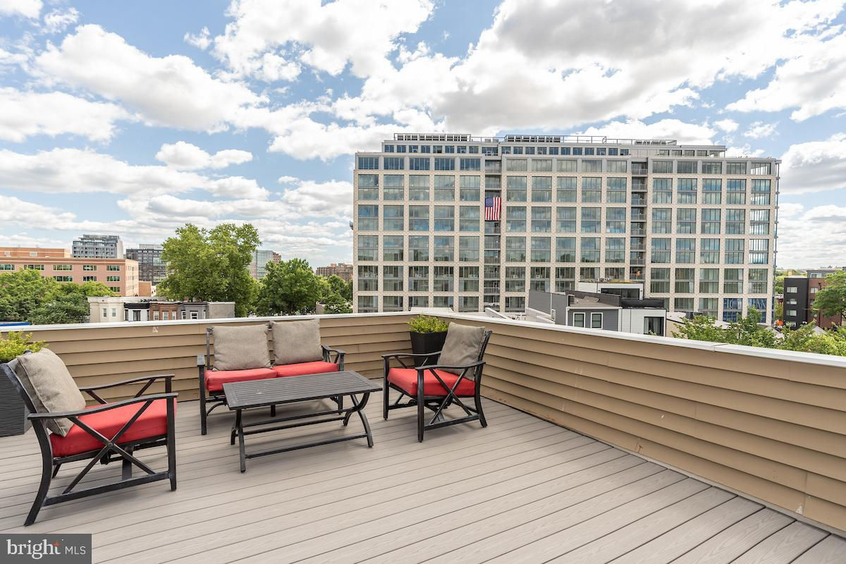 This two-level condo features three bedrooms plus a den and a private rooftop deck. The home boasts hardwood floors throughout, a kitchen equipped with LG appliances, quartz countertops, and soft-close cabinets. The primary suite includes a Juliet balcony and an en-suite bathroom with a double sink vanity and a rainfall shower. The second bedroom, located at the front, has a bay window and an adjacent full bath. The third bedroom also features a Juliet balcony and a nearby full bathroom. The den, situated between the primary suite and the second bedroom, offers a convenient workspace. The private rooftop deck provides sweeping city views. The property, renovated in 2015, is located just 10 minutes from Union Station and is within walking distance of the NOMA Metro station, Trader Joe's, and Harris Teeter.