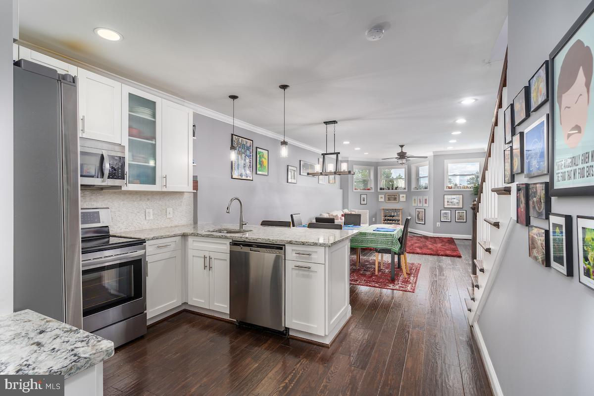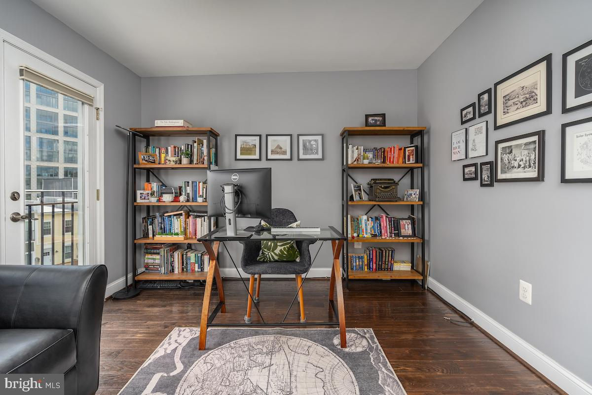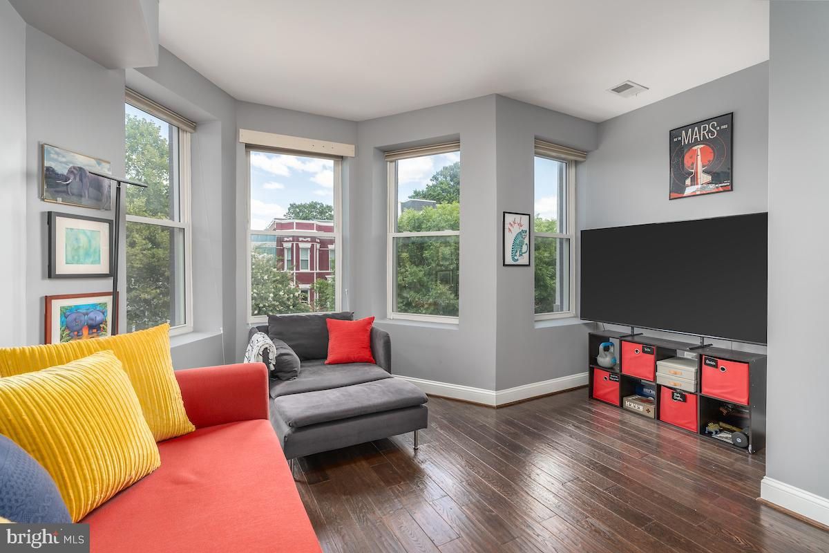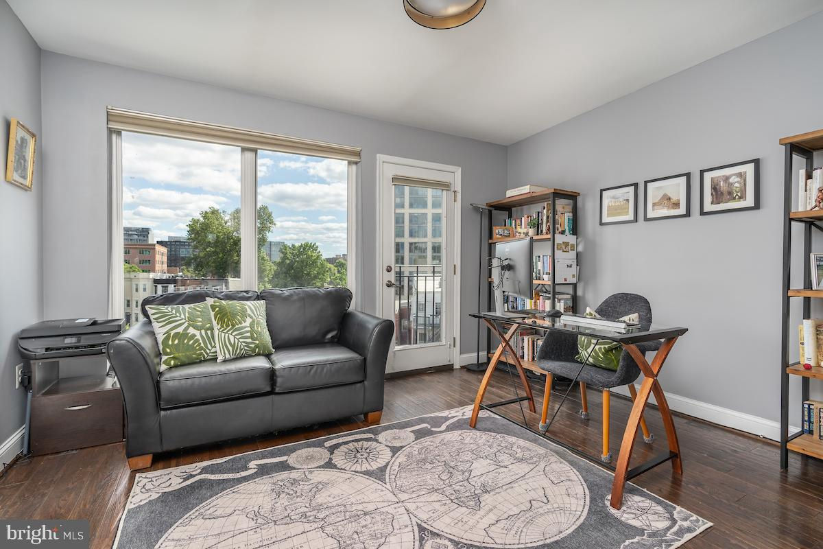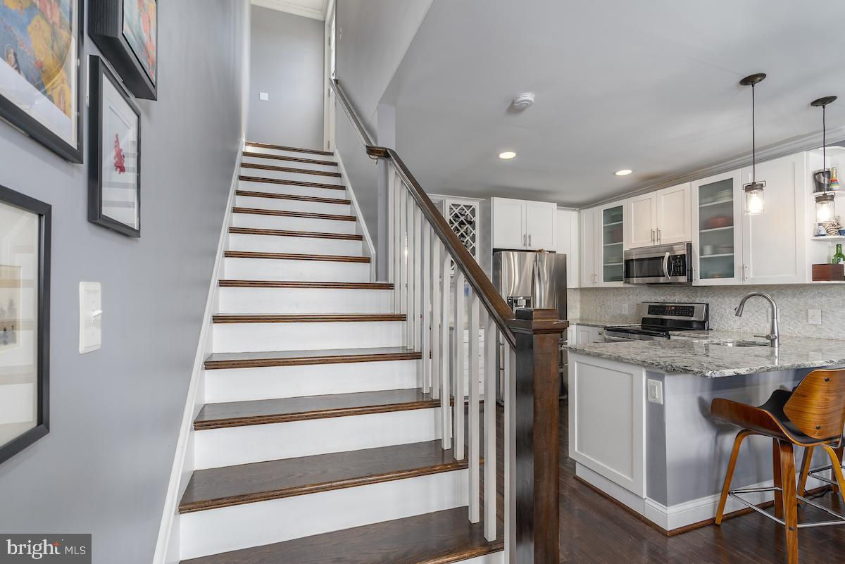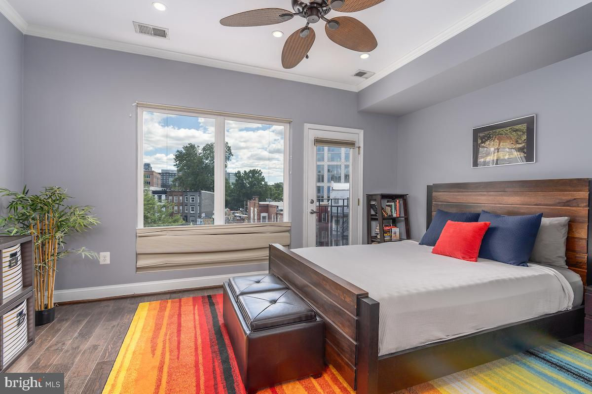 This two-level condo features three bedrooms plus a den and a private rooftop deck. The home boasts hardwood floors throughout, a kitchen equipped with LG appliances, quartz countertops, and soft-close cabinets. The primary suite includes a Juliet balcony and an en-suite bathroom with a double sink vanity and a rainfall shower. The second bedroom, located at the front, has a bay window and an adjacent full bath. The third bedroom also features a Juliet balcony and a nearby full bathroom. The den, situated between the primary suite and the second bedroom, offers a convenient workspace. The private rooftop deck provides sweeping city views. The property, renovated in 2015, is located just 10 minutes from Union Station and is within walking distance of the NOMA Metro station, Trader Joe's, and Harris Teeter.