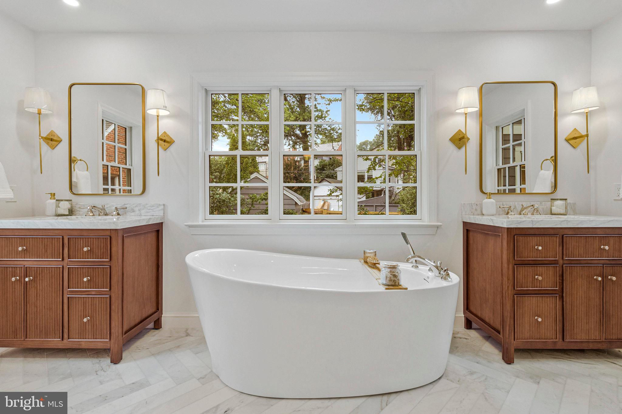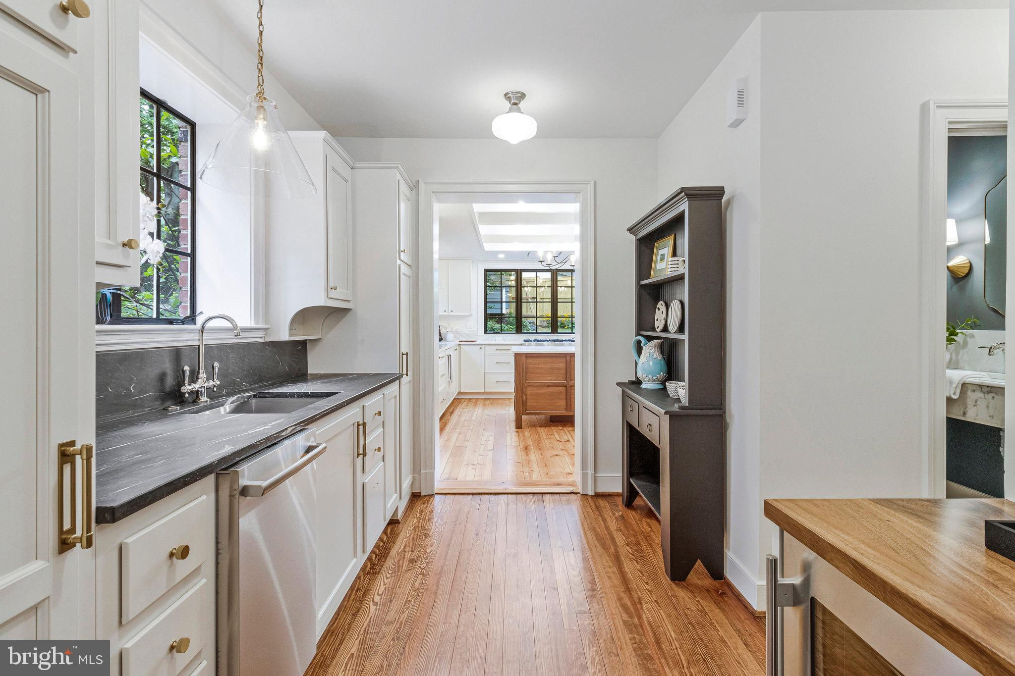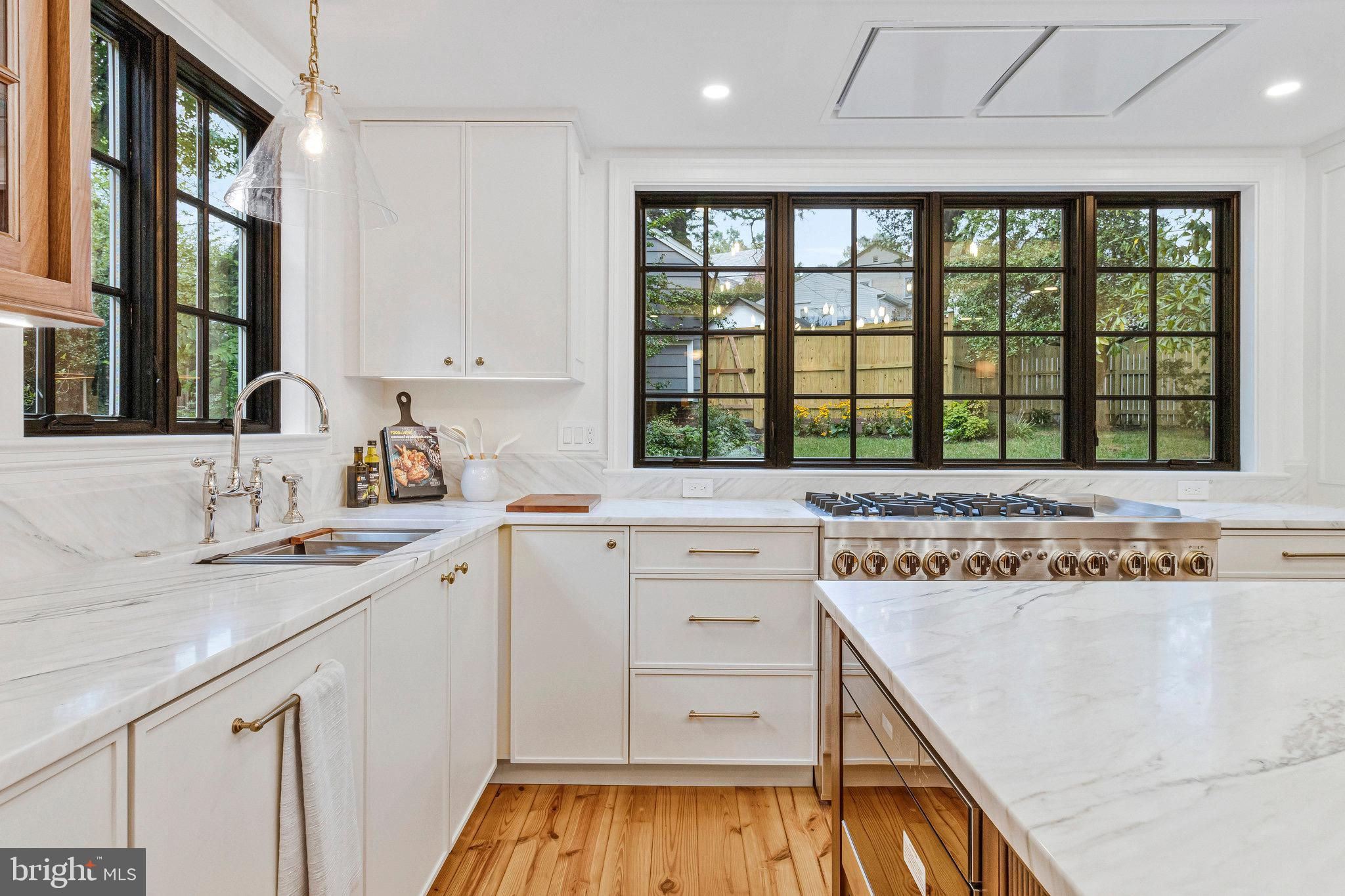 Sophisticated Chevy Chase Colonial with Dual Primary Suites & 16×16 Chef’s Kitchen Blending 1937 craftsmanship with modern designer renovations, this elegant 6-bedroom, 4.5-bath Colonial showcases timeless architecture, luxury finishes, and exceptional livability on one of Chevy Chase DC’s most picturesque, tree-lined streets. A flagstone walkway beneath a 65-year-old Japanese red maple leads to an arched entry and private tiered stone backyard oasis. Inside, original oak and heart pine floors, custom crown moldings, and brass-and-gold-leaf sconces frame a sun-filled living room with wood-burning fireplace and original artisan mantel. The formal dining room, finished in Benjamin Moore’s Brushed Aluminum with custom panel molding and iron-and-gold-leaf chandelier, connects through a butler’s pantry with wet bar, beverage refrigerator, Bosch dishwasher, and extra disposal. The 16×16 chef’s kitchen is a true showpiece—perfect for entertaining. Featuring Calacatta Imperial marble island, countertops, and backsplash, lime-washed exposed brick, and custom Pioneer cabinets built in Lancaster, PA with solid walnut reeded island fronts, banquette seating with built-in smart TV, and a vintage-style walnut china cabinet. Premium JennAir “Rise” appliances include a 48″ panel-front refrigerator/freezer, six-burner + griddle gas range with dual ovens, drawer microwave, and Zephyr recessed ceiling ventilation. Walls of counter-to-ceiling Pella windows and French doors flood the space with light and open to antique brick and flagstone patios, gardens, and a detached garage with private parking pad. Upstairs, the primary suite offers a spa-inspired bath with heated Calacatta marble floors, rain shower, freestanding soaking tub, dual marble vanities, Toto washlet, and walk-in closet. The second primary suite on the top floor features vaulted ceilings, exposed oak beams, a window seat beneath new Pella windows, and a private full bath with black herringbone tile floors and six-foot soaking tub—ideal as a second master, guest suite, or family lounge. The lower level includes a bright family room, legal guest bedroom, custom barn-door laundry area, and abundant storage. Additional features: R-21 spray-foam insulation, two-zone gas HVAC, 80-gallon water heater, drainage improvements, and 50-year architectural roof. Prime location—just a short stroll to Lafayette Elementary, Broad Branch Market, Avalon Theatre, Chevy Chase Community Center, Rock Creek Park, and St. John’s College High School. Easy access to Friendship Heights Metro, Military Road, and Connecticut Avenue. 2921 Legation Street NW—where historic elegance meets modern luxury. Square footage is approximate and should not be used for property valuation.