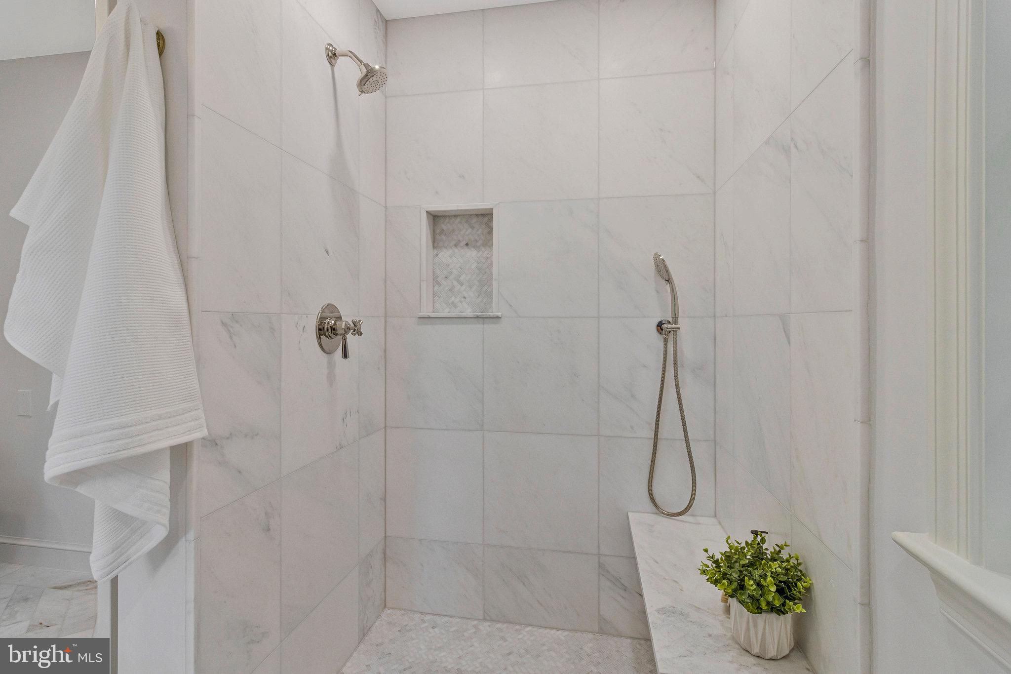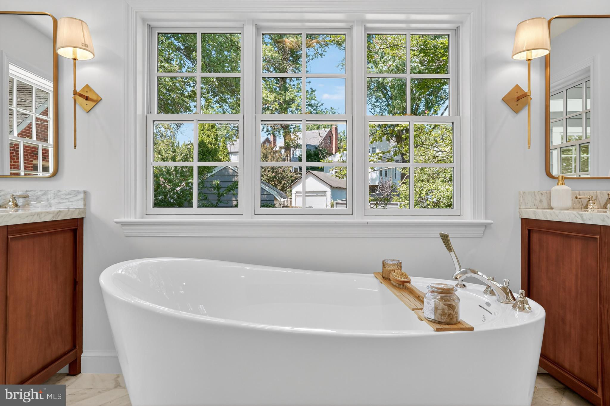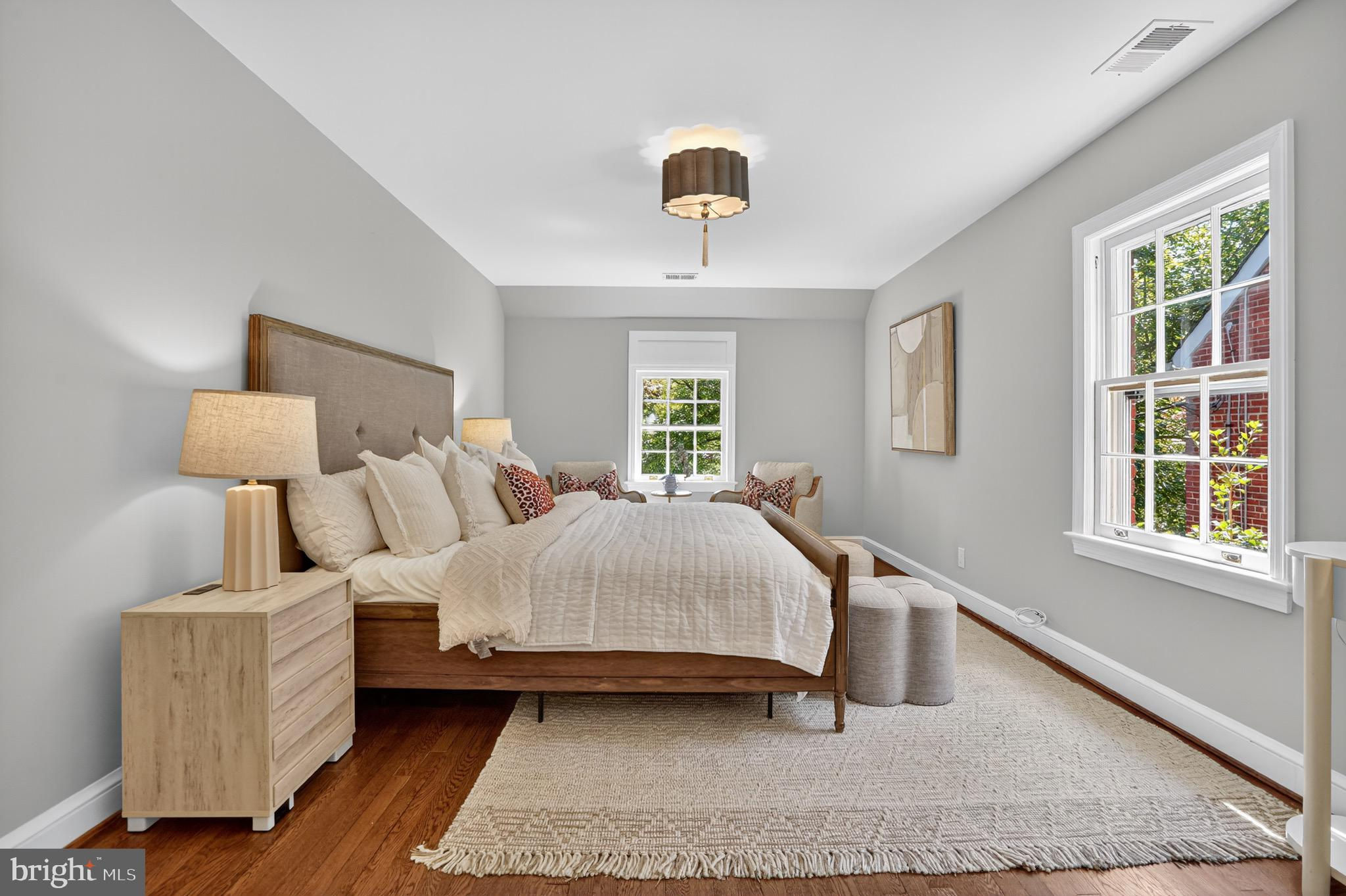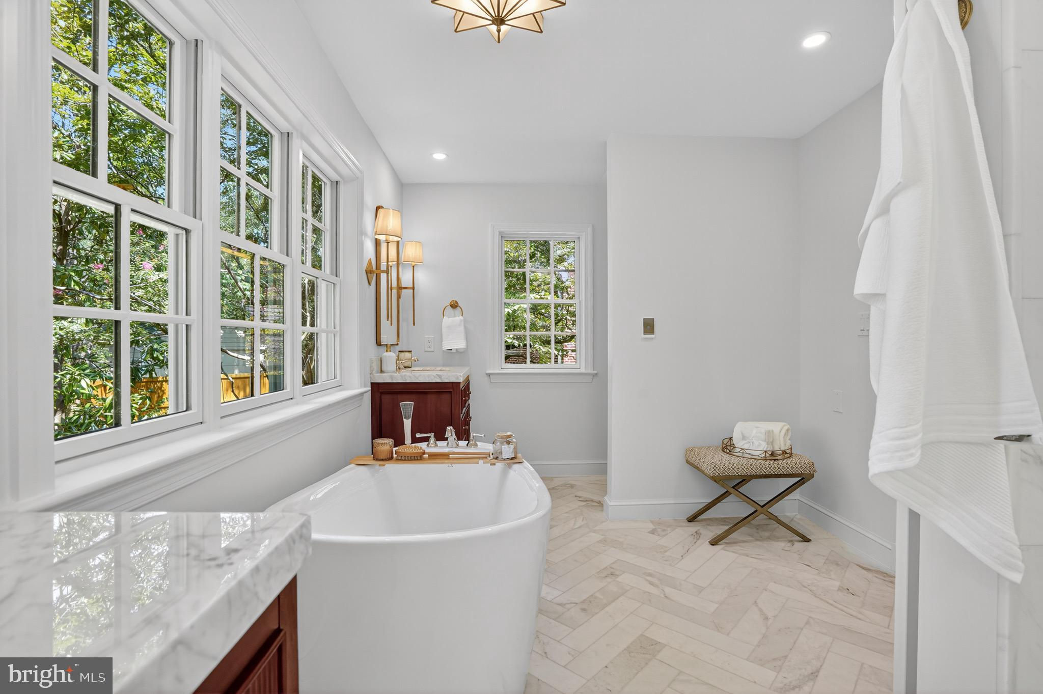 Sophisticated Chevy Chase Colonial with Dual Primary Suites & 16×16 Chef’s Kitchen Blending 1937 craftsmanship with modern designer renovations, this elegant 6-bedroom, 4.5-bath Colonial showcases timeless architecture, luxury finishes, and exceptional livability on one of Chevy Chase DC’s most picturesque, tree-lined streets. A flagstone walkway beneath a 65-year-old Japanese red maple leads to an arched entry and private tiered stone backyard oasis. Inside, original oak and heart pine floors, custom crown moldings, and brass-and-gold-leaf sconces frame a sun-filled living room with wood-burning fireplace and original artisan mantel. The formal dining room, finished in Benjamin Moore’s Brushed Aluminum with custom panel molding and iron-and-gold-leaf chandelier, connects through a butler’s pantry with wet bar, beverage refrigerator, Bosch dishwasher, and extra disposal. The 16×16 chef’s kitchen is a true showpiece—perfect for entertaining. Featuring Calacatta Imperial marble island, countertops, and backsplash, lime-washed exposed brick, and custom Pioneer cabinets built in Lancaster, PA with solid walnut reeded island fronts, banquette seating with built-in smart TV, and a vintage-style walnut china cabinet. Premium JennAir “Rise” appliances include a 48″ panel-front refrigerator/freezer, six-burner + griddle gas range with dual ovens, drawer microwave, and Zephyr recessed ceiling ventilation. Walls of counter-to-ceiling Pella windows and French doors flood the space with light and open to antique brick and flagstone patios, gardens, and a detached garage with private parking pad. Upstairs, the primary suite offers a spa-inspired bath with heated Calacatta marble floors, rain shower, freestanding soaking tub, dual marble vanities, Toto washlet, and walk-in closet. The second primary suite on the top floor features vaulted ceilings, exposed oak beams, a window seat beneath new Pella windows, and a private full bath with black herringbone tile floors and six-foot soaking tub—ideal as a second master, guest suite, or family lounge. The lower level includes a bright family room, legal guest bedroom, custom barn-door laundry area, and abundant storage. Additional features: R-21 spray-foam insulation, two-zone gas HVAC, 80-gallon water heater, drainage improvements, and 50-year architectural roof. Prime location—just a short stroll to Lafayette Elementary, Broad Branch Market, Avalon Theatre, Chevy Chase Community Center, Rock Creek Park, and St. John’s College High School. Easy access to Friendship Heights Metro, Military Road, and Connecticut Avenue. 2921 Legation Street NW—where historic elegance meets modern luxury. Square footage is approximate and should not be used for property valuation.
