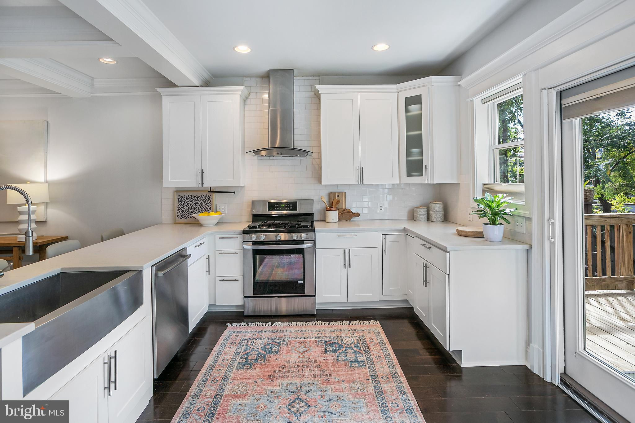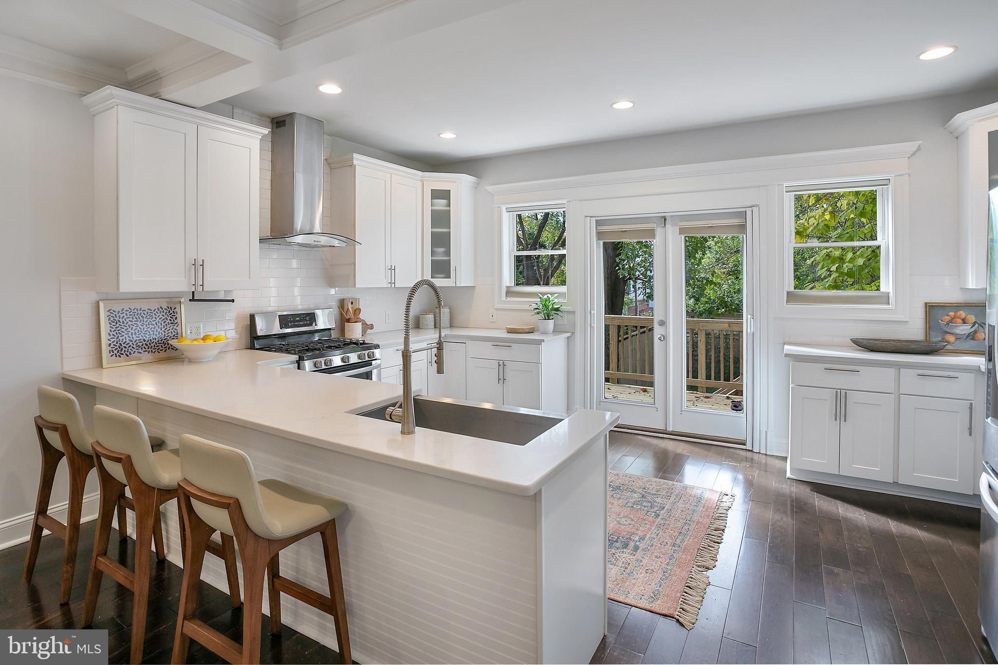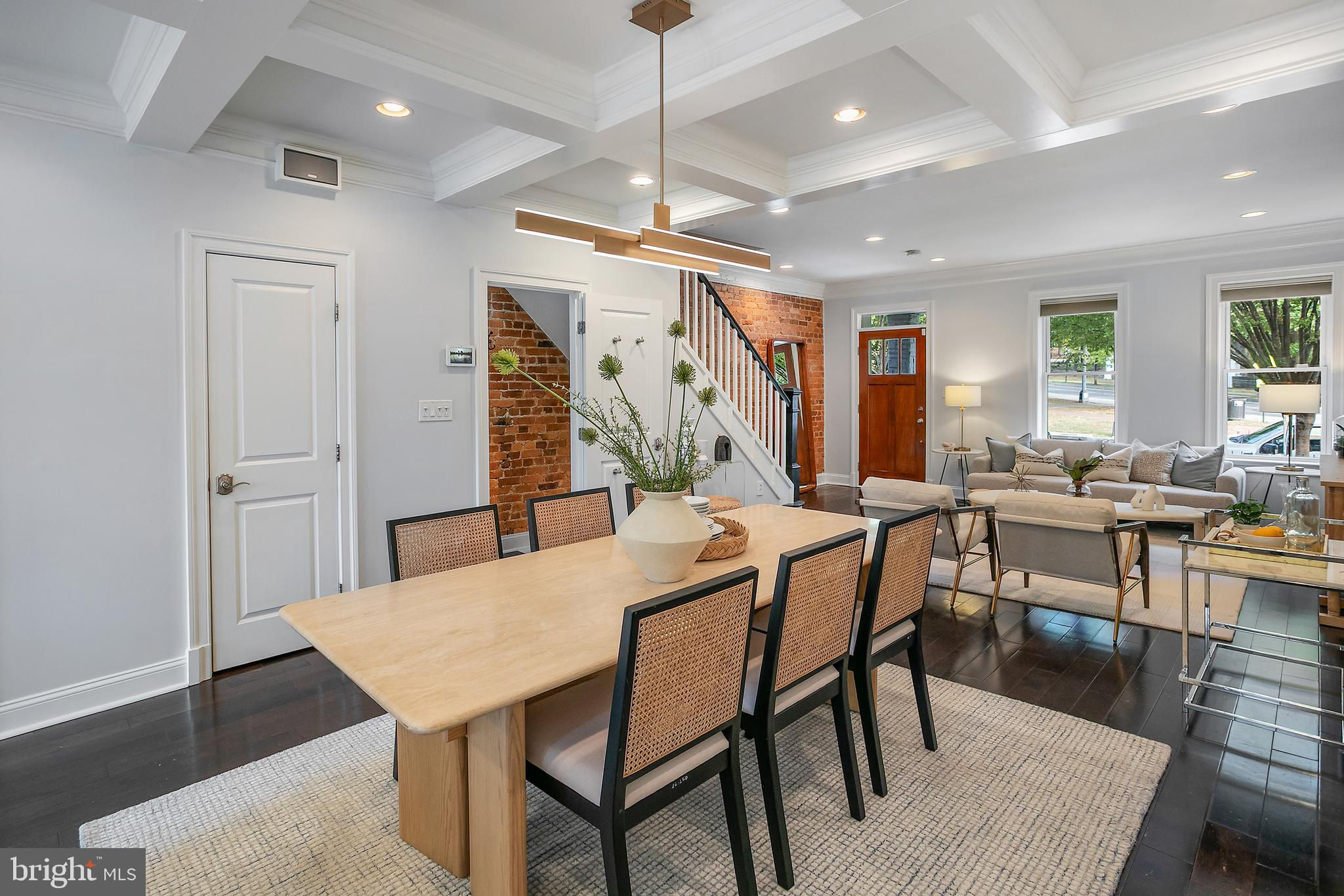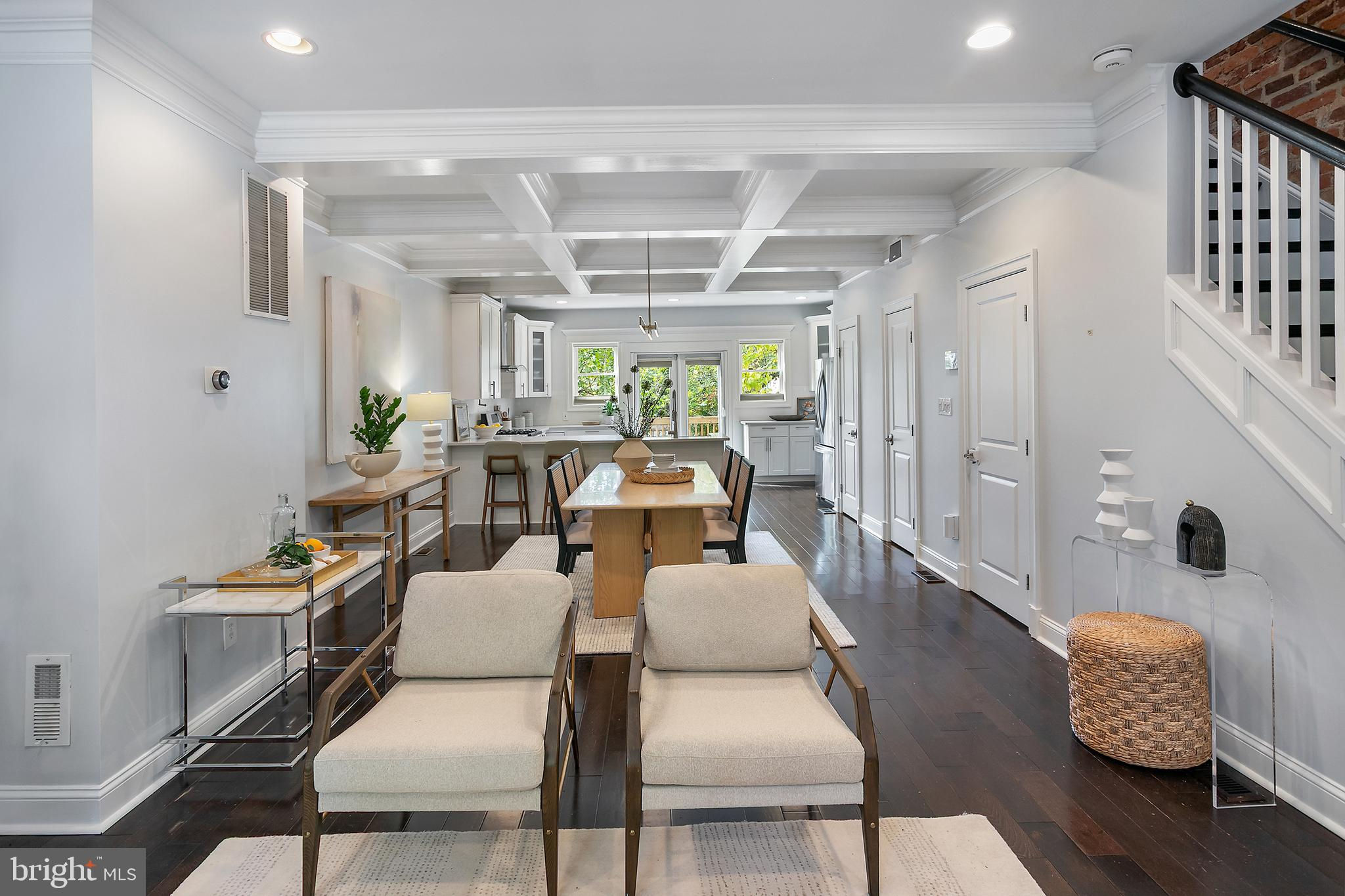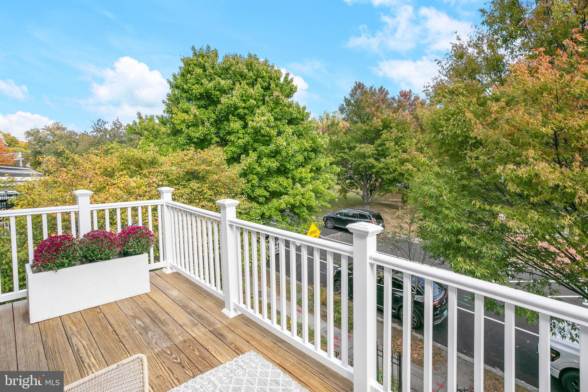 Located just moments from the heart of Petworth, this spacious and beautifully updated home offers a rare combination of width, functionality, and refined design. Fully renovated in 2015, the residence balances timeless details with modern convenience. The main level features an open layout ideal for everyday living and entertaining, with hardwood floors throughout and an exposed brick accent wall adding warmth and character. The generous dining area is highlighted by coffered ceilings, while the large kitchen includes a peninsula with bar seating, abundant storage, stainless steel appliances, a natural gas range with an externally vented hood, and direct access to a sizable rear deck with a gas hookup for grilling. Upstairs, the primary suite impresses with double-height ceilings, a private outdoor terrace, and an en suite bath, along with serene green views over the historic Old Soldiers Home golf course. Two additional bedrooms, a full bathroom with a tub, and a conveniently located washer and dryer complete the upper level. The lower level offers exceptional versatility with tile floors, a wet bar, a full bath, and a guest bedroom; ideal as a recreation, play, or media space. Outside, the large backyard provides room for play, entertaining, or quiet relaxation. A detached garage adds practicality, and the home’s position affords additional green views of the golf course. Perfectly situated a short walk to the Petworth Metro station, Safeway, and local dining, this home delivers the best of neighborhood living with easy access to the city.