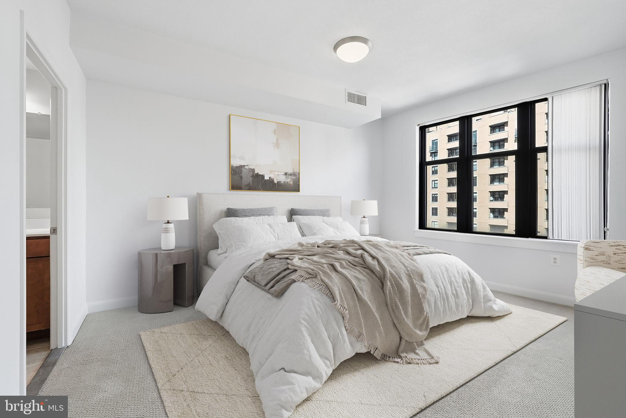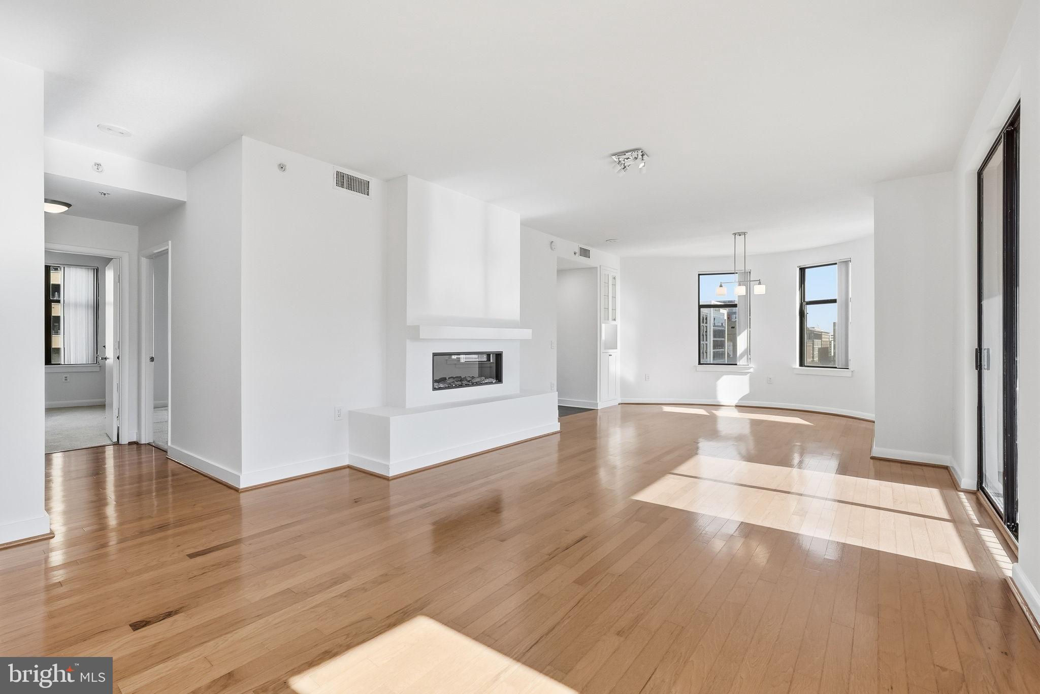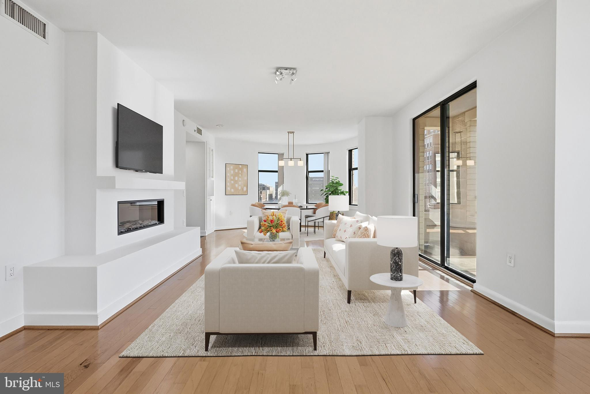 On the market for the first time in 20+ years and carefully maintained by its part-time owner, this GENEROUS (1,478SF!) gem offers large public rooms perfect for entertaining & daily living, as well as large bedrooms & appointed baths. #719's prominent corner position on a high floor offers 3 exposures flooding it with natural light & unparalleled views from every room. Inside, a quiet retreat awaits that the owner has meticulously and tastefully renovated, ensuring no detail overlooked. A wall of undulating windows opens to large living area that includes a FP & sliding door to its covered balcony. The modern kitchen has Cambria counters, stainless appliances, and custom cabinetry (including pull-out pantry) while its corner table space offers a perfect spot for morning coffee overlooking two exposures. The curved dining area, located at the bullnose of the building, has built-in lighted cabinet. Additionally, an in-unit washer & dryer and powder room facilitate easy living. The primary bedroom has an attached bath with dual vanity, a stall glass shower, a large closet & added linen closet space. 2nd bedroom is equally large and has two exposures filling the space with light & views. It also features an attached full bath with a soaking tub. Full-service 400 Mass offers 24/7 concierge, an updated gym, game room, reservable resident lounge, business center, and wonderful roofdeck with a barbecue area, lounge & dining alcoves, gardens, and pool. With its 2-car tandem PKG on the uppermost (closest to lobby) garage level & extra STORAGE, #719 offers everything needed for Downtown DC living at its finest.